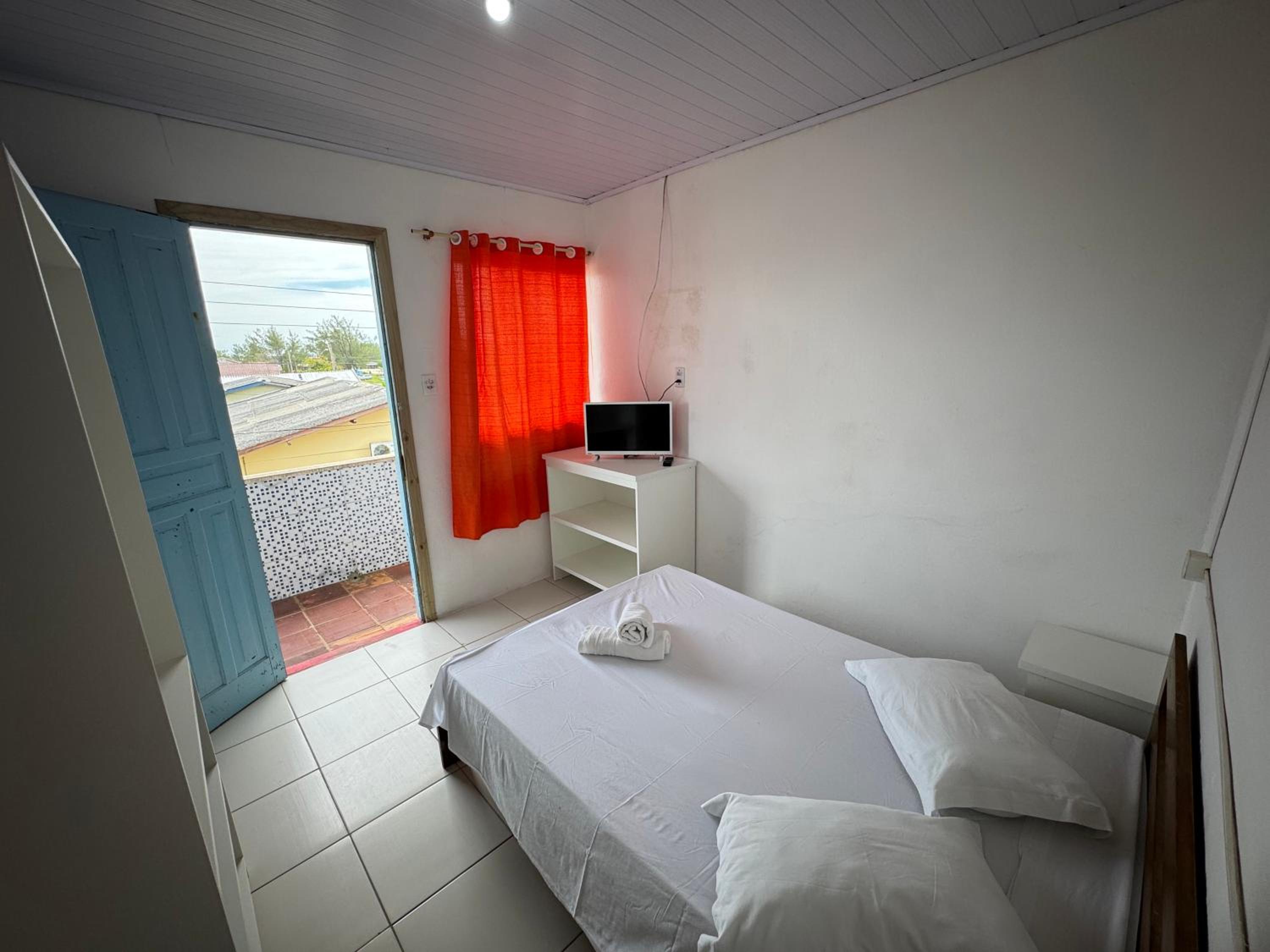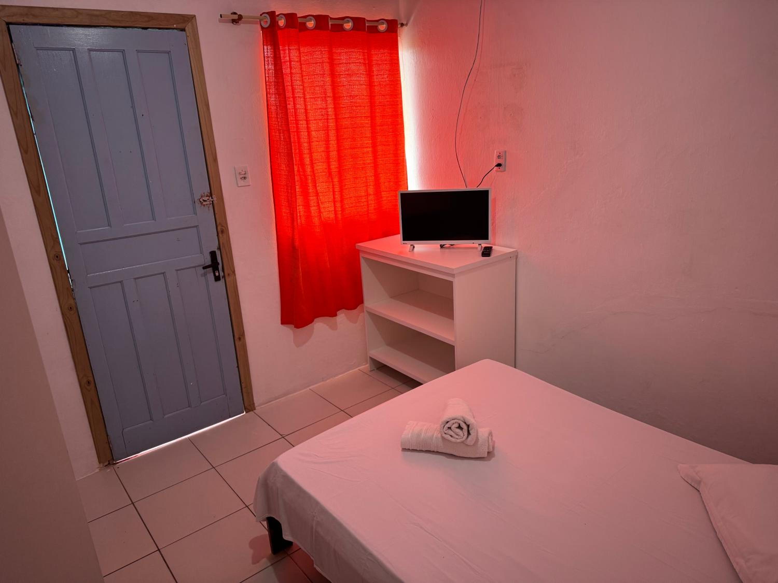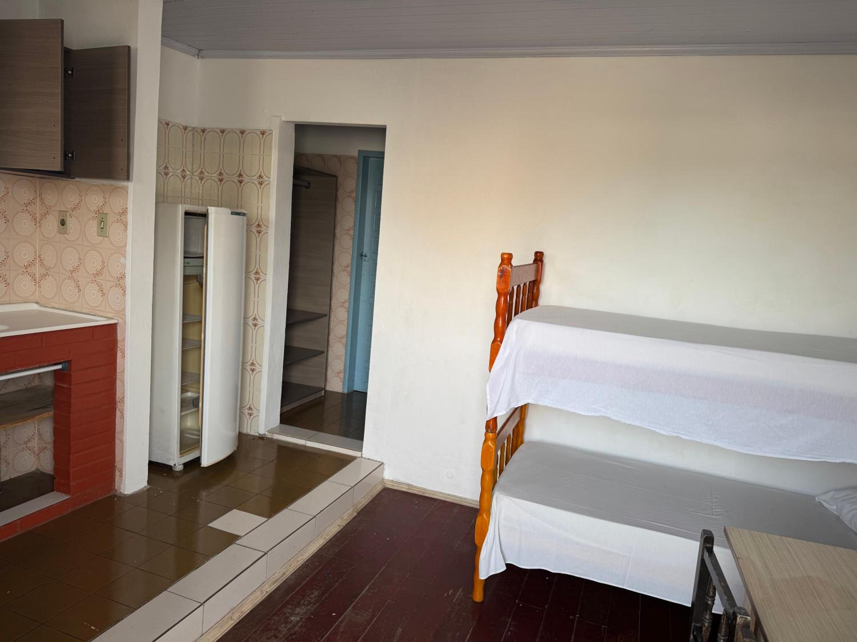 As camas e travesseiros são bons, mas só tem janela no quarto da frente e somente um ventilador, ou seja em dias quentes só um ventilador não é suficiente! Há um degrau entre o piso do quarto sem janela e o banheiro que facilmente pode causar acidentes, levei alguns sustos! A torneira do chuveiro estava quebrada e enrolada com fita isolante, ou seja, certamente dá choque! Não tem espelho, nem nos quartos e nem no banheiro!O quarto da frente não tem armário e nem uma estante para colocar as malas, tivemos que colocar a mala no chão! As toalhas não são boas!