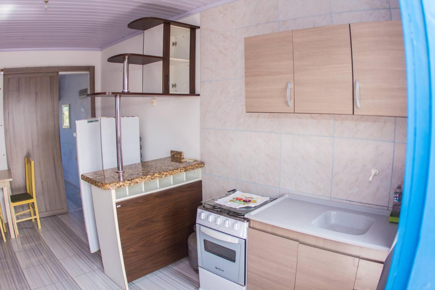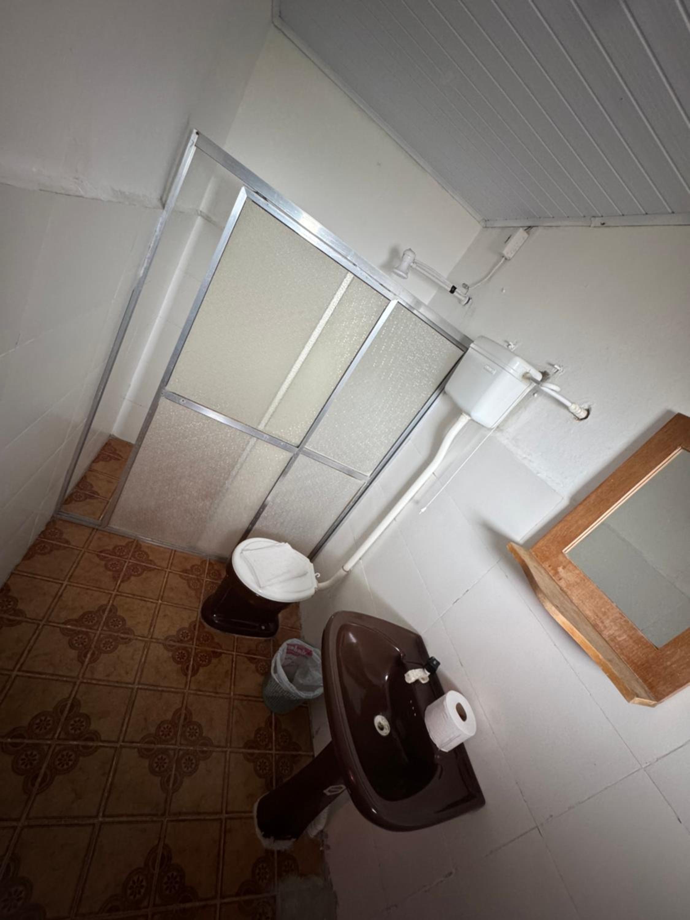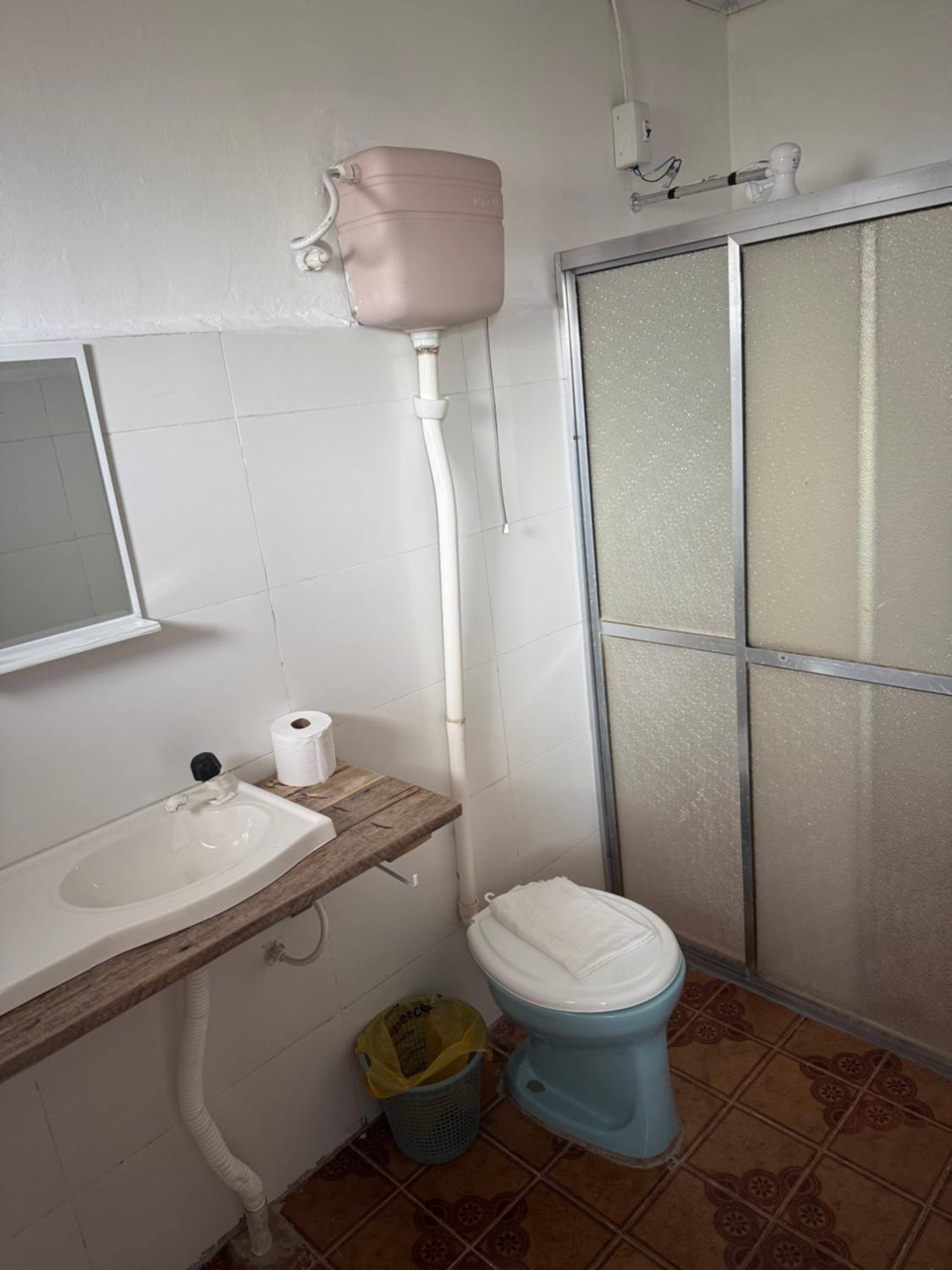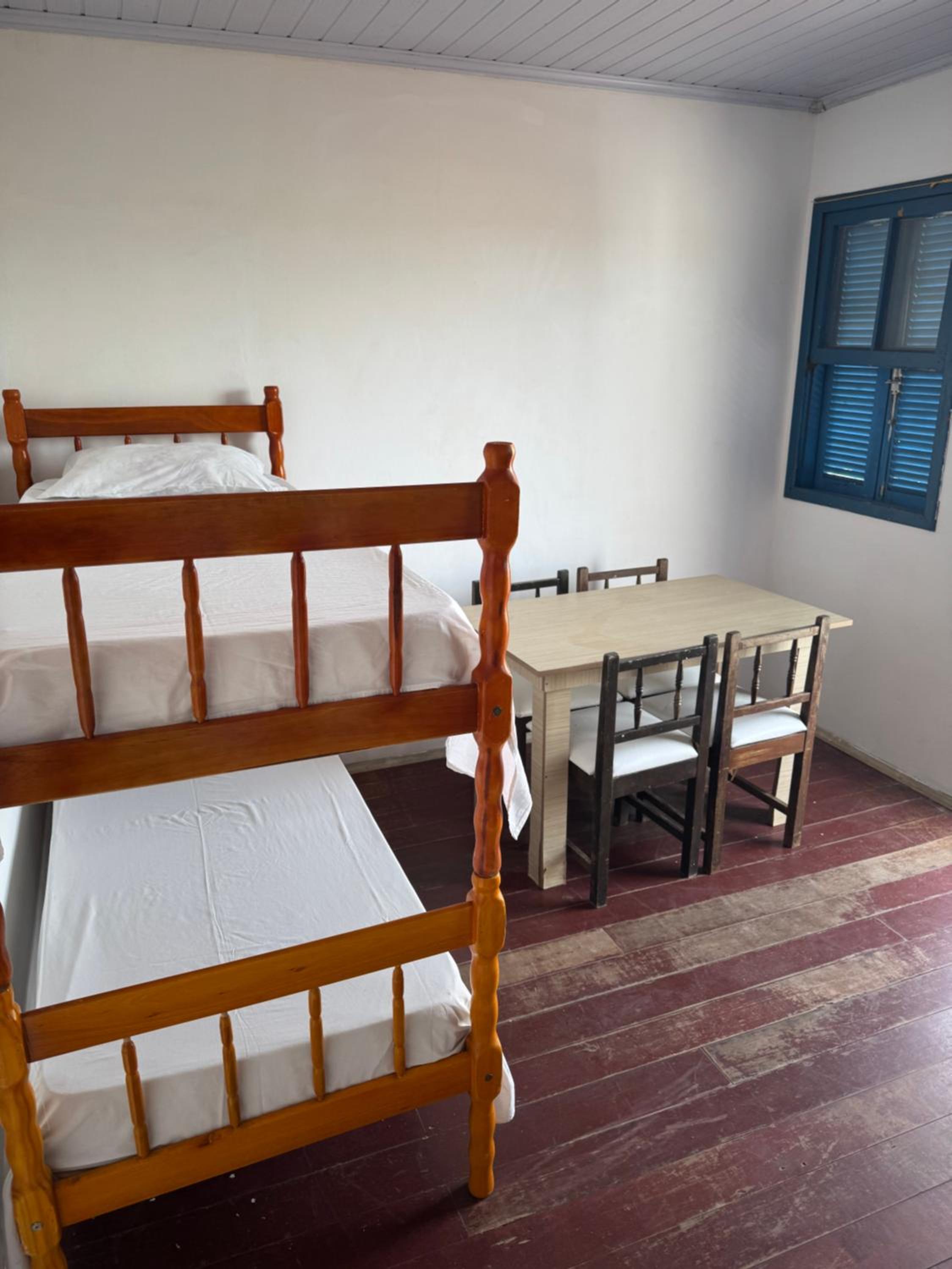 As camas e travesseiros são bons, mas só tem janela no quarto da frente e somente um ventilador, ou seja em dias quentes só um ventilador não é suficiente! Há um degrau entre o piso do quarto sem janela e o banheiro que facilmente pode causar acidentes, levei alguns sustos! A torneira do chuveiro estava quebrada e enrolada com fita isolante, ou seja, certamente dá choque! Não tem espelho, nem nos quartos e nem no banheiro!O quarto da frente não tem armário e nem uma estante para colocar as malas, tivemos que colocar a mala no chão! As toalhas não são boas!