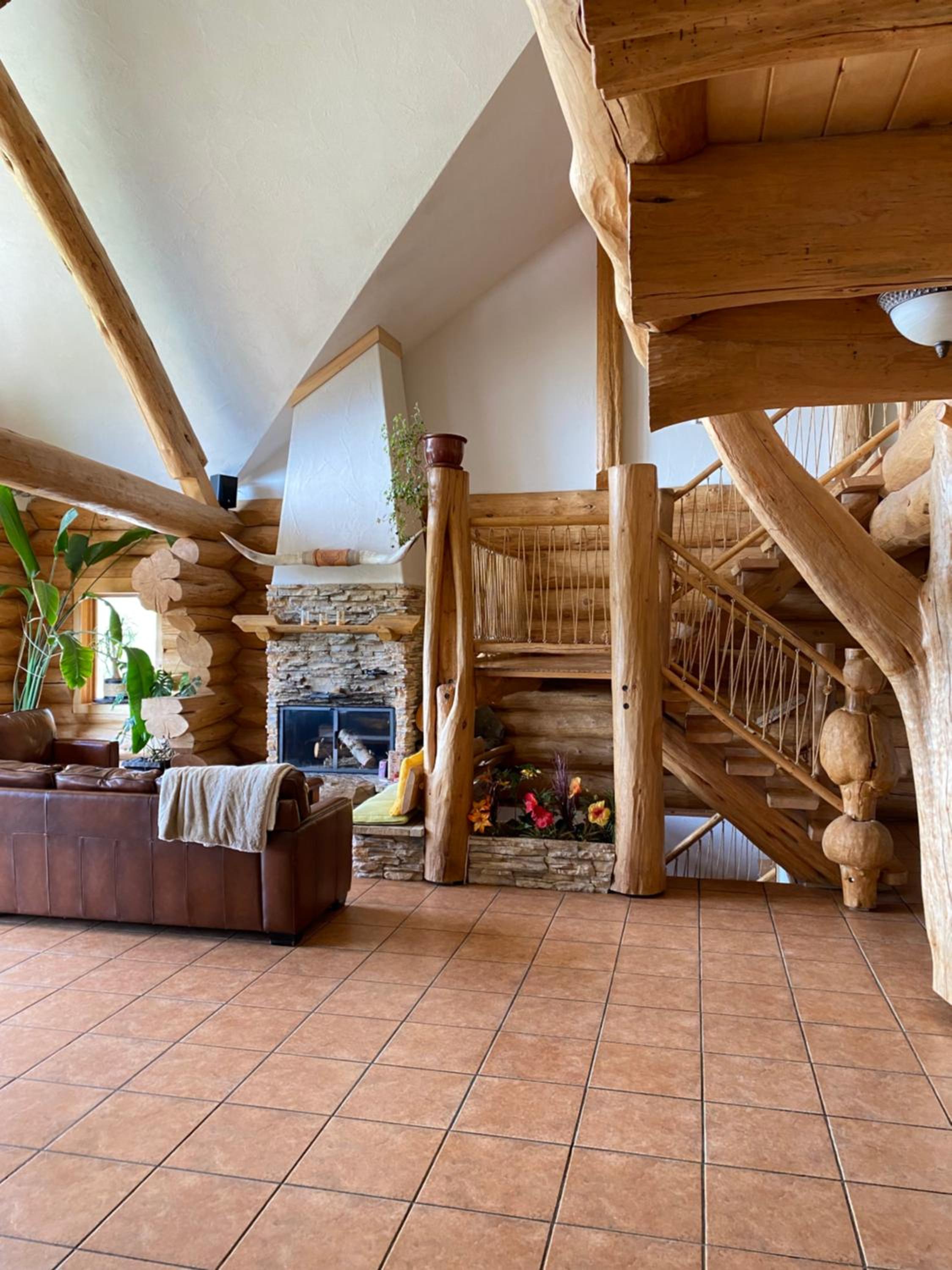 The log lodge is a stunning piece of architecture, though the kitchen would benefit from better ventilation.