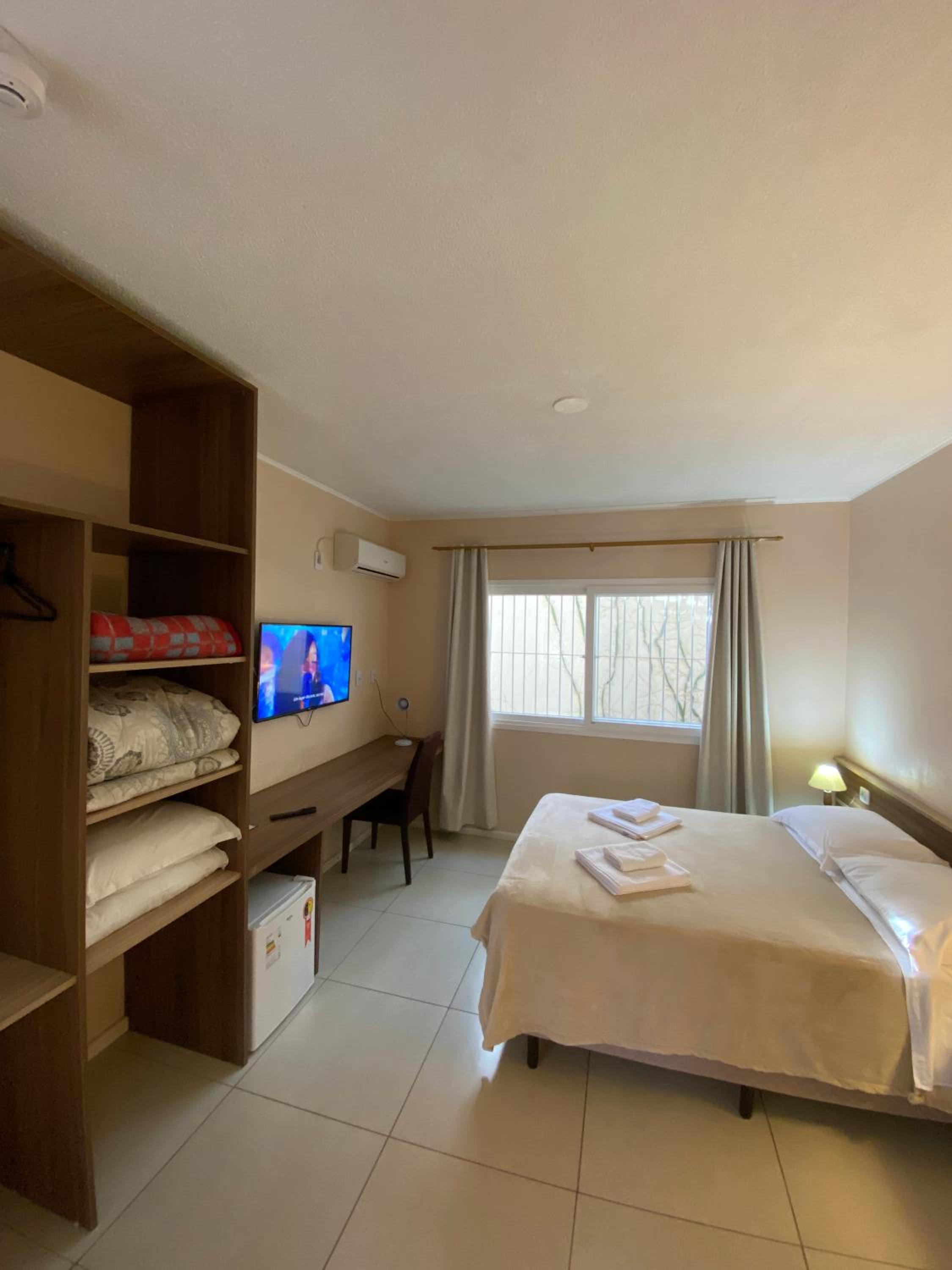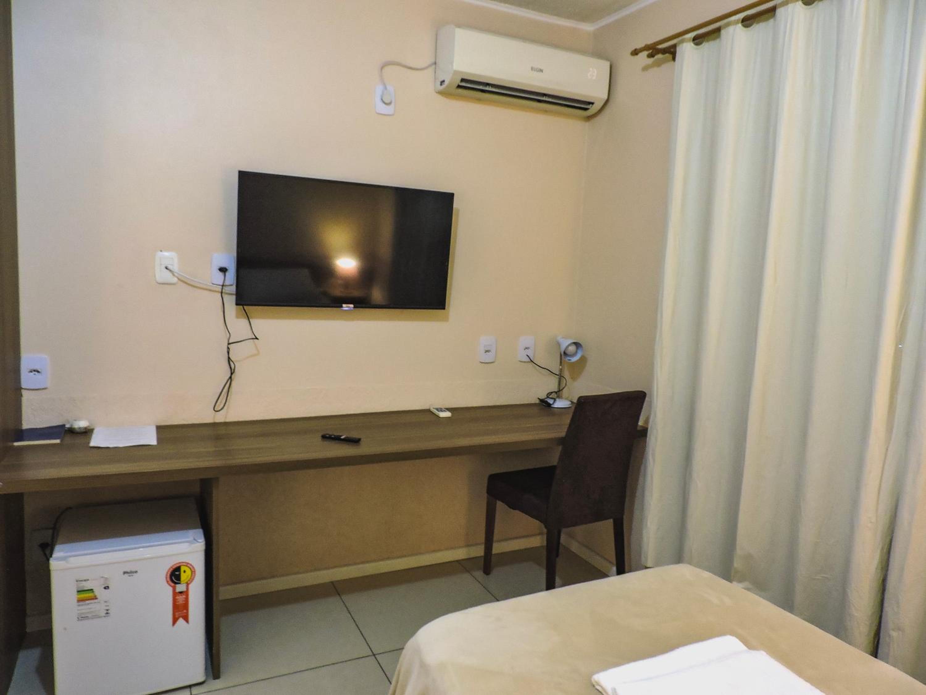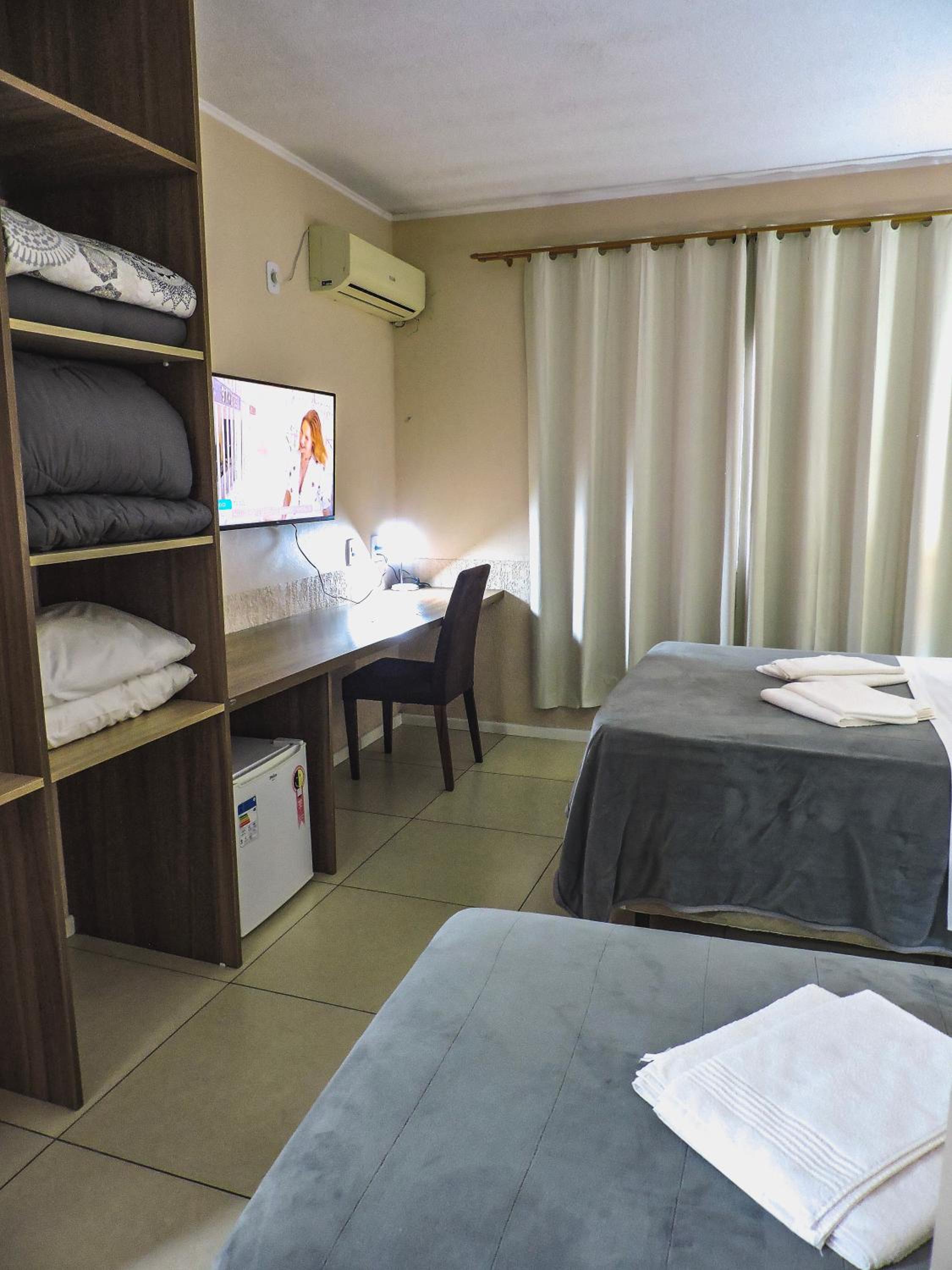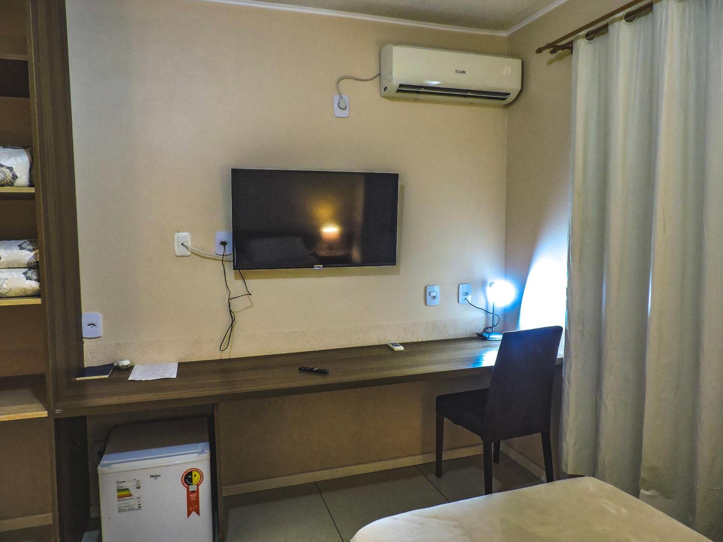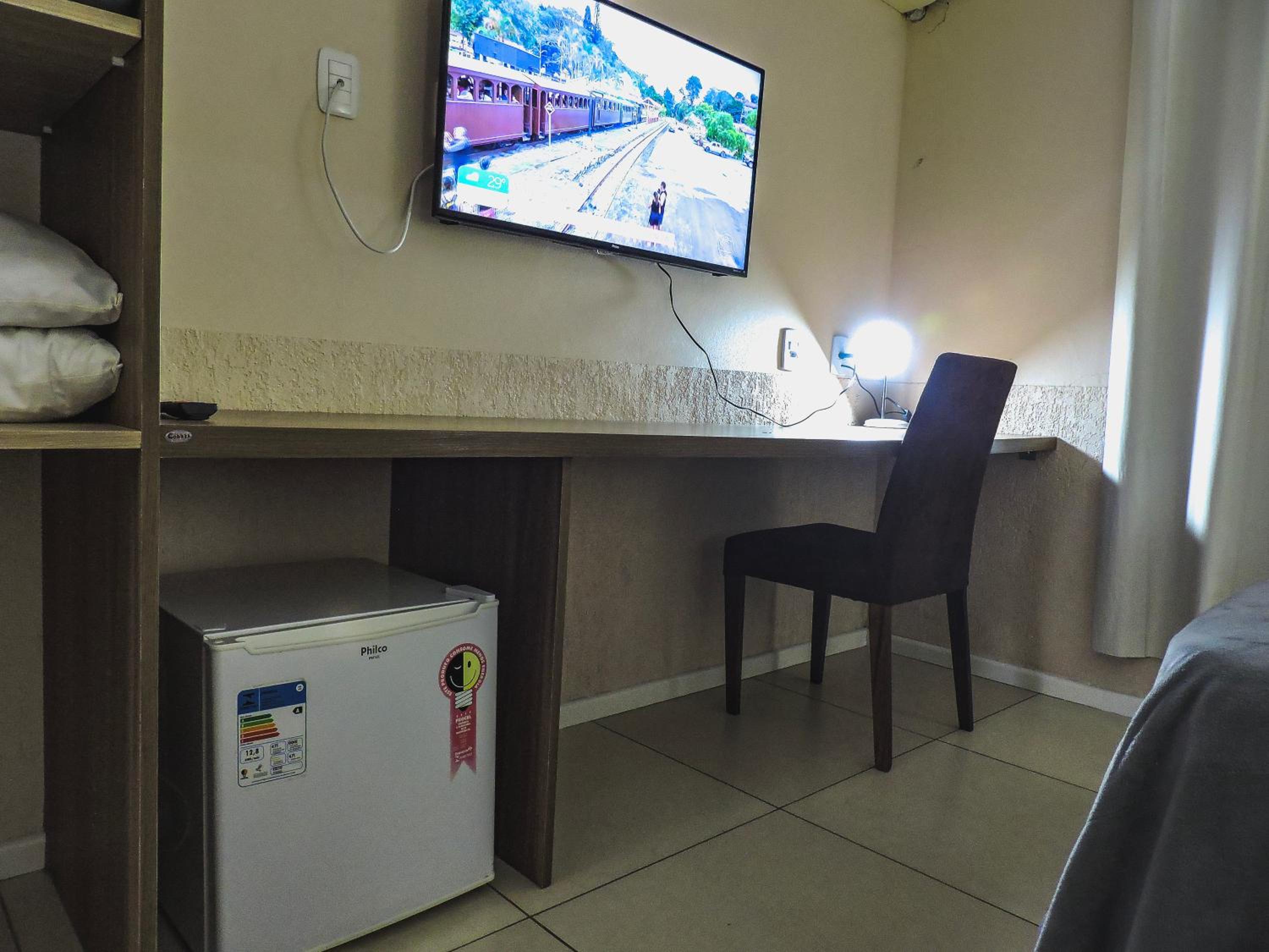 Do tamanho do quarto e do banheiro, limpo com banho de agua quente central. estacionamento gratuito, com wifi e canais basicos de televisão.