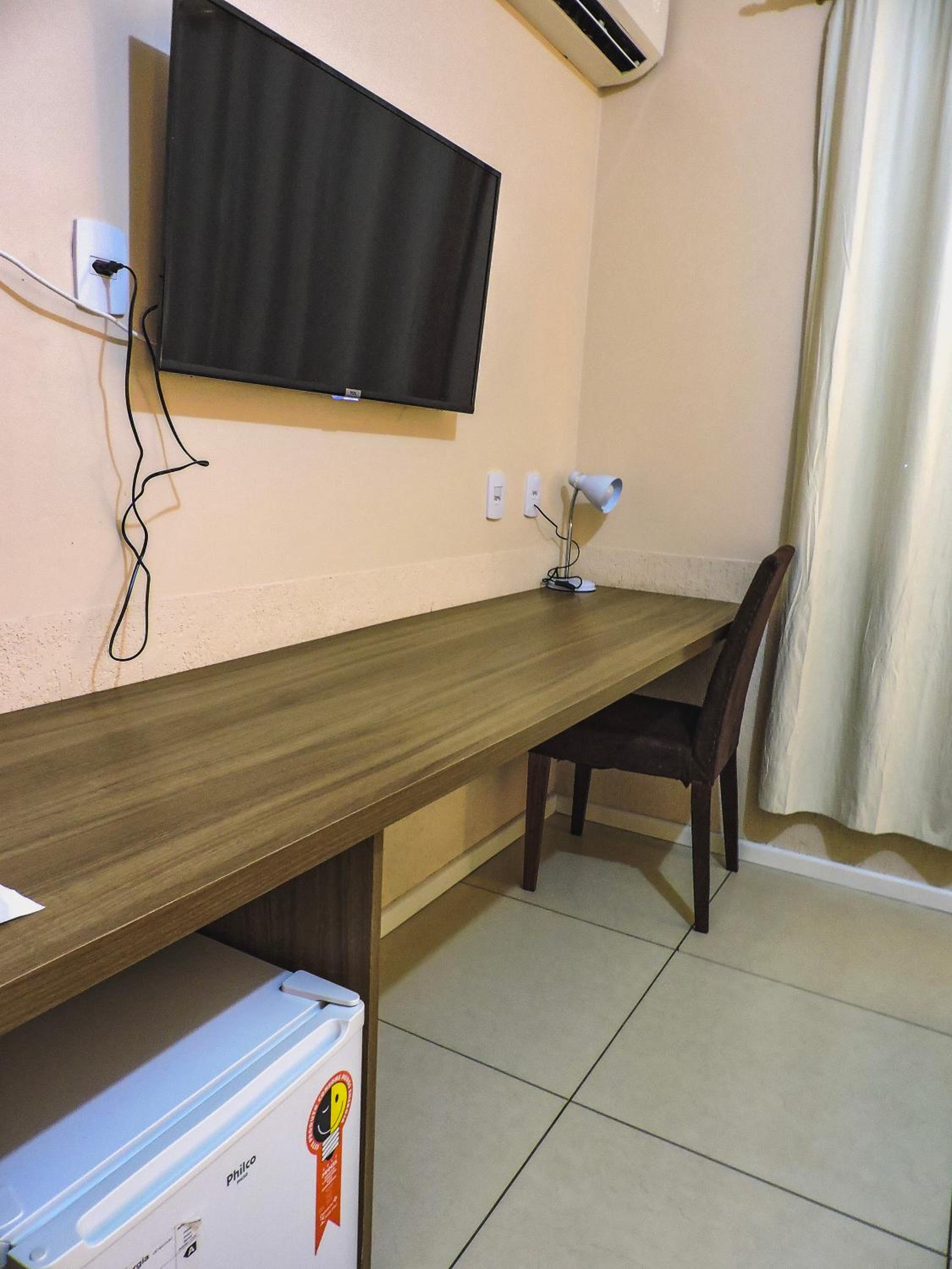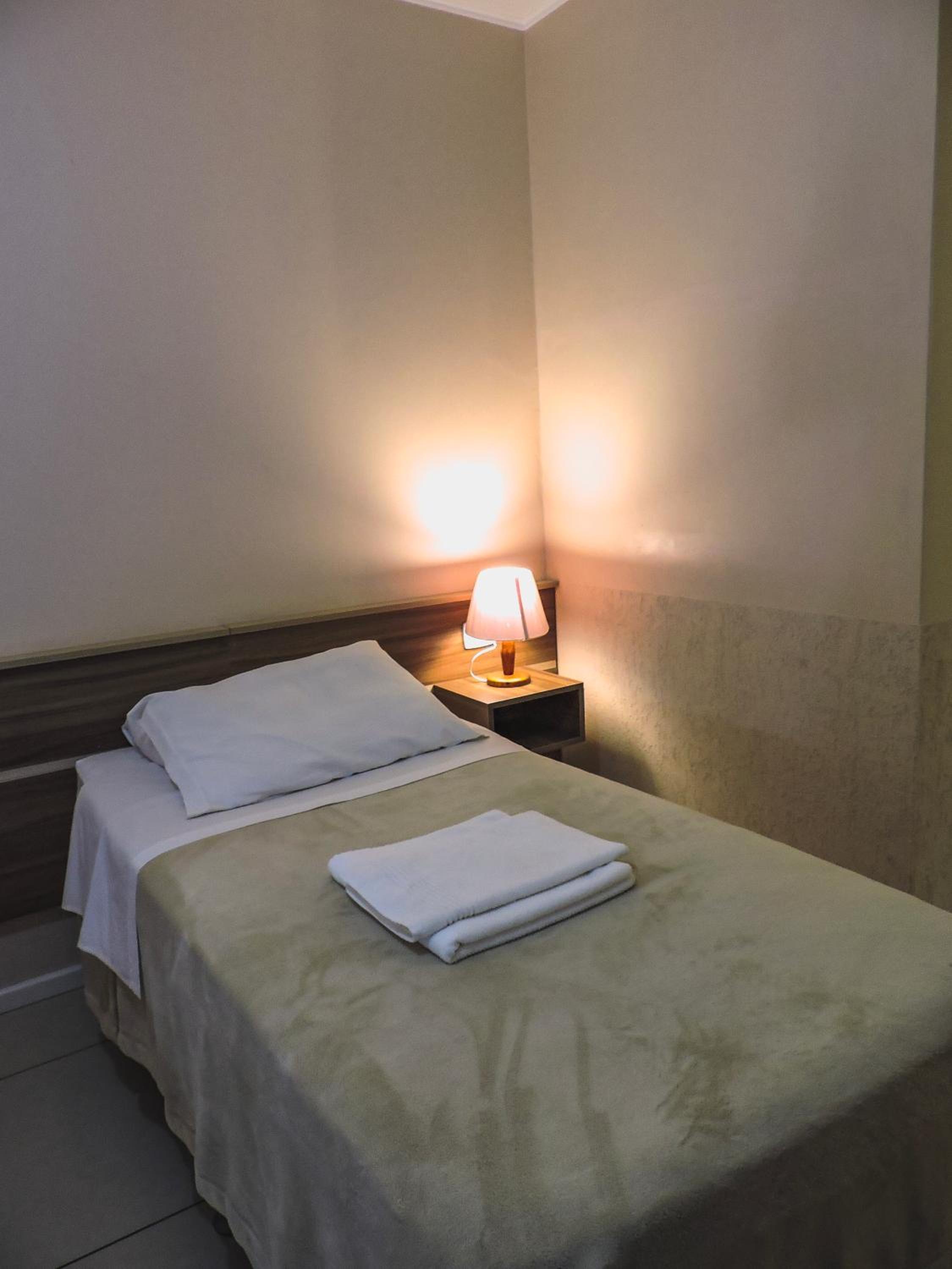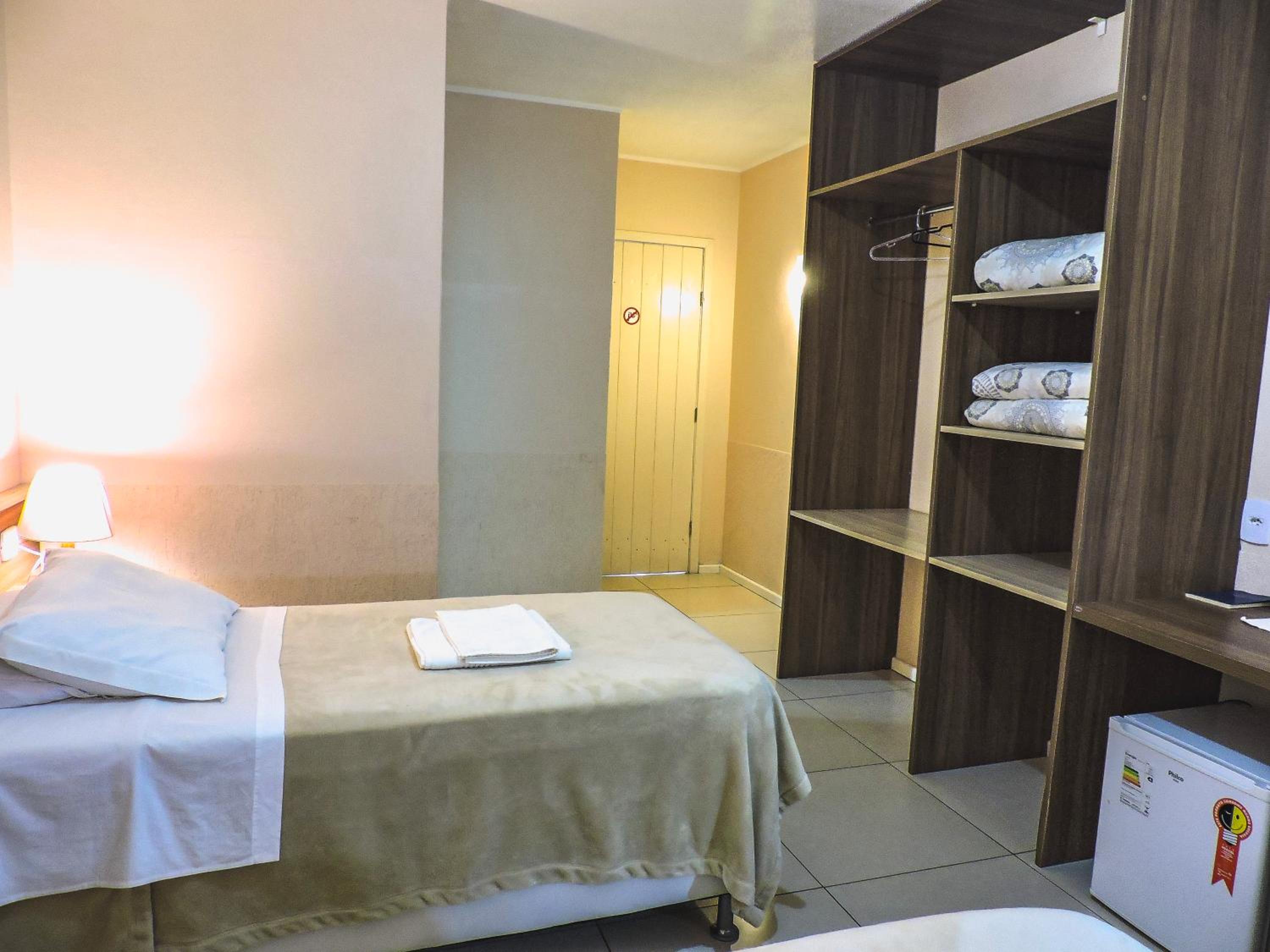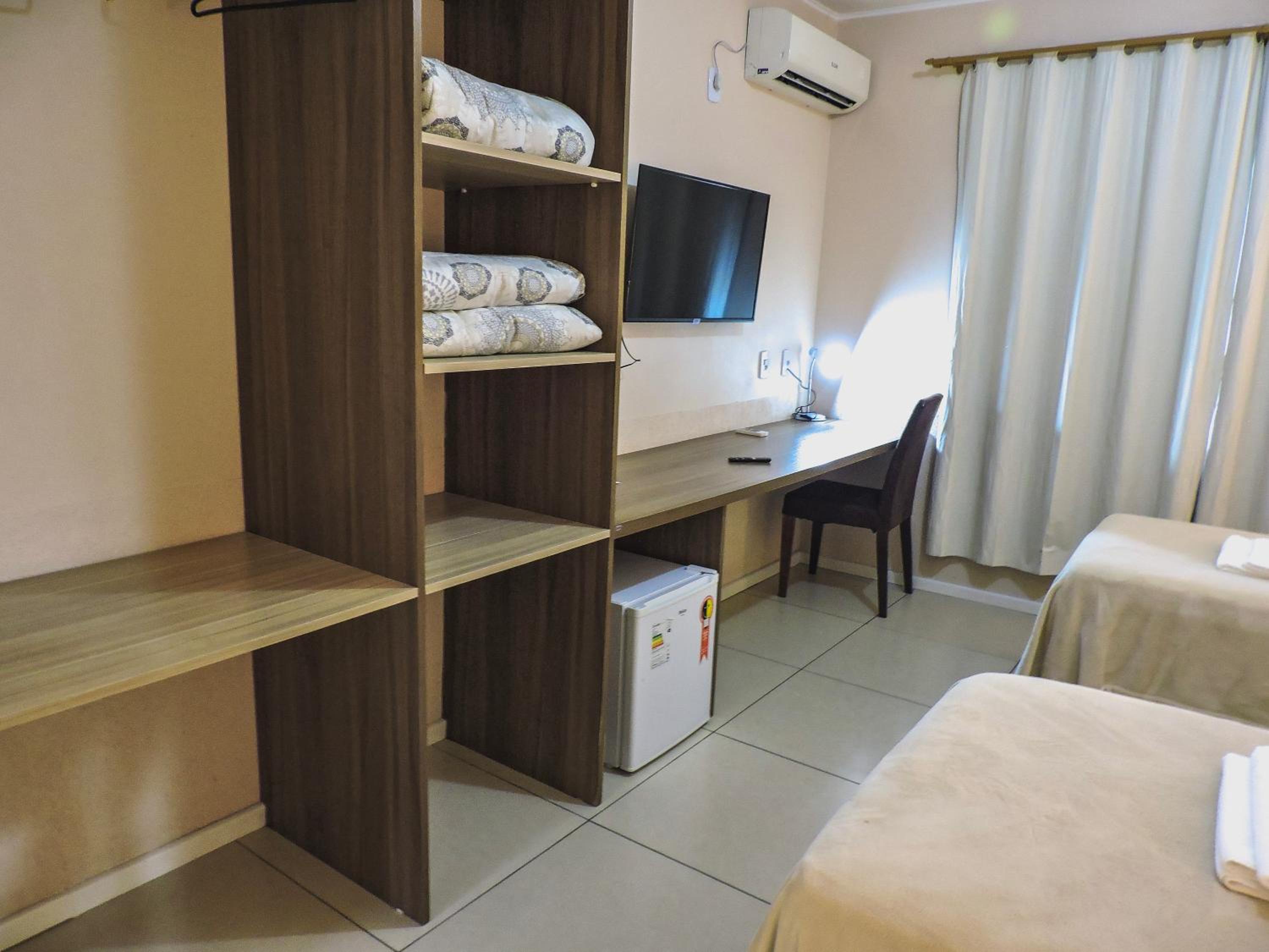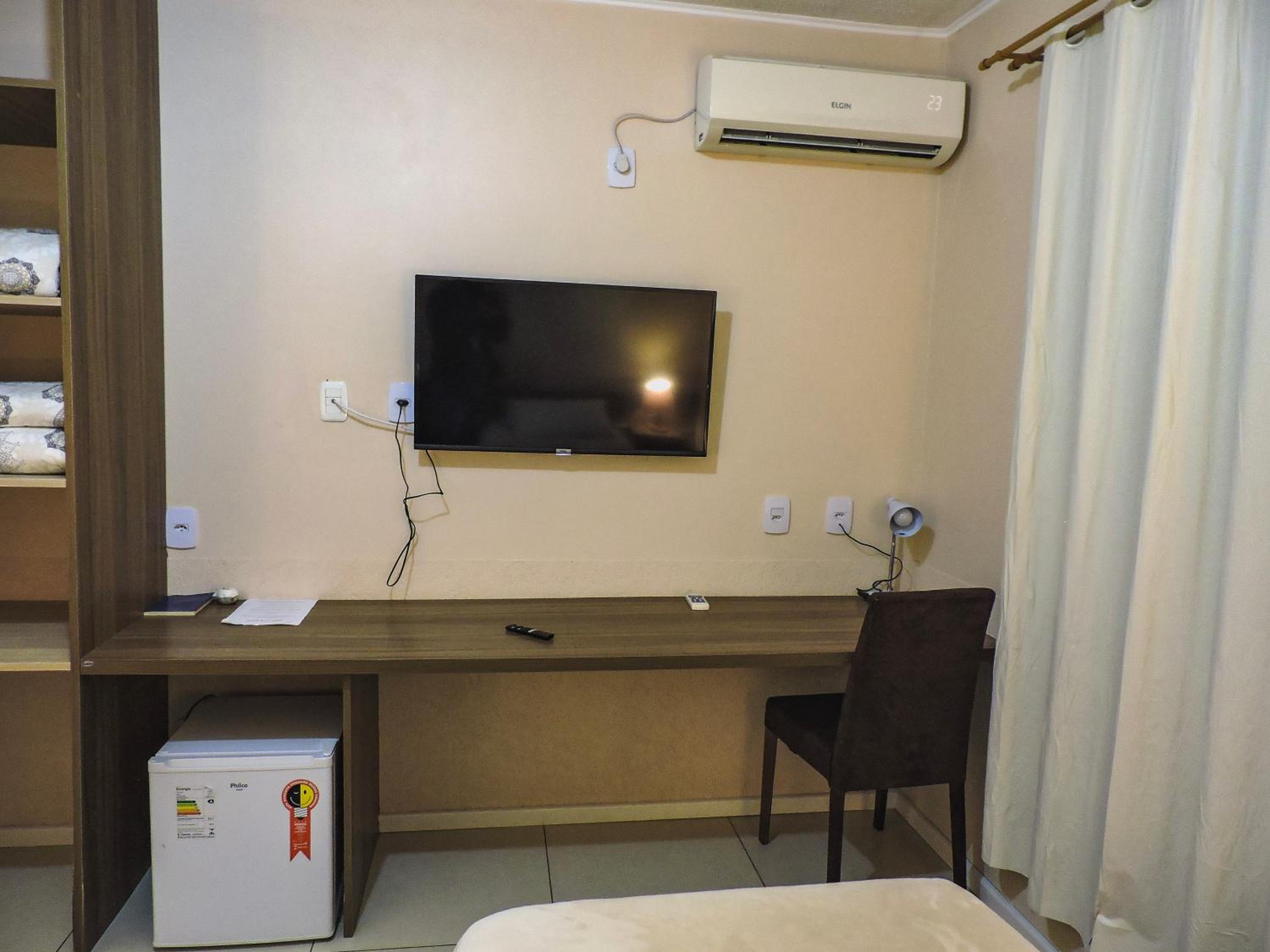 Do tamanho do quarto e do banheiro, limpo com banho de agua quente central. estacionamento gratuito, com wifi e canais basicos de televisão.