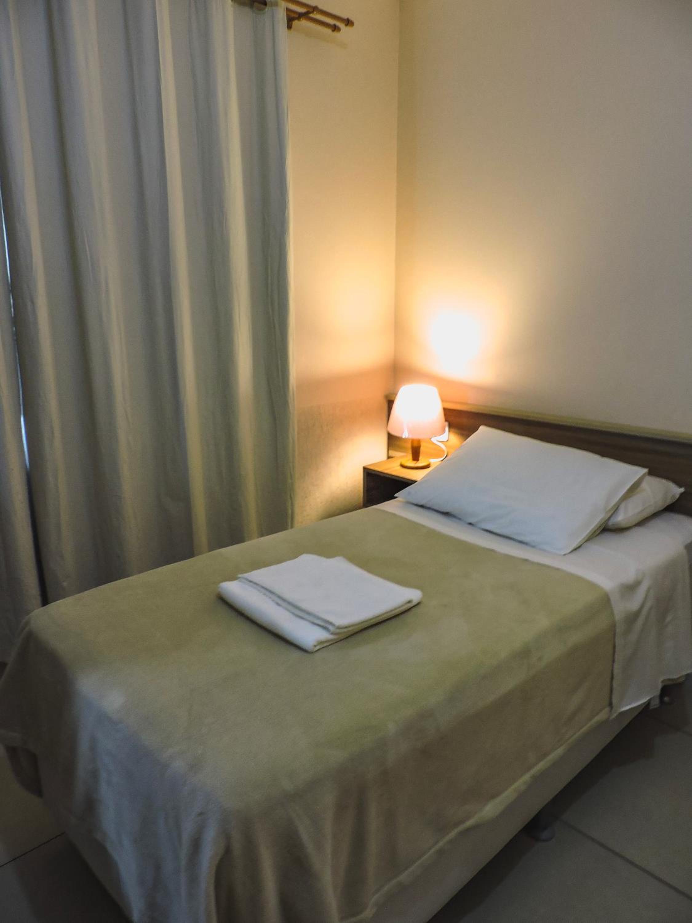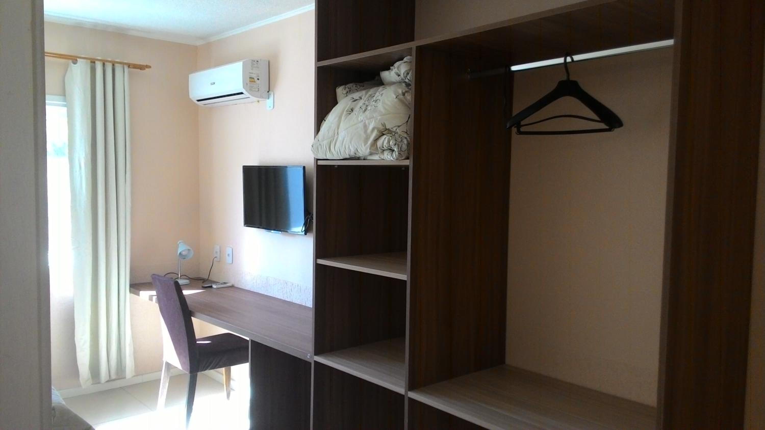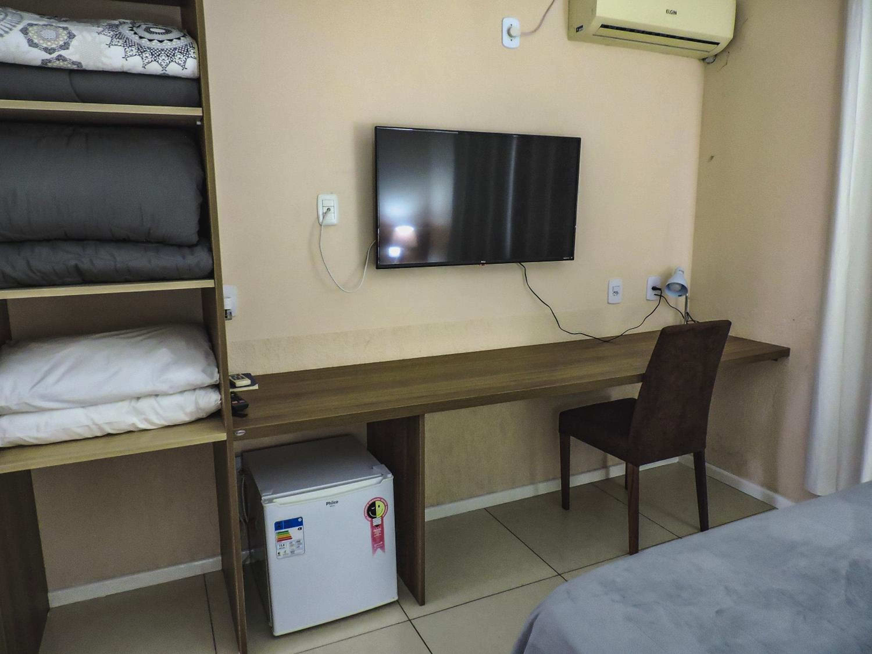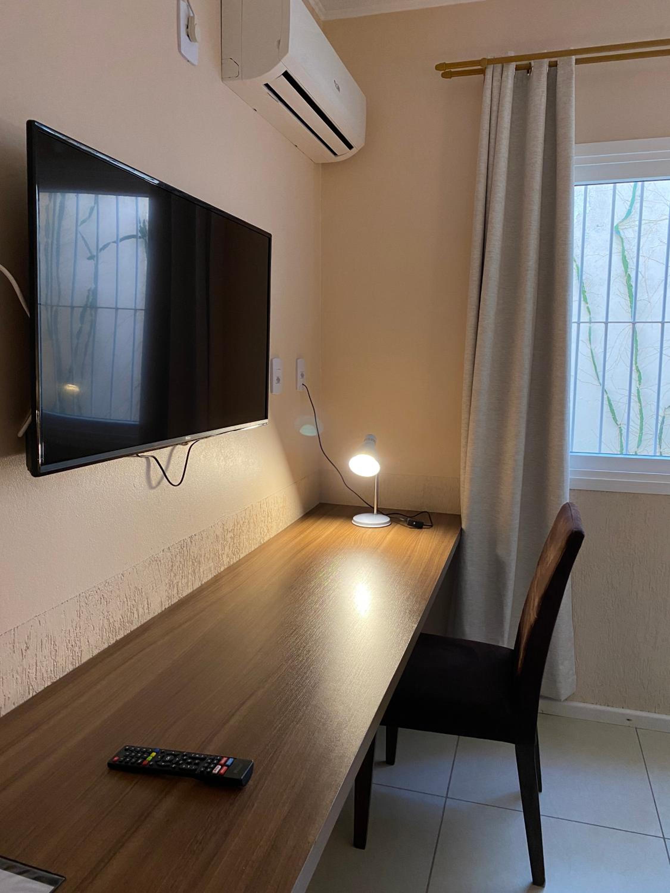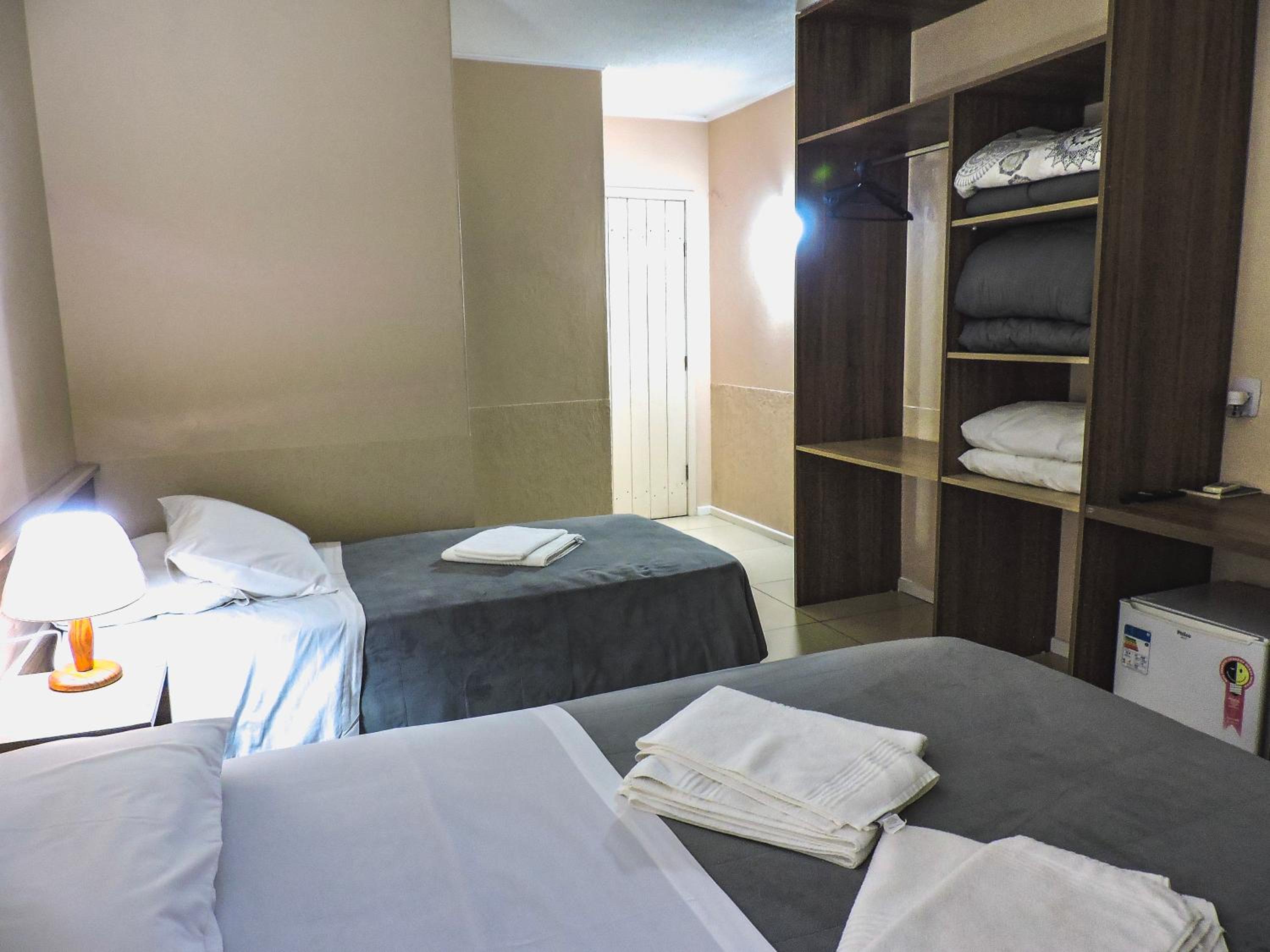 Do tamanho do quarto e do banheiro, limpo com banho de agua quente central. estacionamento gratuito, com wifi e canais basicos de televisão.