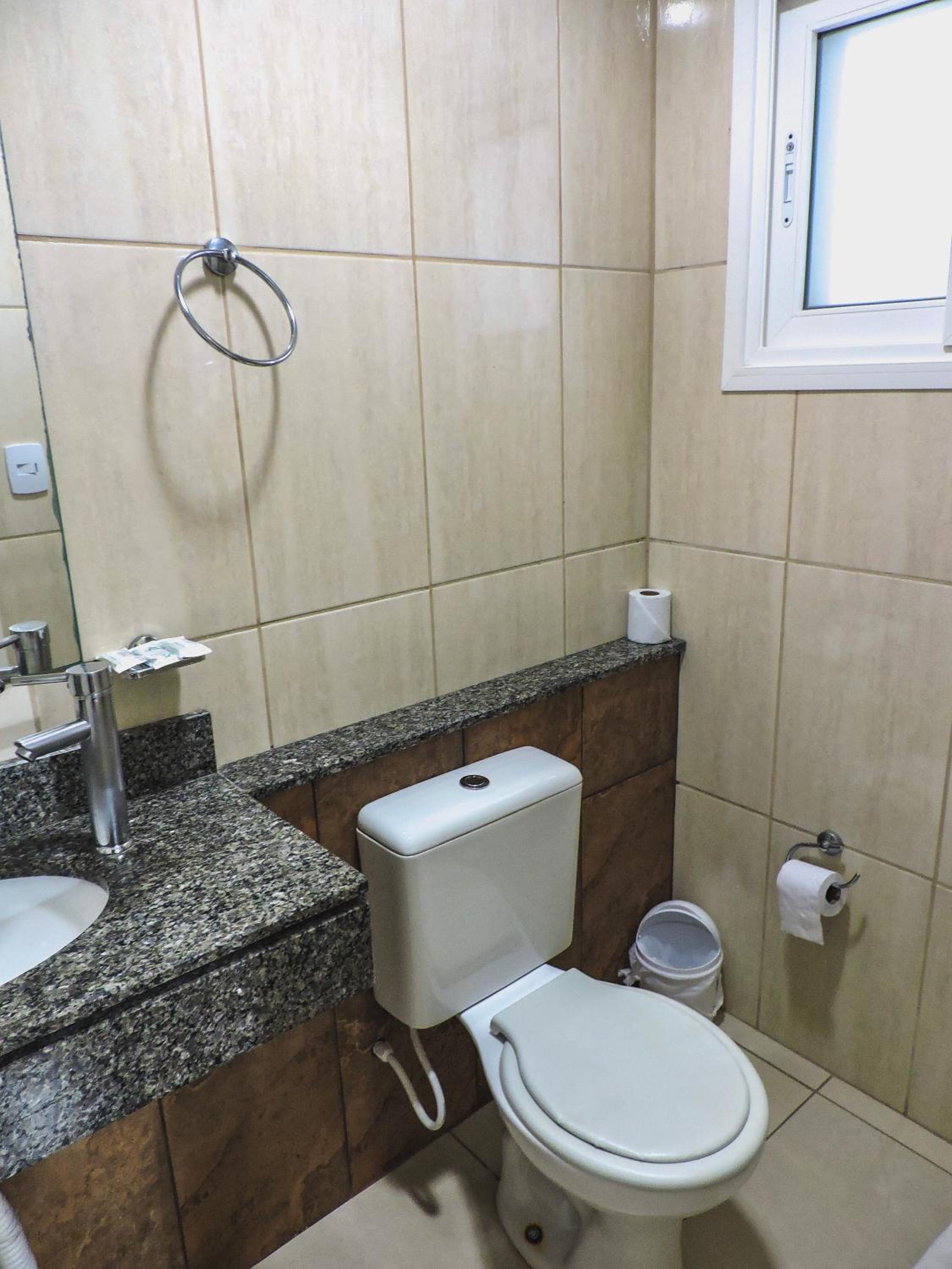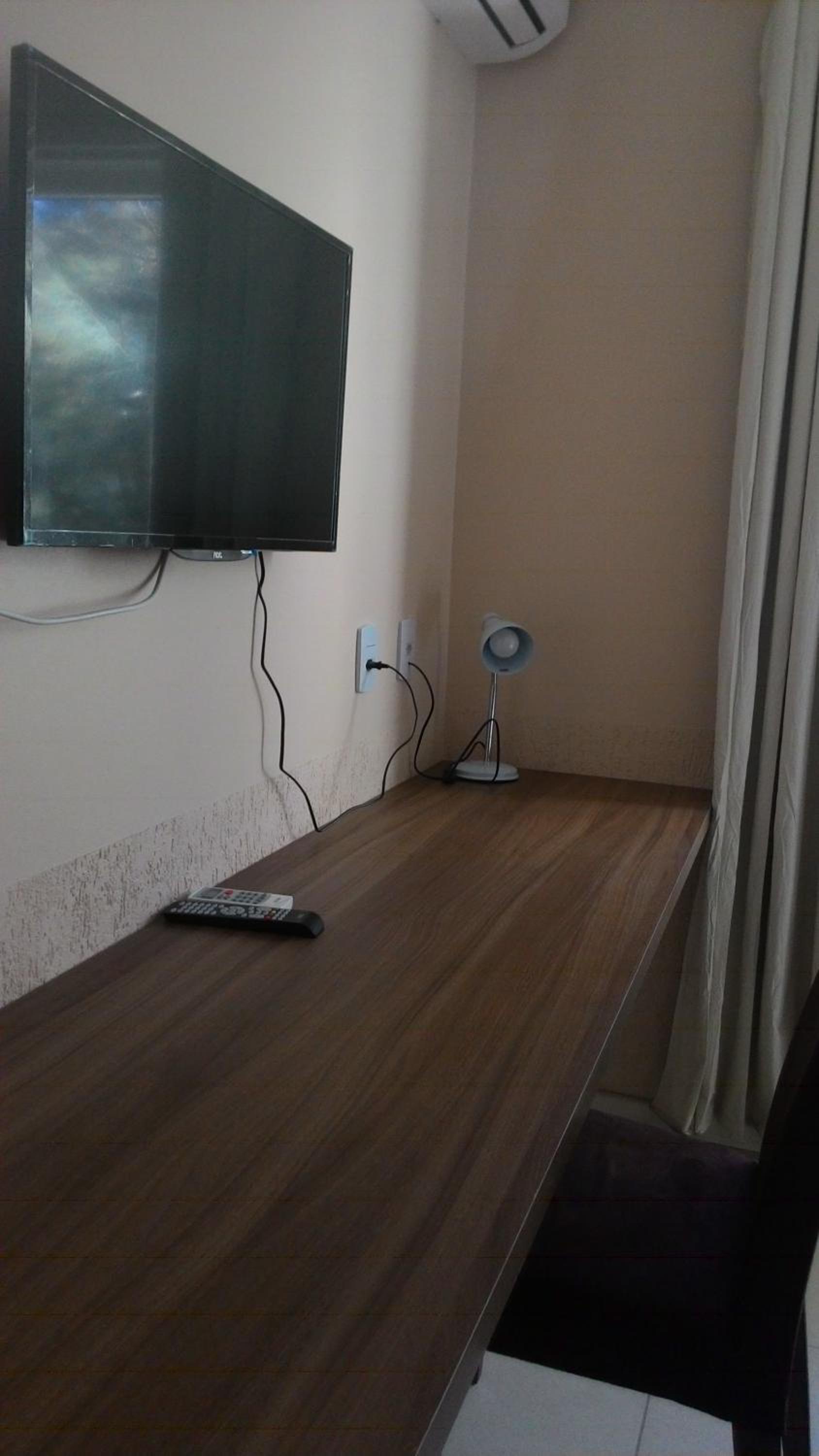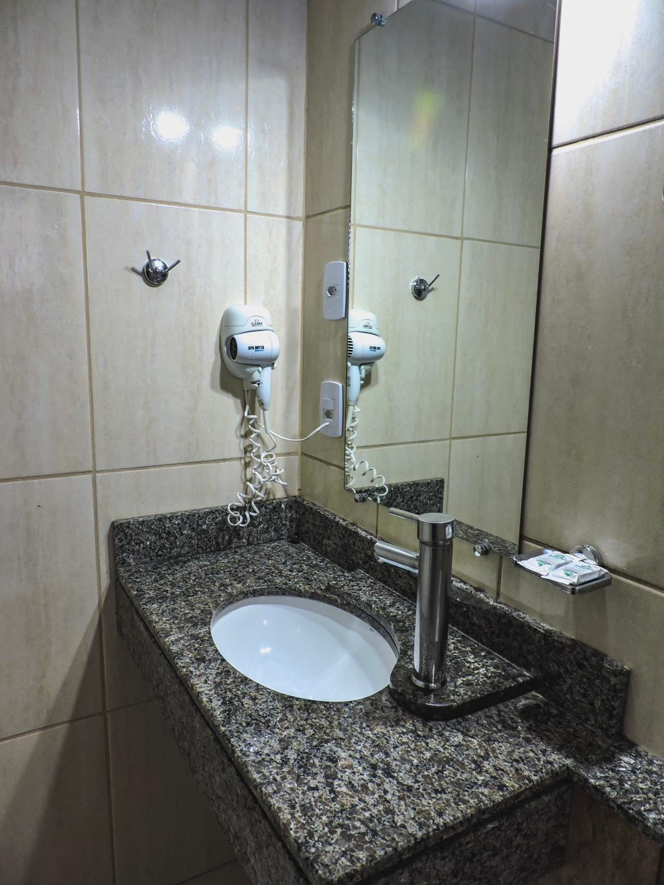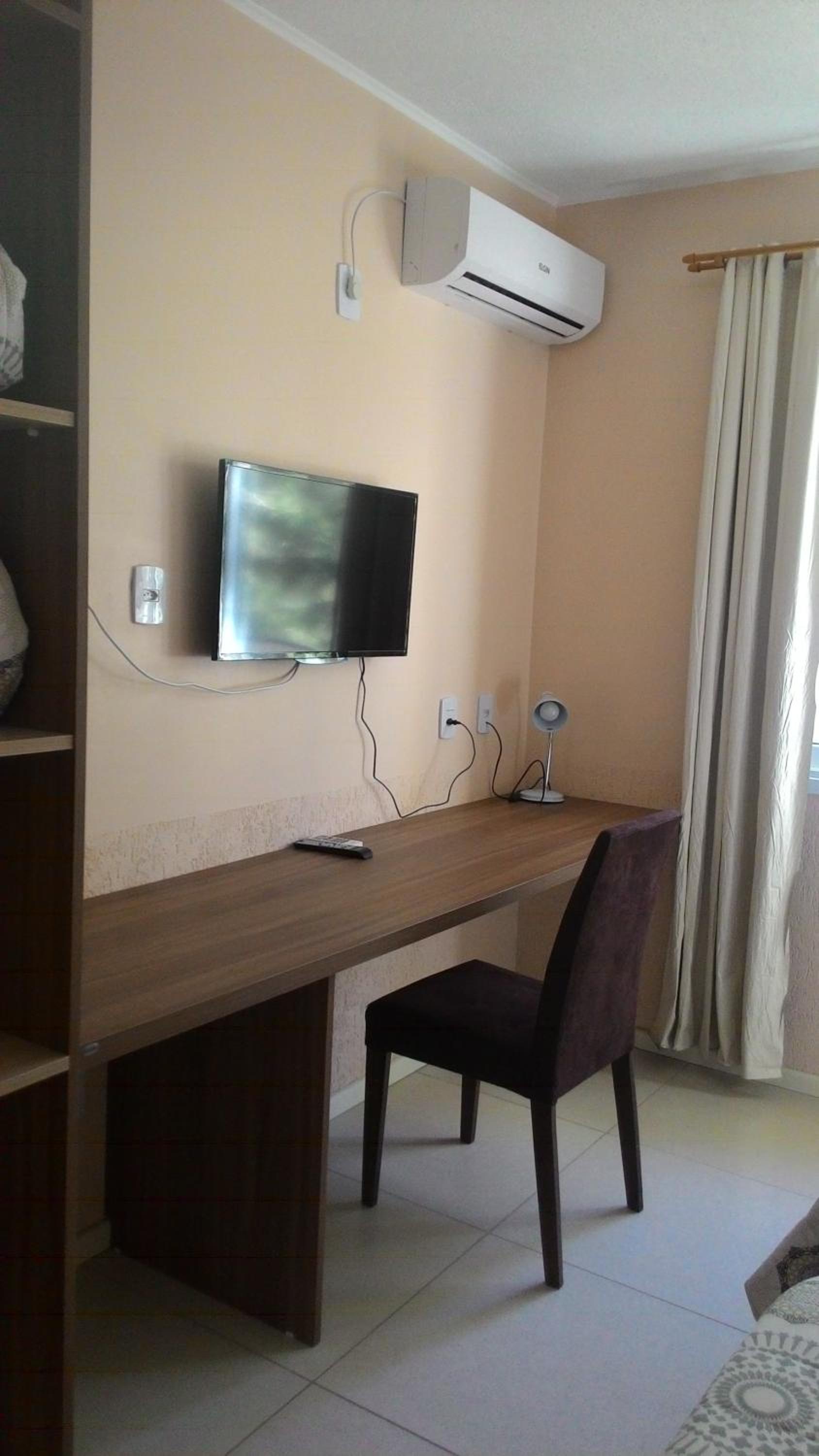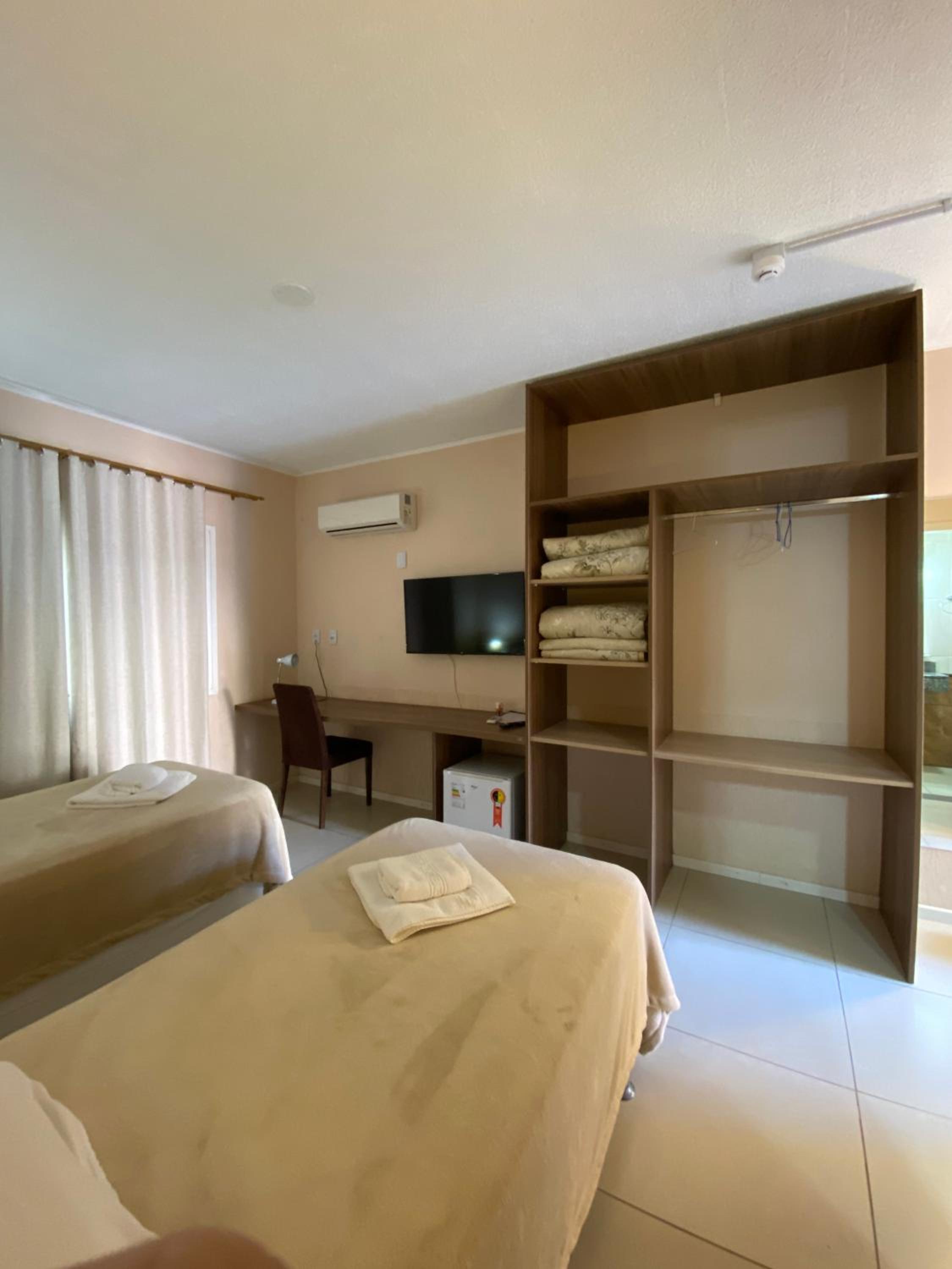 Do tamanho do quarto e do banheiro, limpo com banho de agua quente central. estacionamento gratuito, com wifi e canais basicos de televisão.
