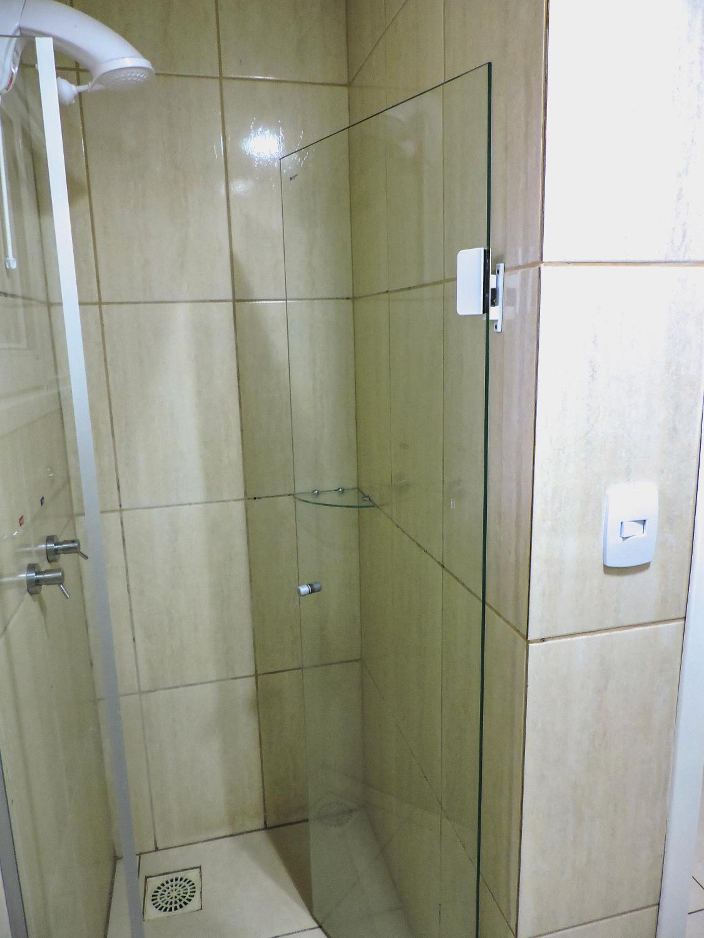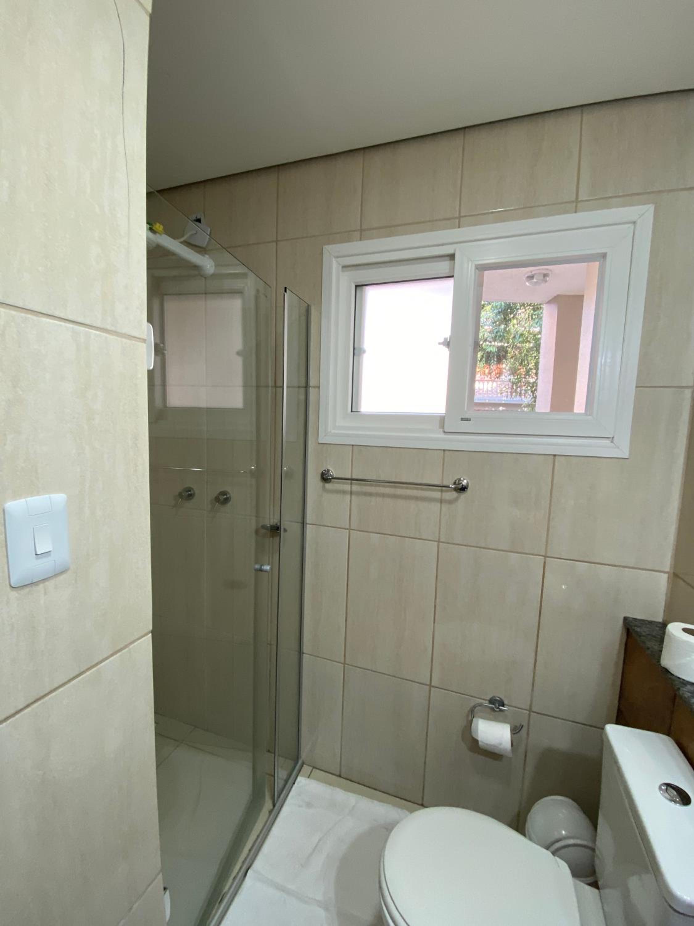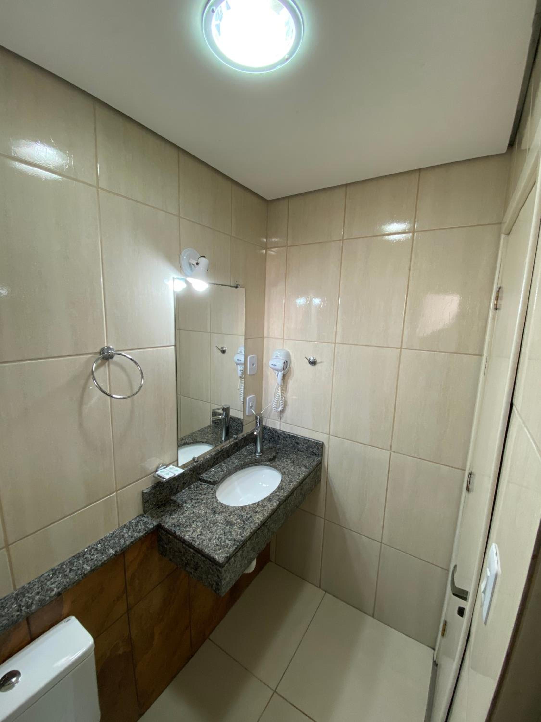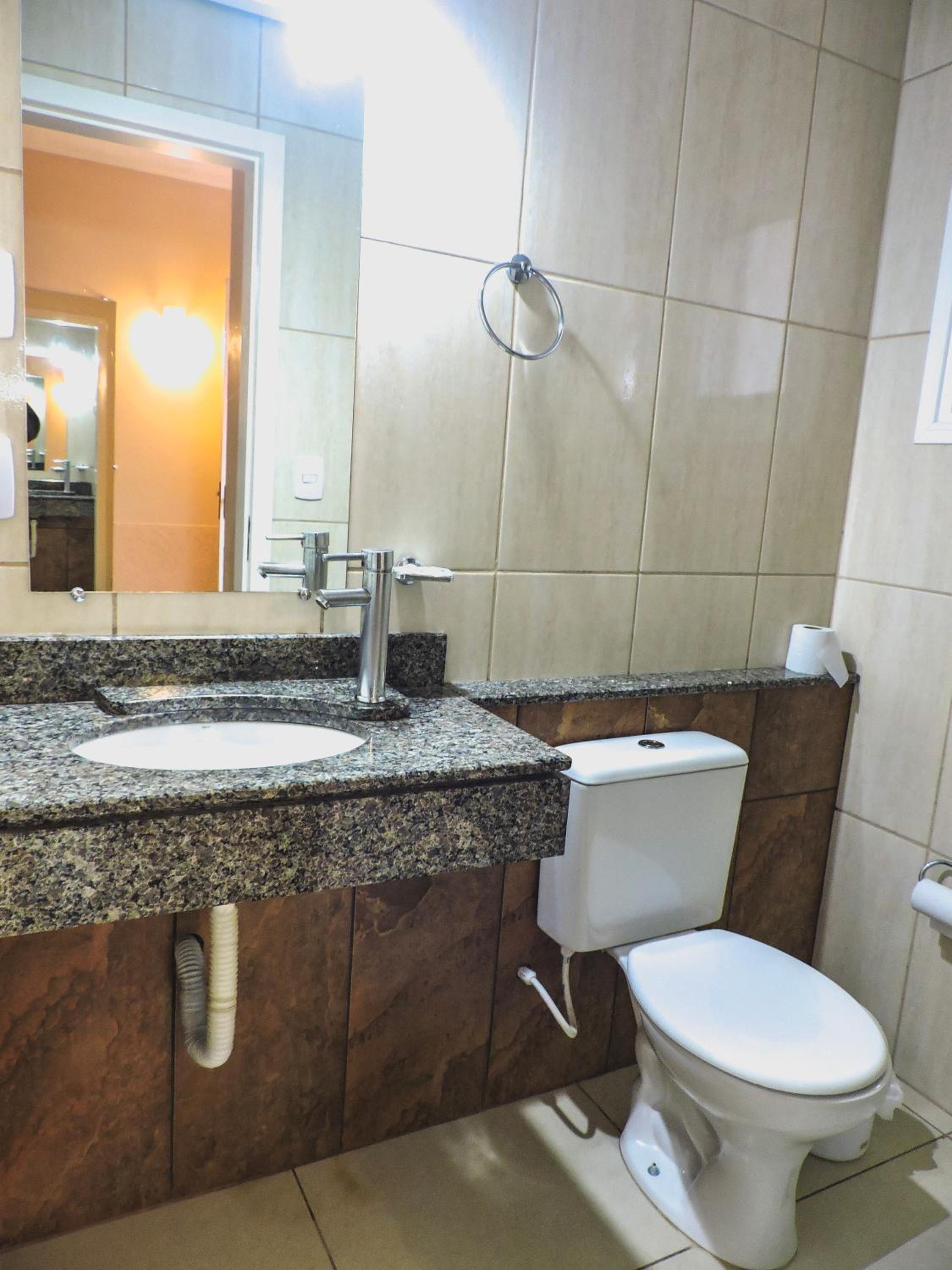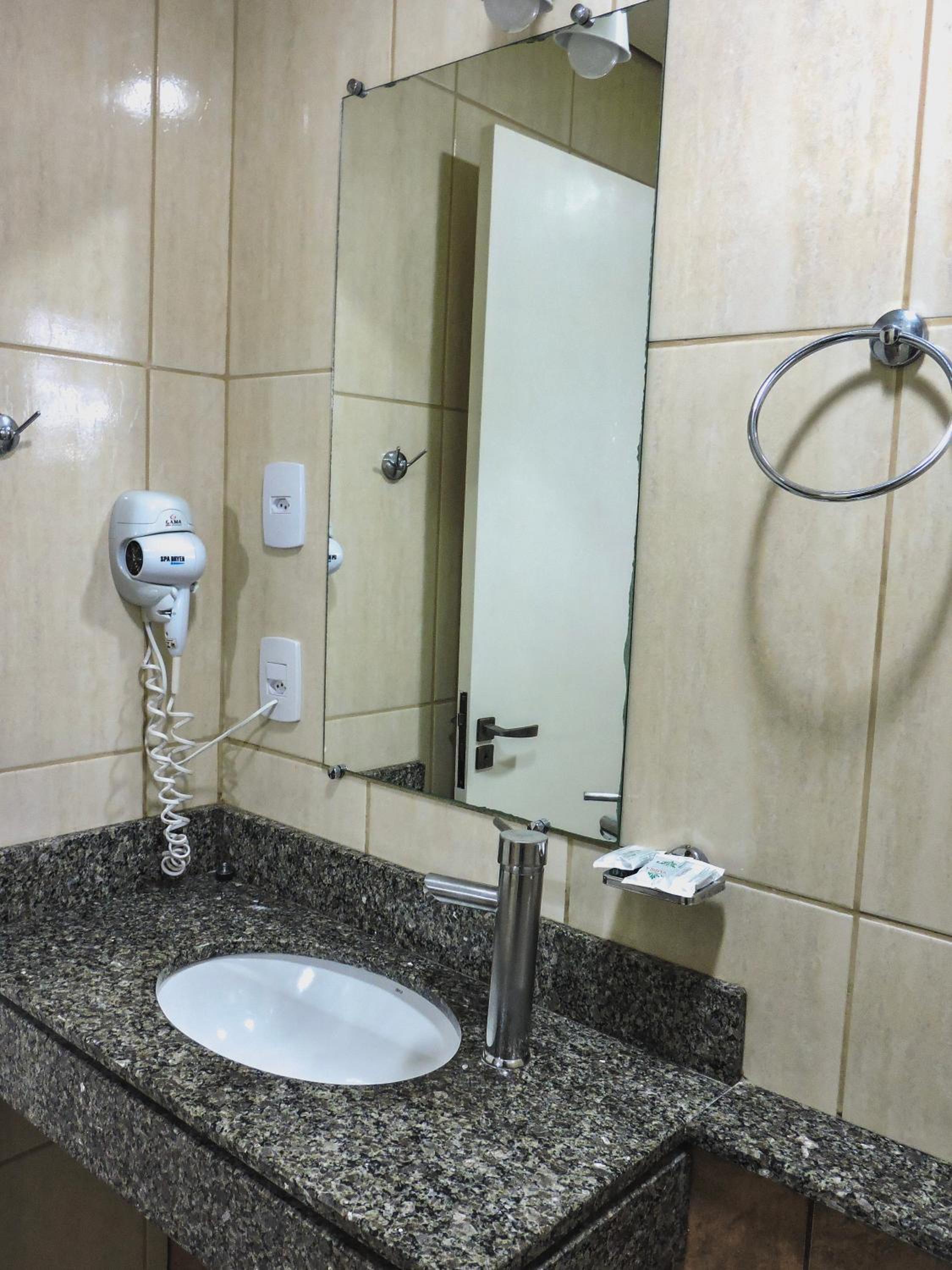 Do tamanho do quarto e do banheiro, limpo com banho de agua quente central. estacionamento gratuito, com wifi e canais basicos de televisão.