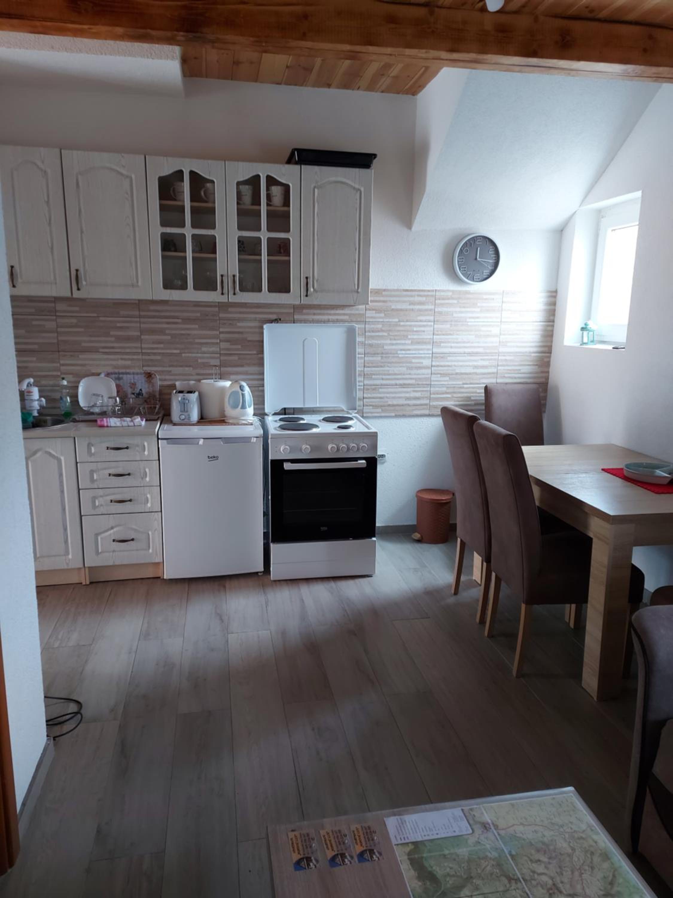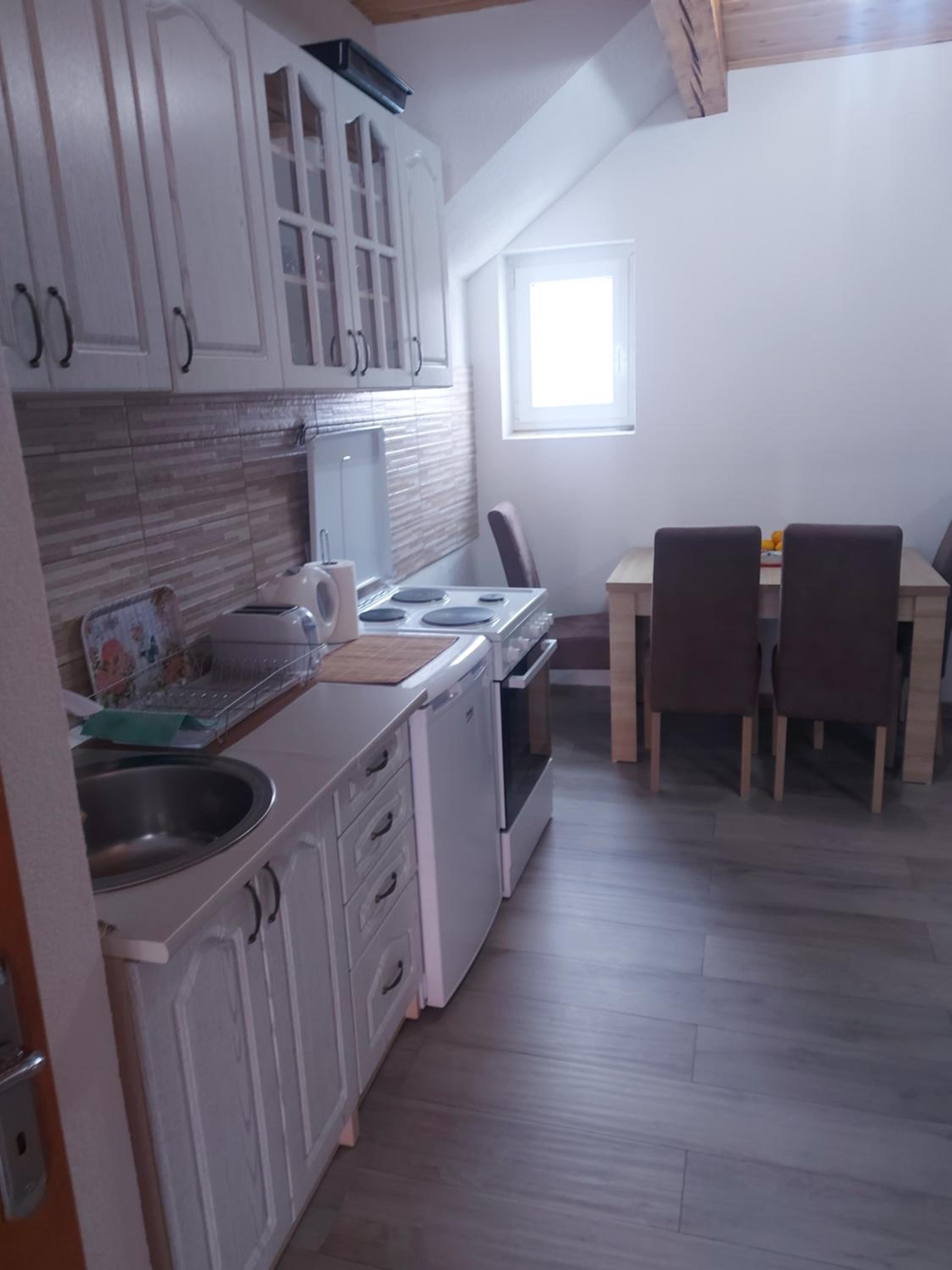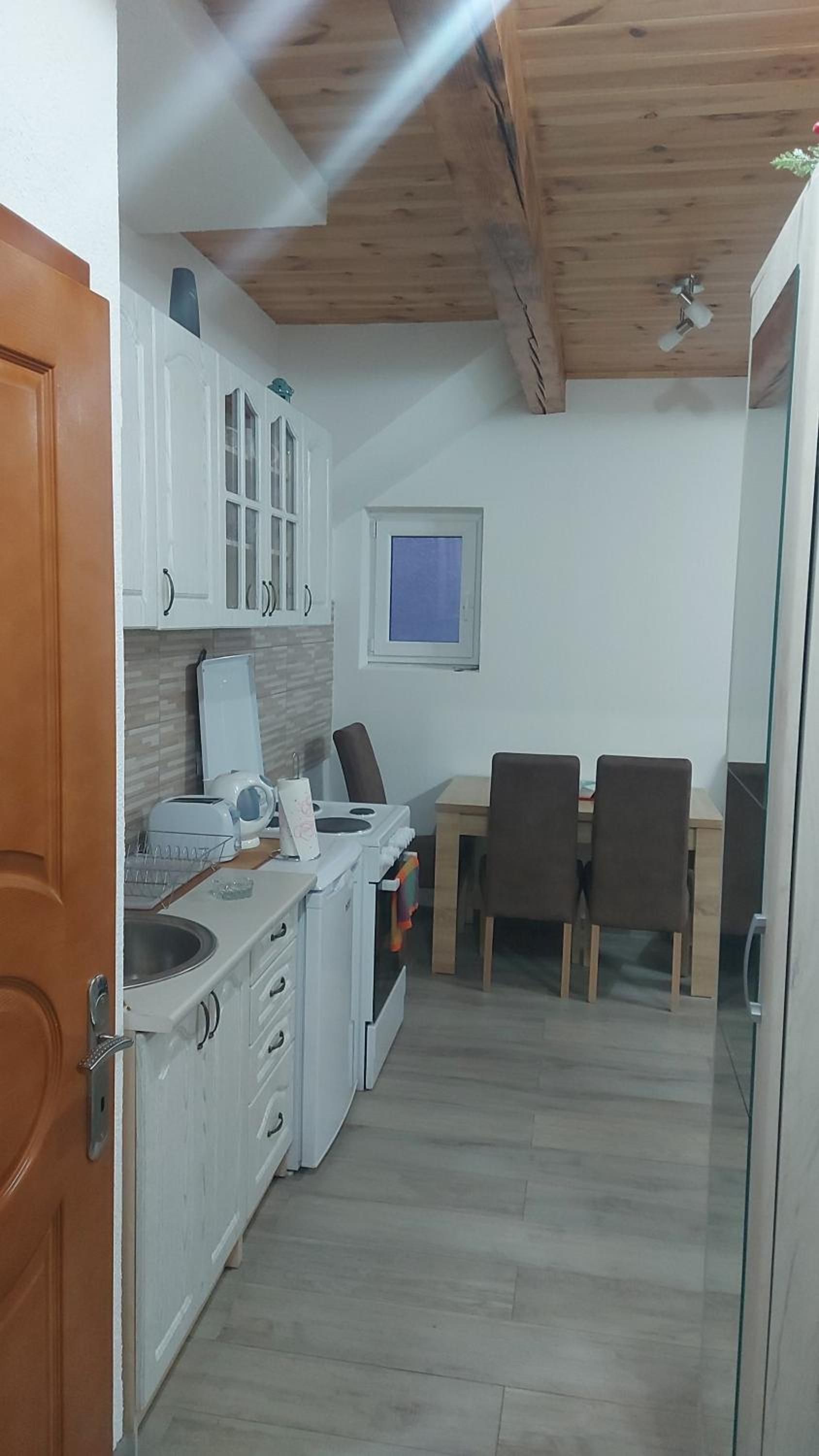 We stayed for a couple of nights when another hotel canceled our reservation. They even arrived late at night and let us in. The hosts are very nice people, they were really helpful.The apartment can only be accessed by steep stairs, but it didn't cause any problems for us. Tidy, there is a small kitchenette, dishes. A large double bed, a small and cozy living room connected to the spacious kitchen. There is everything you need in the kitchen. It was perfect for us (three people).