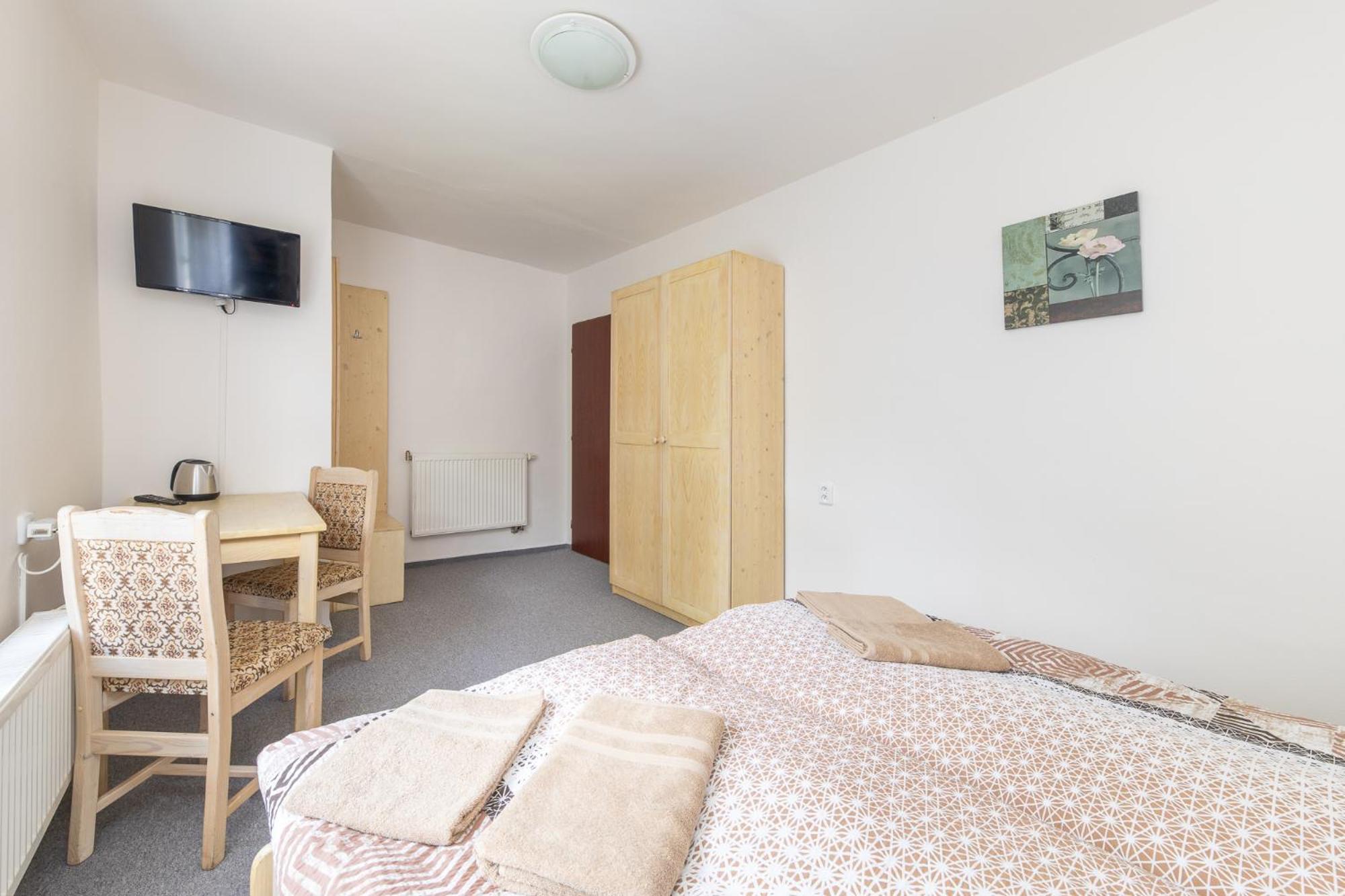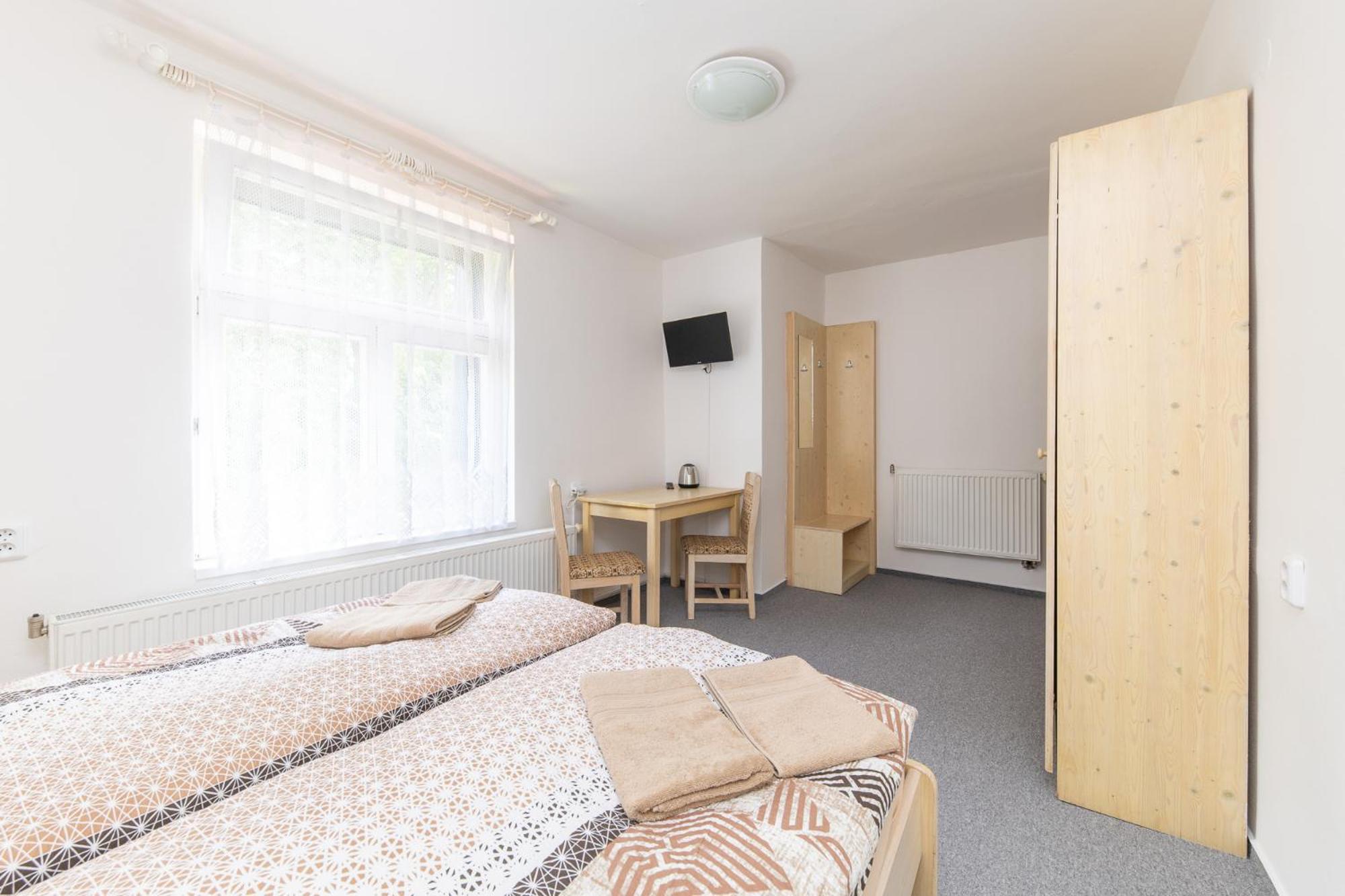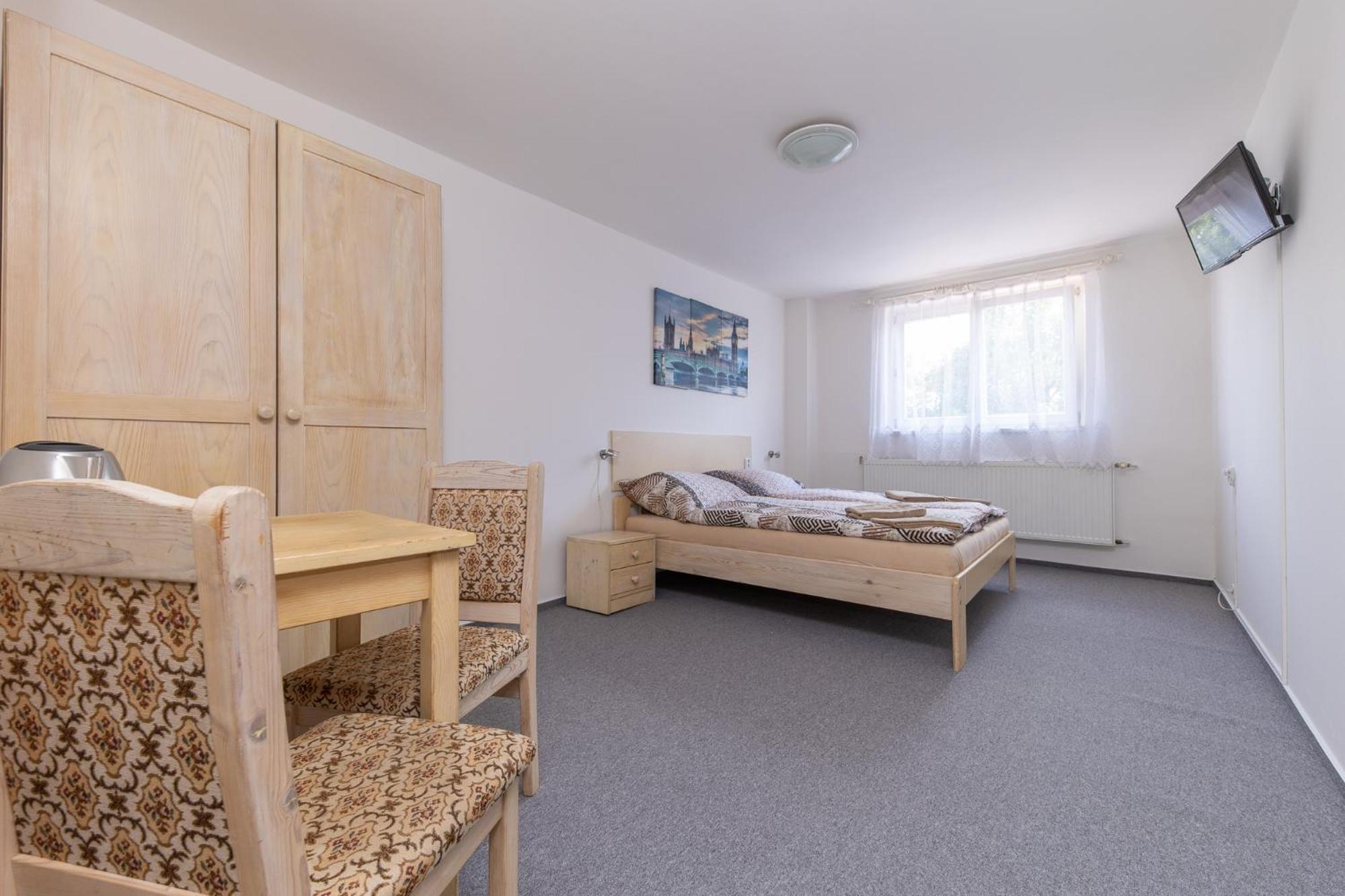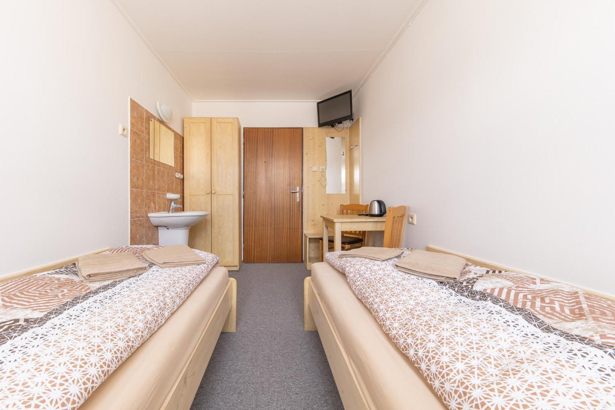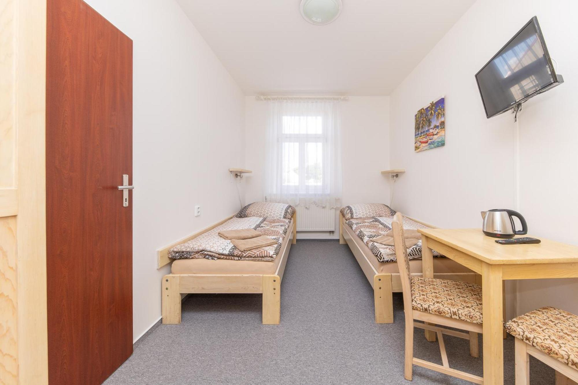 Skříň a postele pěkné, světlé dřevo, jako nové. Televize už mírně historická, se set-top-boxem připojeným SCARTem - ale funkční. WIFI funkční, bez hesla. V noci v hotelu klid a ticho.