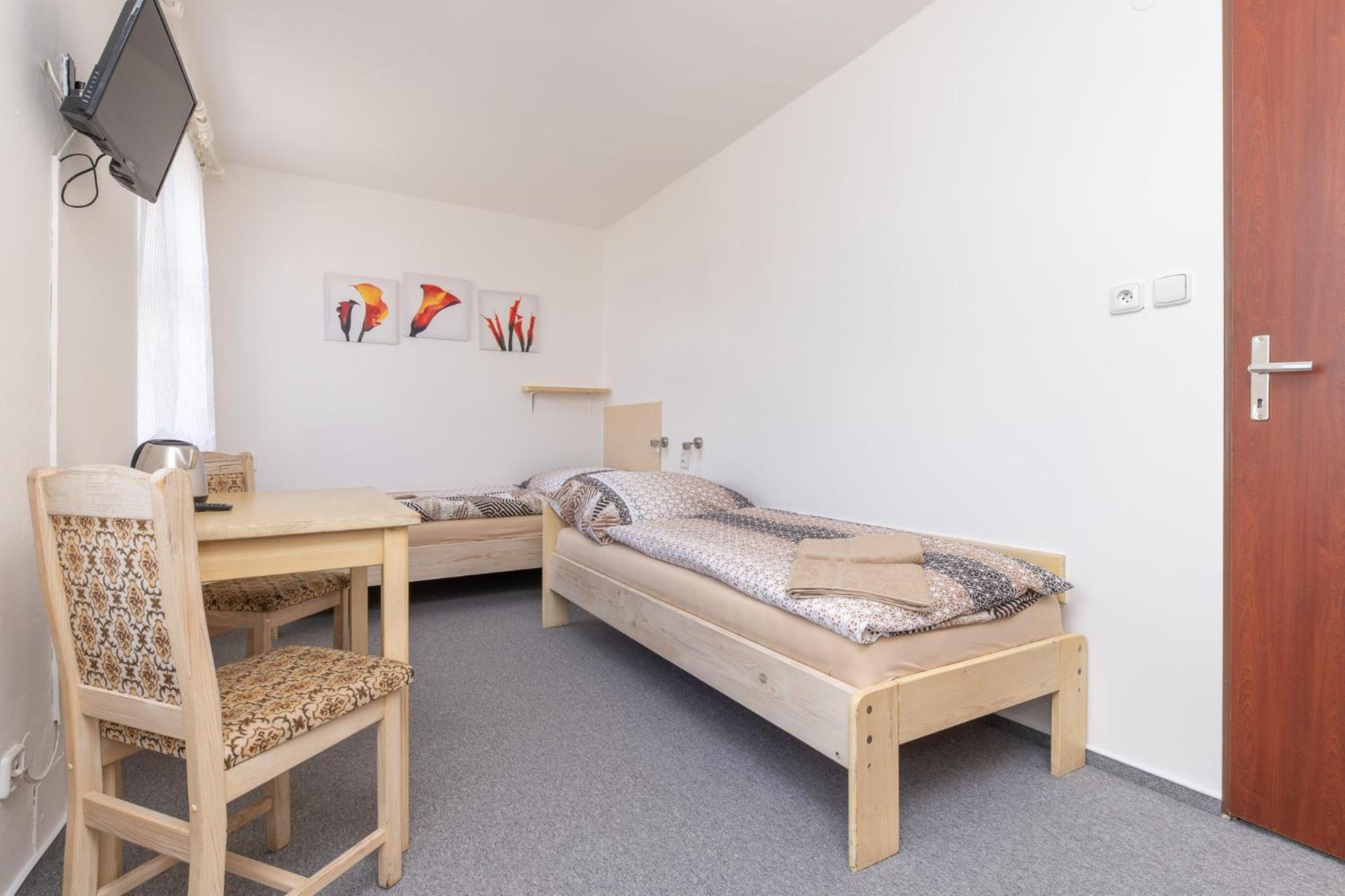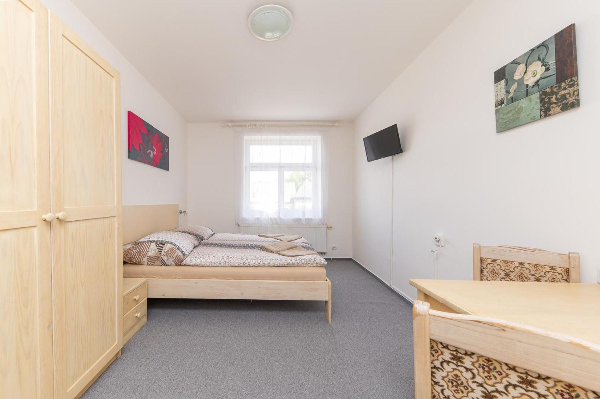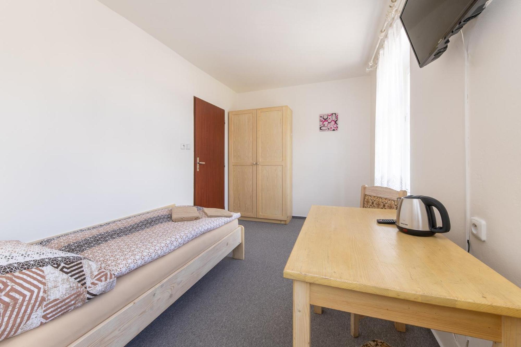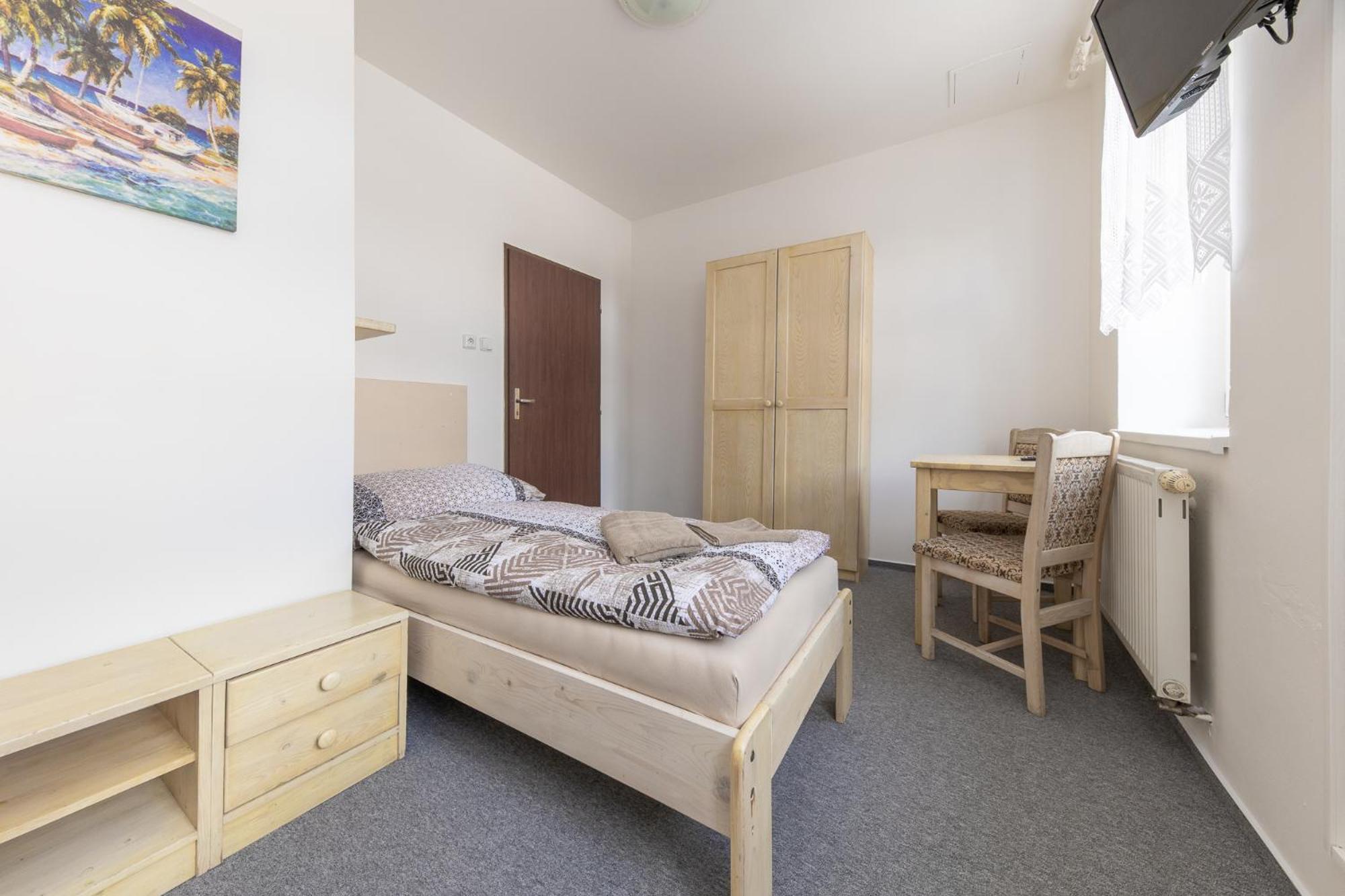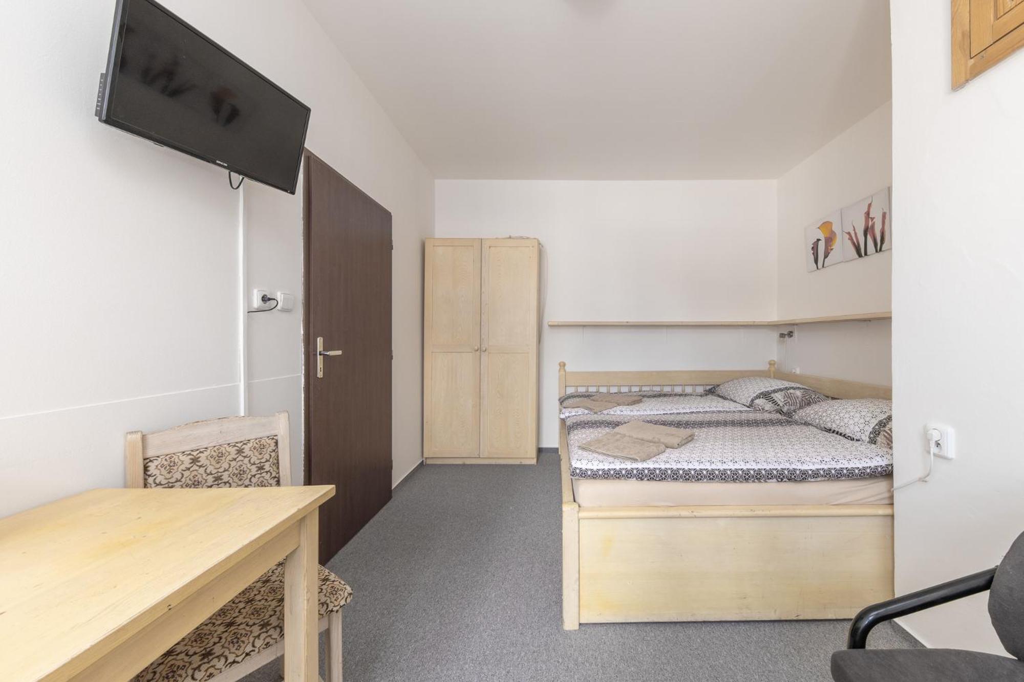 Skříň a postele pěkné, světlé dřevo, jako nové. Televize už mírně historická, se set-top-boxem připojeným SCARTem - ale funkční. WIFI funkční, bez hesla. V noci v hotelu klid a ticho.