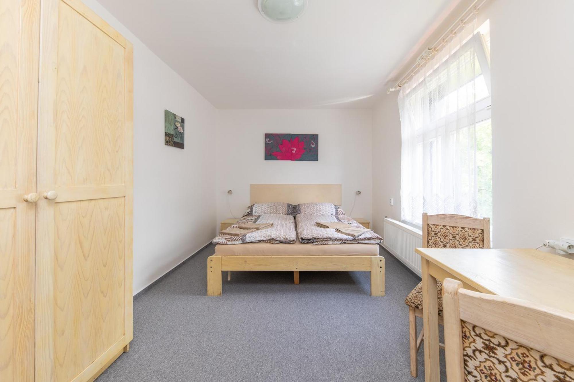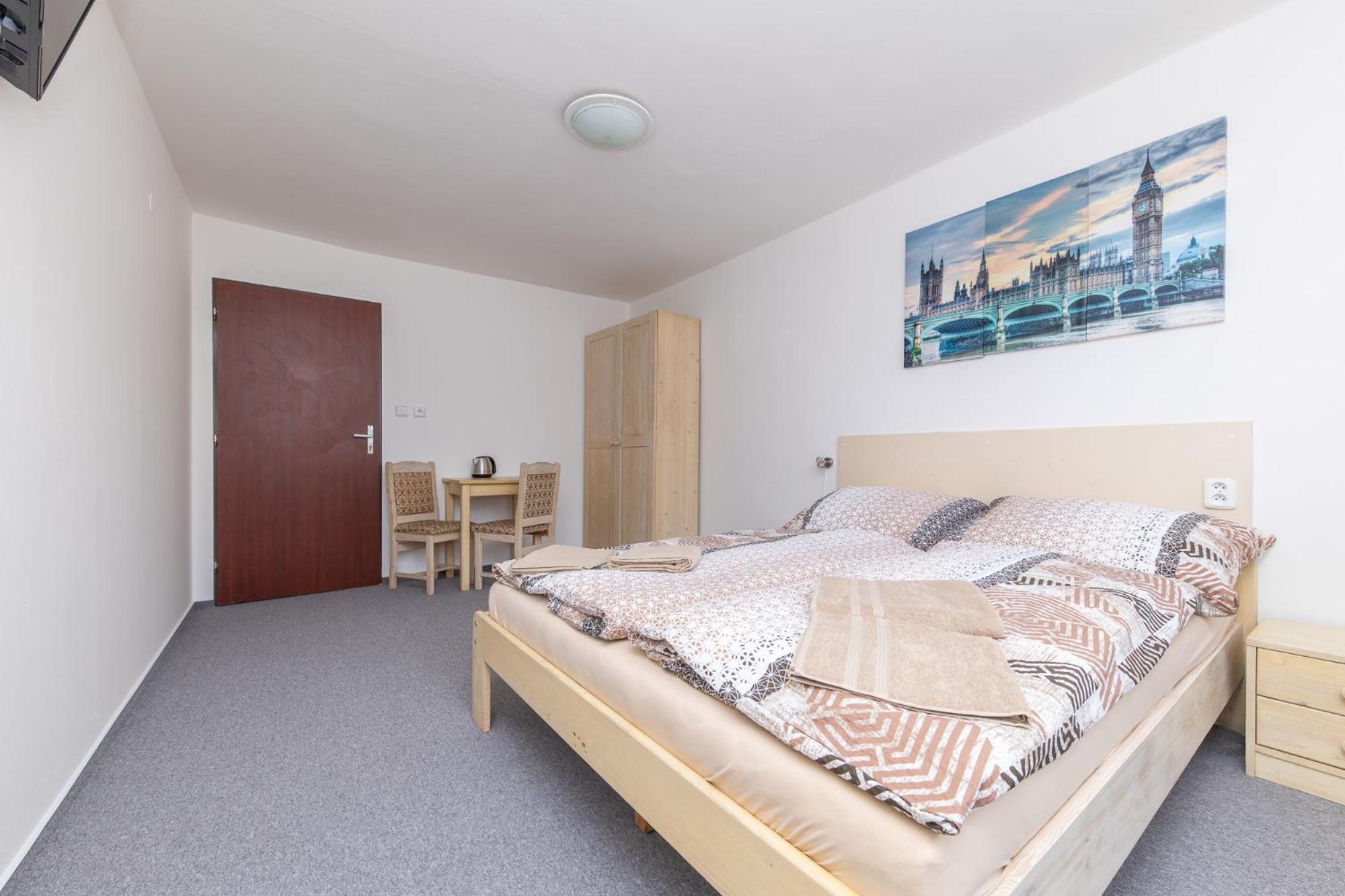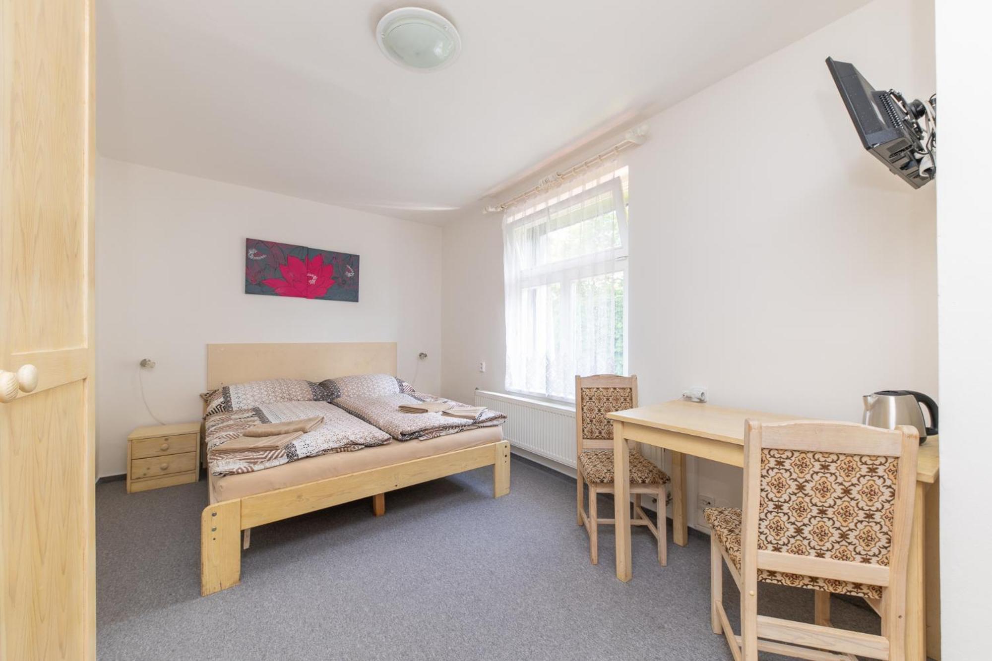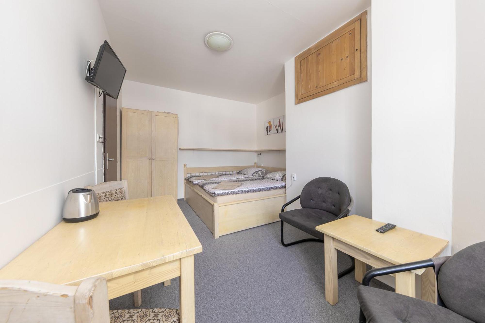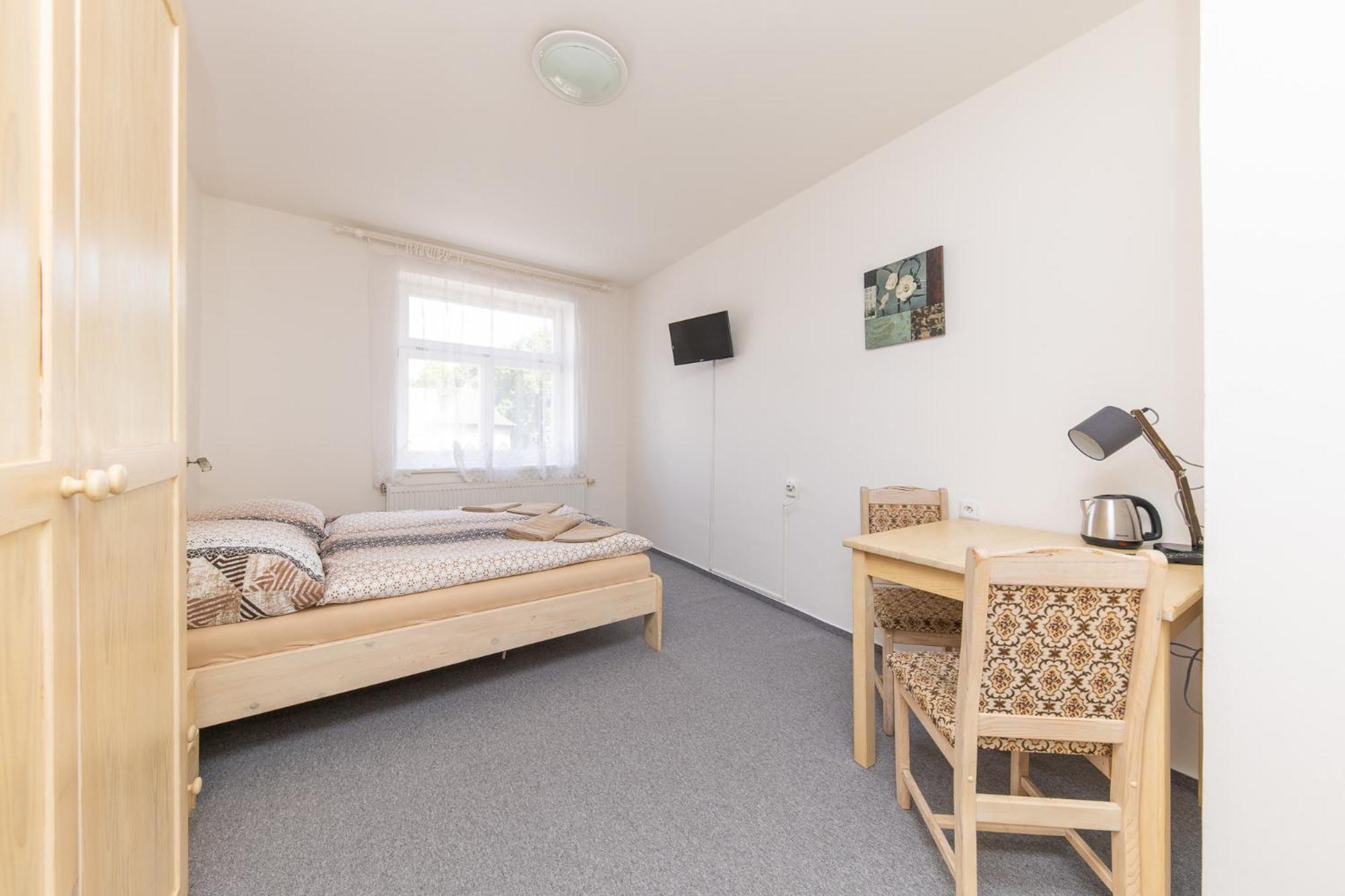 Skříň a postele pěkné, světlé dřevo, jako nové. Televize už mírně historická, se set-top-boxem připojeným SCARTem - ale funkční. WIFI funkční, bez hesla. V noci v hotelu klid a ticho.