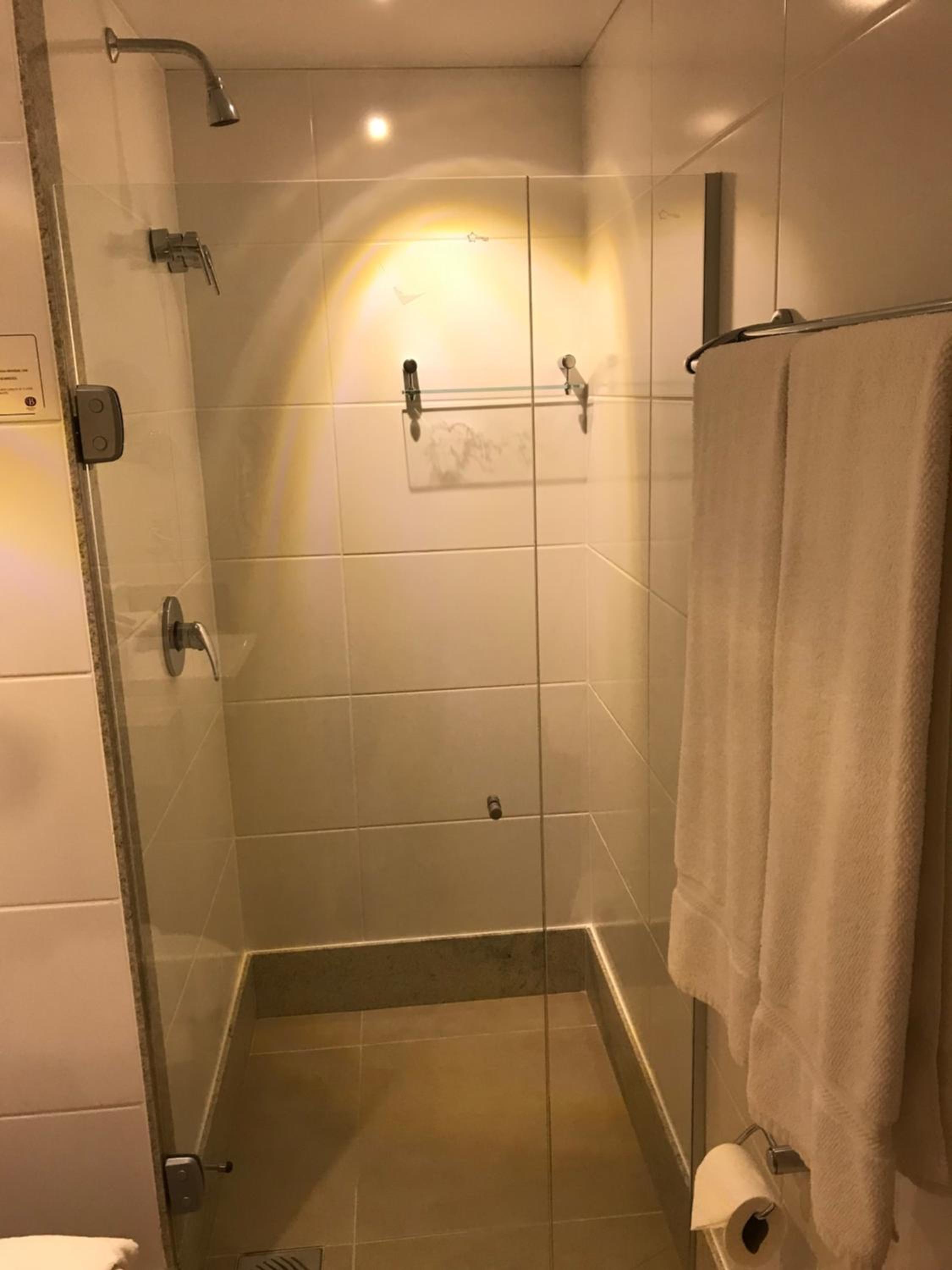 Iluminação do banheiro e a localização do porta shampoo, muito próximo do rosto, deveria ser de quina.