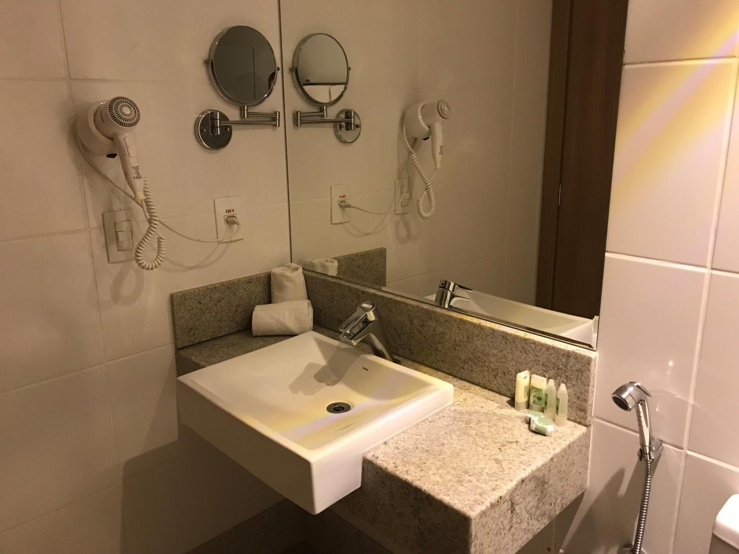 Banheiro tinha shampoo, condicionador, sabonete, secador e toalhas.