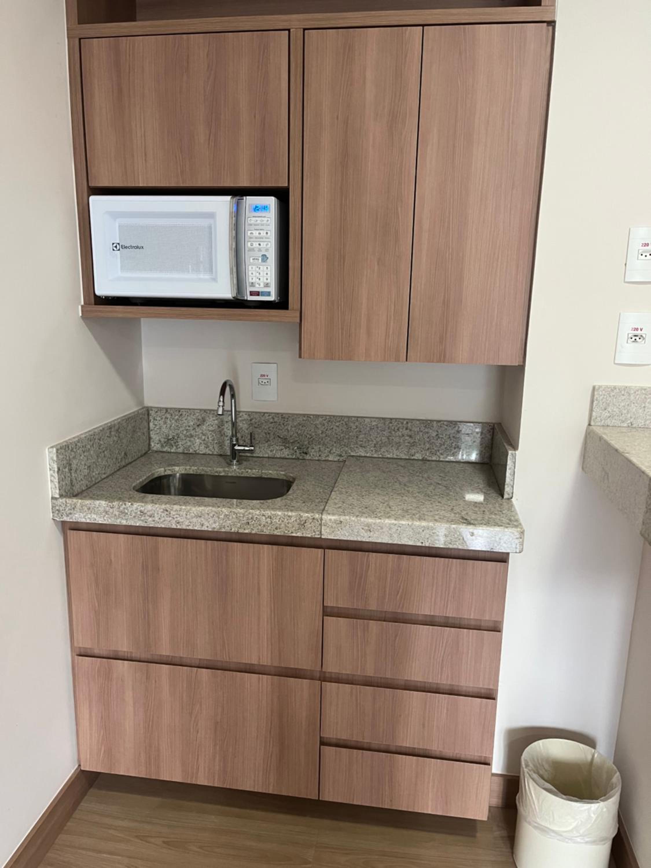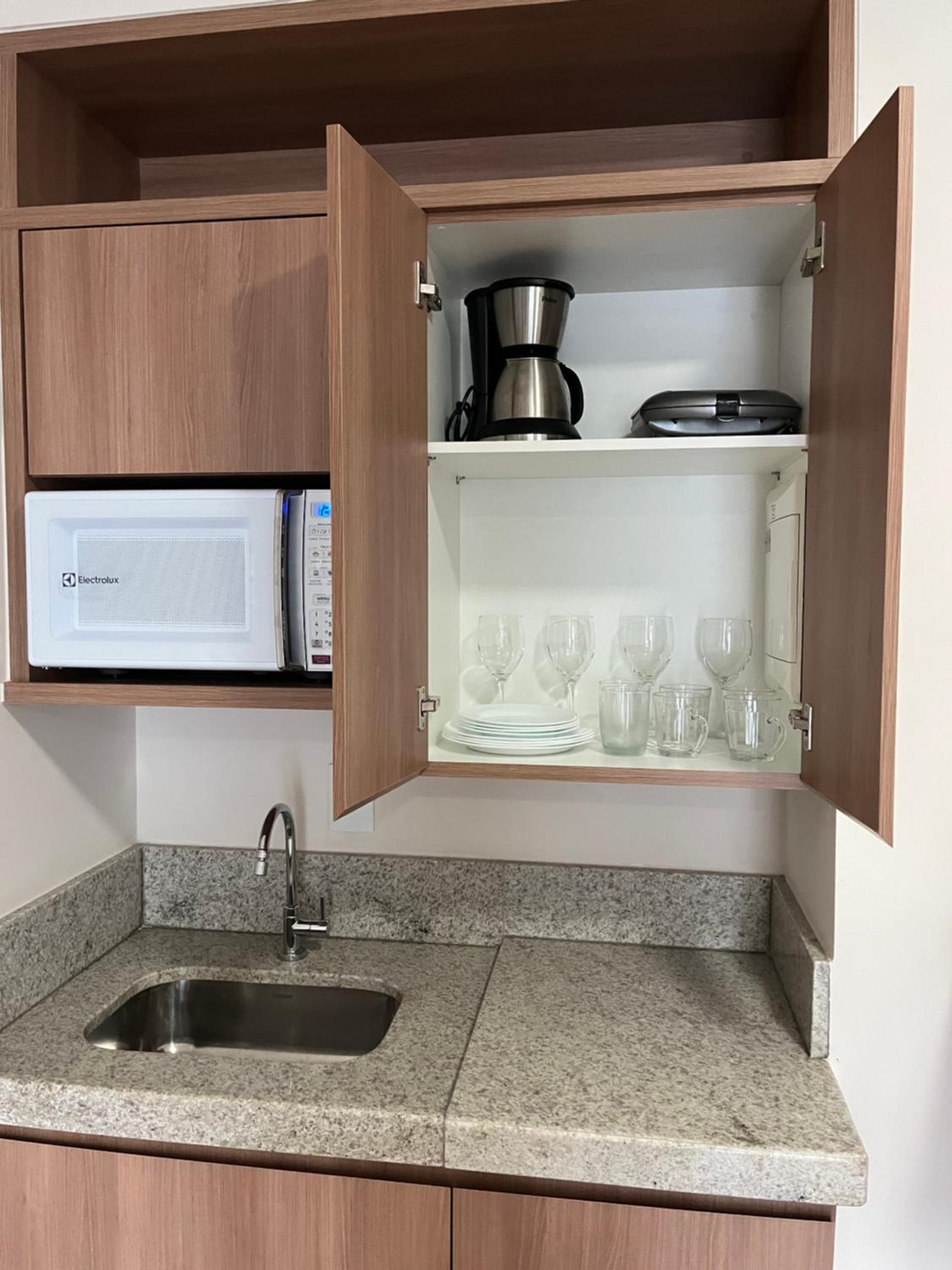 Estava tudo limpo, a cozinha é bem equipada com sanduicheira, airfryer, cafeteira e microondas.