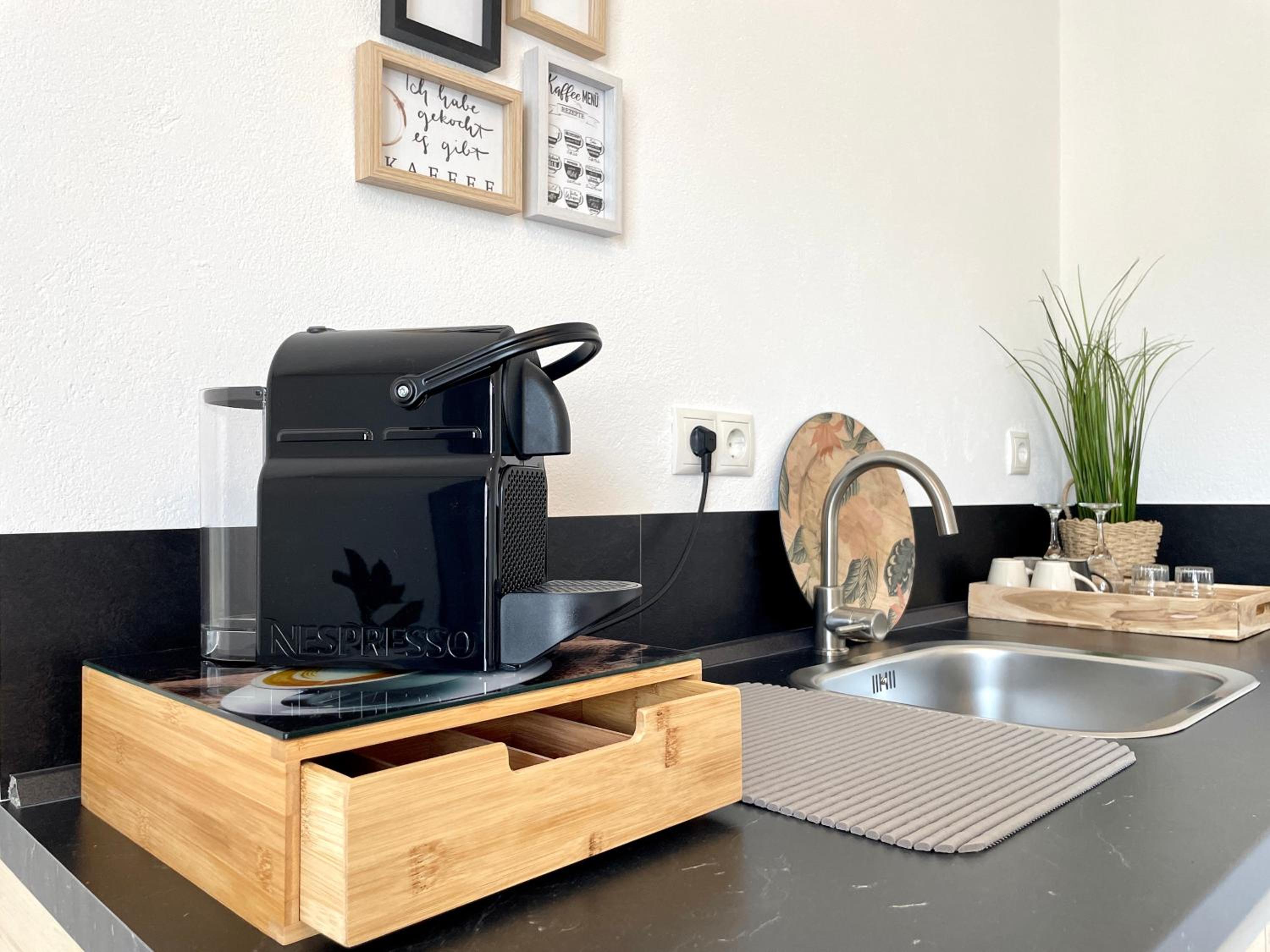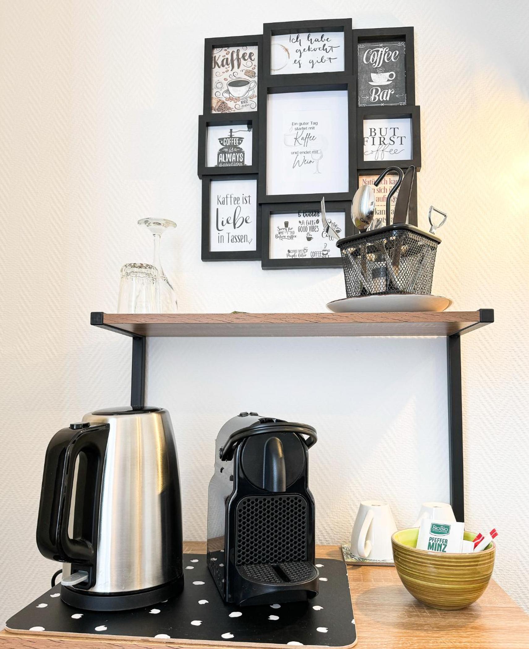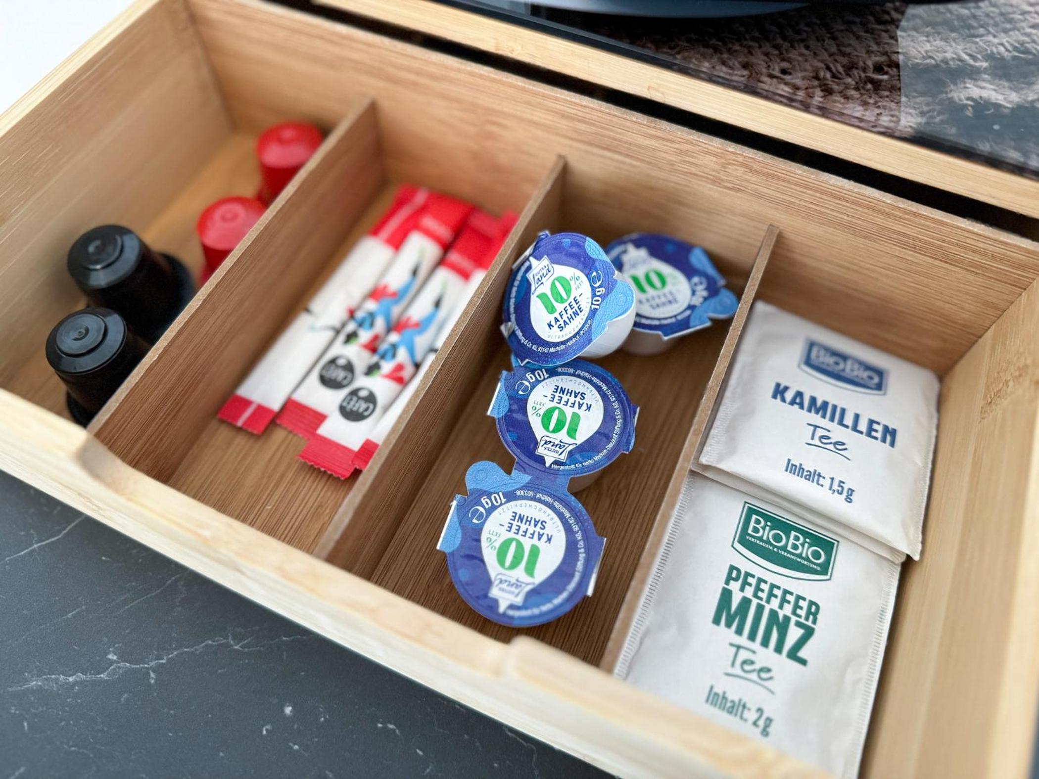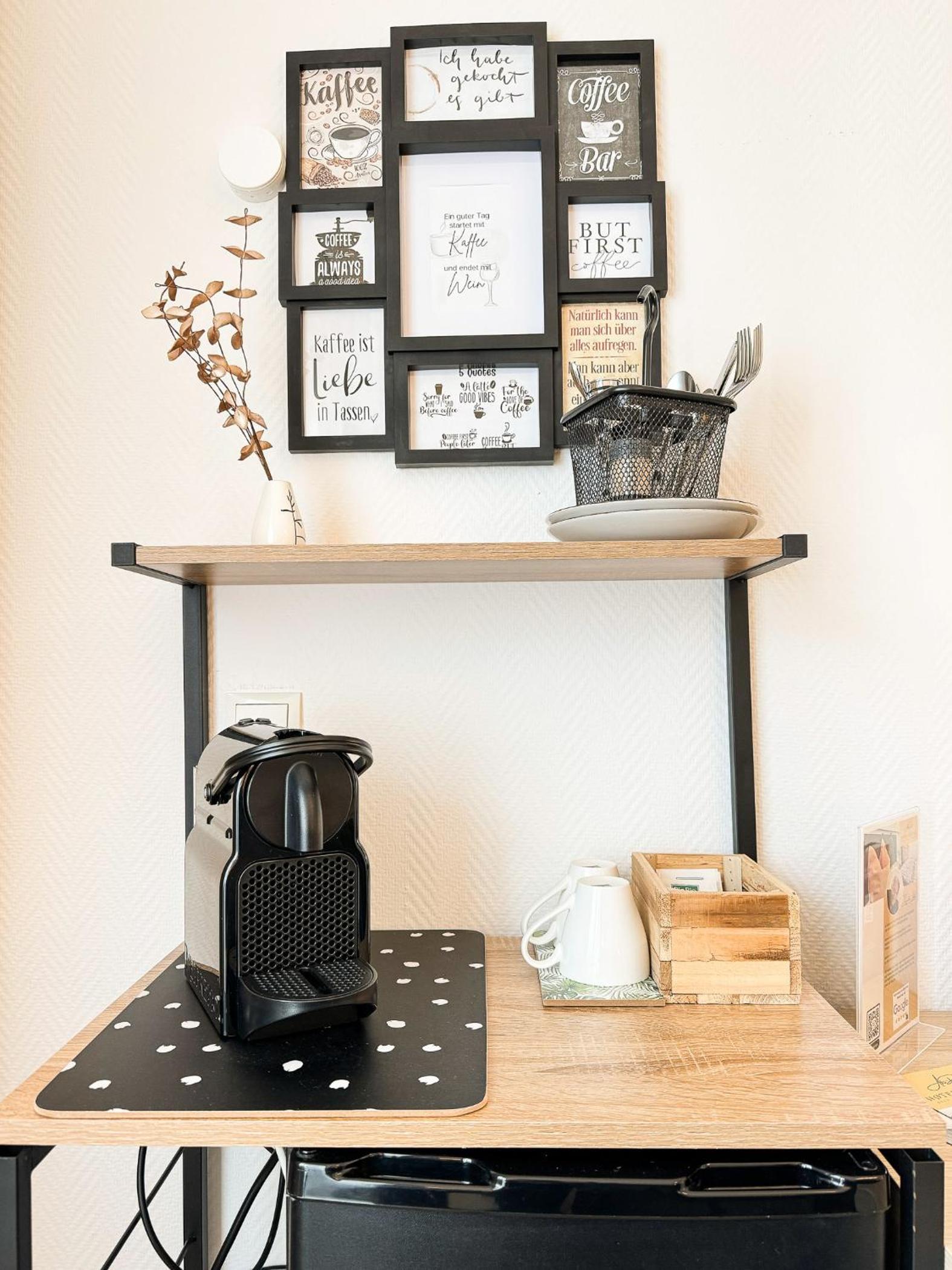 Ich wurde sehr freundlich empfangen.Es stand 1 Flasche Wasser im Kühlschrank.Kapsenl für die Kaffeemaschine waren vorrätig.Man konnte für eine Gebühr von 50 Cent ,Kapseln nach kaufen.