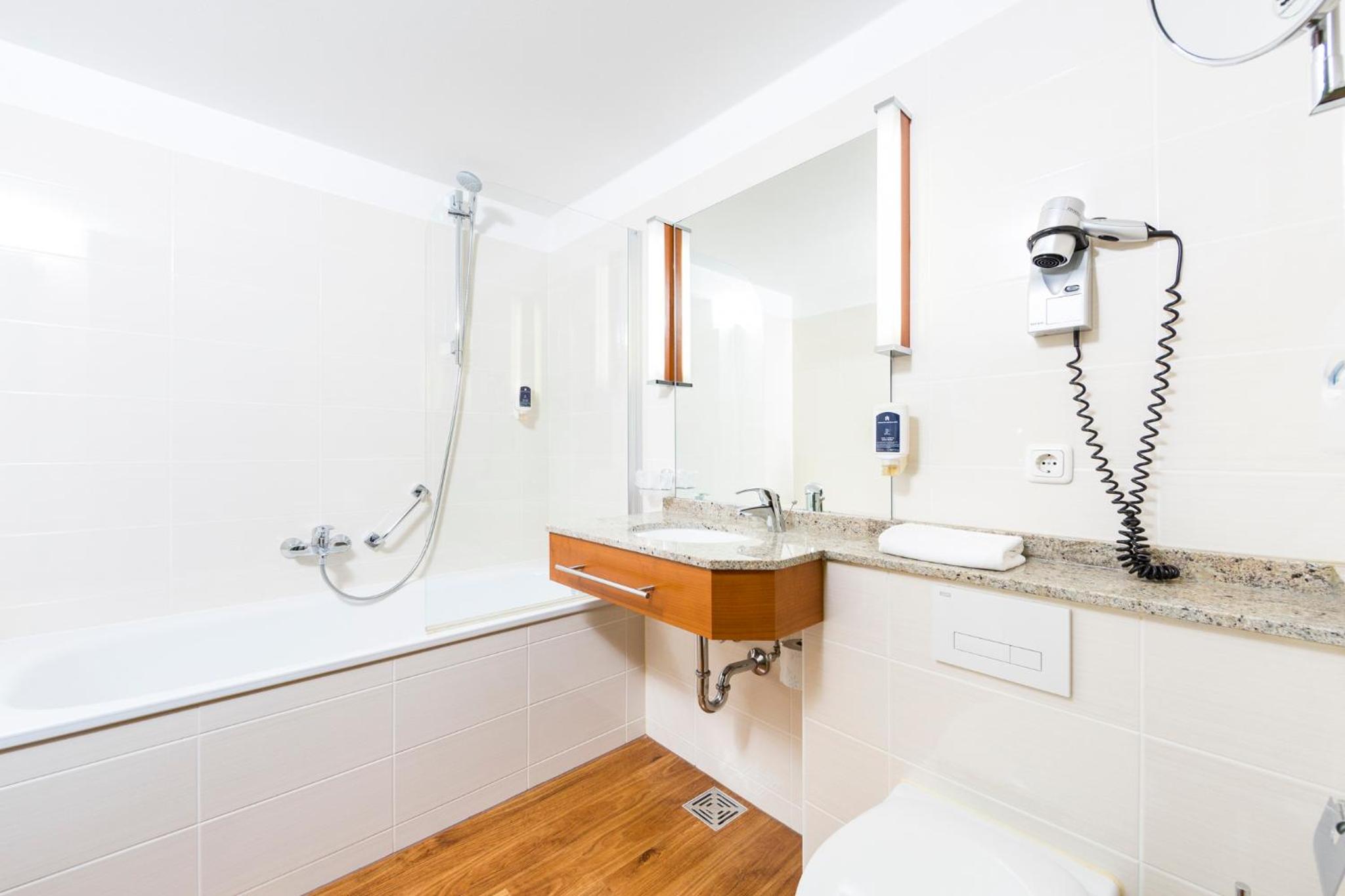 This is a fine hotel that could compete with 4 stars hotels in the same town. Room was very spacious for a family of 4. the bathroom was modern and big, with plenty of hot water. Breakfast was excellent with a good choice of food. our stay was very pleasant. Beds with good madrasses and pillows. We came back anorher time and got 2 large double rooms with good bathrooms. It is nice to find such quiet rooms in the city centre. The hotel has good noise insulation, and this is a must for us. The beds wnd pillows were very good also this time, with no holes.