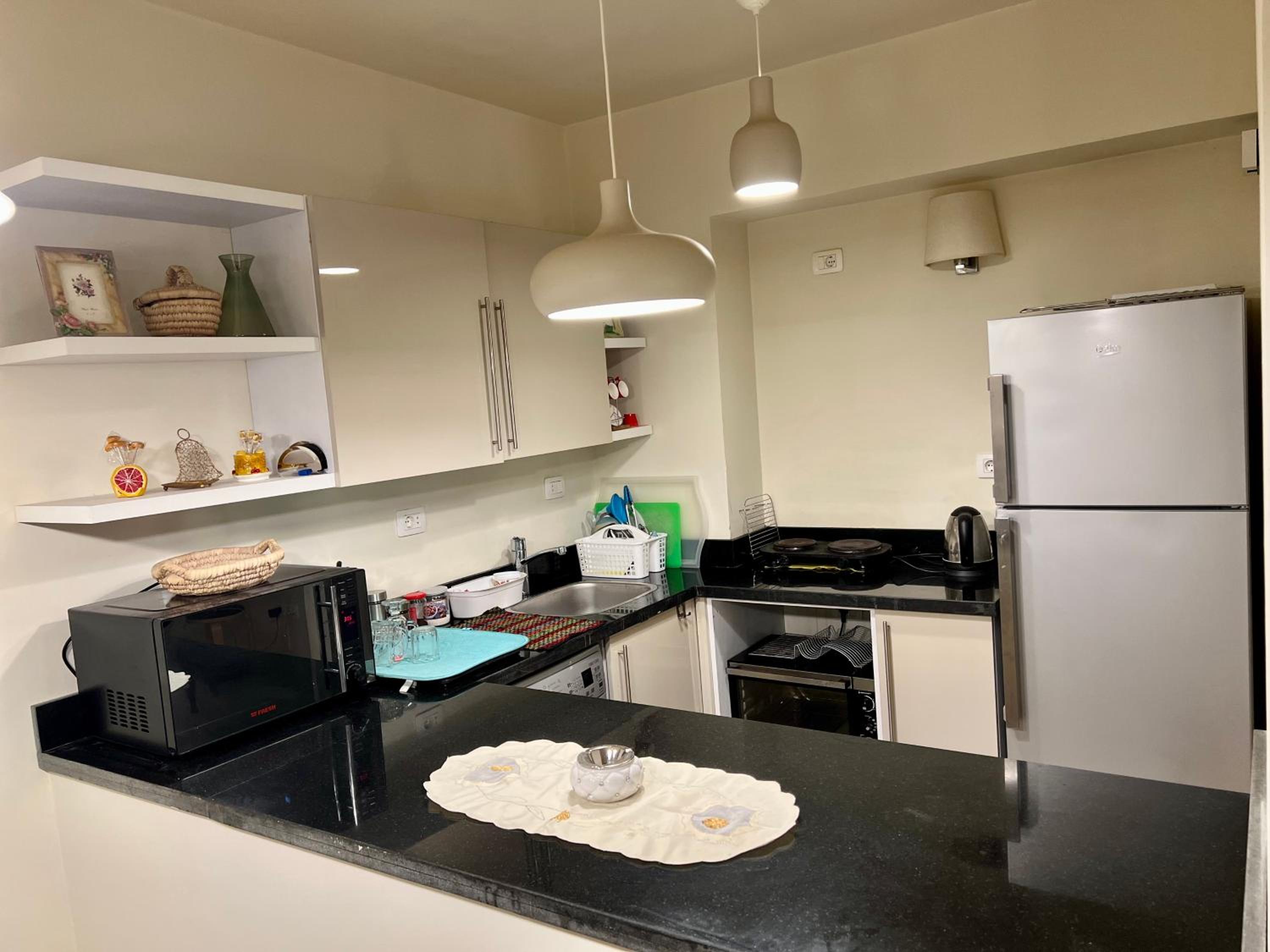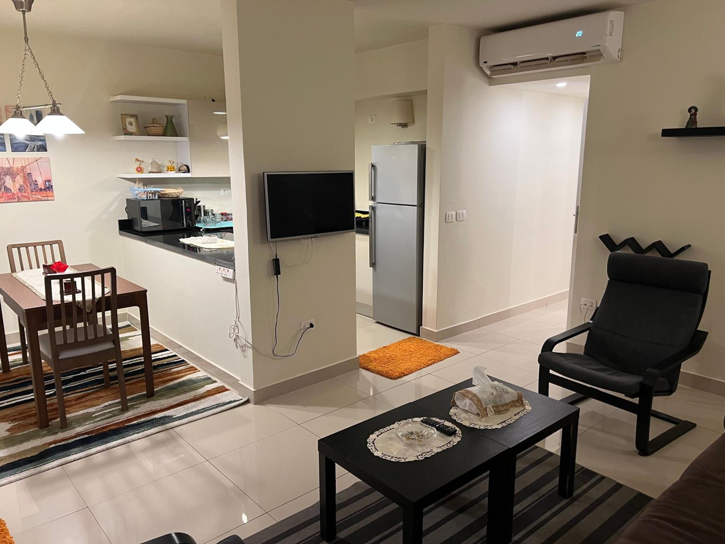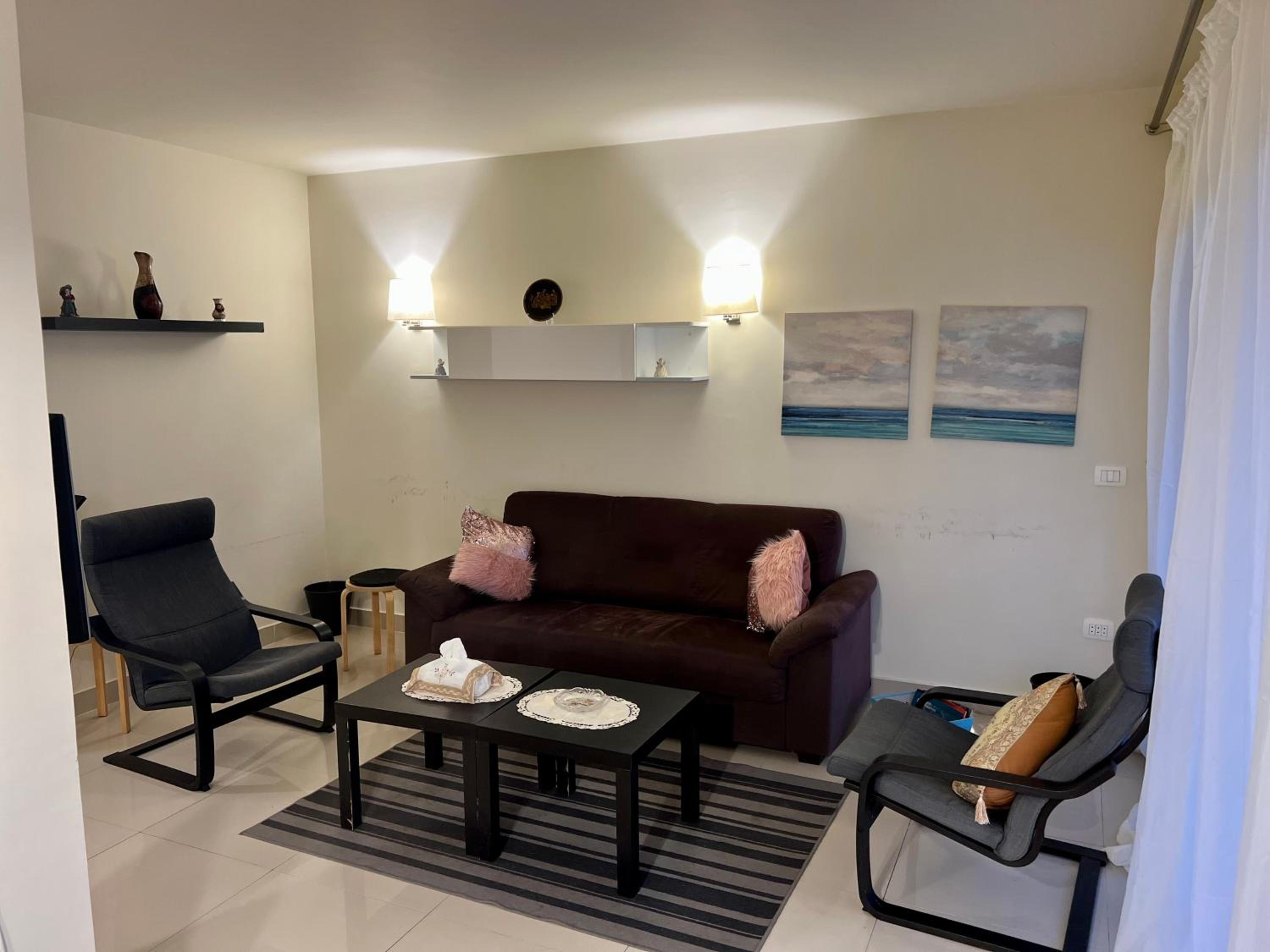 Very dirty apartment. The carpets are burnt, the linen is old and torn. Dust everywhere. Hair, trash. I cleaned it myself for 4 hours. True, the owner extended one night for free because of this. The door to the shower stall does not open or close without the help of a second person. The stove doesn't work. The Internet is very weak. It is impossible to open the door to the balcony; it jams. And the main problem is the windows in the bedrooms, they are very small and open onto the stairs and you only see the steps. Another problem behind the wall of a small bedroom is a shaft with air conditioners and the wall is hot all the time, and the noise from the air conditioners is 24 hours a day. Also, the declared beach is located in the distance, you need to order a golf cart, you can’t reach it on foot. This beach is not equipped and it is impossible to go into the sea because of the corrals, it is very shallow, there is some grass at the bottom, old dirty scary sunbeds. You need to go by pre-booking a car or golf cart to Downtown Sahl Hasheesh. And there are even paid beaches for guests. Restaurants are few and very expensive. And one very small Best Way store. It's a long way from Hurghada, 30-40 minutes by car. Drivers don't want to go and ask for a minimum of $10 one way. In general, I don't recommend it at all. And there are flies everywhere, it's terrible.