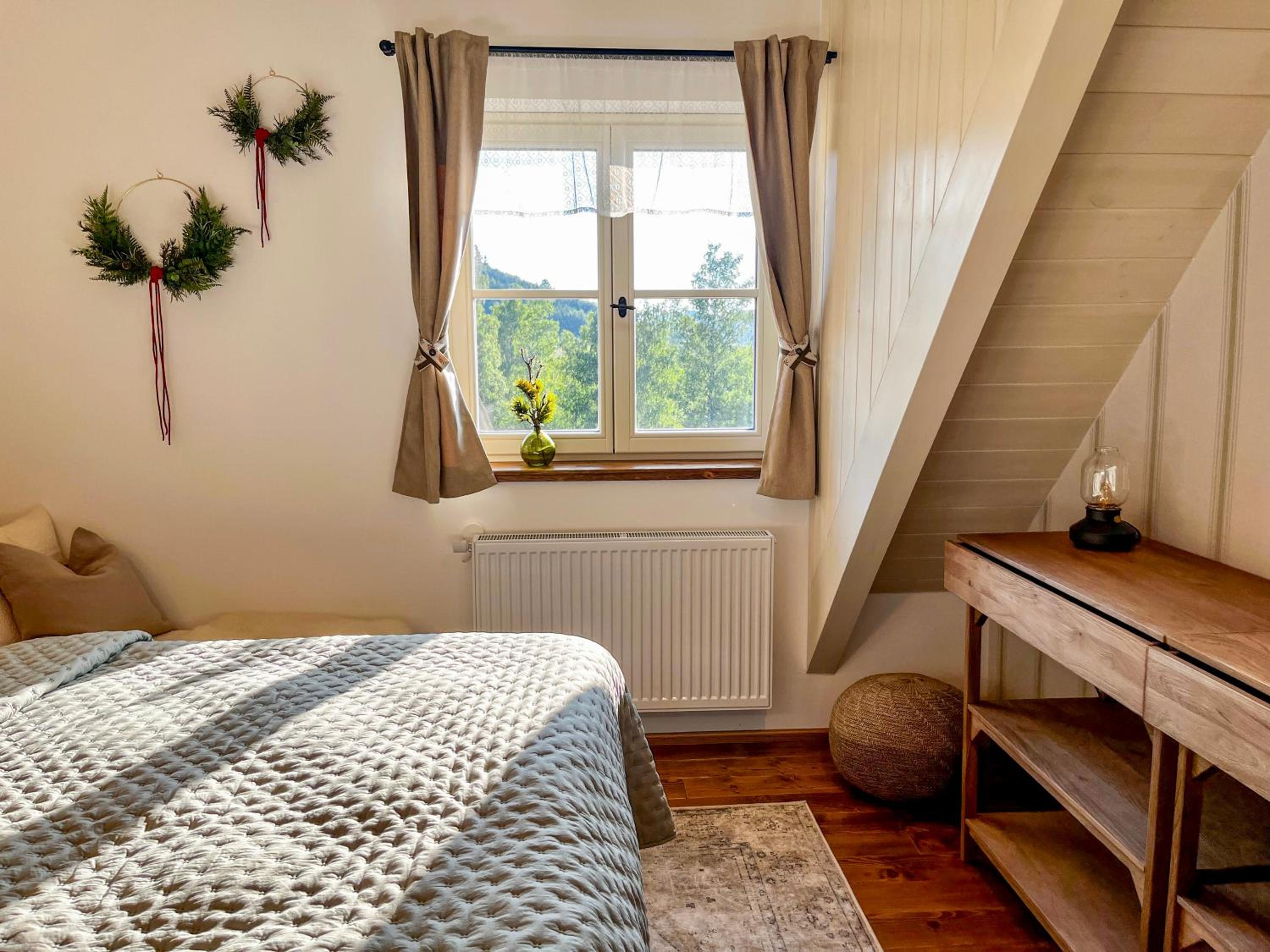 Naprosto výjimečné místo s výhledem na louky, lesy, ale i na Velký Javorník (nekoukáte do zástavby nebo parkoviště, ale opravdu do přírody. Apartmán je stylově zařízen. Postele také naprosto luxusní, vyspal jsem se lépe než doma a to je ve říct. Hned vedle je hospoda se skvělou kuchyní.