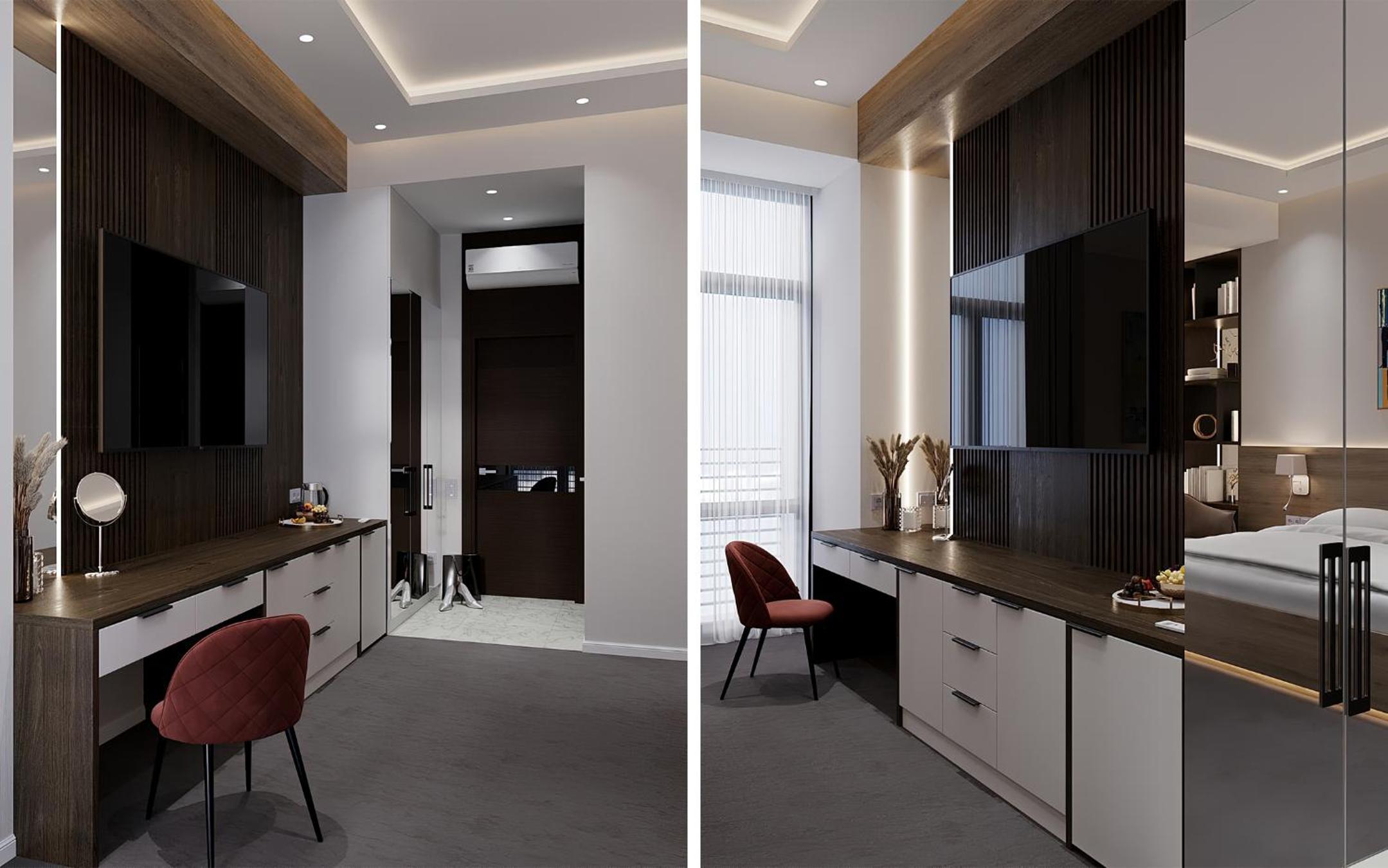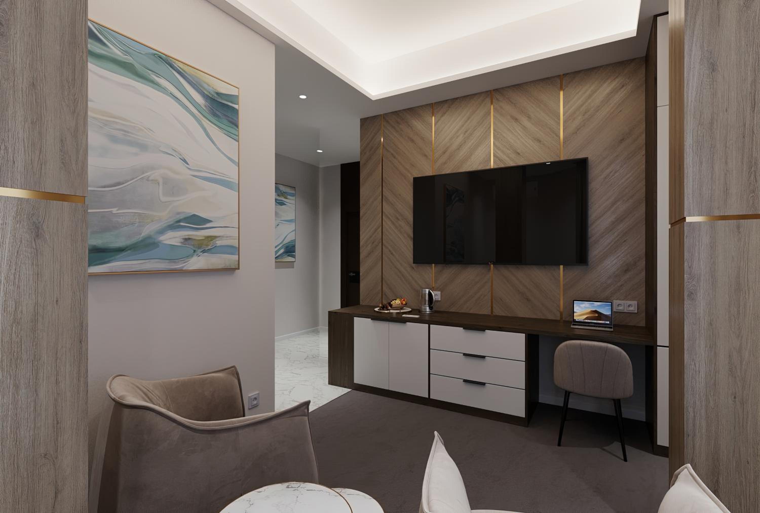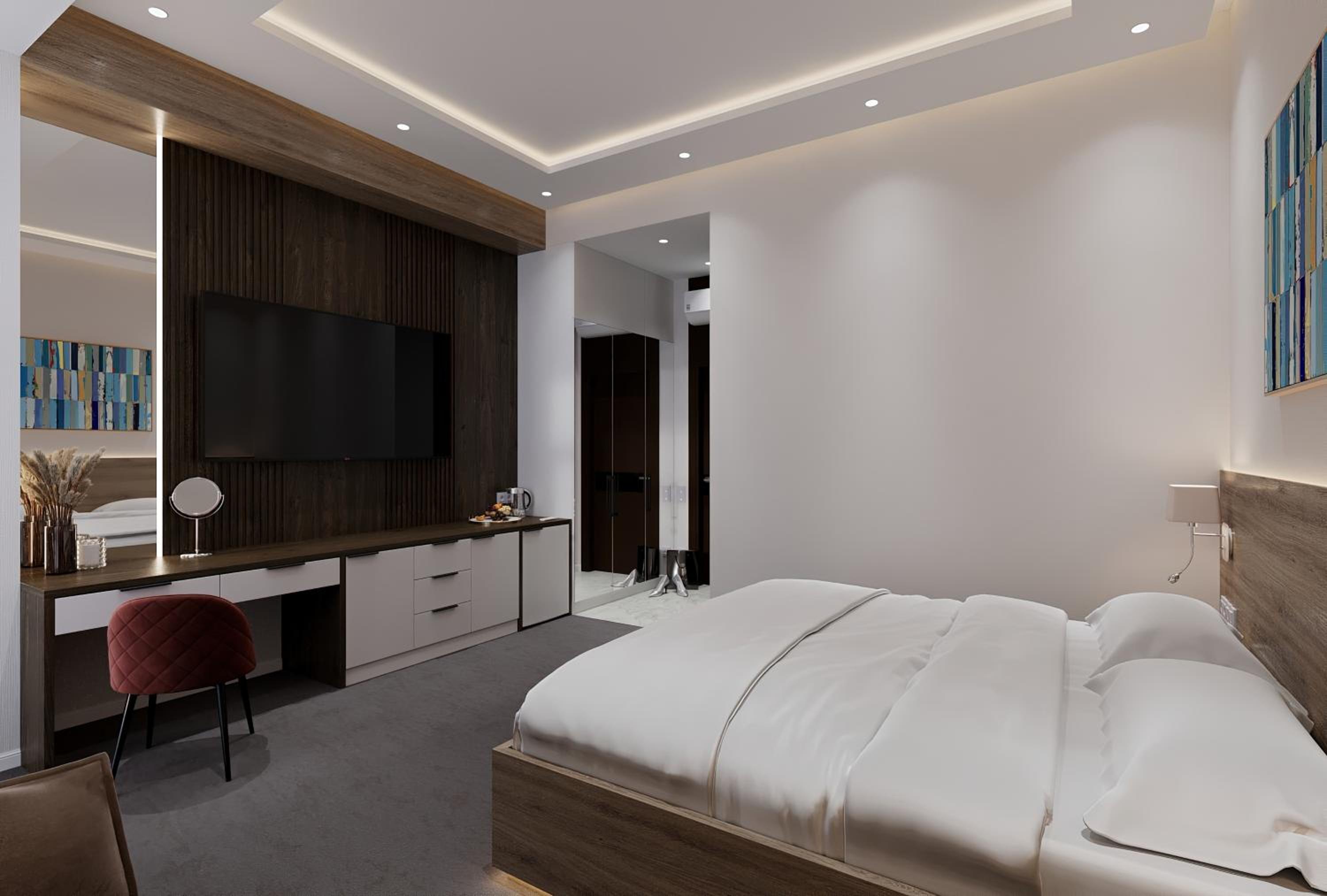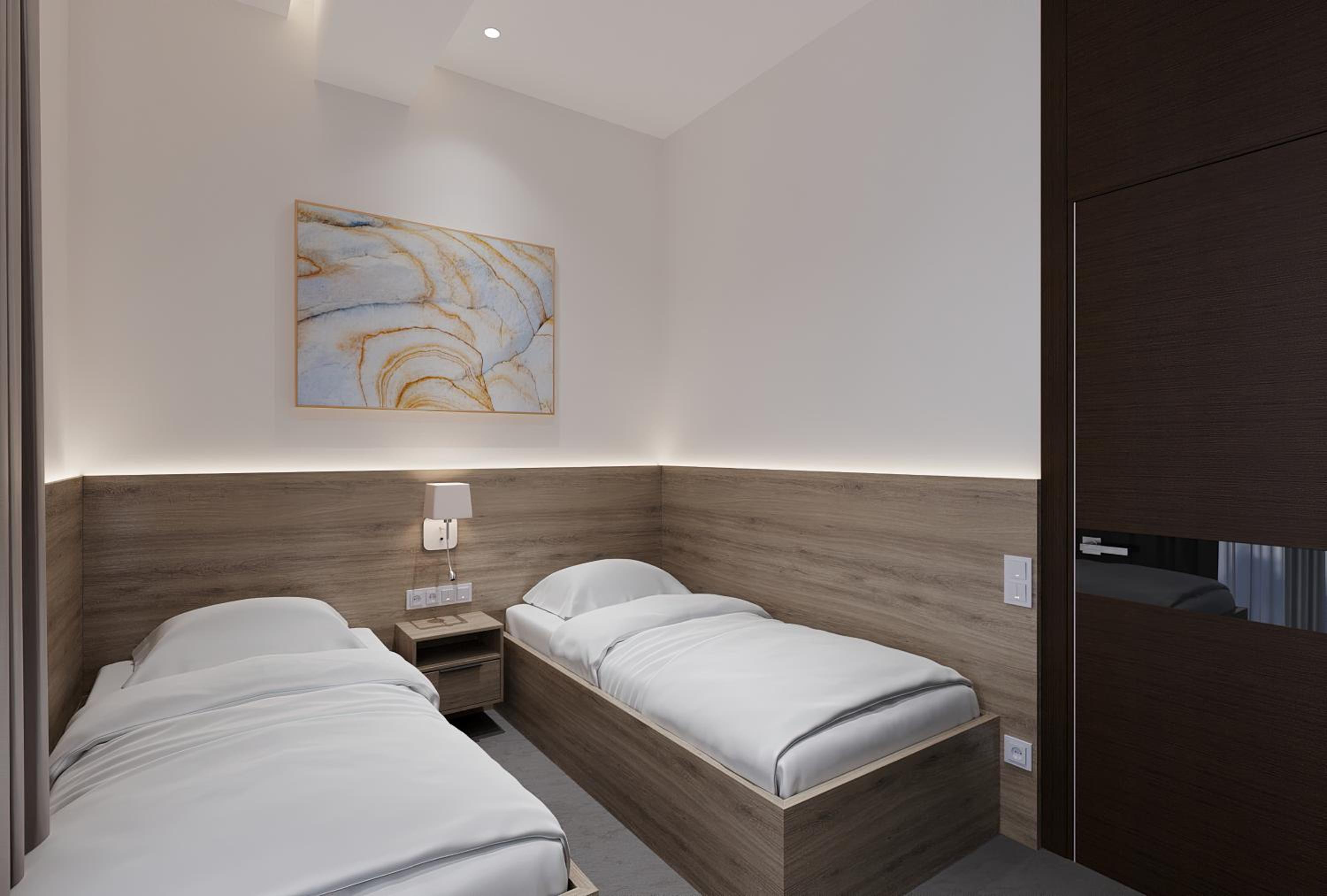 Комната была чистой и комфортной. Интерьер современный и уютный, персонал дружелюбный. Мне также понравилось освещение и общая атмосфера отеля.