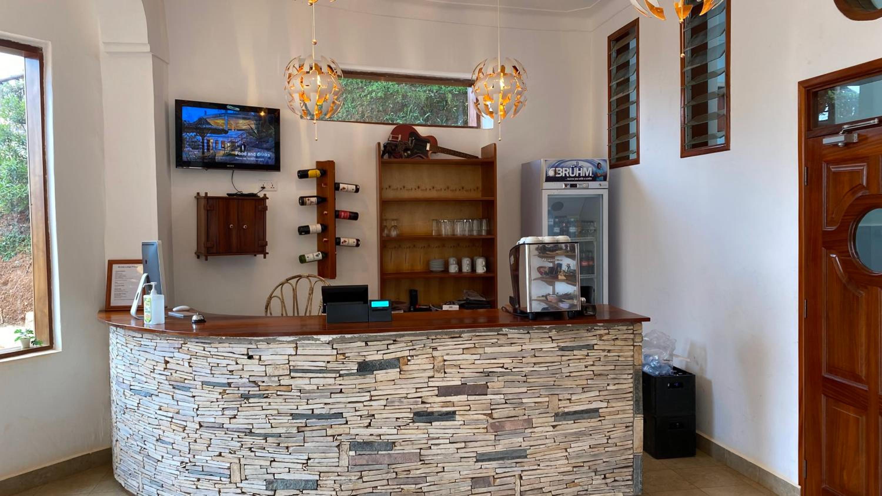 Nice location overlooking Masaka. Staff very helpful even looking after some stuff I left till we returned. Banda was ok although only plugs that worked were in the bathroom. Pool was nice and food pleasant and good value.