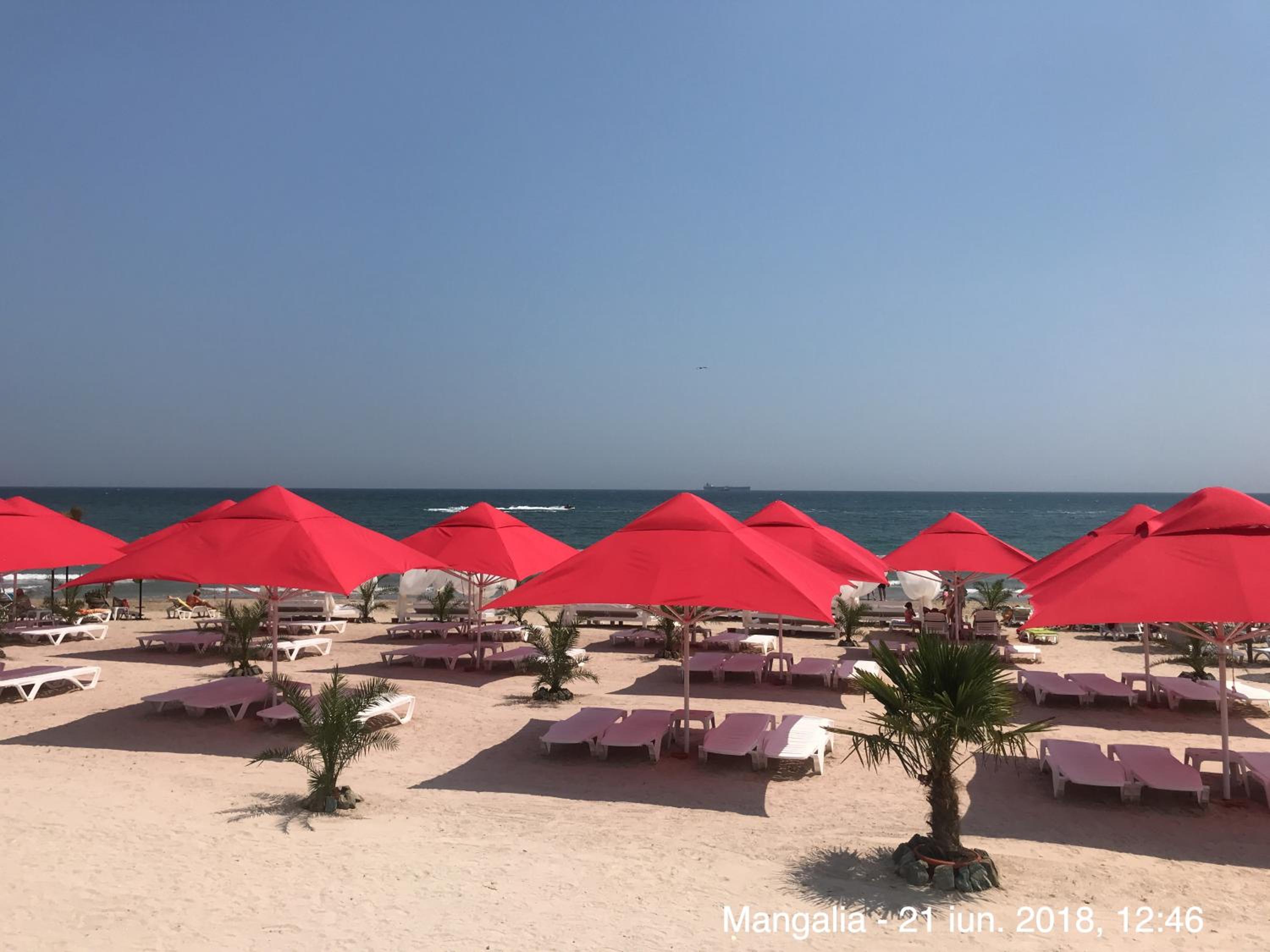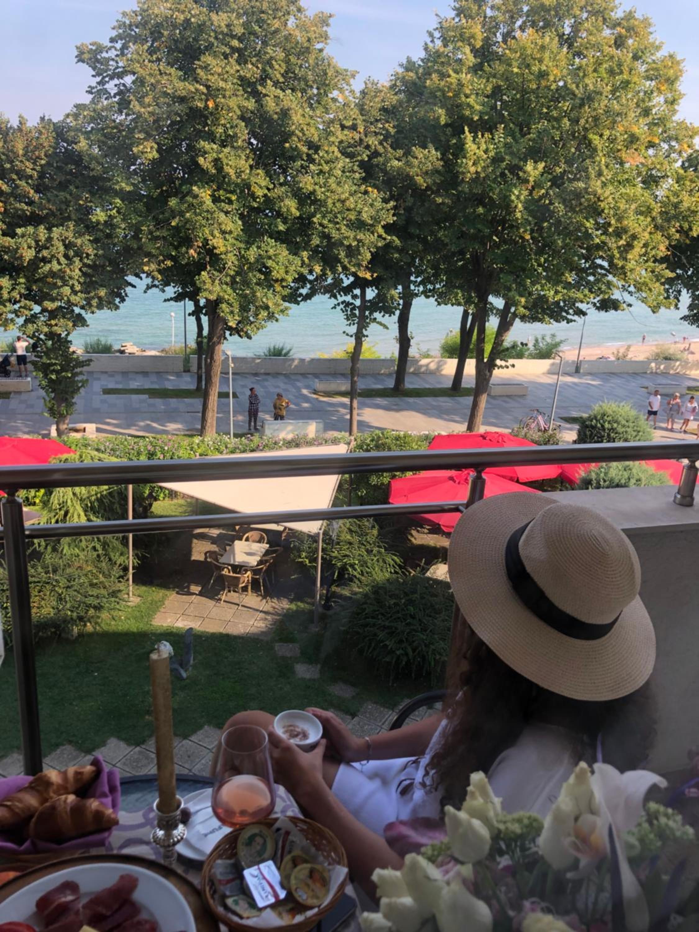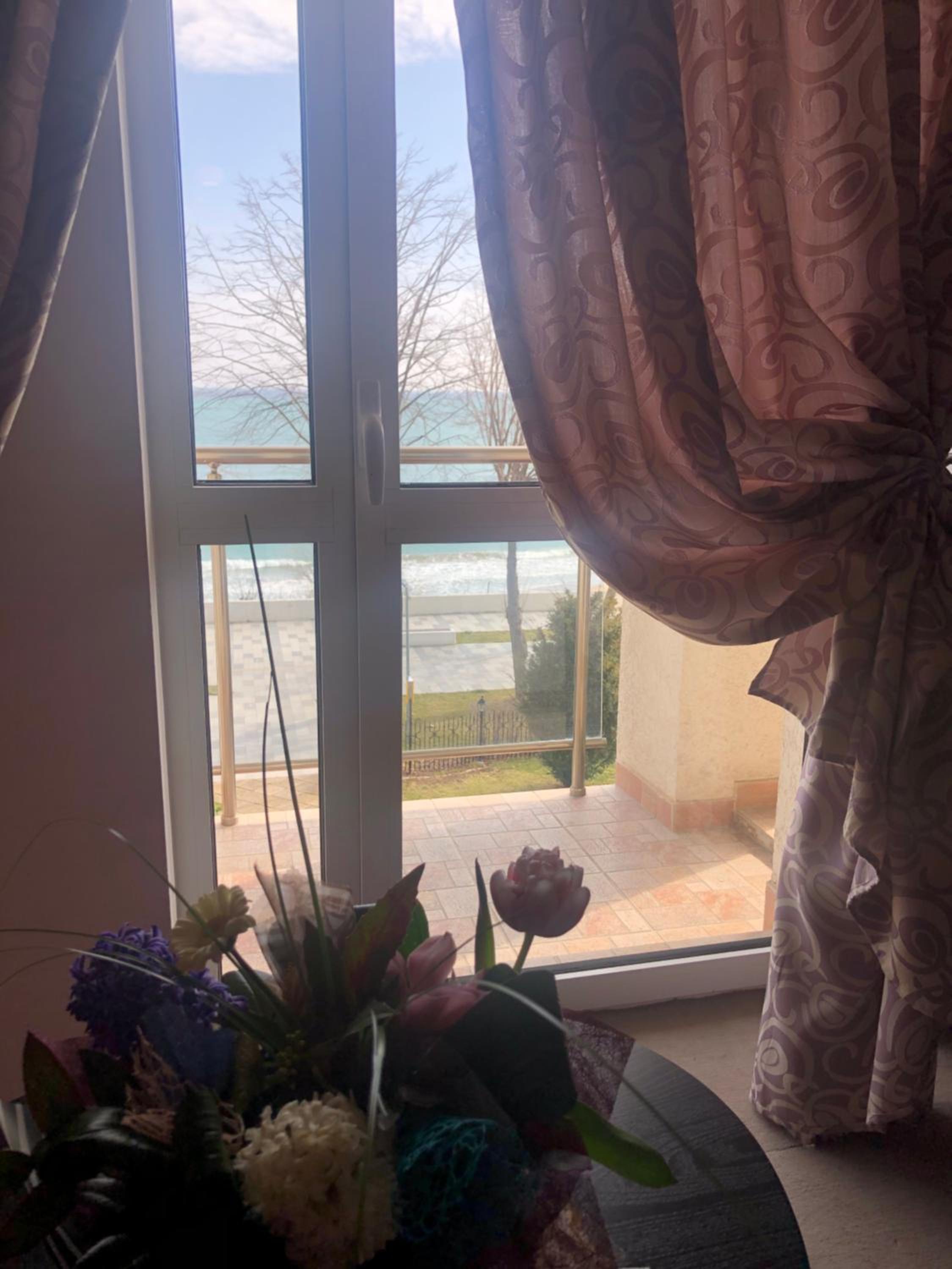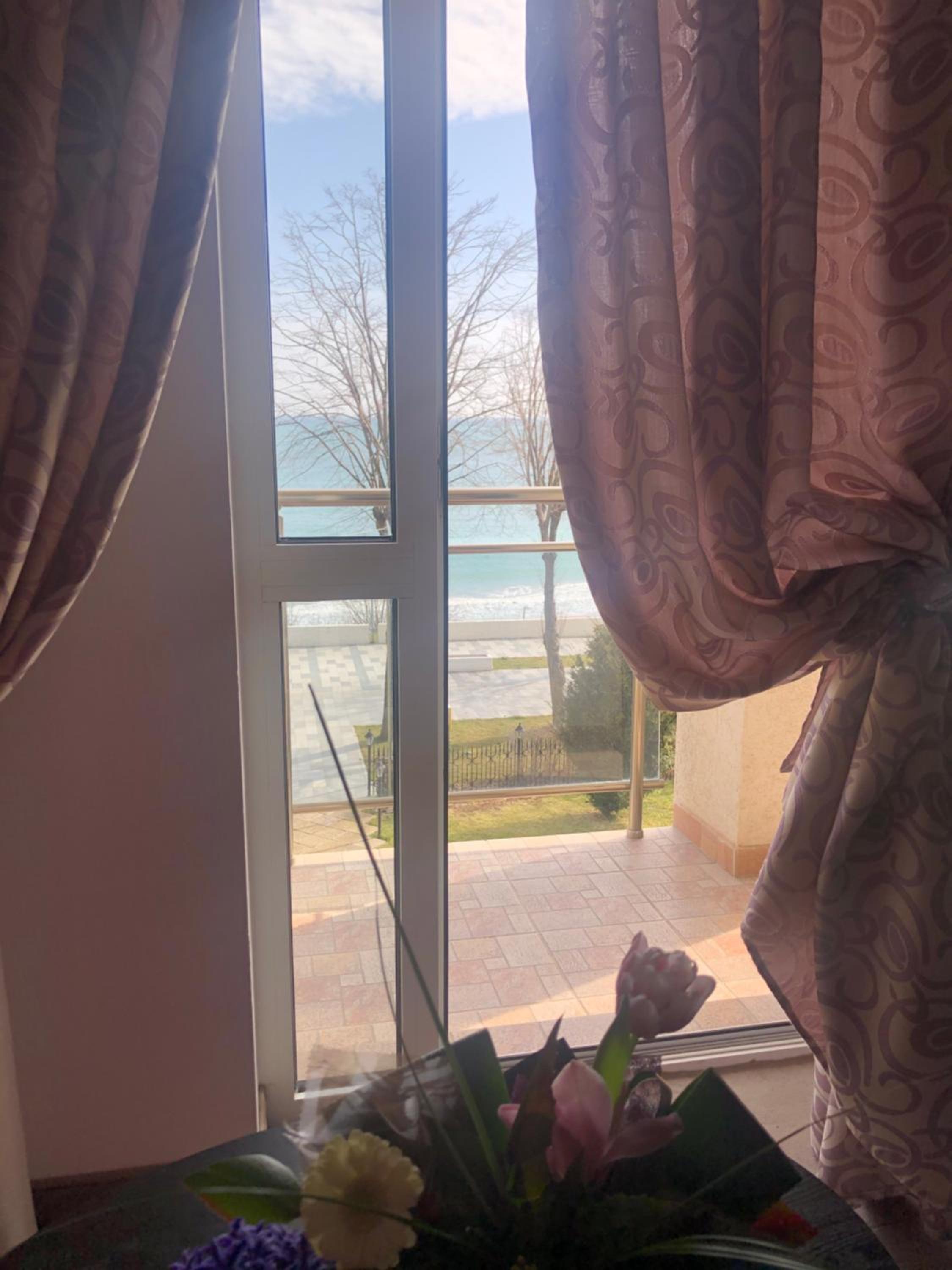 Poziția hotelului pe faleză, dimensiunea generoasă a camerei, suficientă pentru un cuplu, balconul cu vedere frontală la mare, obturată parțial de copacii din parcul din fața hotelului..