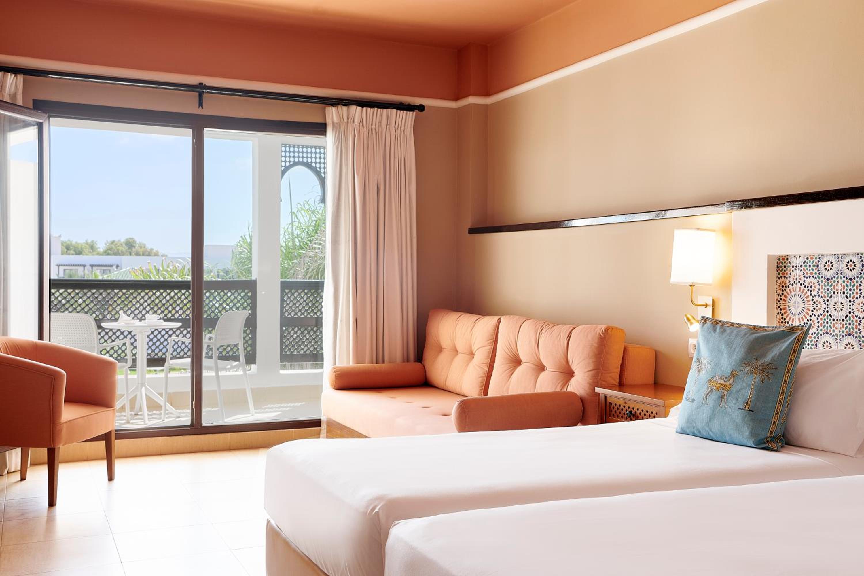 Each air-conditioned guest room boasts a private balcony overlooking either the lush garden or the Alboran Sea. Enjoy modern amenities such as a TV, telephone, and minibar in these spacious accommodations, complete with a cozy seating area and a luxurious private bathroom.