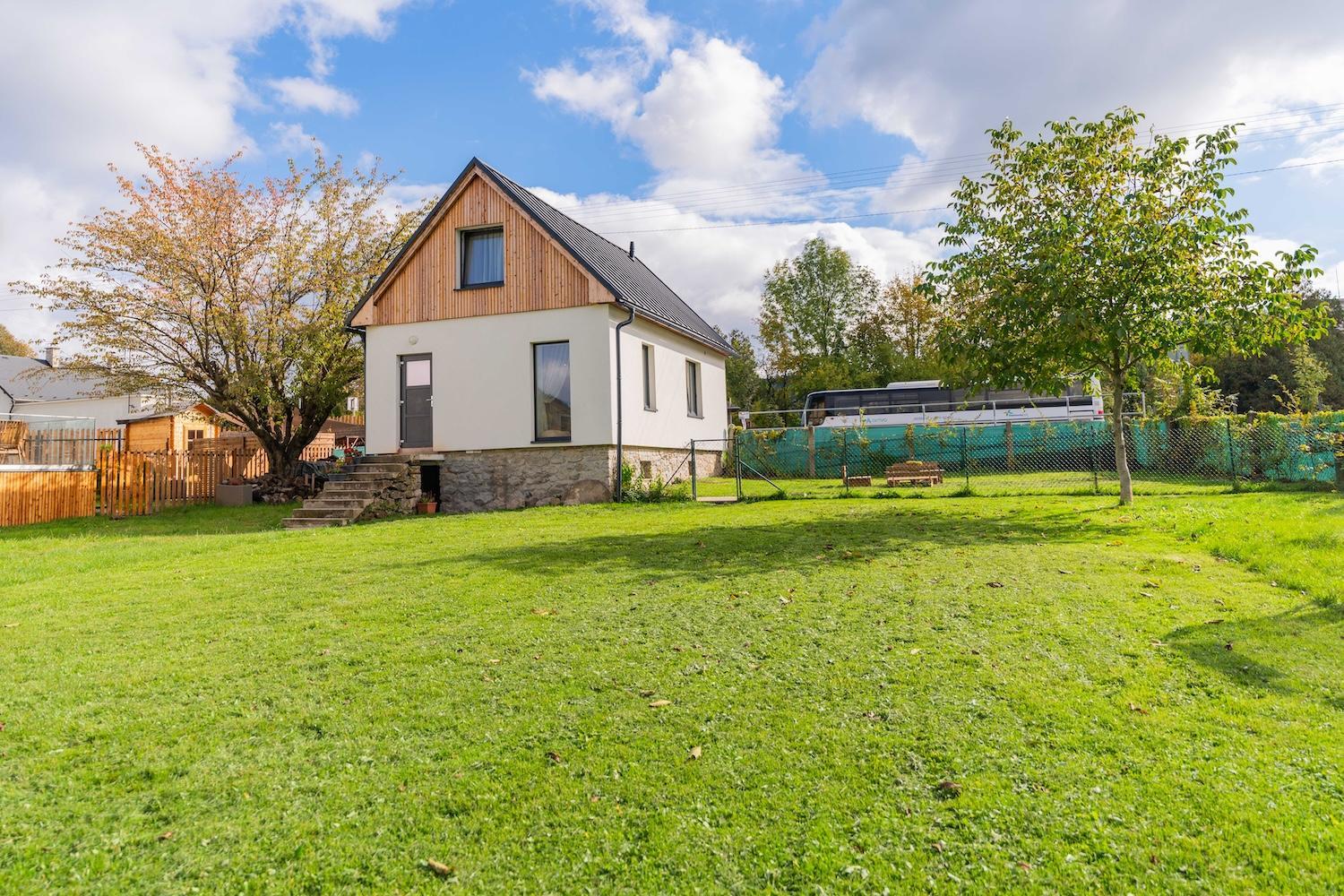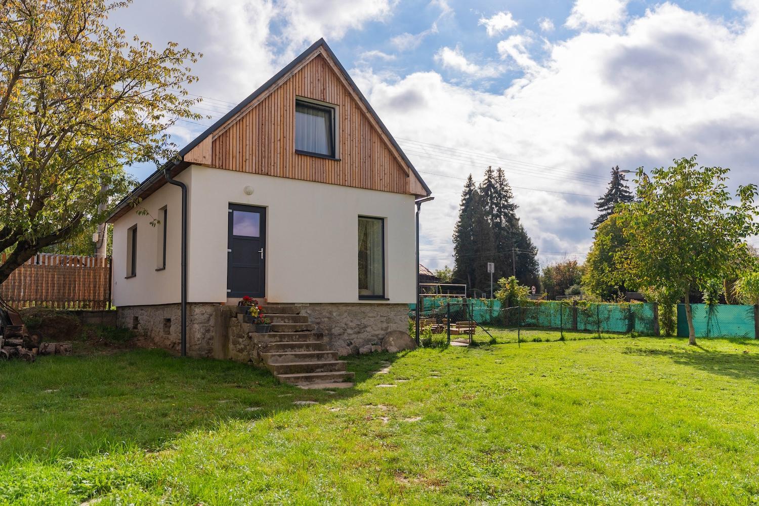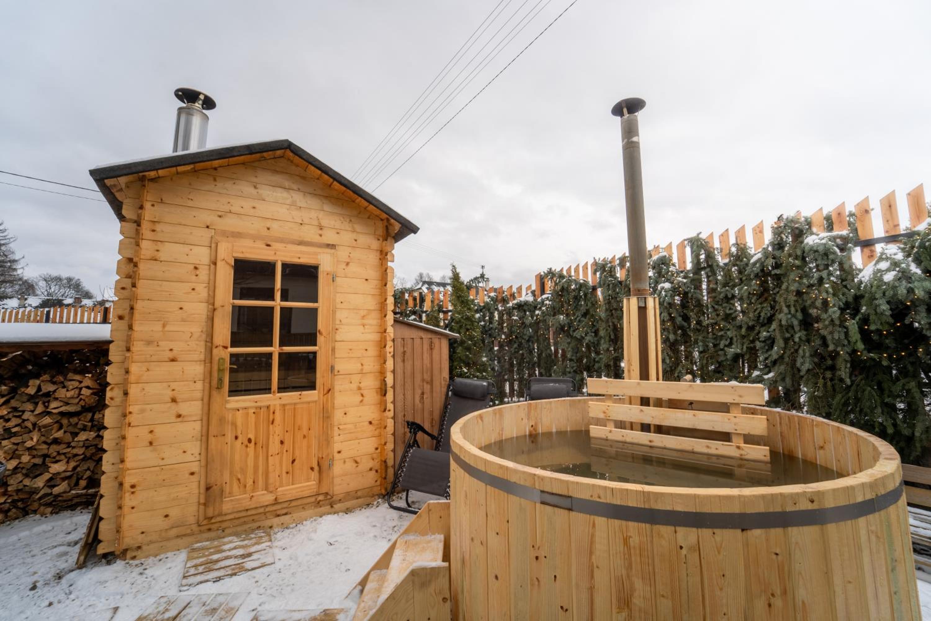 Schody ke vchodu i schodiště v domečku nepůsobí zrovna bezpečně, venkovní schodiště by potřebovalo zábradlí a opravu, vnitřní schodiště opravdu není vhodné pro starší. Trochu mne zklamalo, že v ceně ubytování není volný přistup do wellness.