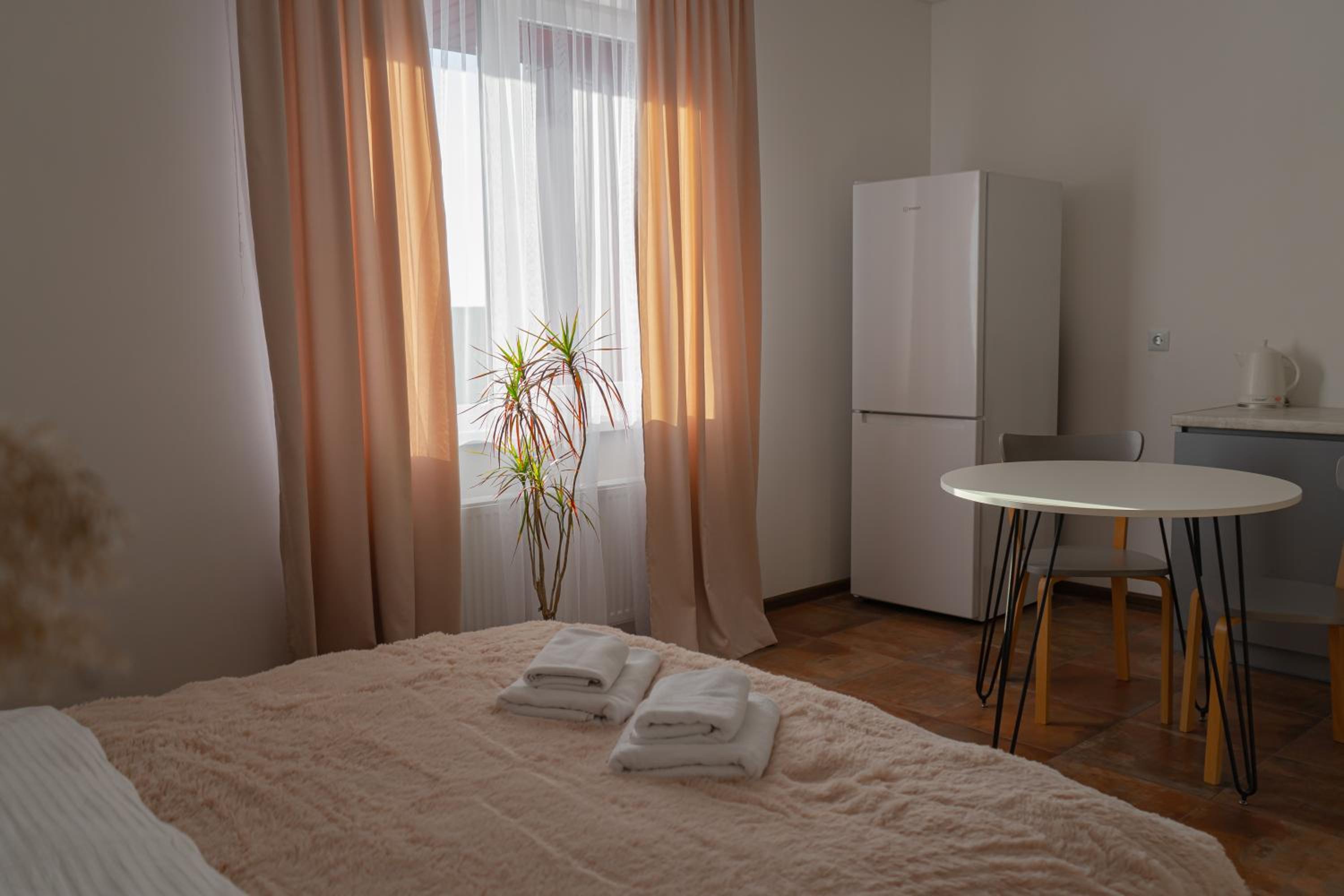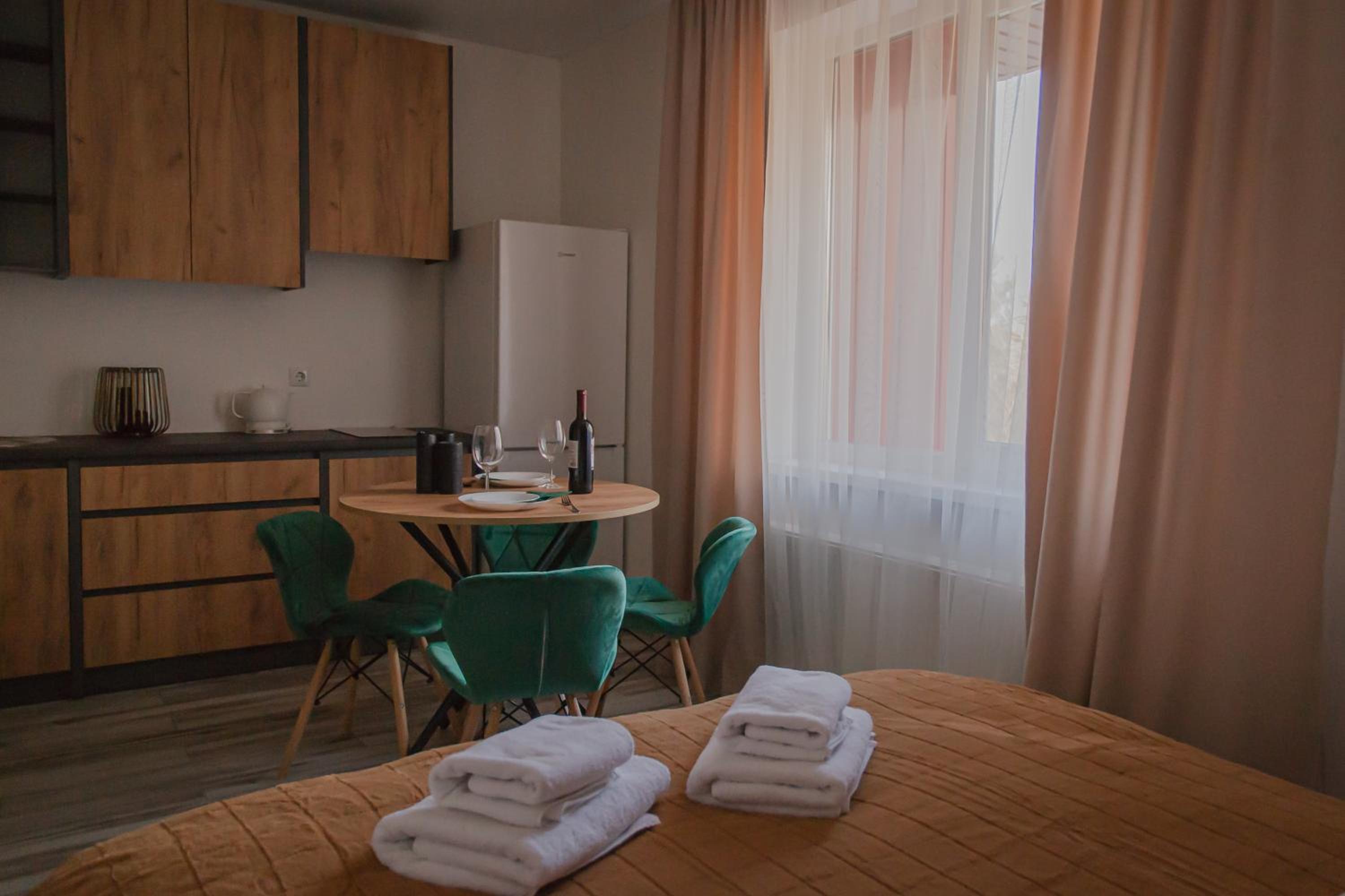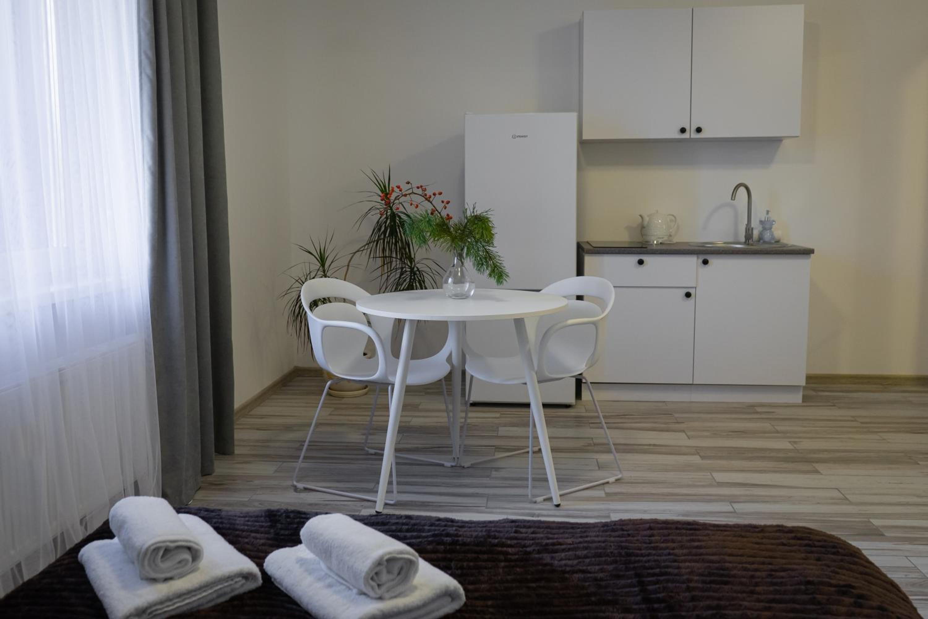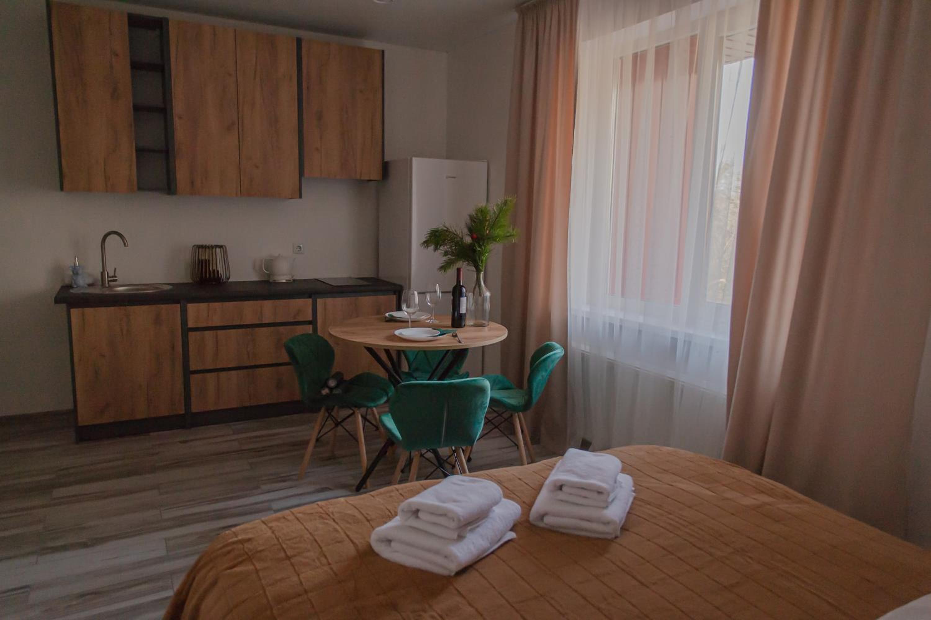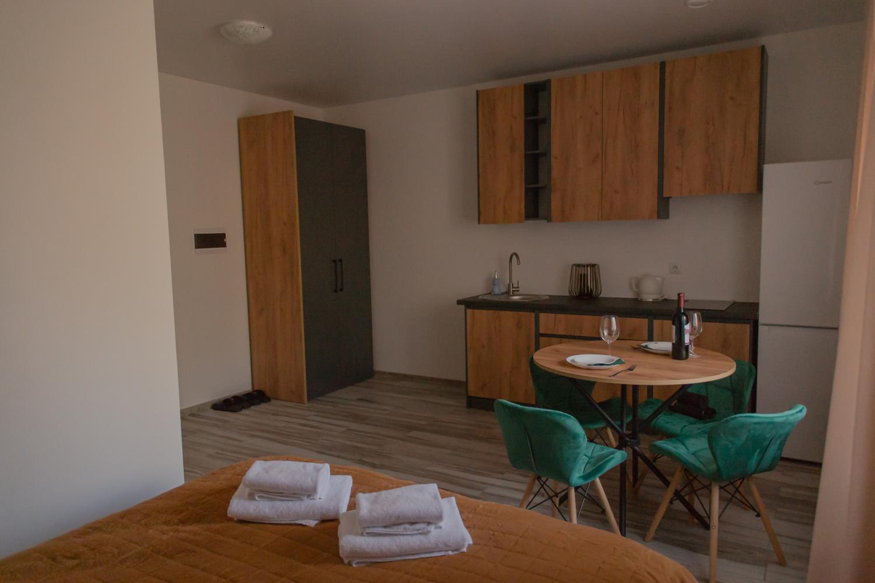 Їхали з запізненням відносно запланованого часу. Важливо було переночувати в номері, який розрахований на 4 осіб не за всі гроші світу, оскільки по дорозі більшість отелів пропонували 2 окремих номери. Саме ці апартаменти знаходилися по дорозі, що дуже зручно, запропонували необхідне нам розміщення, чистий номер, сучасний ремонт, в номері є все необхідне для самостійного приготування їжі (посуд, мікрохвильовка, індукційна піч, чайник). Привітні адміністартори. Є можливість купити готову їжу.