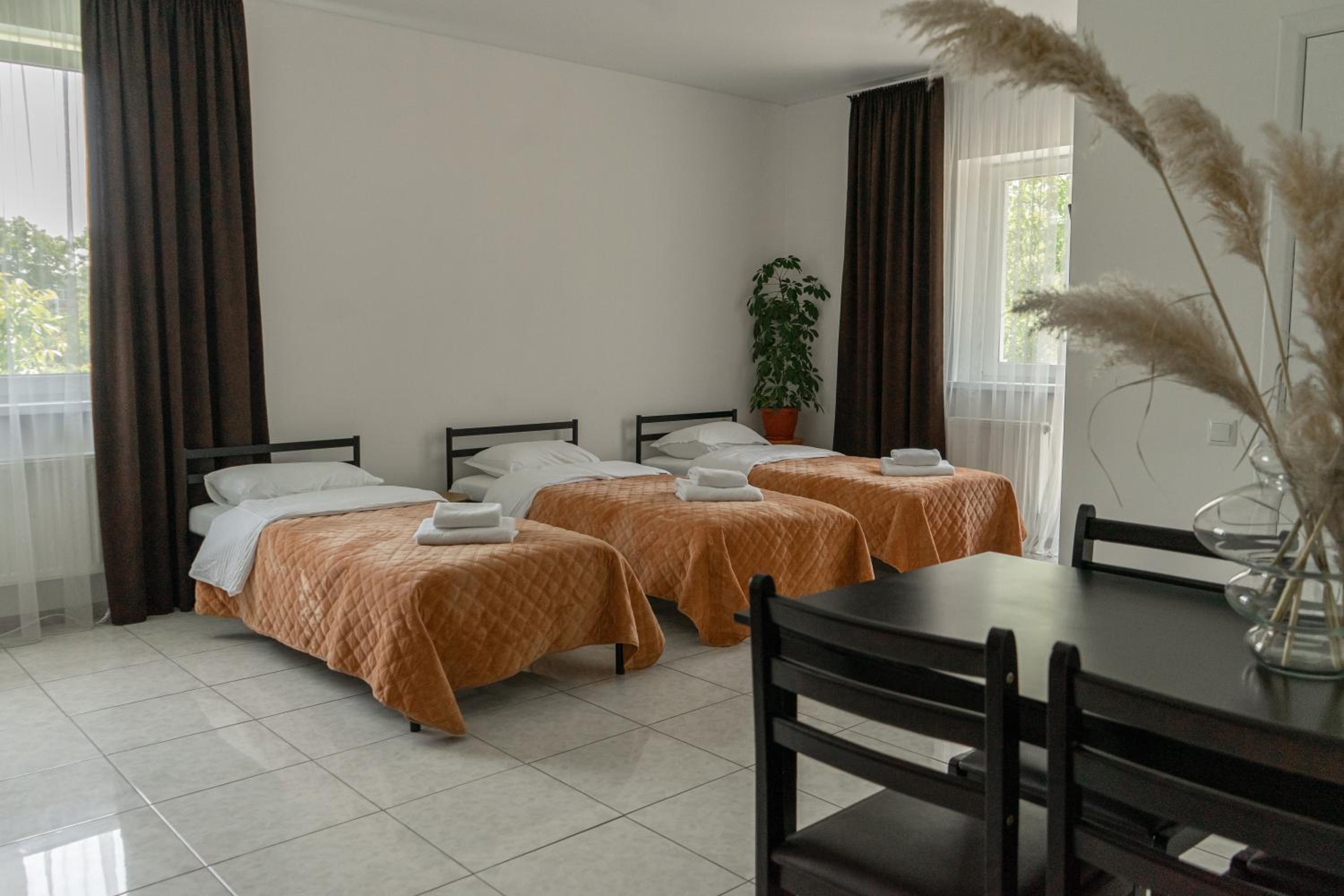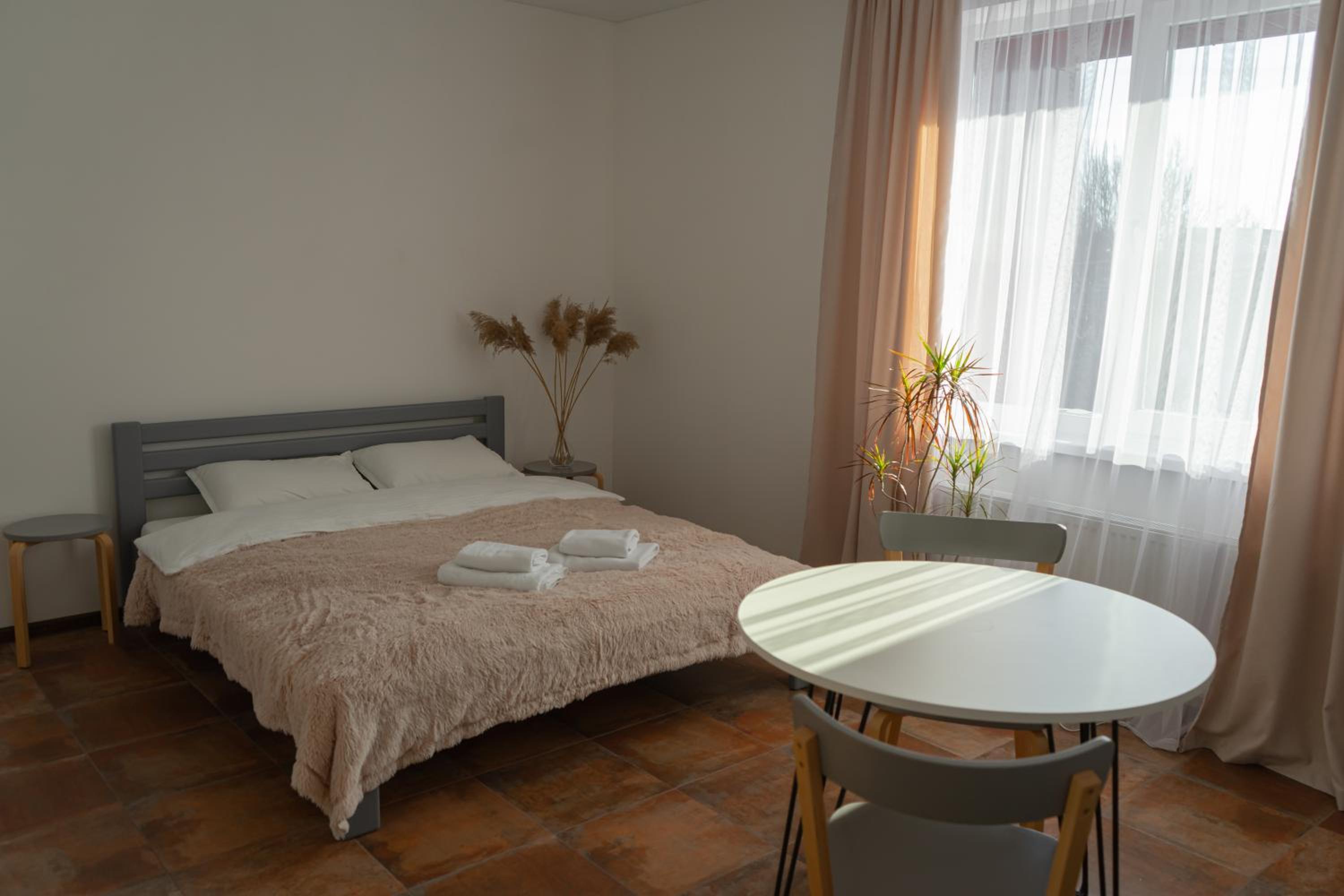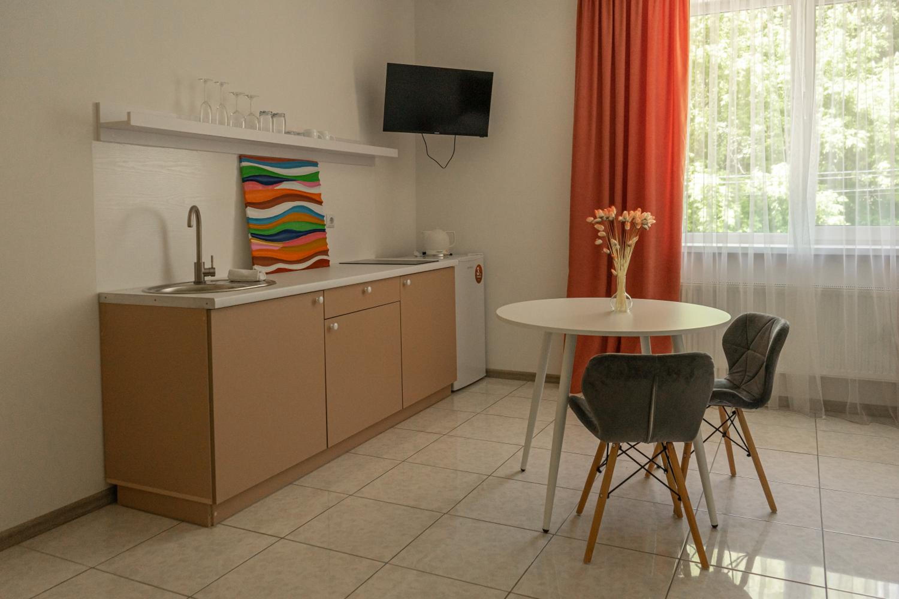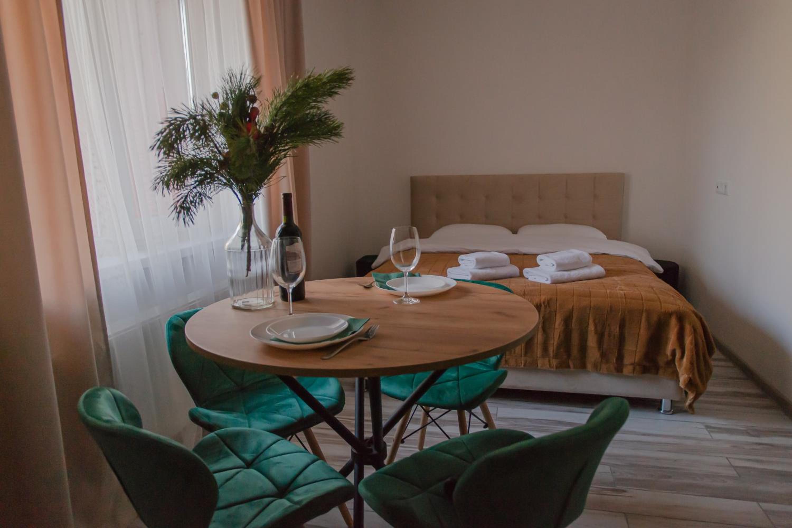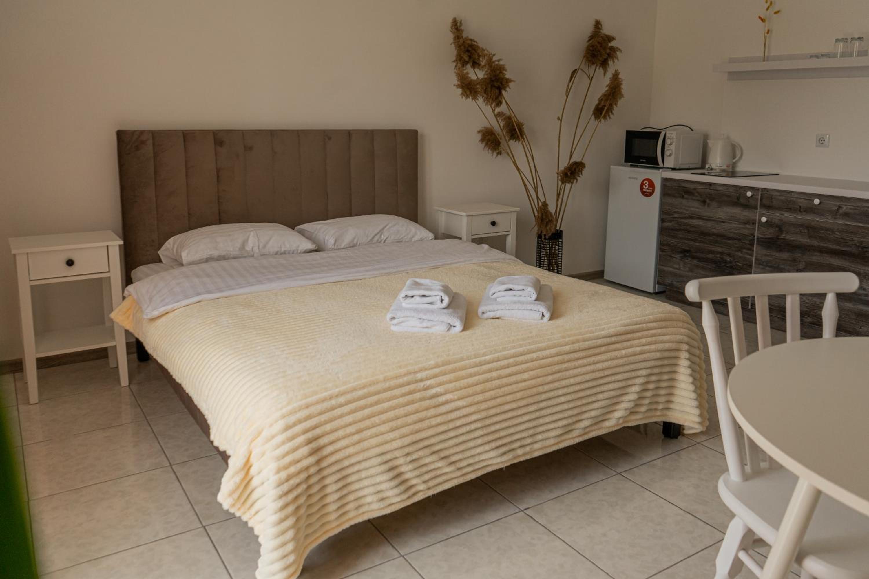Їхали з запізненням відносно запланованого часу. Важливо було переночувати в номері, який розрахований на 4 осіб не за всі гроші світу, оскільки по дорозі більшість отелів пропонували 2 окремих номери. Саме ці апартаменти знаходилися по дорозі, що дуже зручно, запропонували необхідне нам розміщення, чистий номер, сучасний ремонт, в номері є все необхідне для самостійного приготування їжі (посуд, мікрохвильовка, індукційна піч, чайник). Привітні адміністартори. Є можливість купити готову їжу.