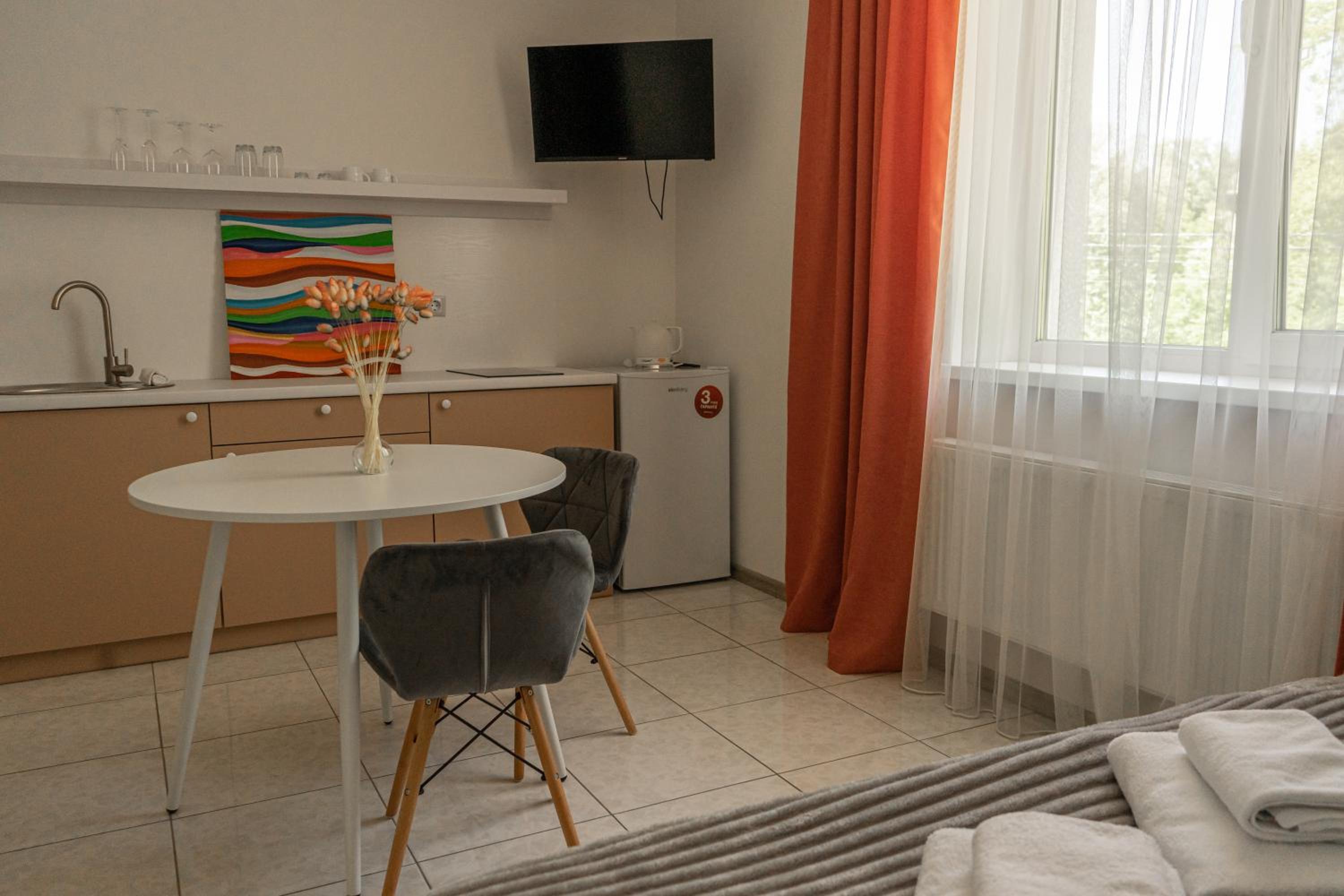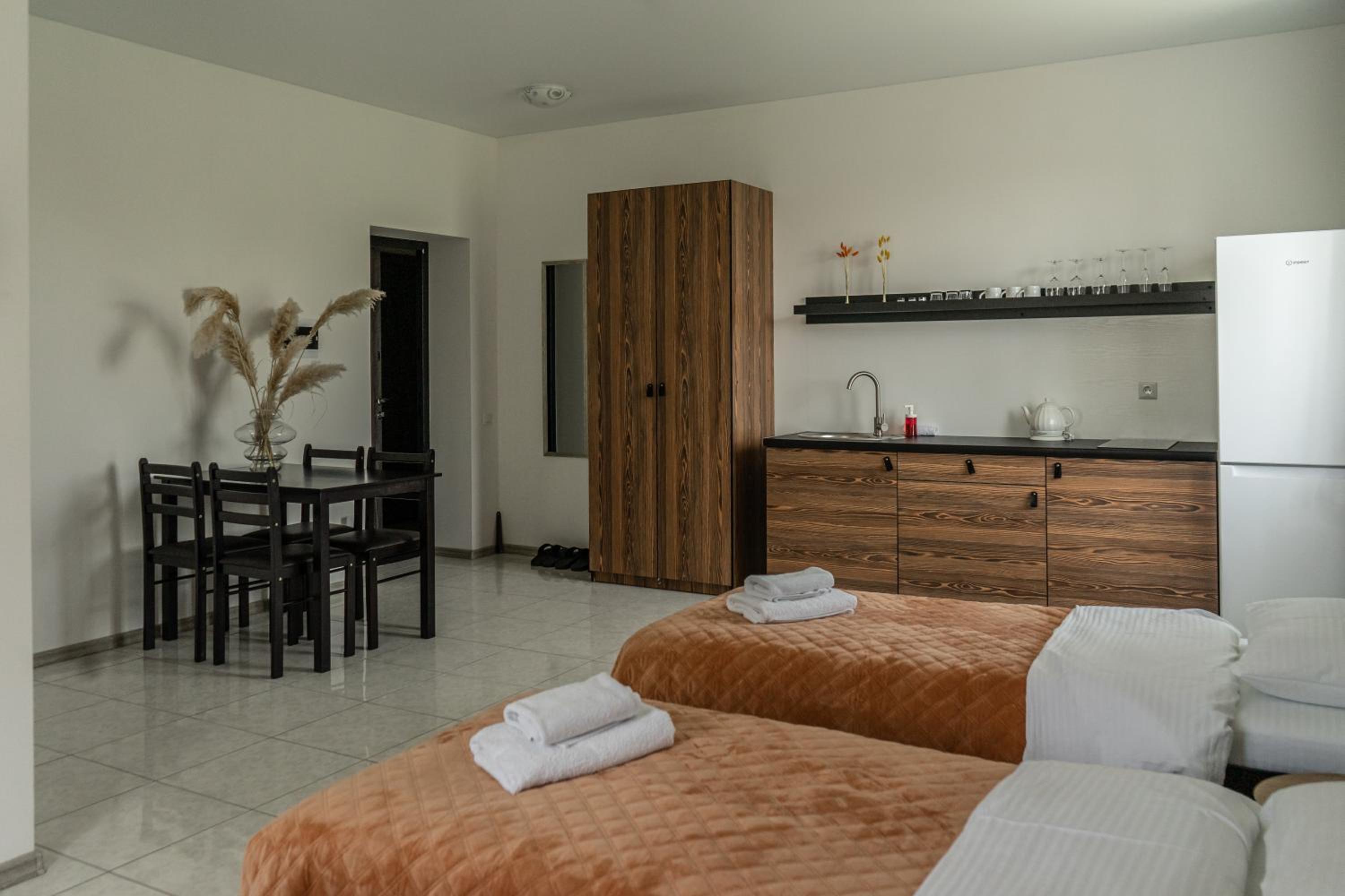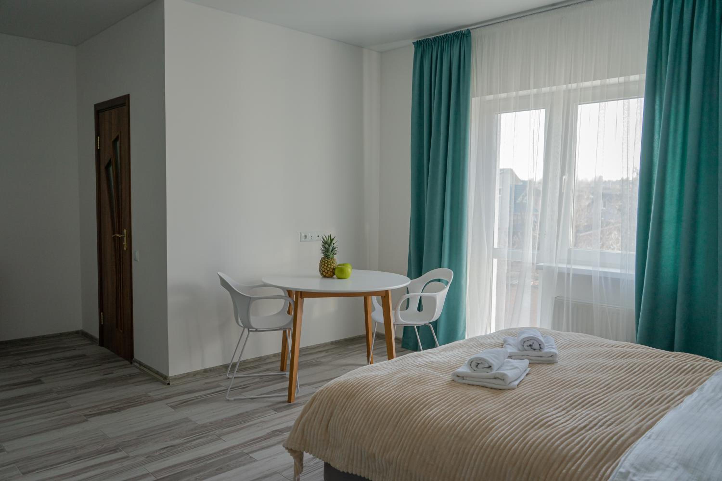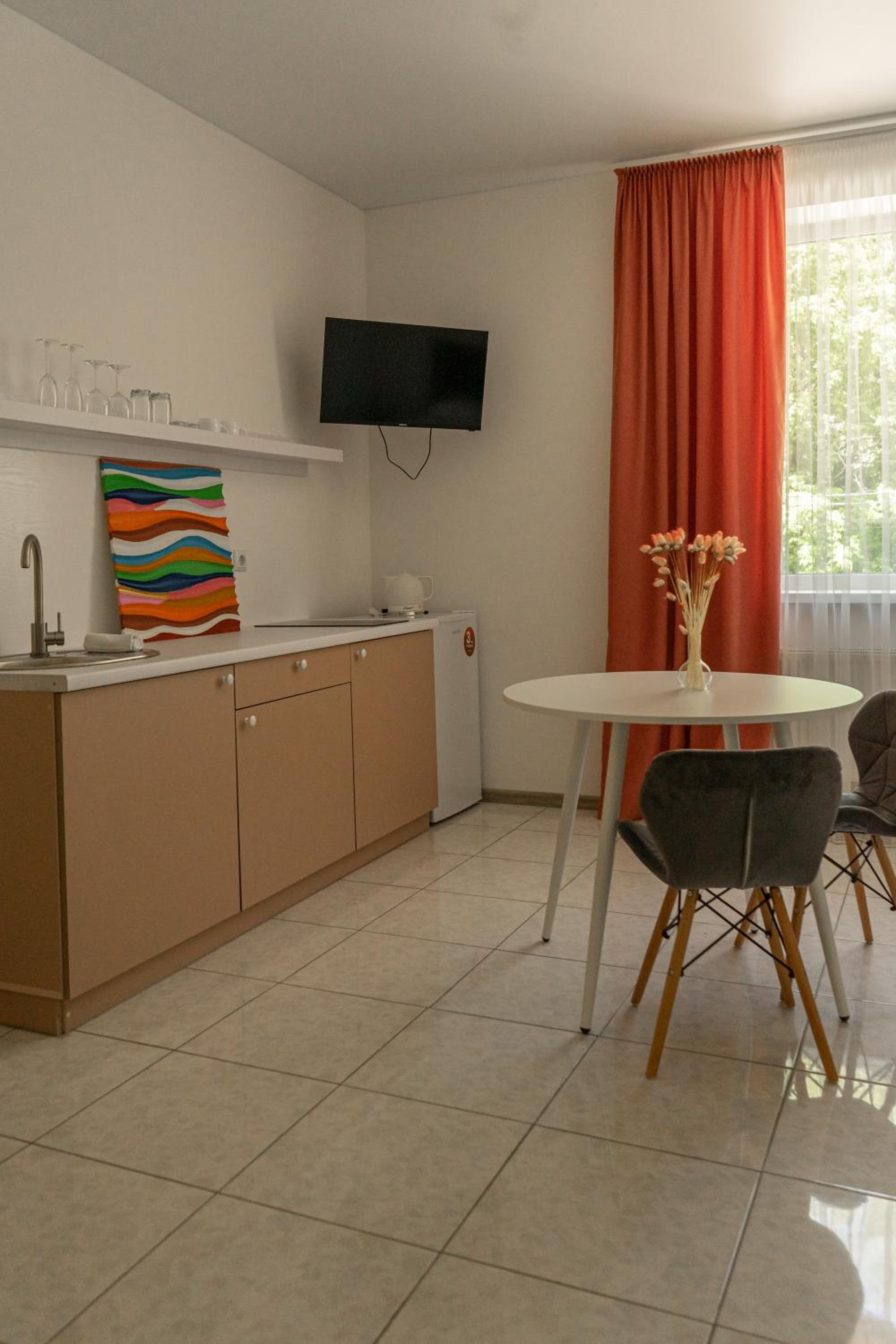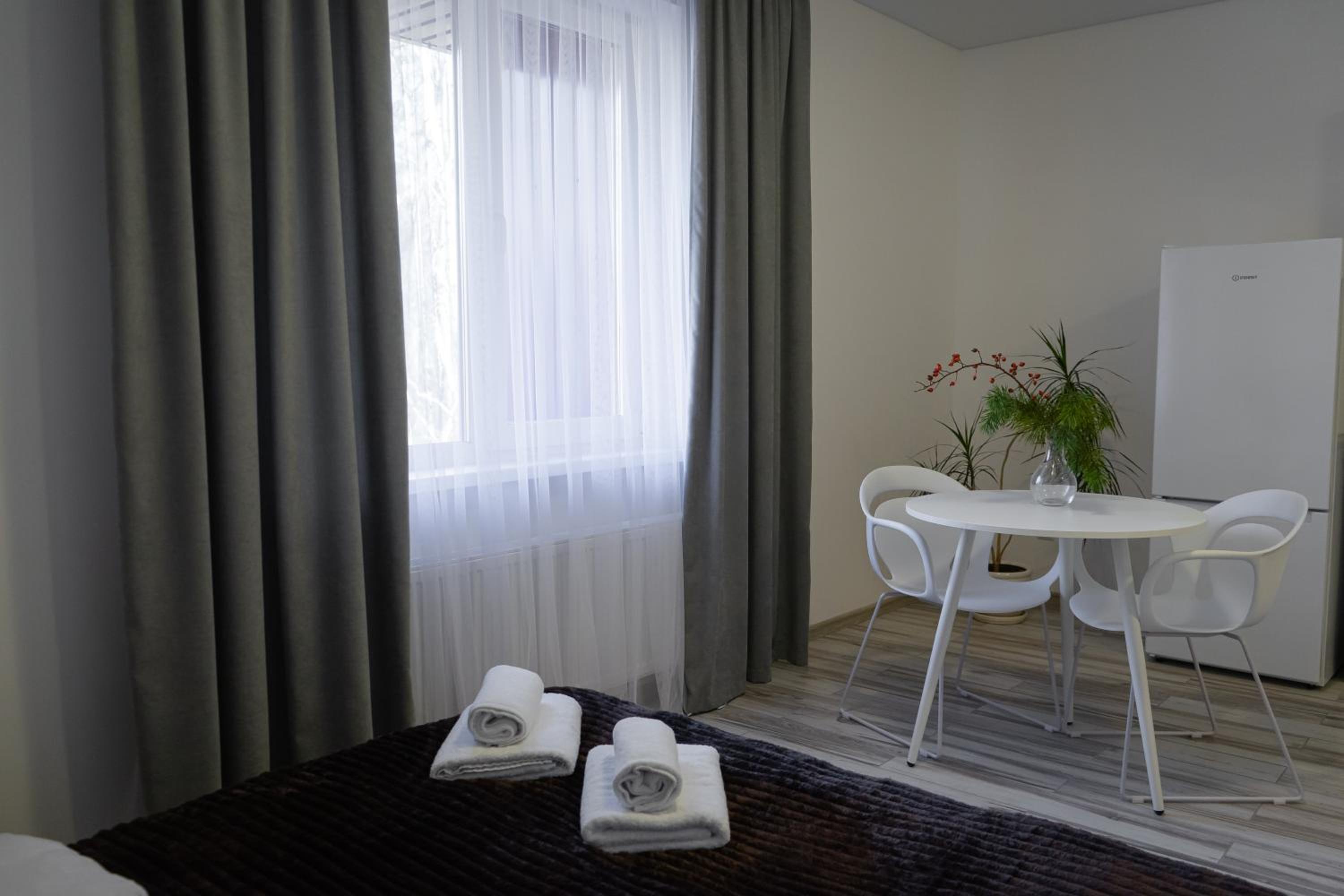 Їхали з запізненням відносно запланованого часу. Важливо було переночувати в номері, який розрахований на 4 осіб не за всі гроші світу, оскільки по дорозі більшість отелів пропонували 2 окремих номери. Саме ці апартаменти знаходилися по дорозі, що дуже зручно, запропонували необхідне нам розміщення, чистий номер, сучасний ремонт, в номері є все необхідне для самостійного приготування їжі (посуд, мікрохвильовка, індукційна піч, чайник). Привітні адміністартори. Є можливість купити готову їжу.