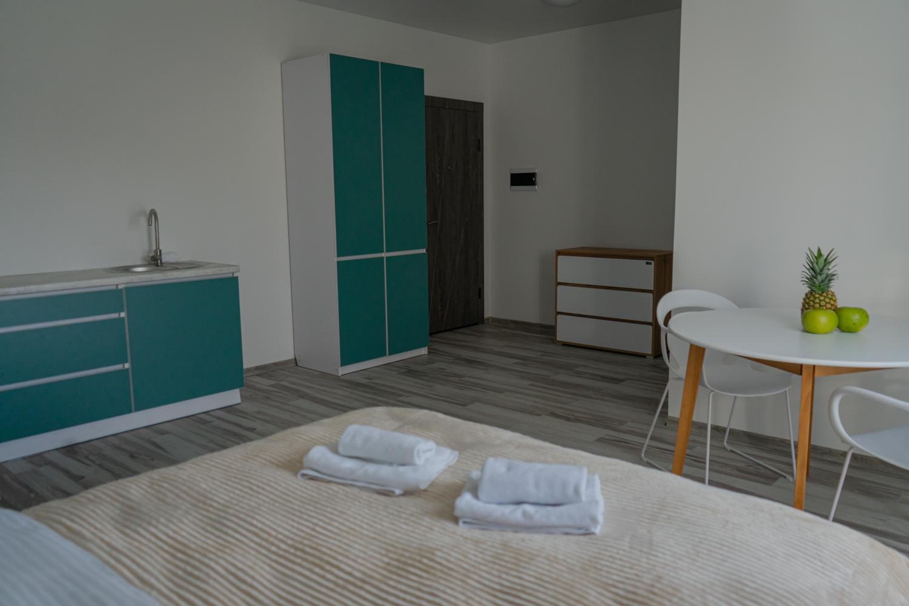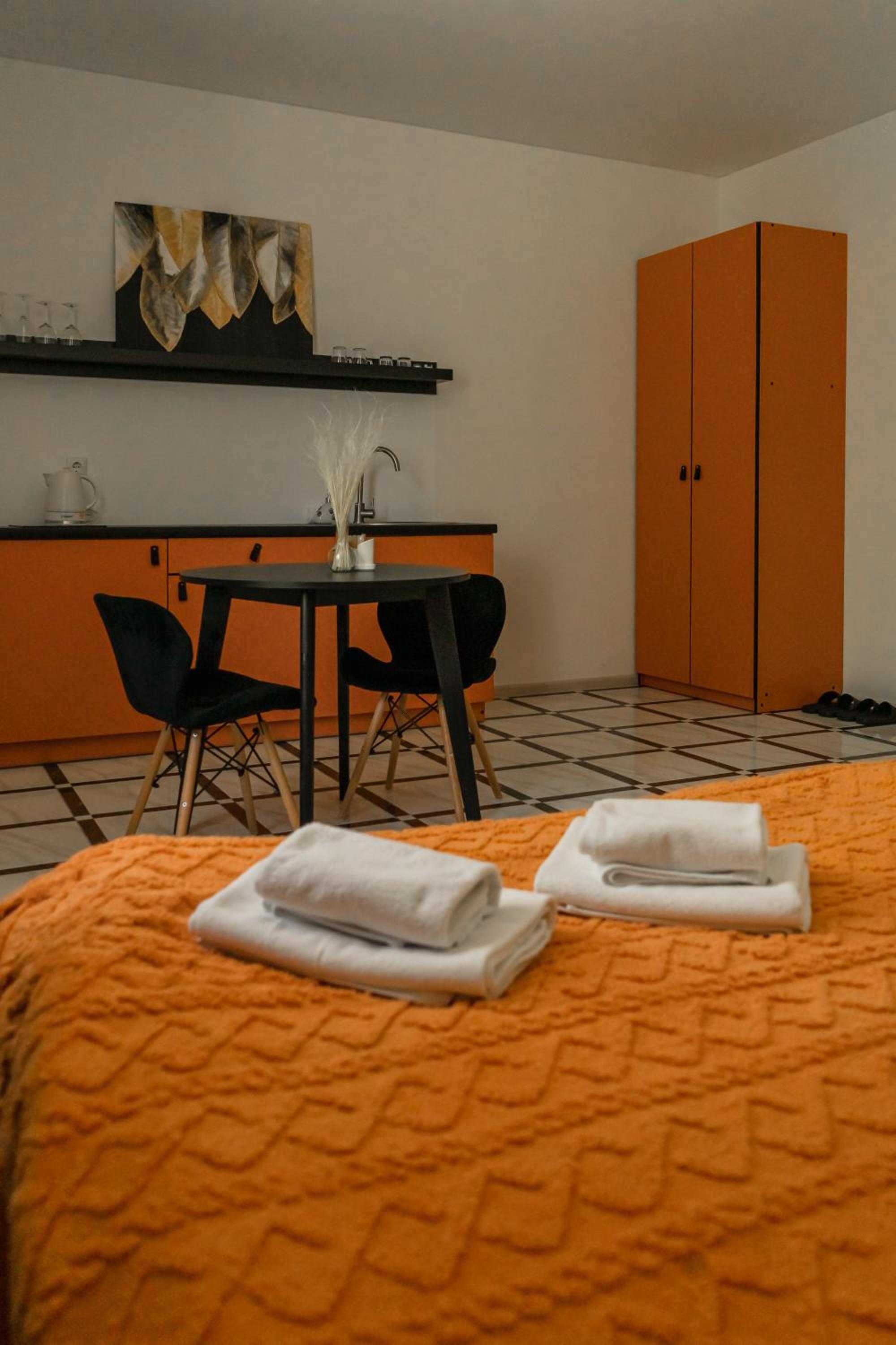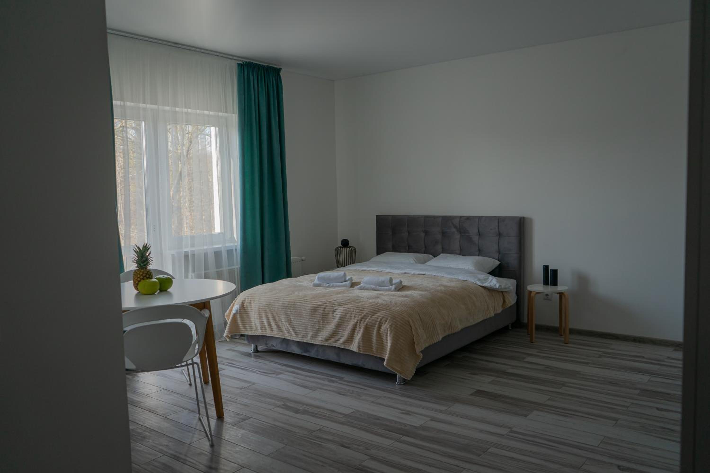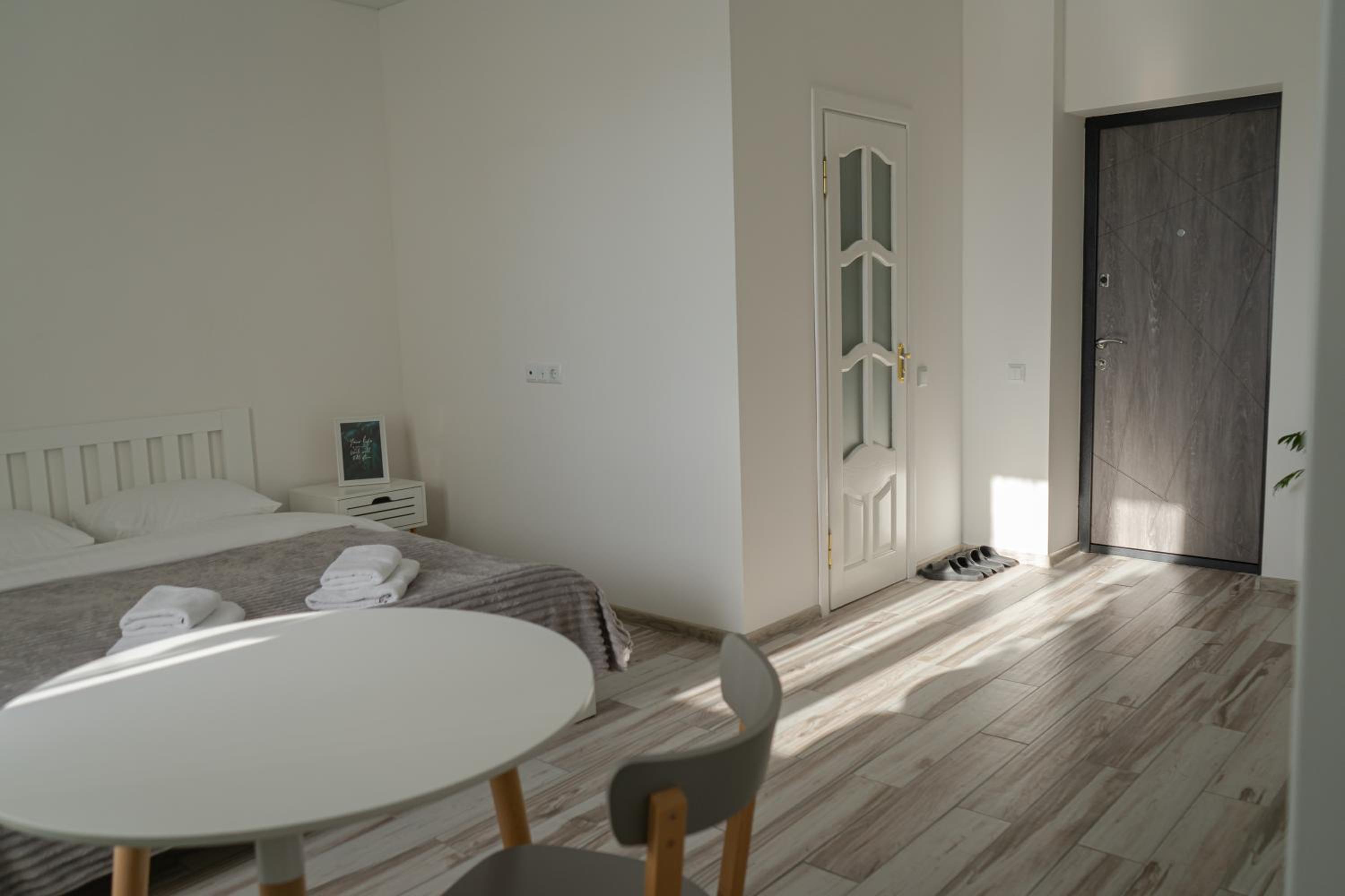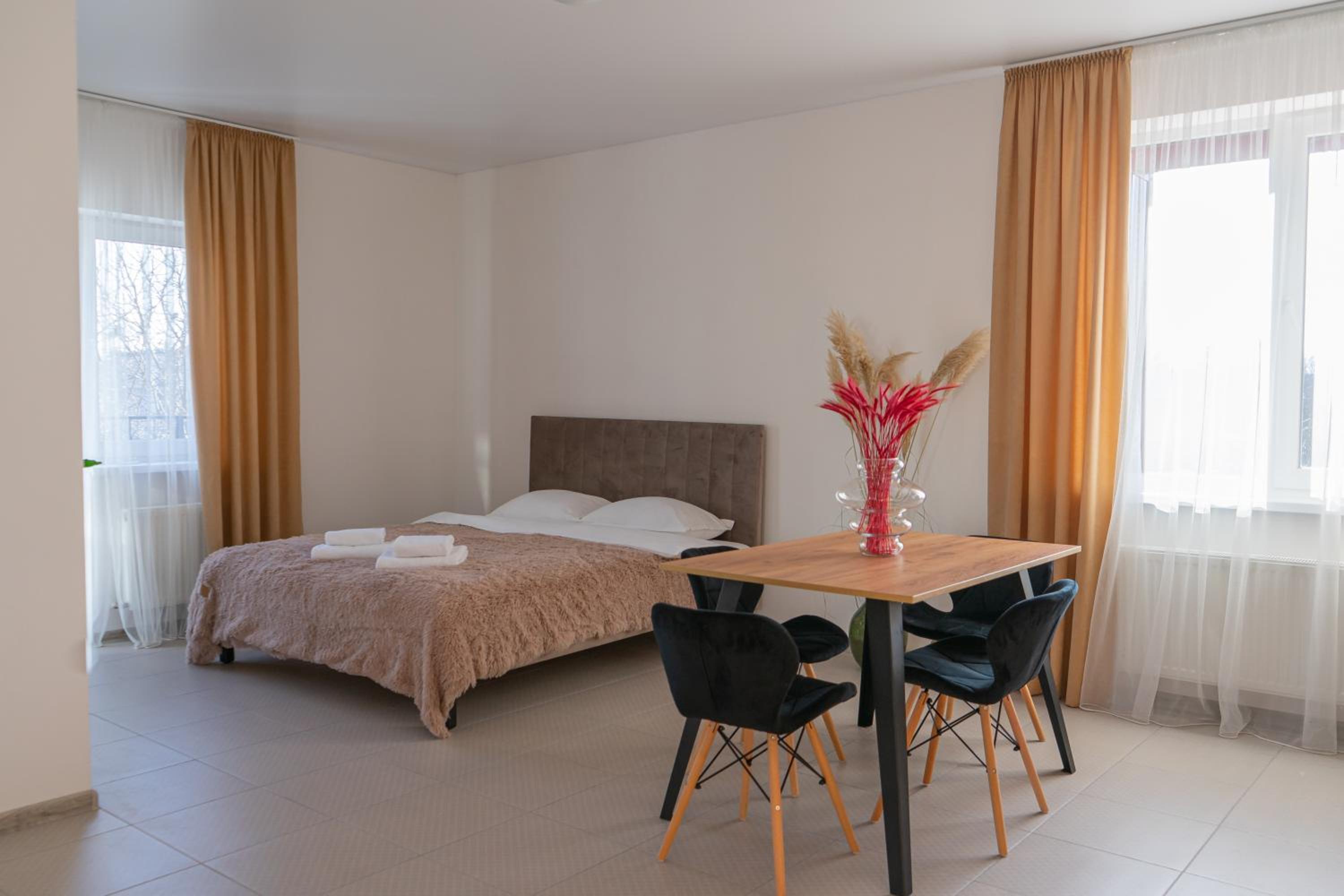 Їхали з запізненням відносно запланованого часу. Важливо було переночувати в номері, який розрахований на 4 осіб не за всі гроші світу, оскільки по дорозі більшість отелів пропонували 2 окремих номери. Саме ці апартаменти знаходилися по дорозі, що дуже зручно, запропонували необхідне нам розміщення, чистий номер, сучасний ремонт, в номері є все необхідне для самостійного приготування їжі (посуд, мікрохвильовка, індукційна піч, чайник). Привітні адміністартори. Є можливість купити готову їжу.