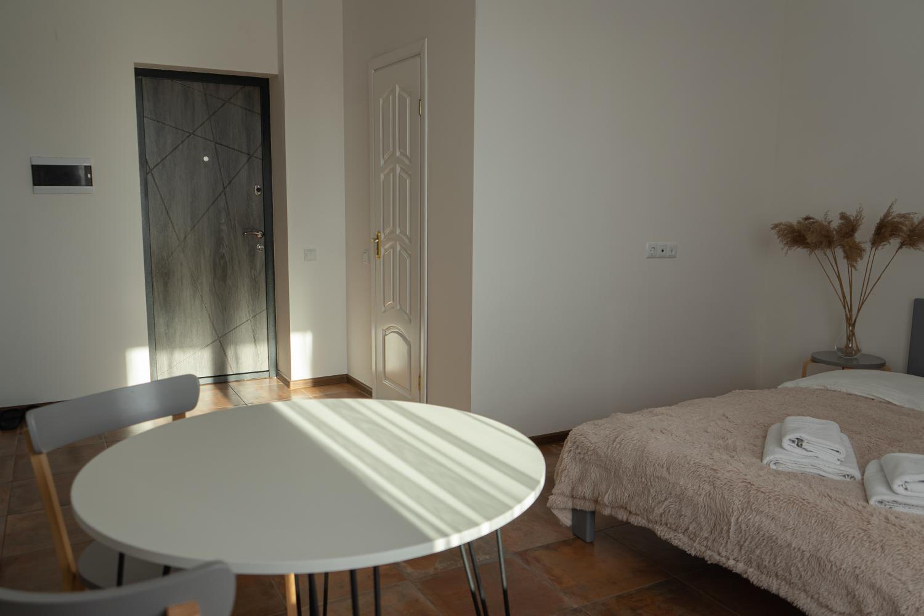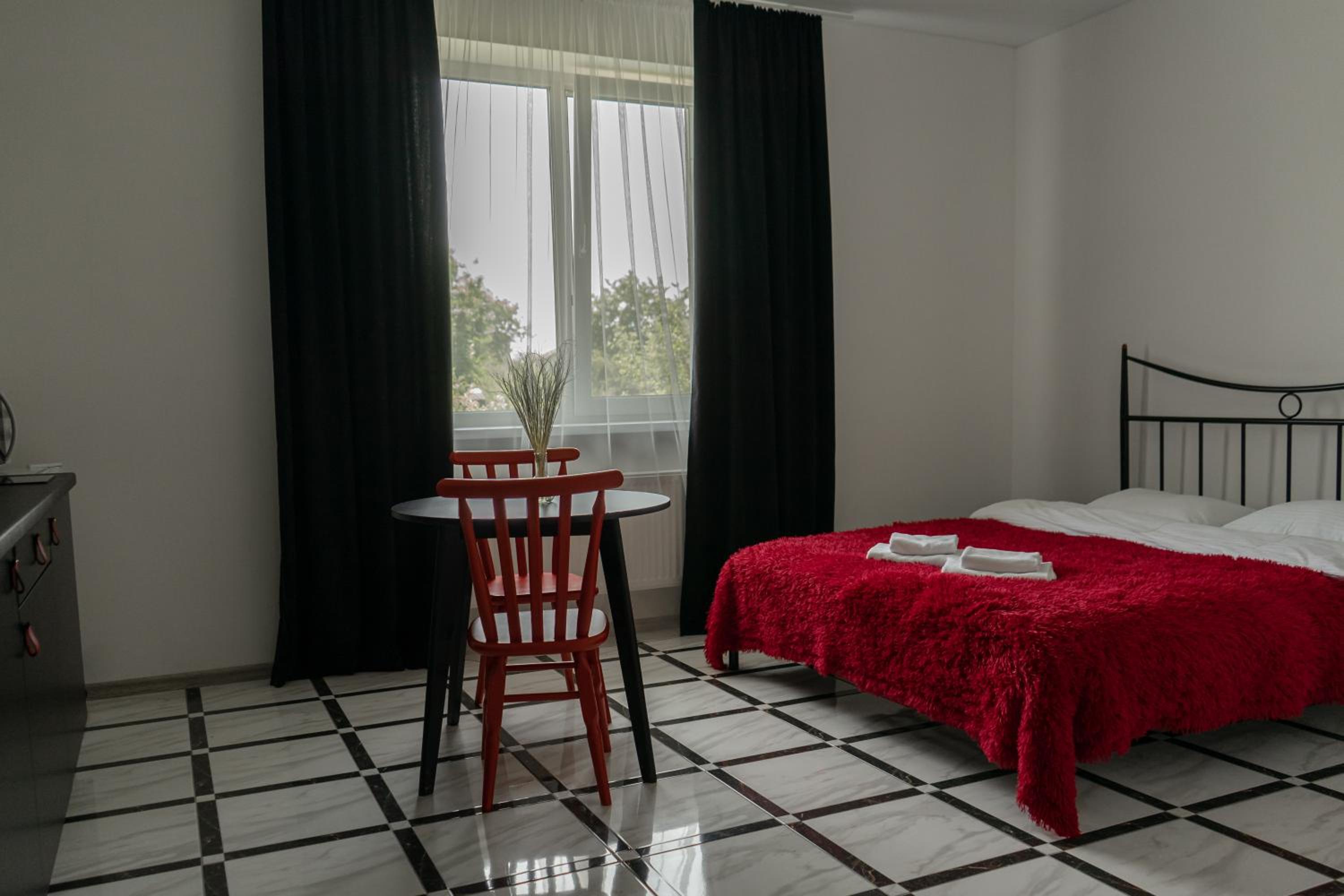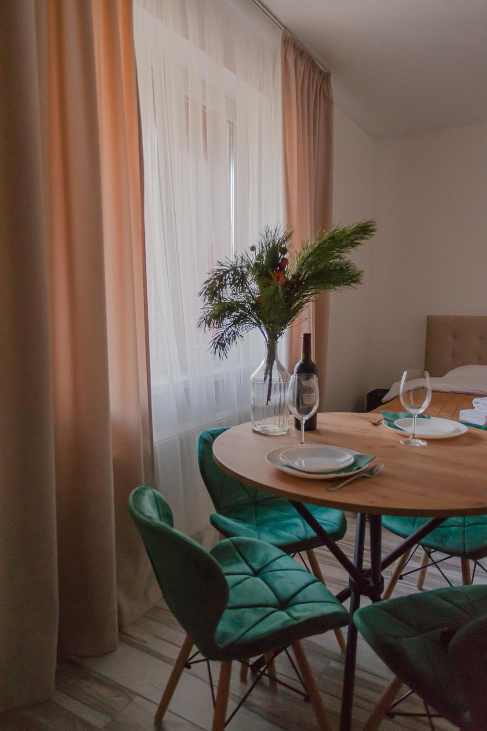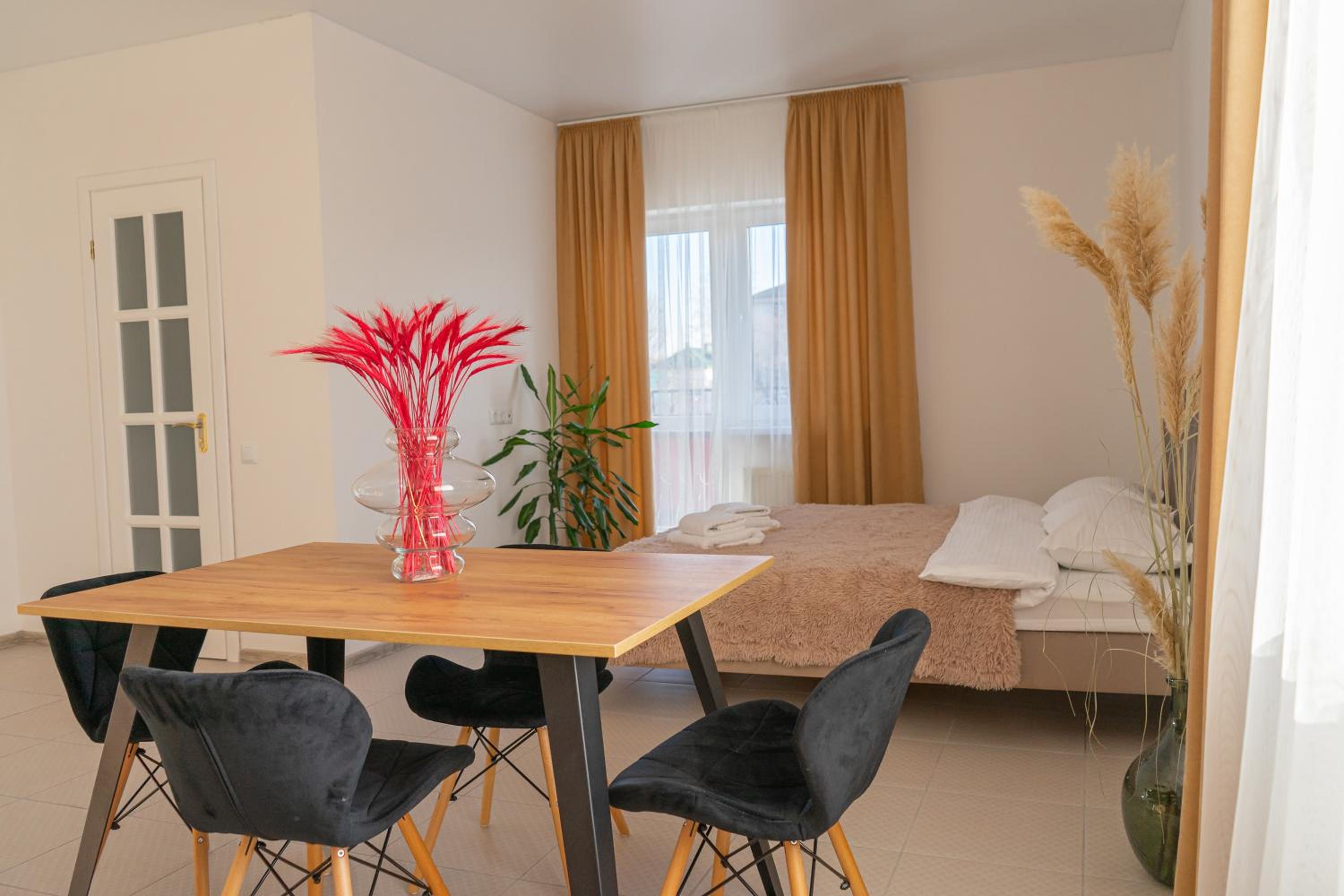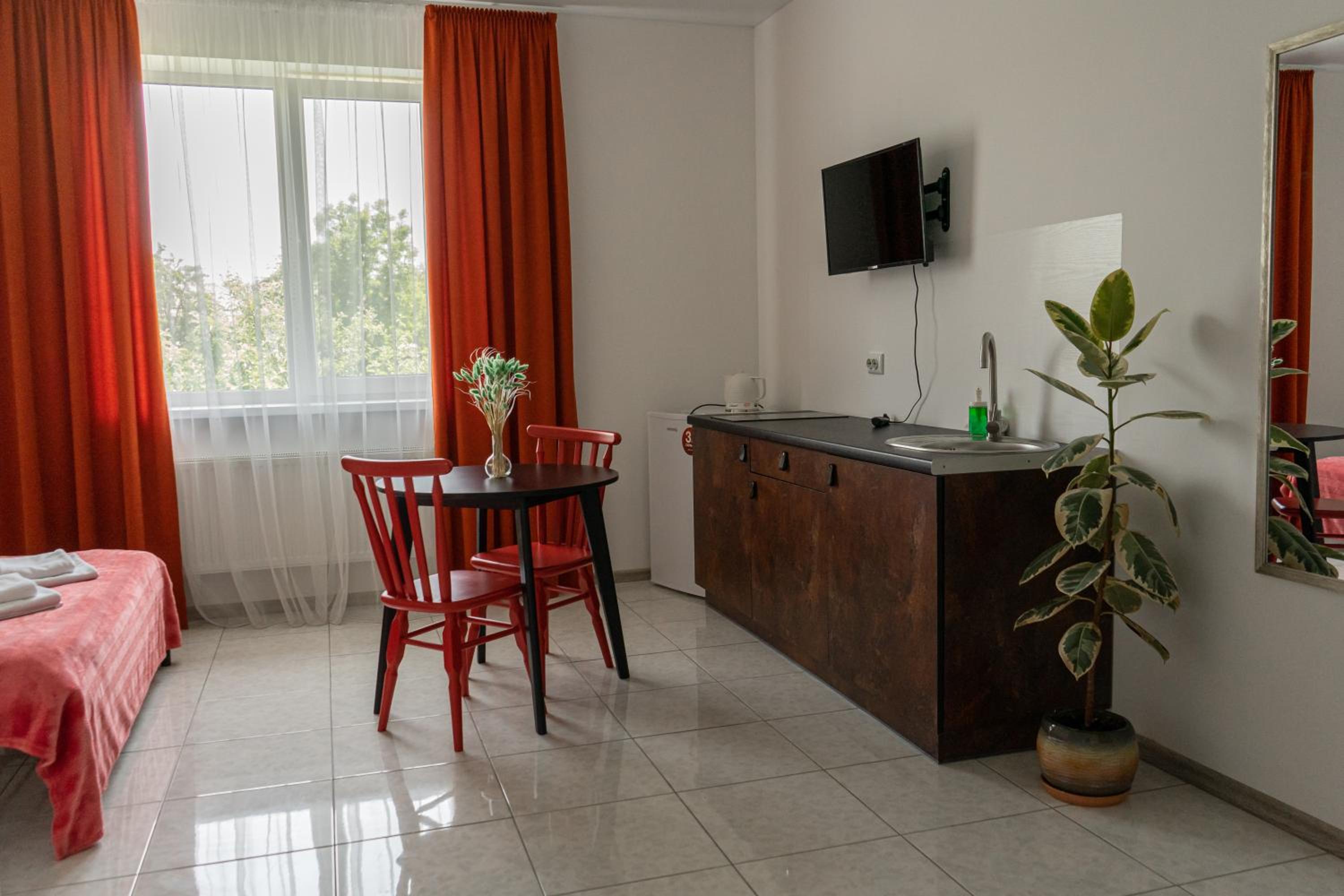 Їхали з запізненням відносно запланованого часу. Важливо було переночувати в номері, який розрахований на 4 осіб не за всі гроші світу, оскільки по дорозі більшість отелів пропонували 2 окремих номери. Саме ці апартаменти знаходилися по дорозі, що дуже зручно, запропонували необхідне нам розміщення, чистий номер, сучасний ремонт, в номері є все необхідне для самостійного приготування їжі (посуд, мікрохвильовка, індукційна піч, чайник). Привітні адміністартори. Є можливість купити готову їжу.