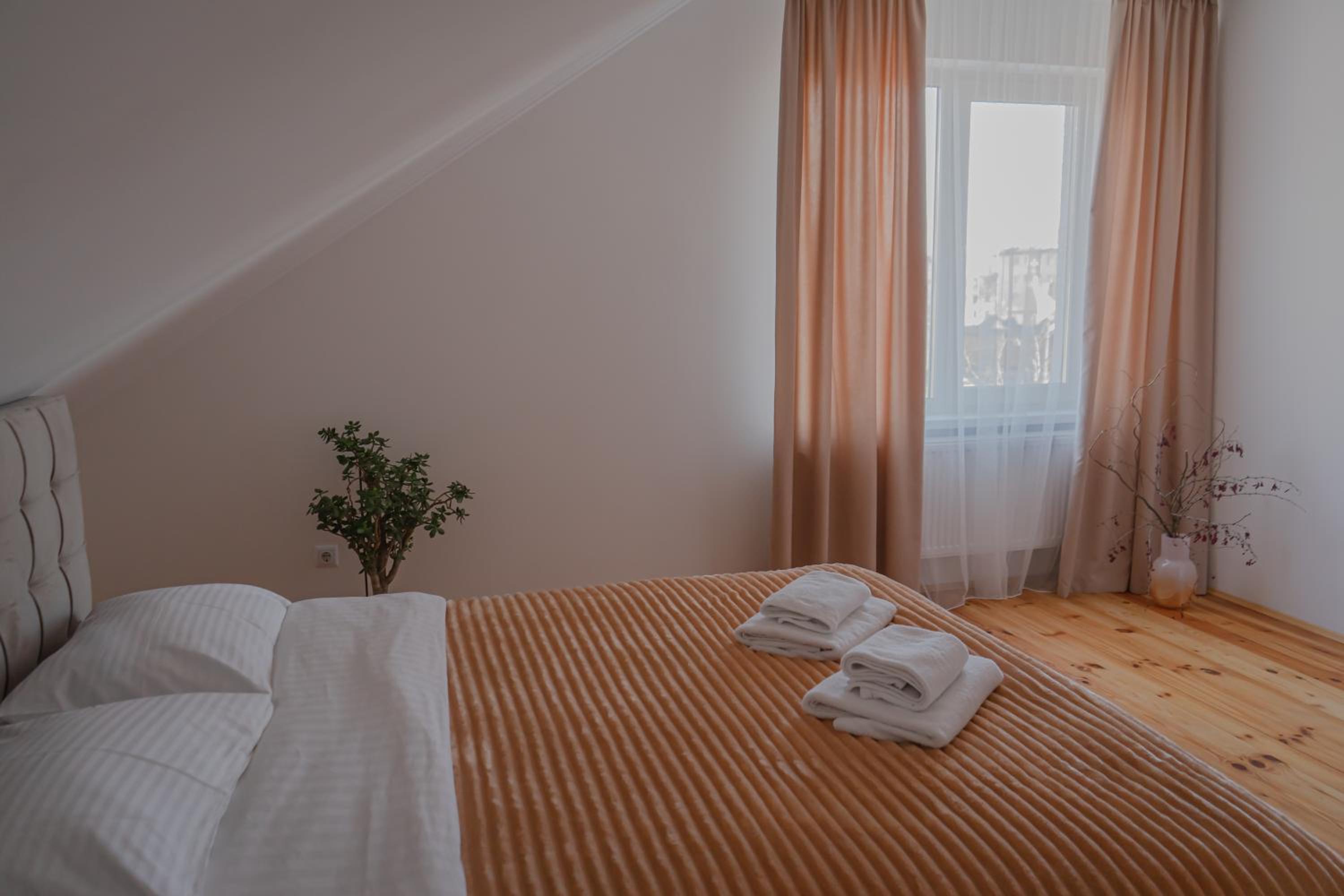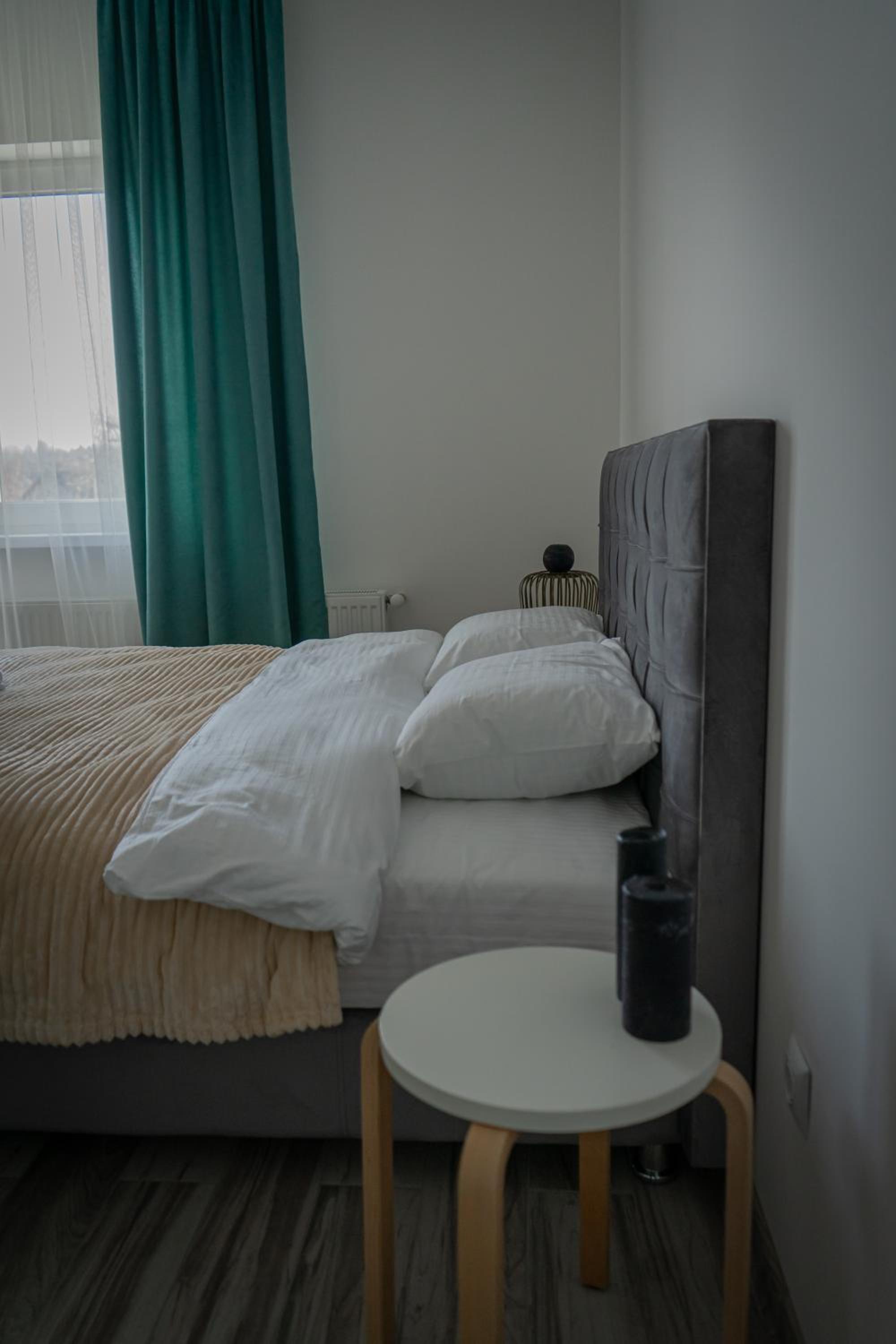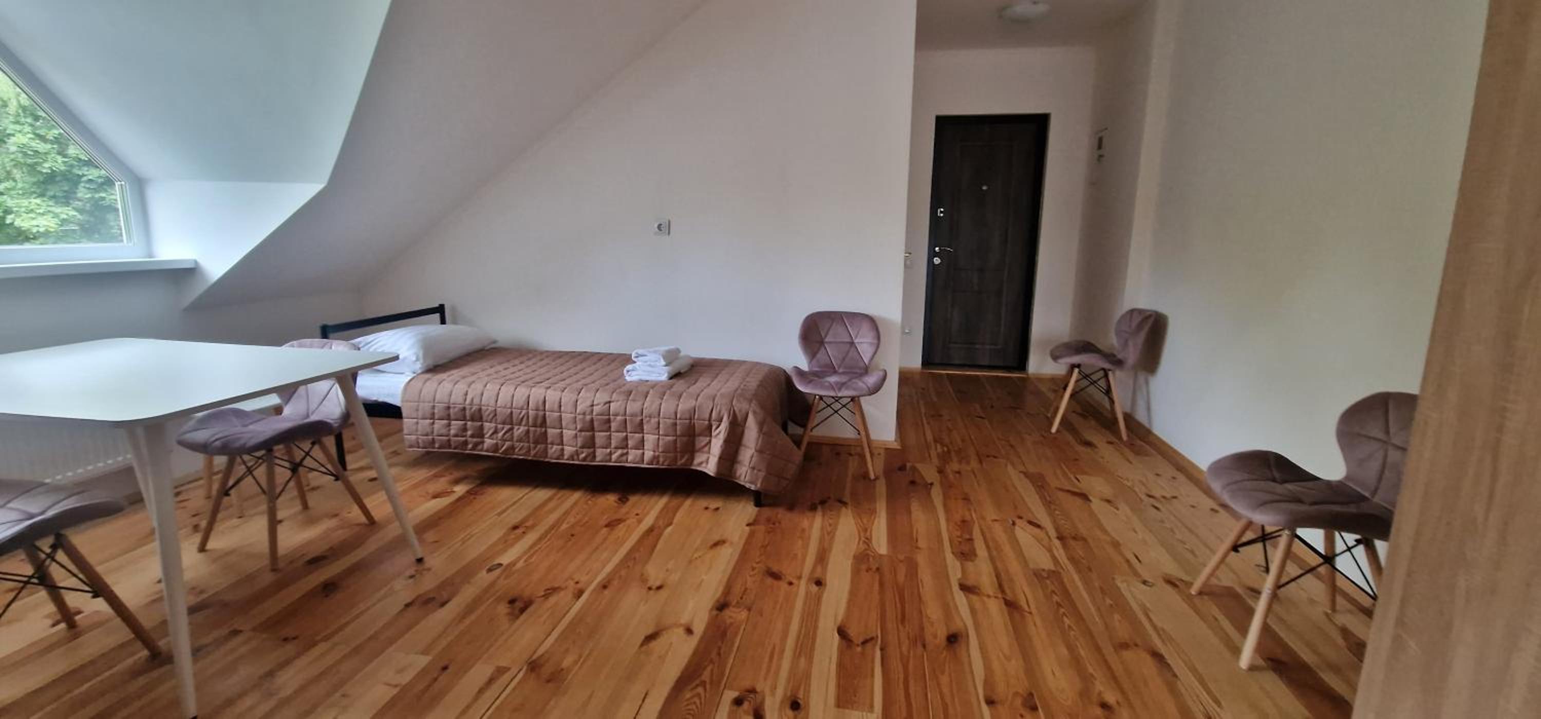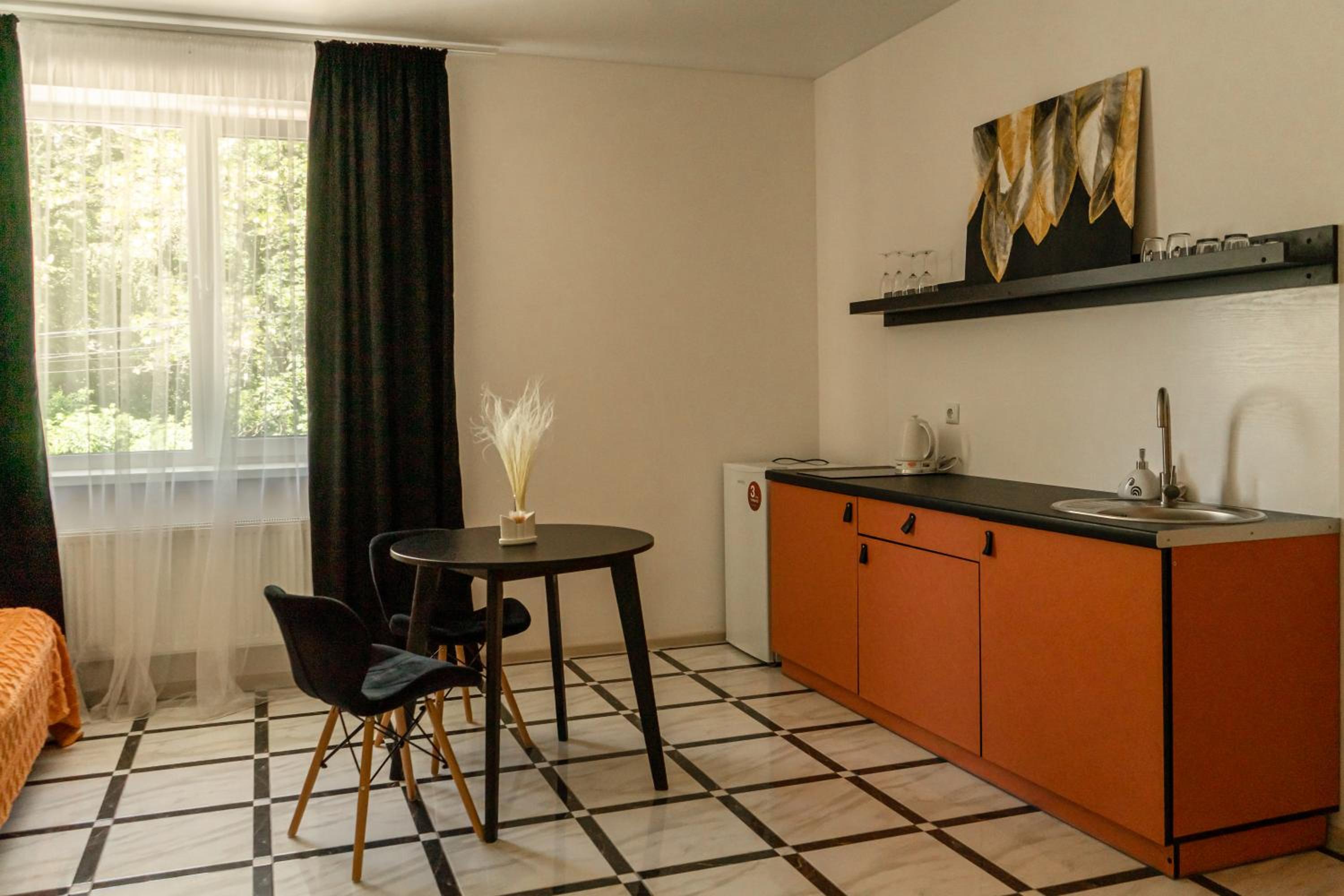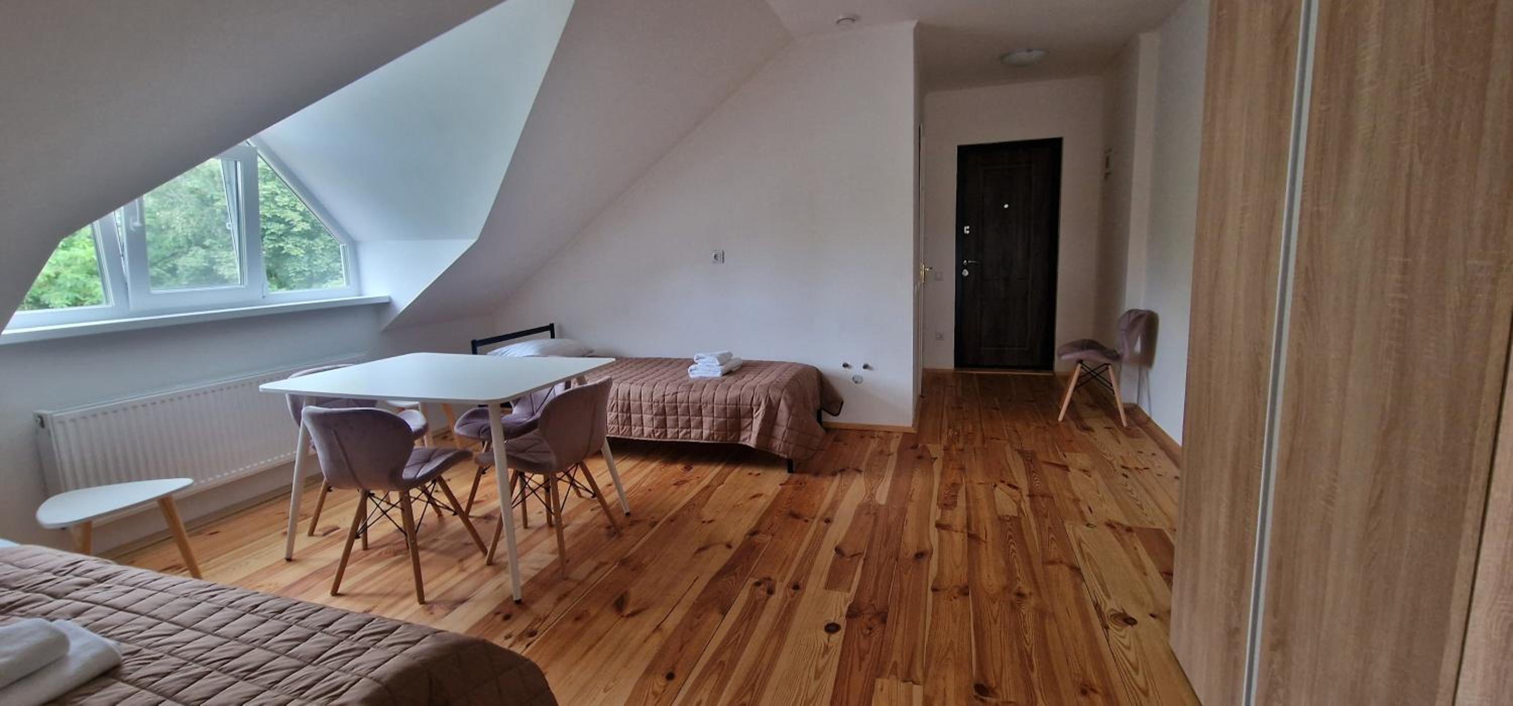 Їхали з запізненням відносно запланованого часу. Важливо було переночувати в номері, який розрахований на 4 осіб не за всі гроші світу, оскільки по дорозі більшість отелів пропонували 2 окремих номери. Саме ці апартаменти знаходилися по дорозі, що дуже зручно, запропонували необхідне нам розміщення, чистий номер, сучасний ремонт, в номері є все необхідне для самостійного приготування їжі (посуд, мікрохвильовка, індукційна піч, чайник). Привітні адміністартори. Є можливість купити готову їжу.