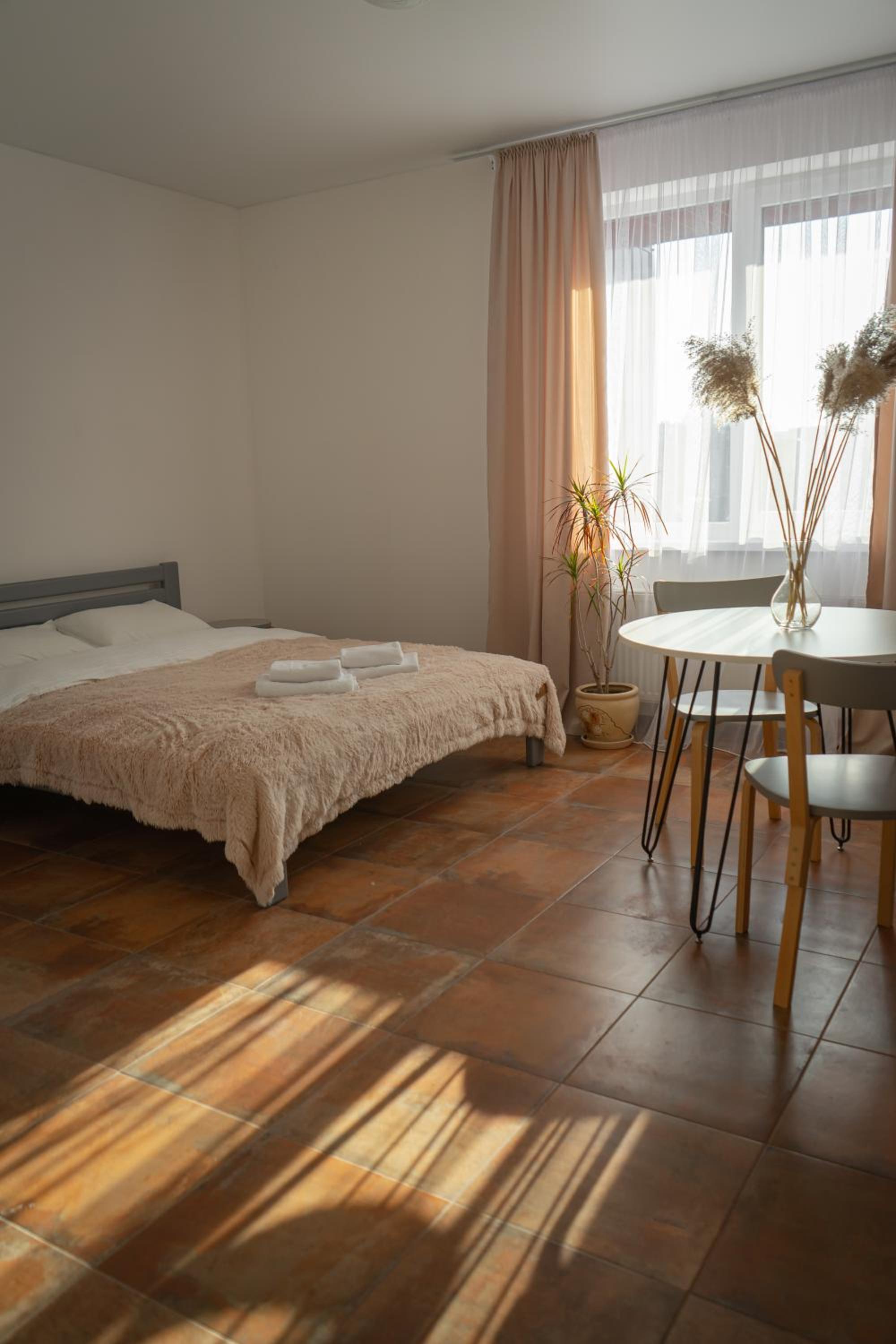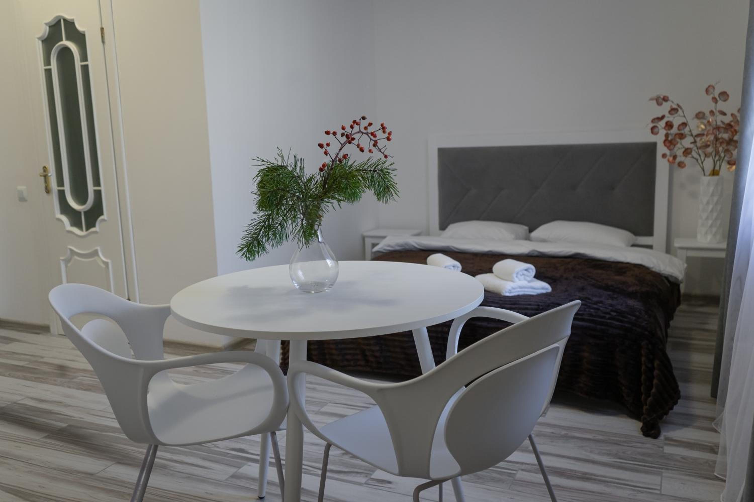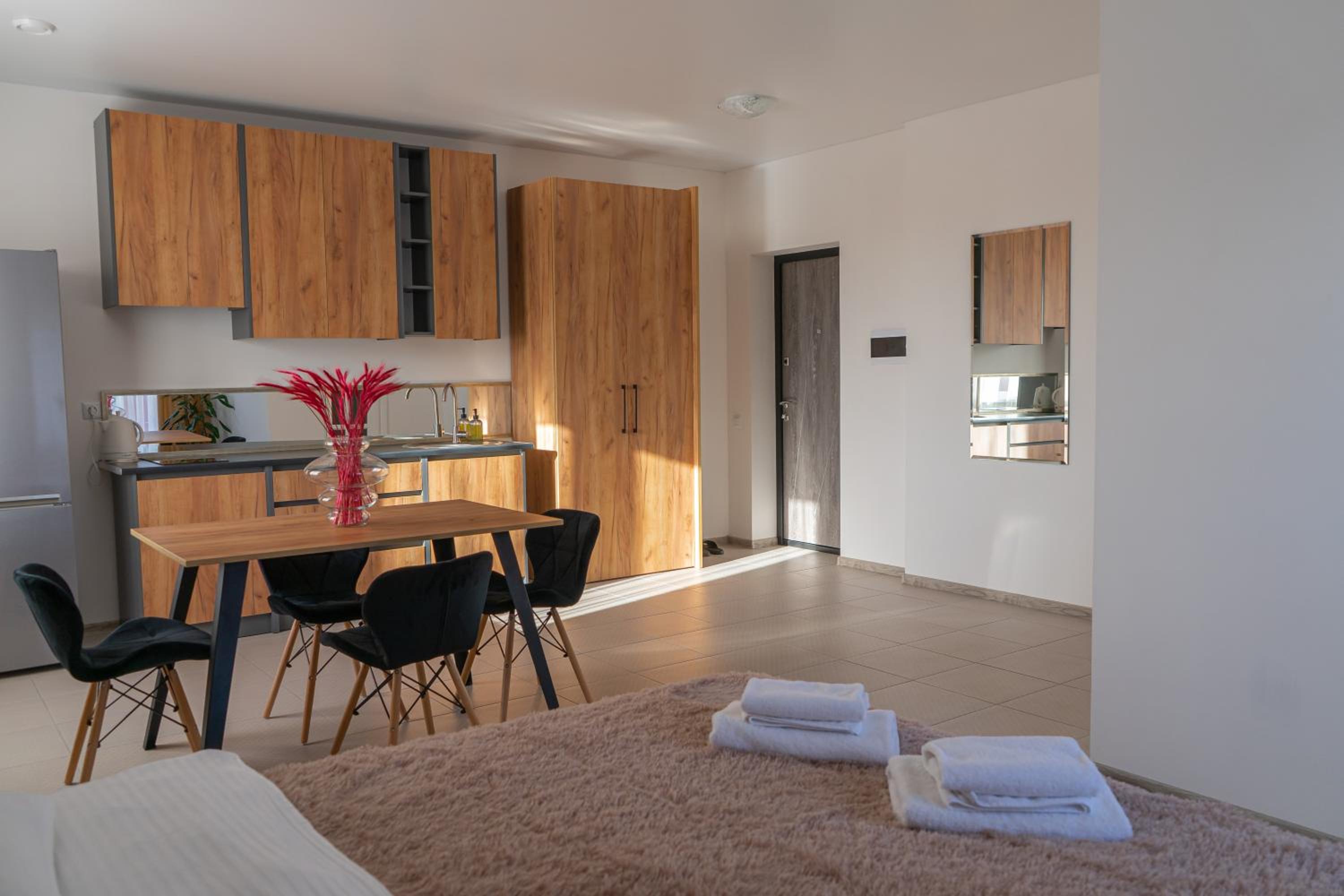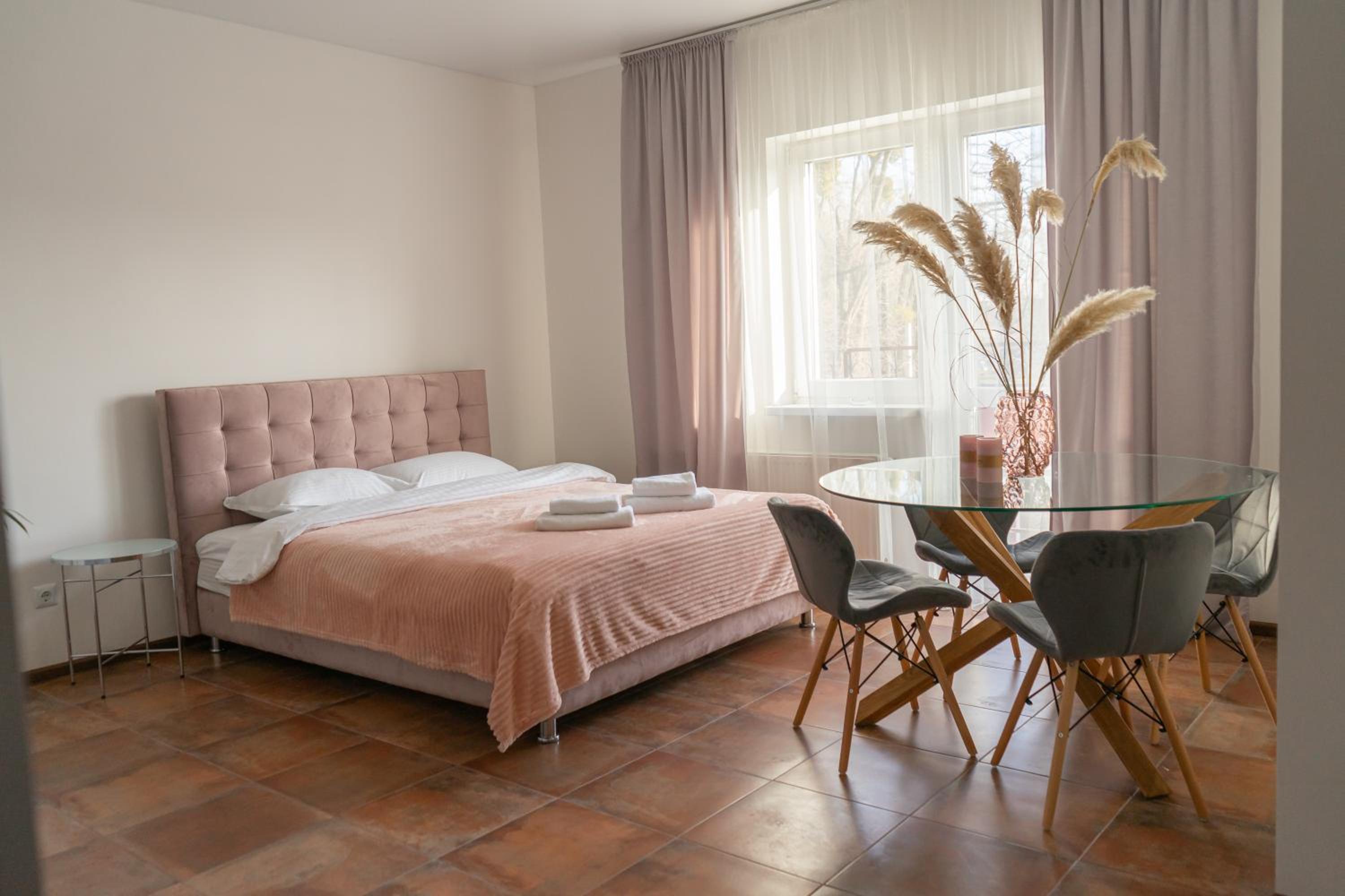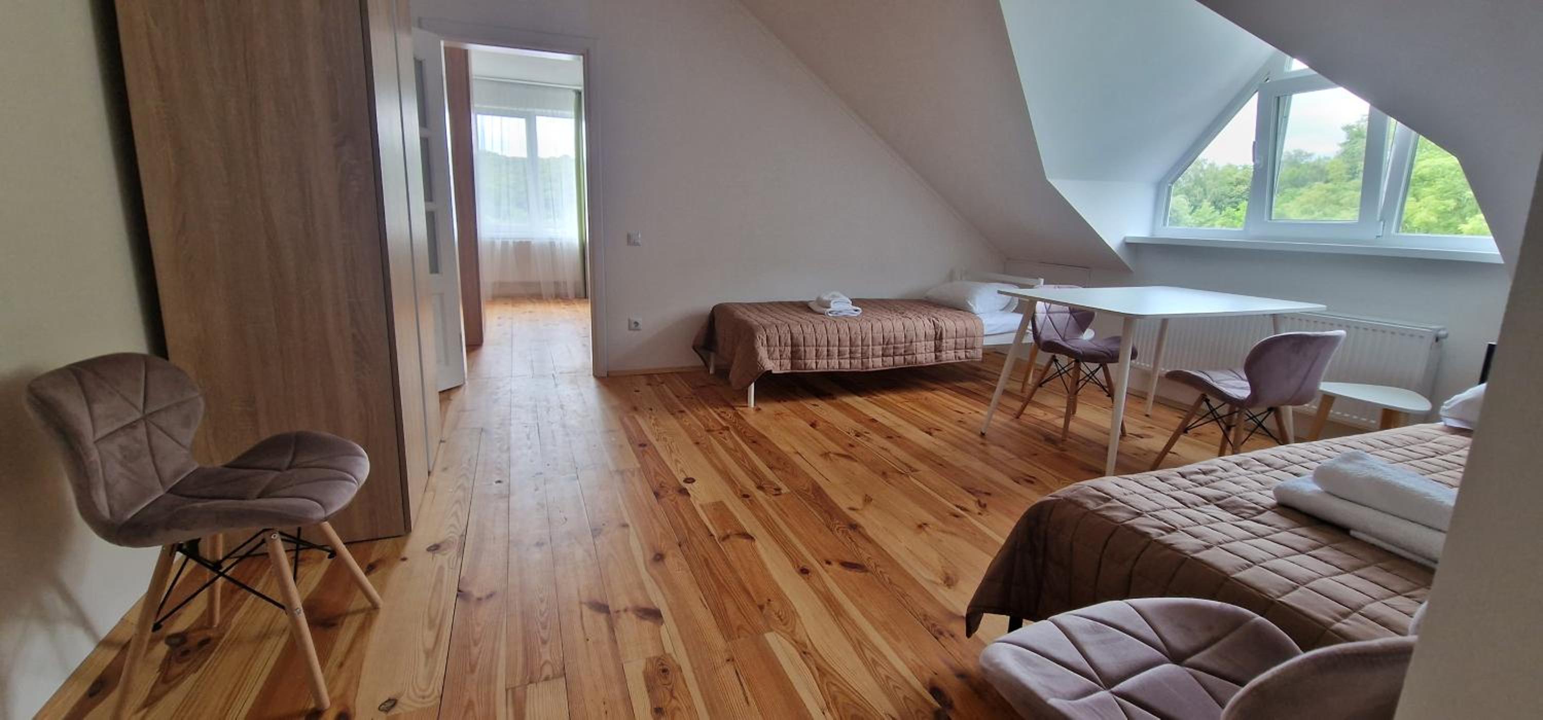 Їхали з запізненням відносно запланованого часу. Важливо було переночувати в номері, який розрахований на 4 осіб не за всі гроші світу, оскільки по дорозі більшість отелів пропонували 2 окремих номери. Саме ці апартаменти знаходилися по дорозі, що дуже зручно, запропонували необхідне нам розміщення, чистий номер, сучасний ремонт, в номері є все необхідне для самостійного приготування їжі (посуд, мікрохвильовка, індукційна піч, чайник). Привітні адміністартори. Є можливість купити готову їжу.