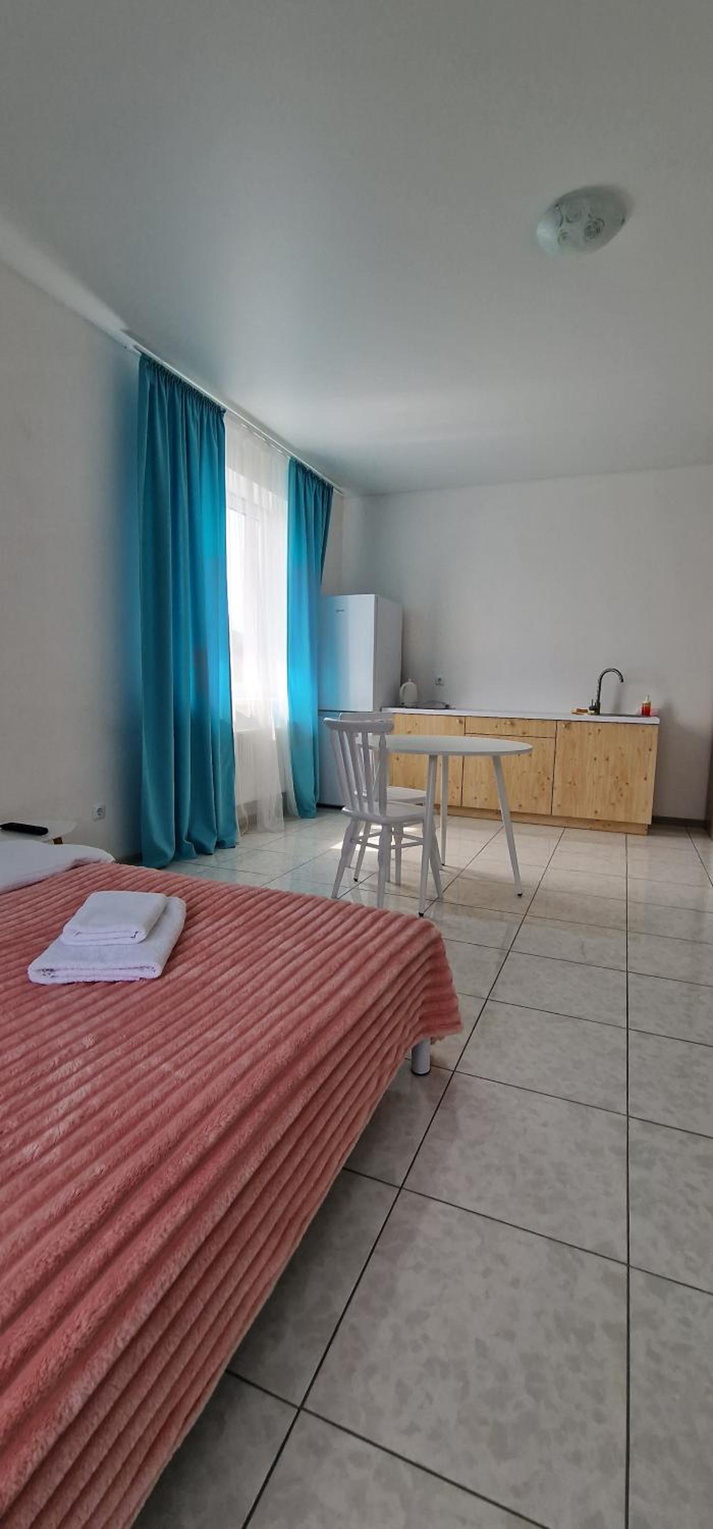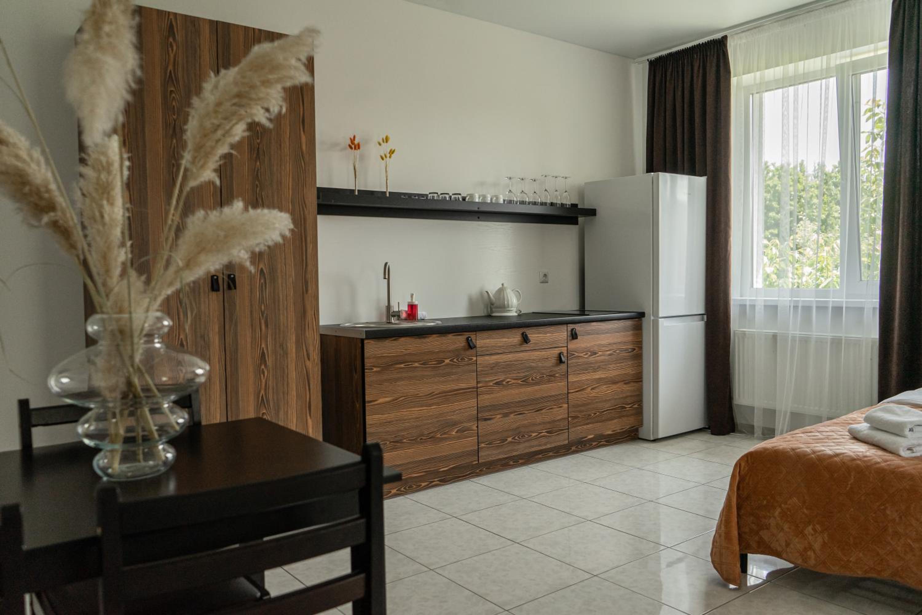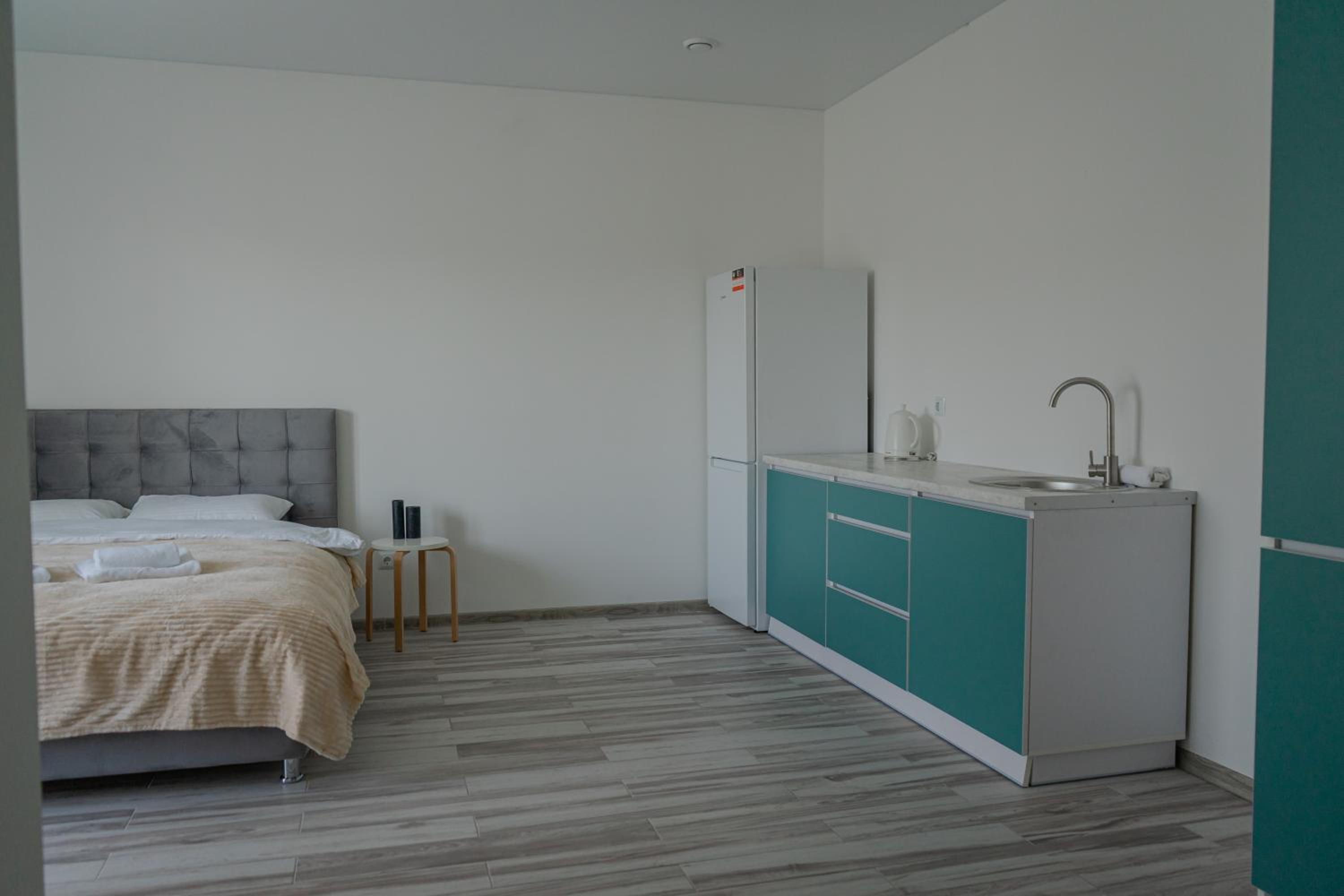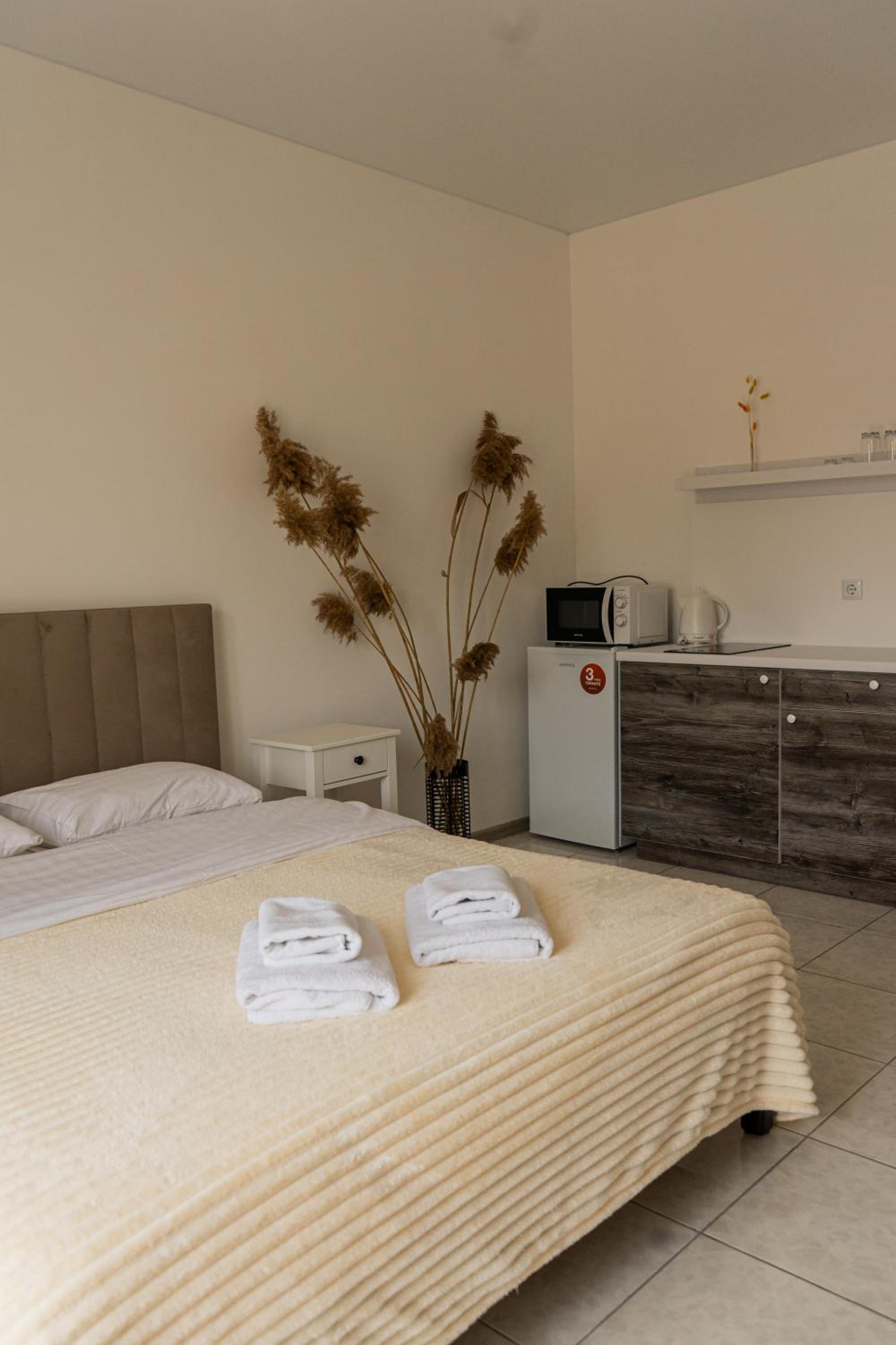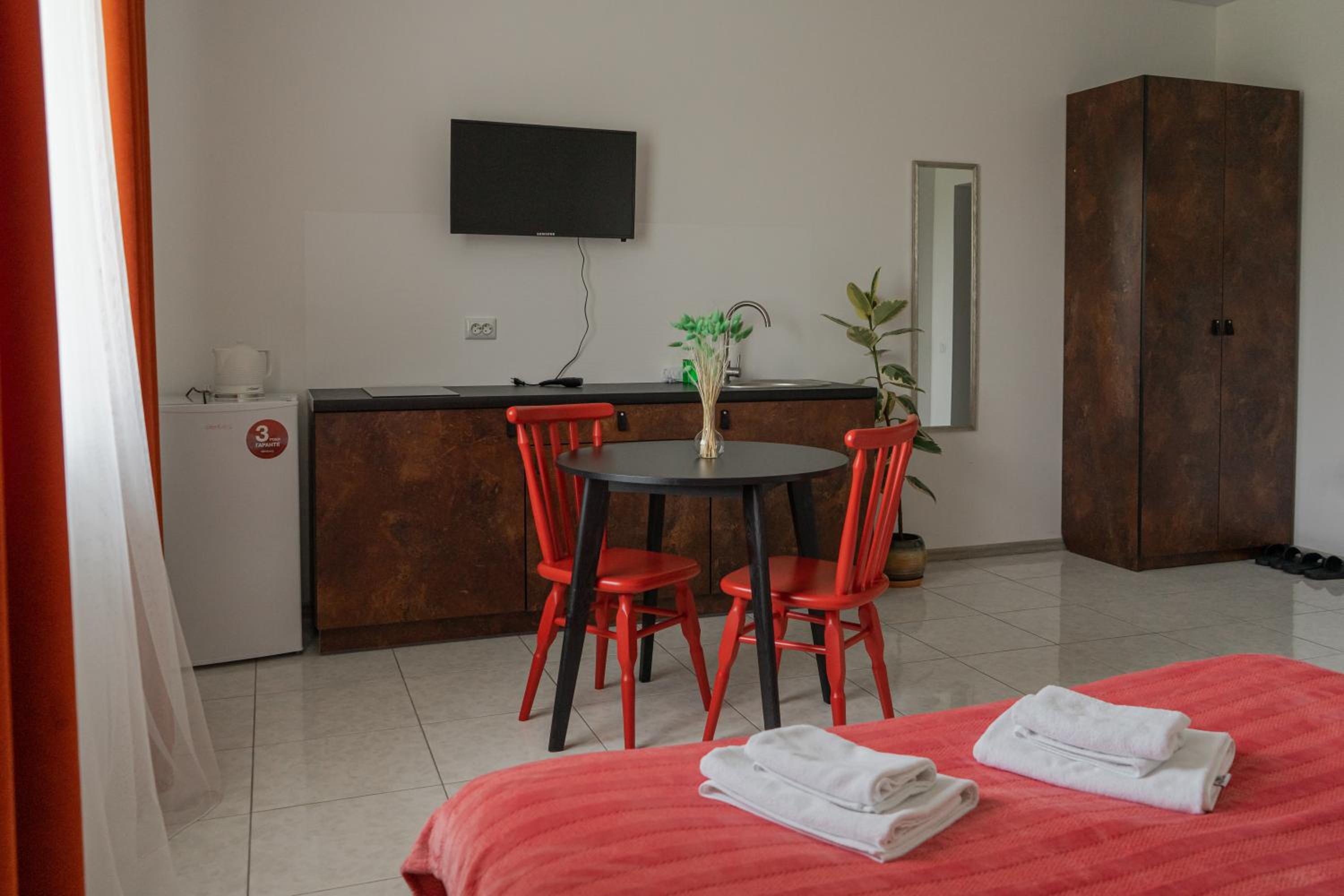 У номері всі меблі, посуд і все інше новеньке. Посуд, мікрохвильовка, холодильник , плита все є.