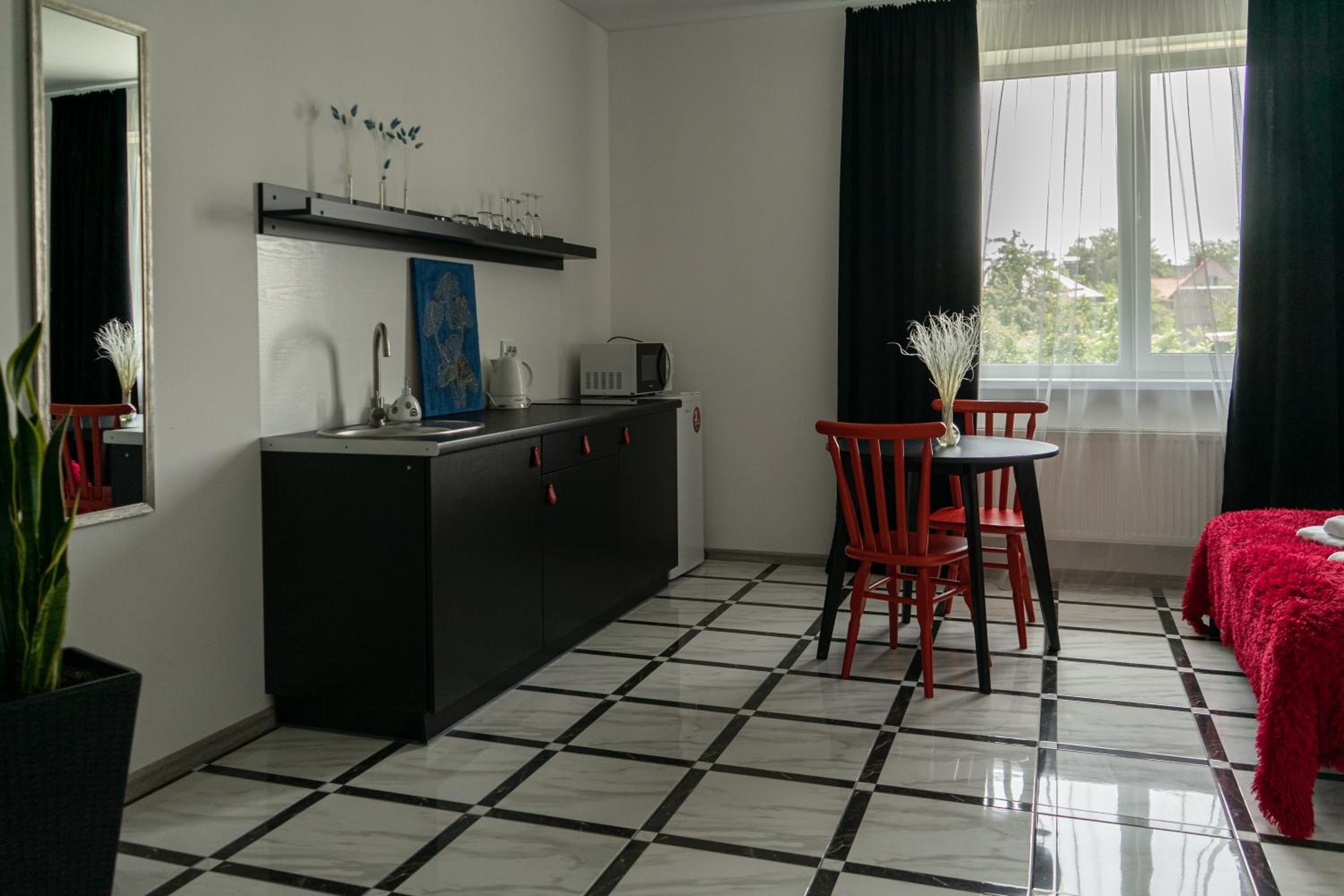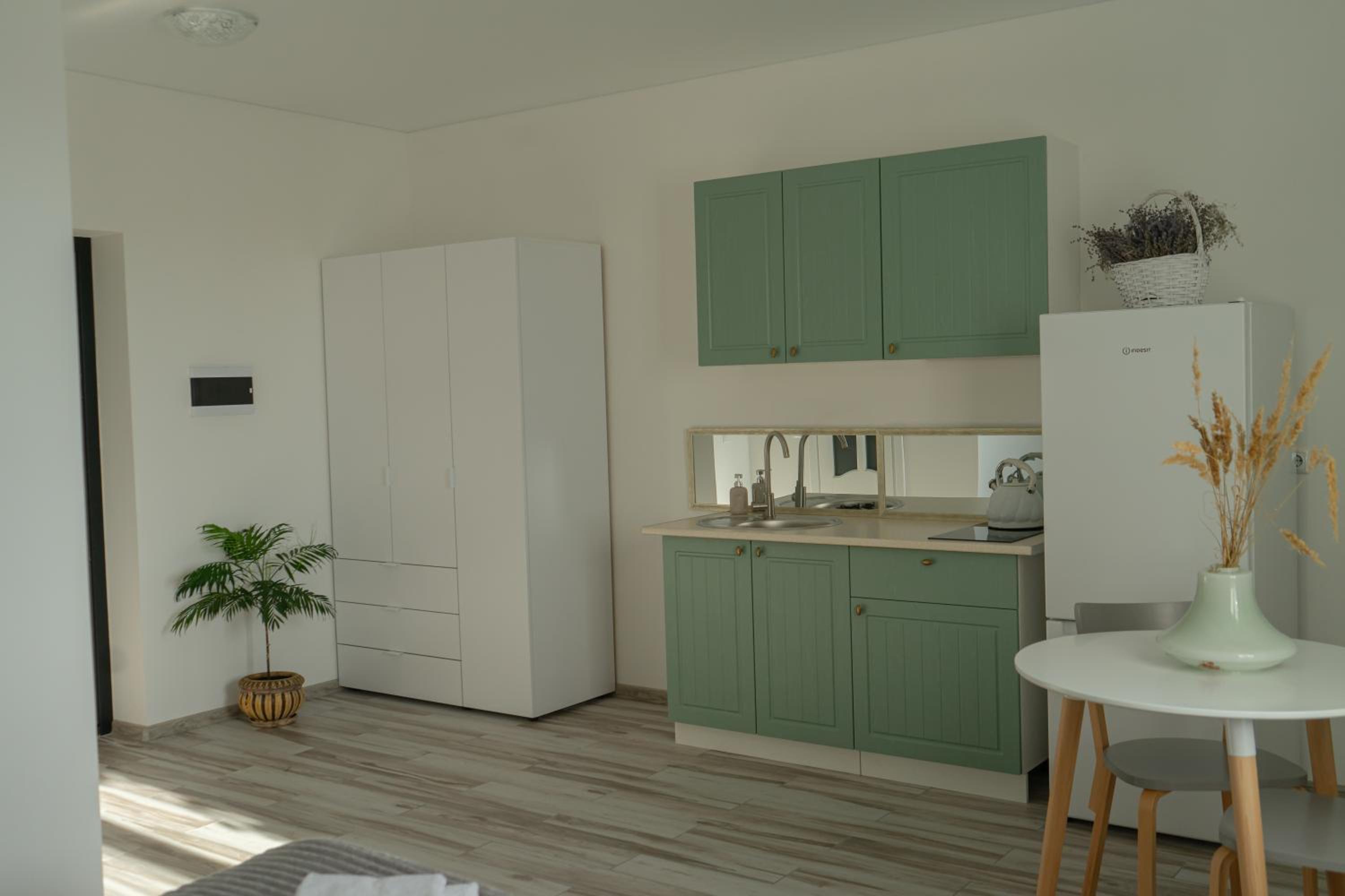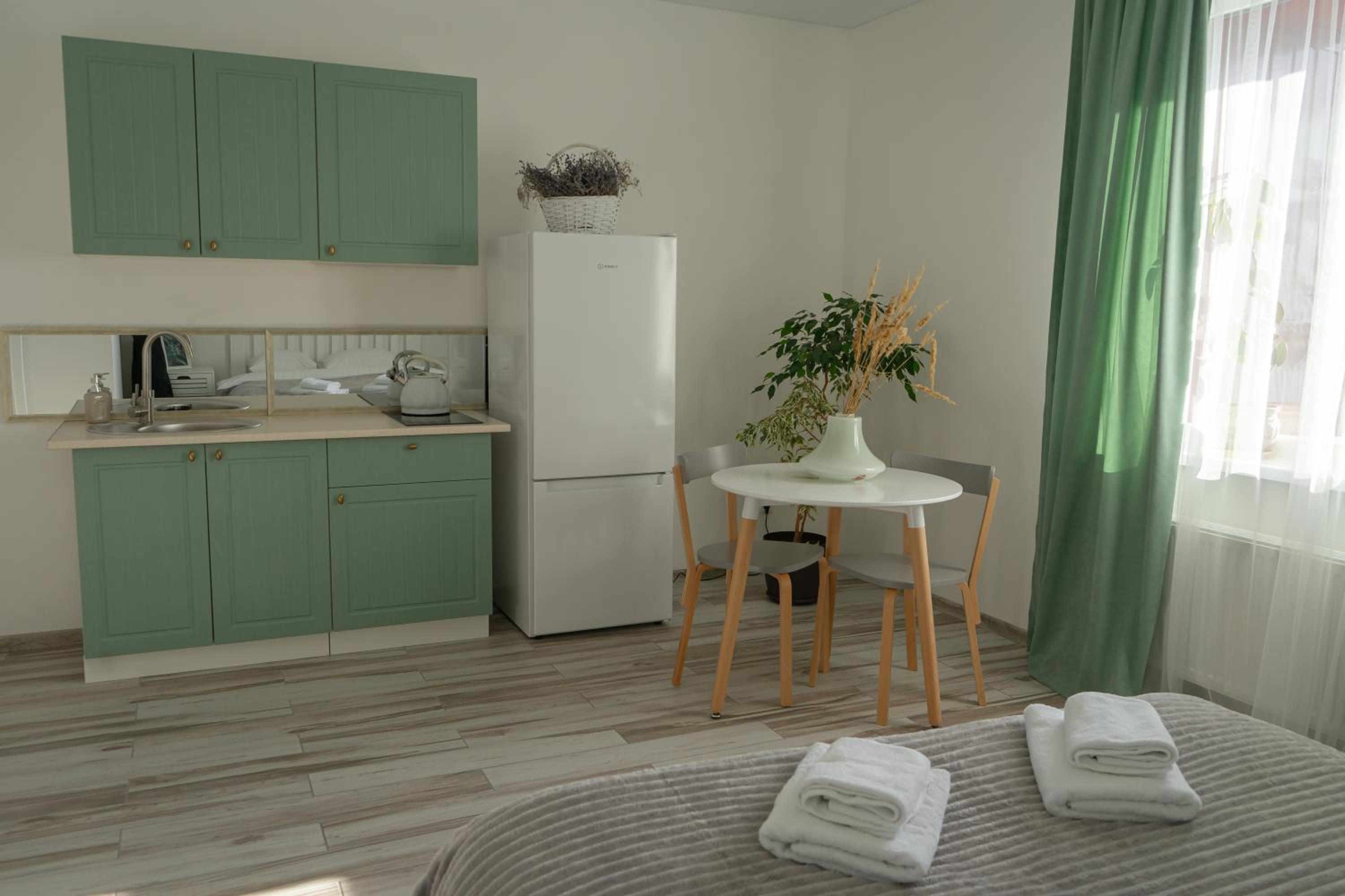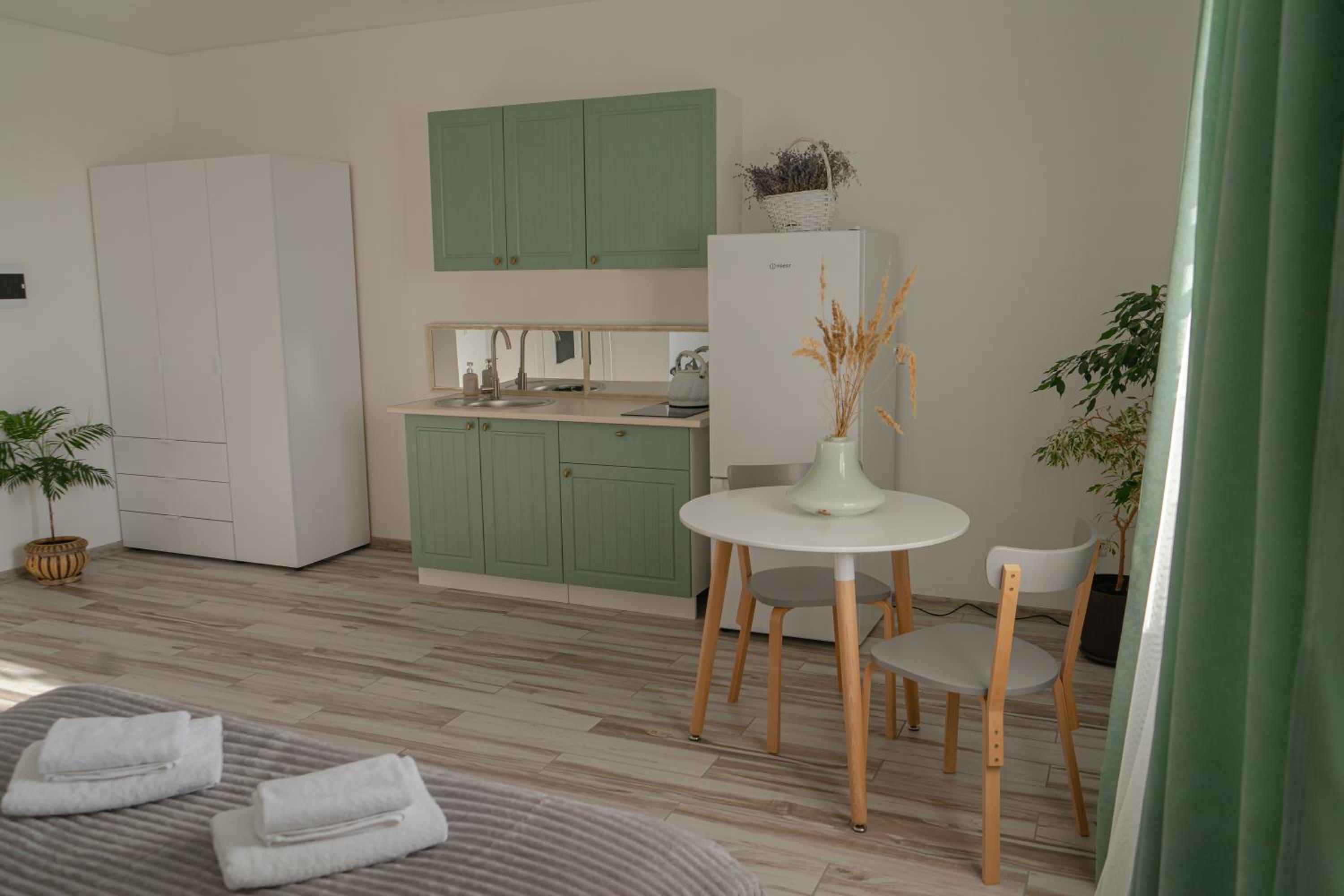 У номері всі меблі, посуд і все інше новеньке. Посуд, мікрохвильовка, холодильник , плита все є.