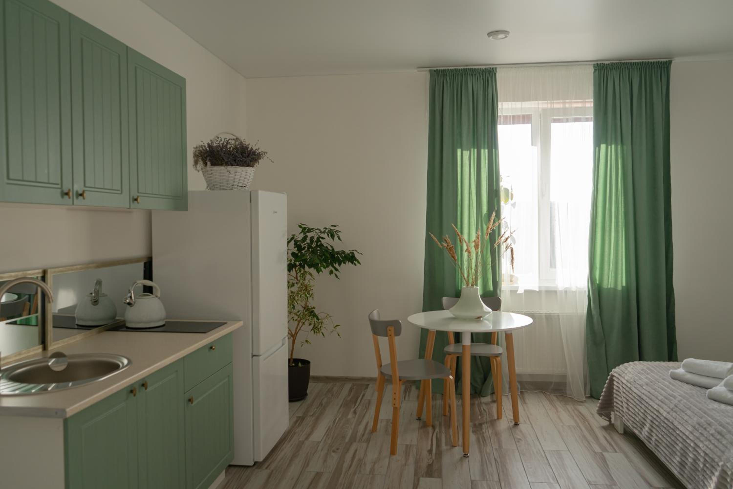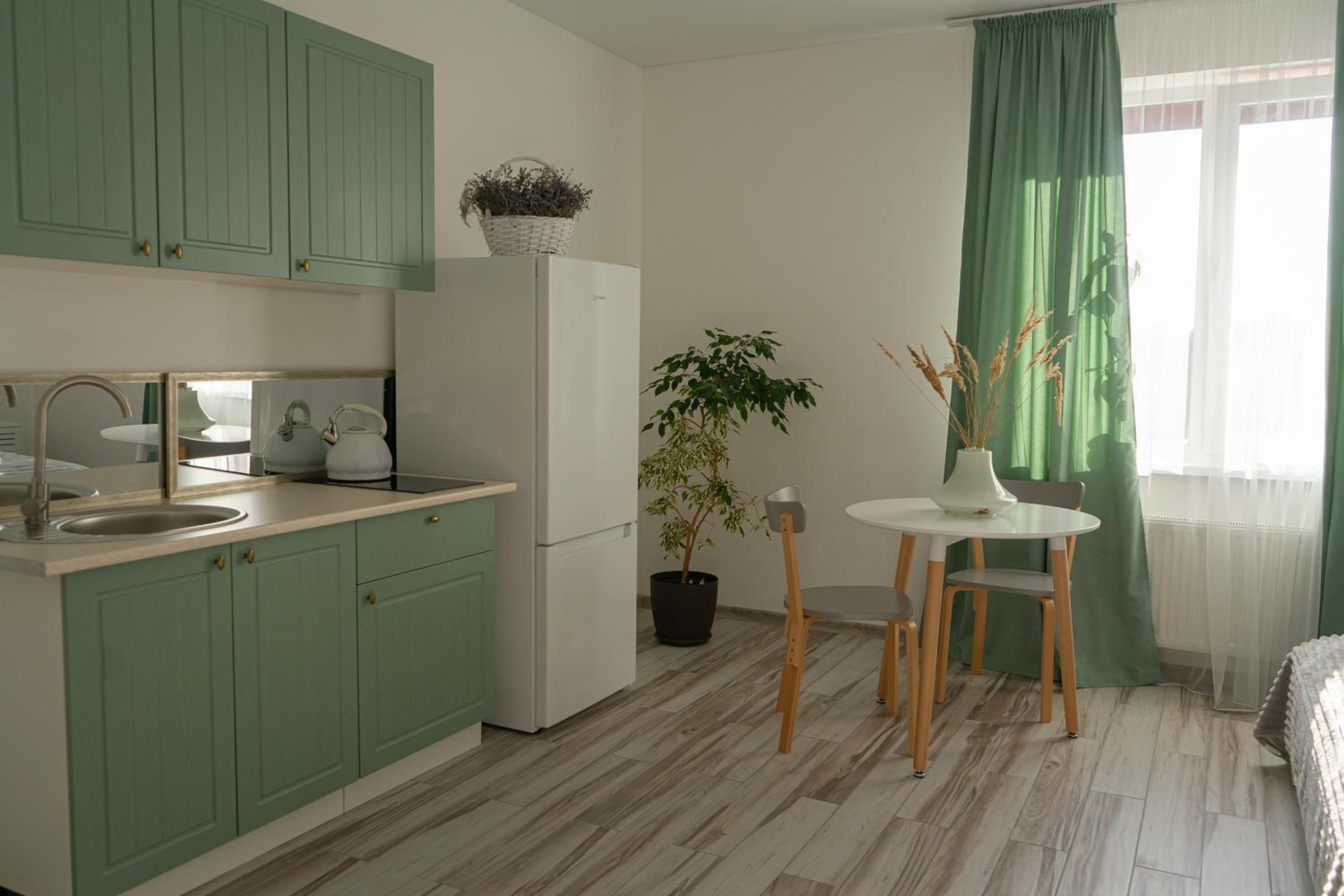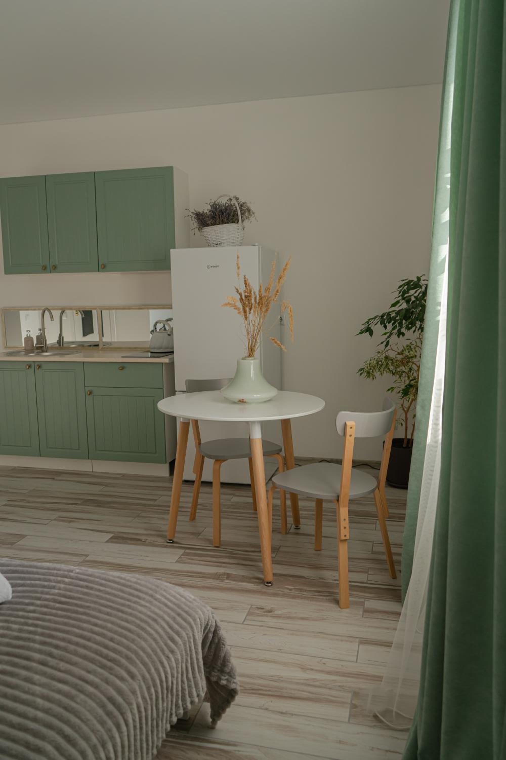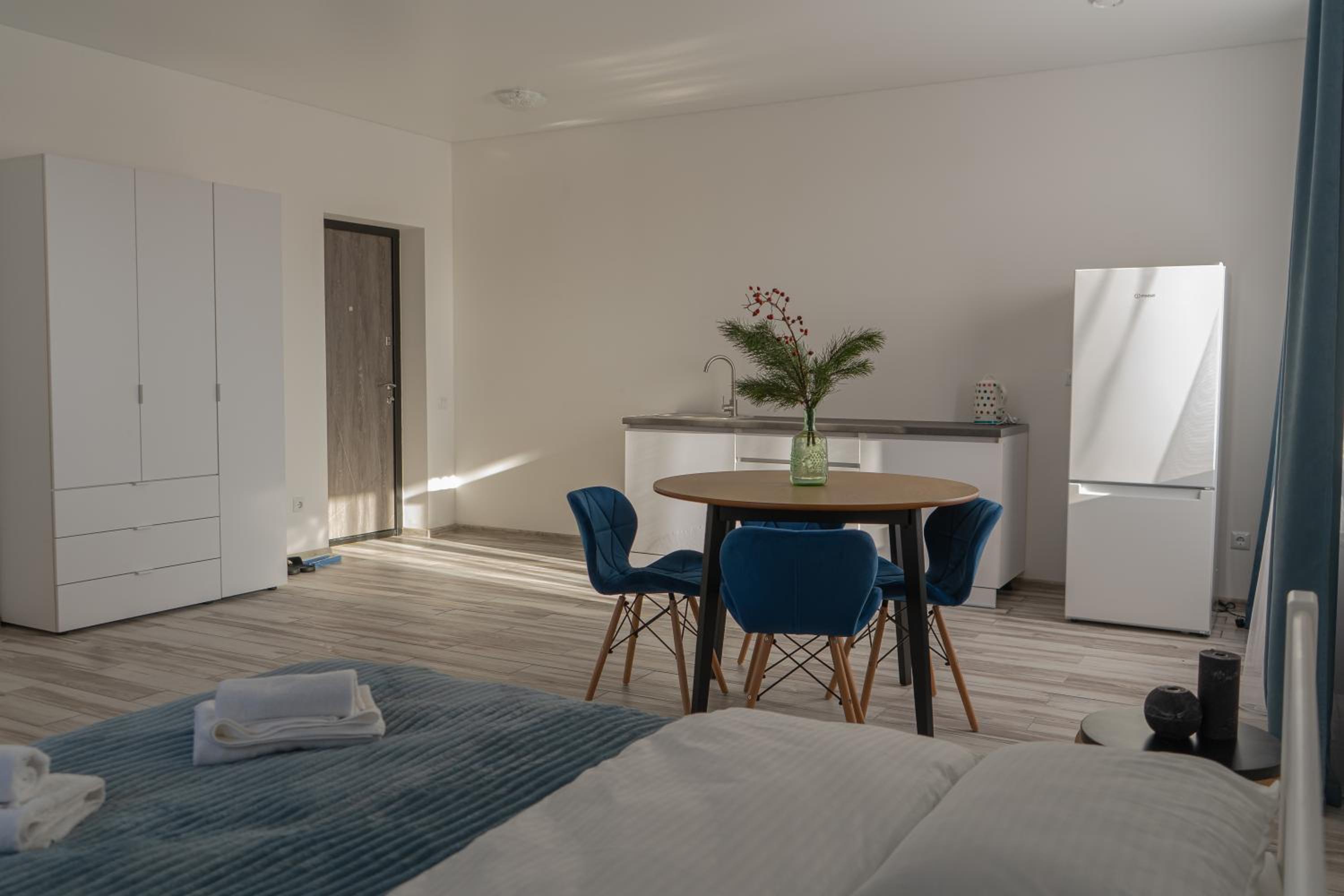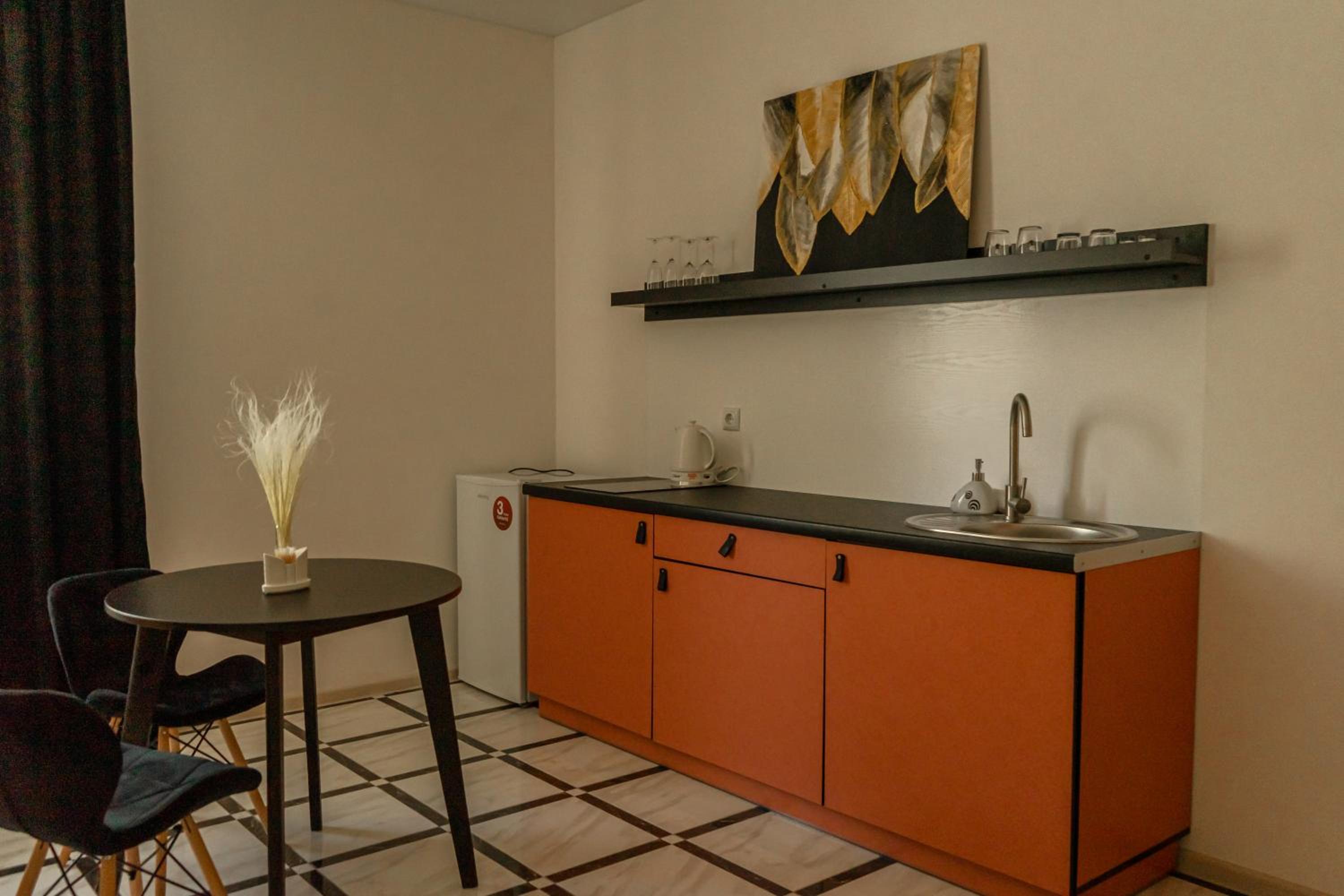 У номері всі меблі, посуд і все інше новеньке. Посуд, мікрохвильовка, холодильник , плита все є.
