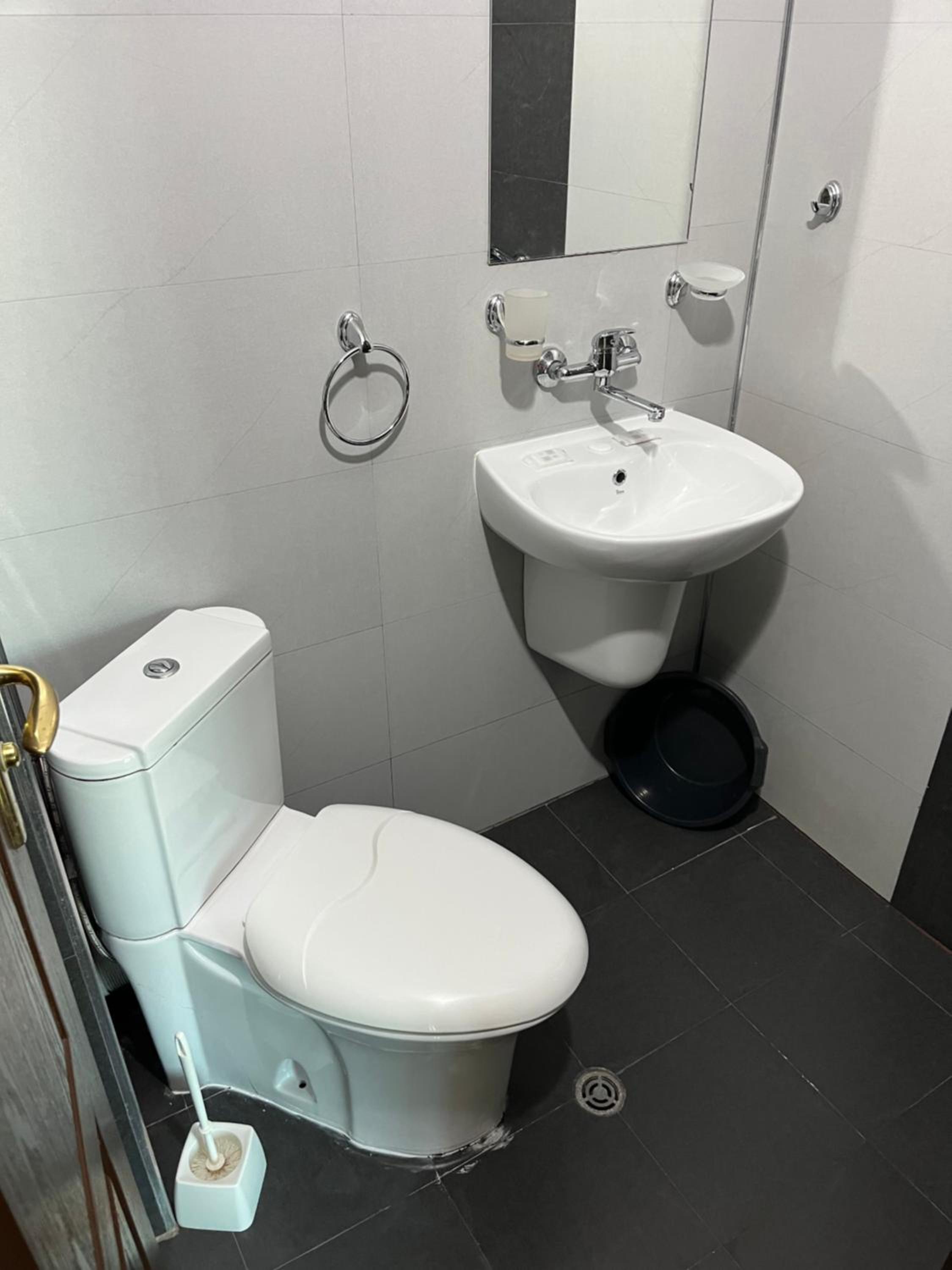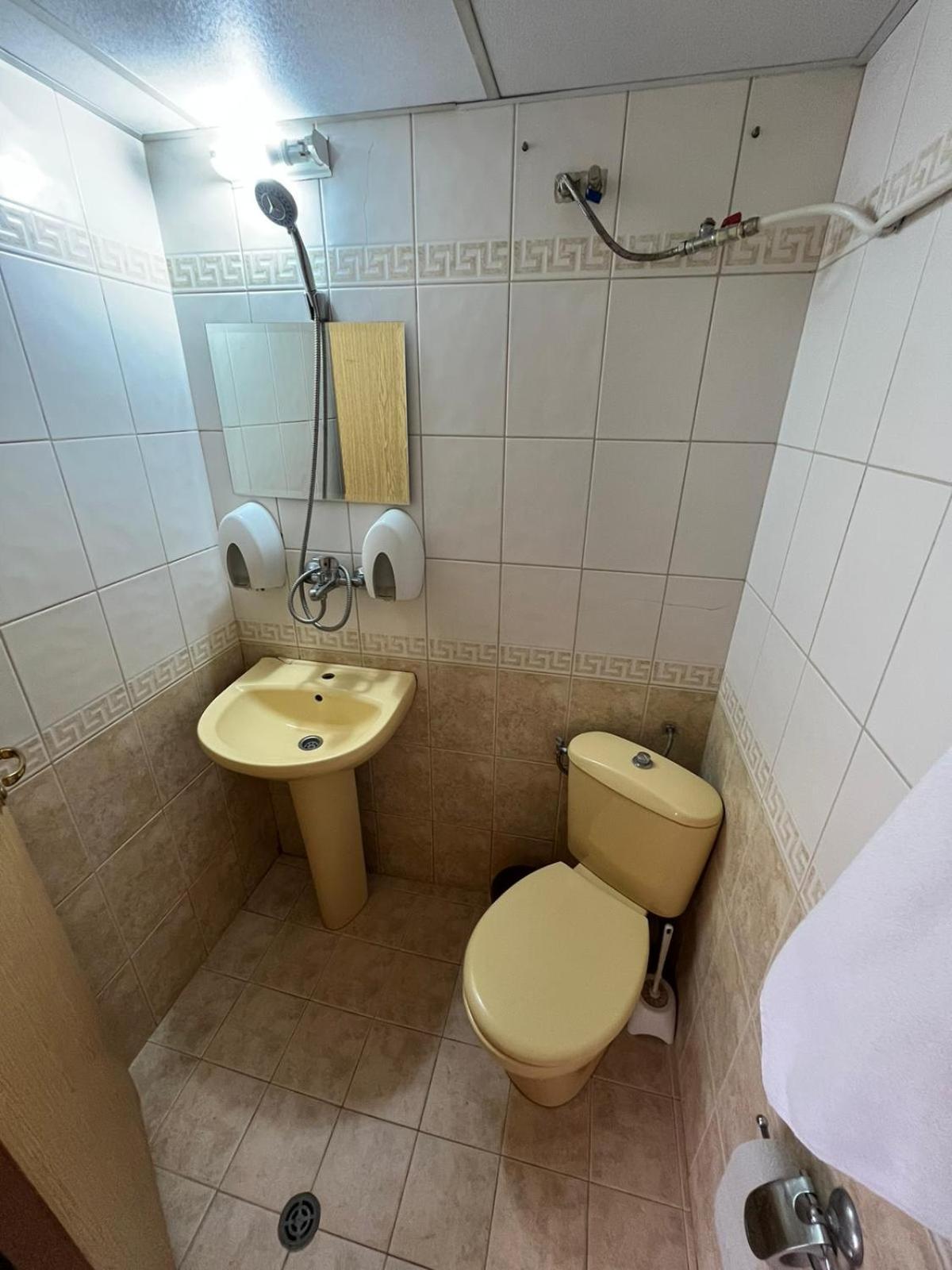 Банята беше тясна и място за душ (и душ) нямаше. Имаше закачена слушалка за мивката (която пък беше и счупена).