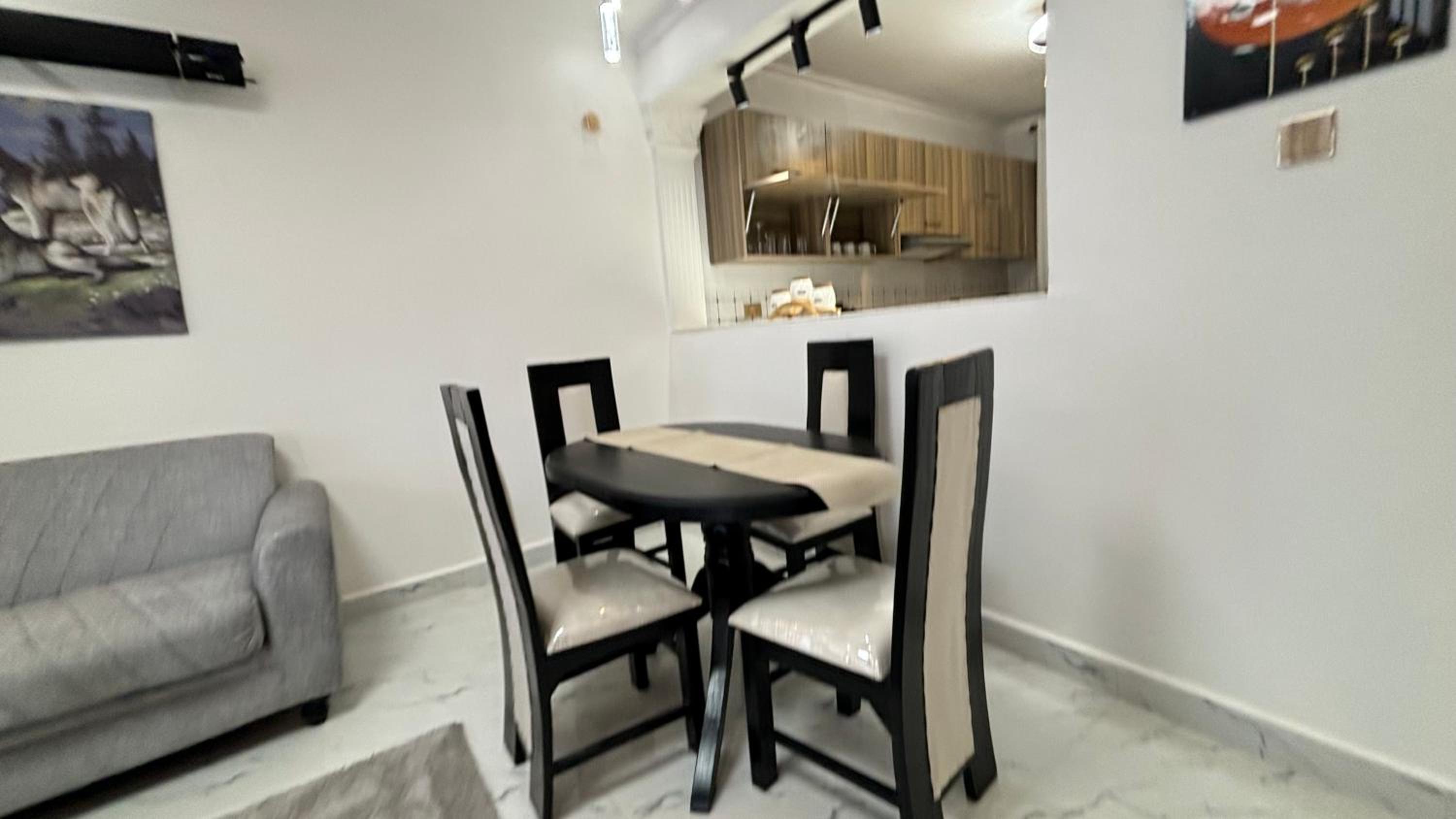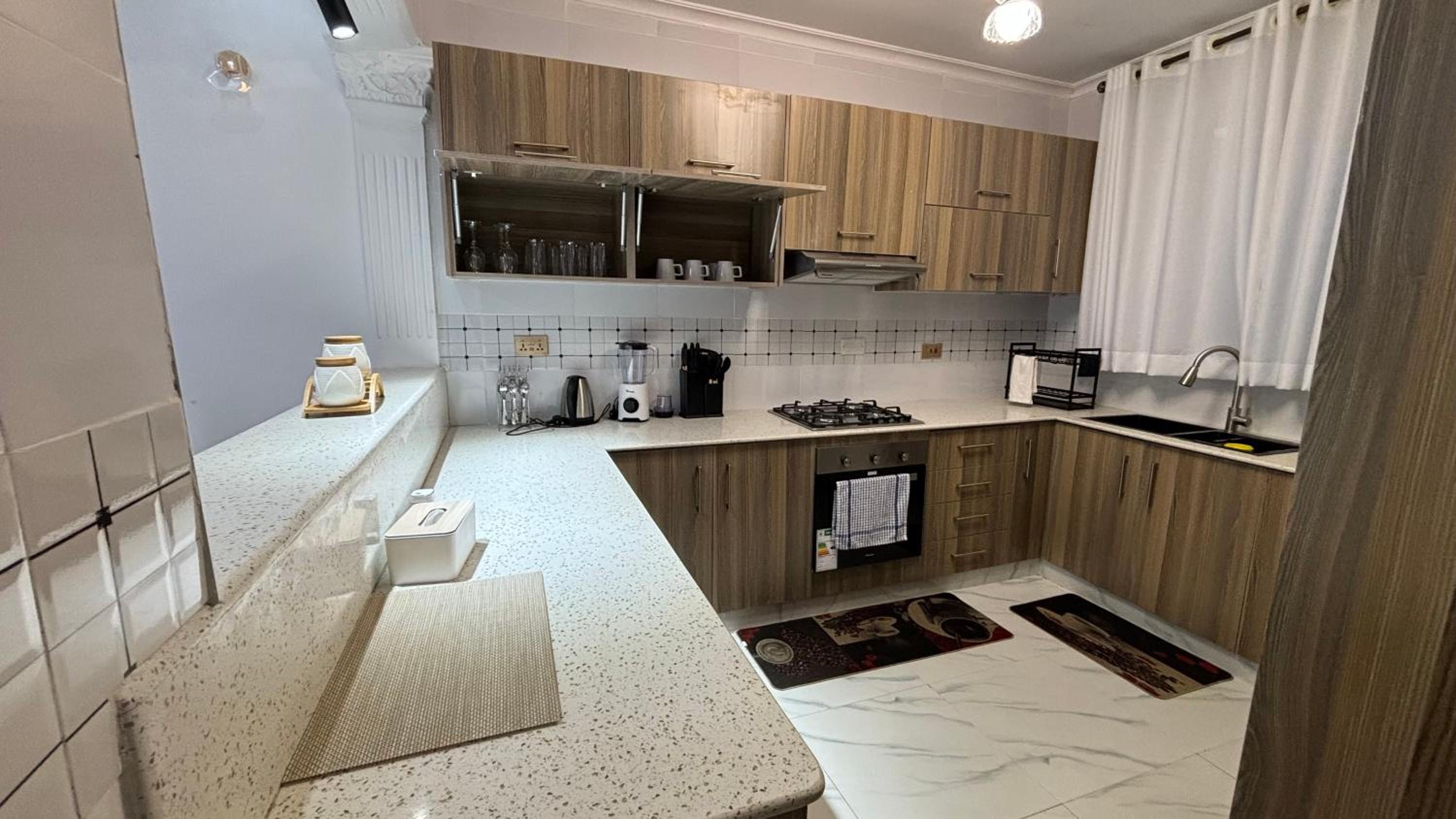 Experience comfort with air conditioning, a flat-screen TV, and a fully equipped kitchen for a relaxing stay.
