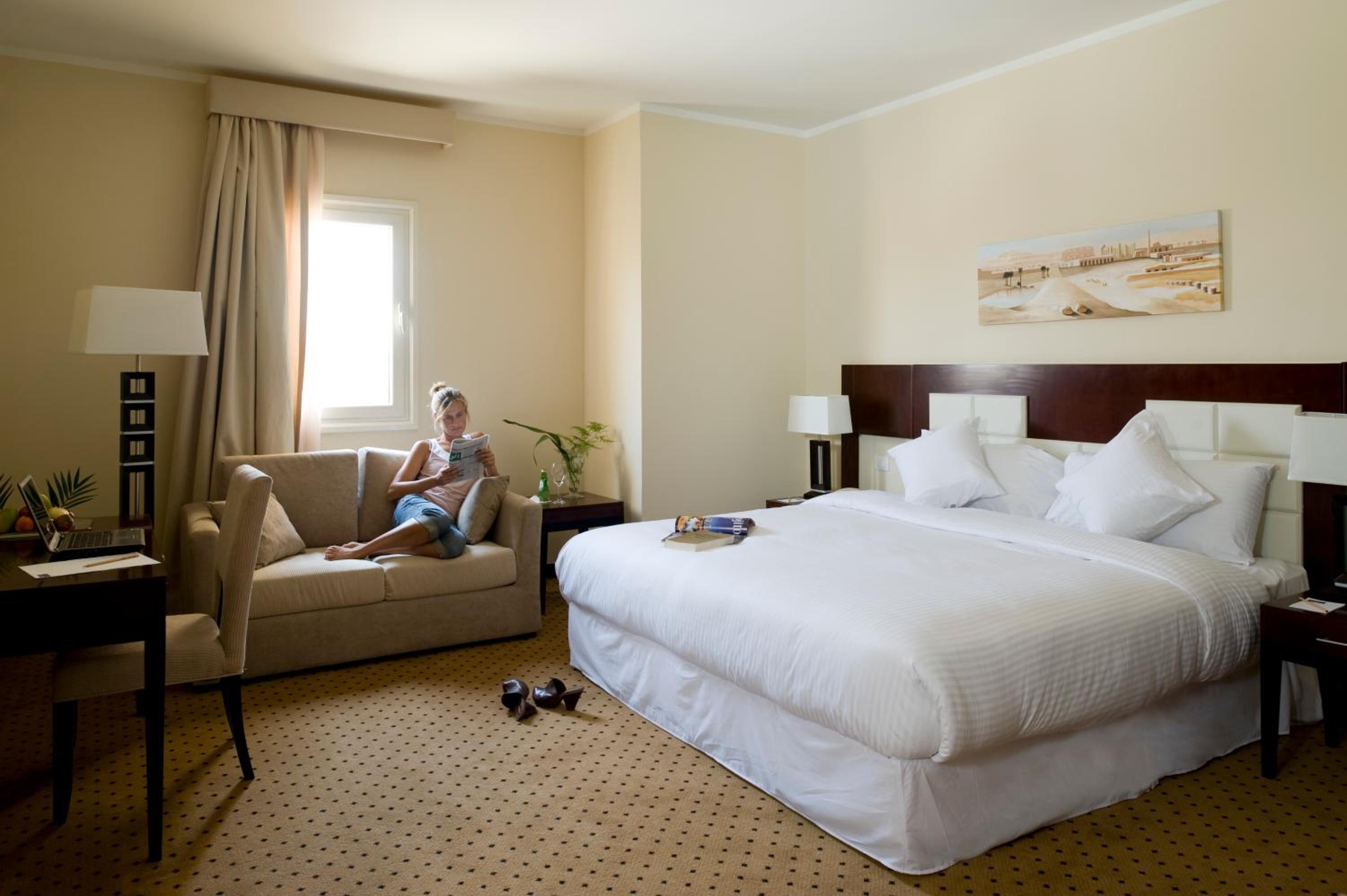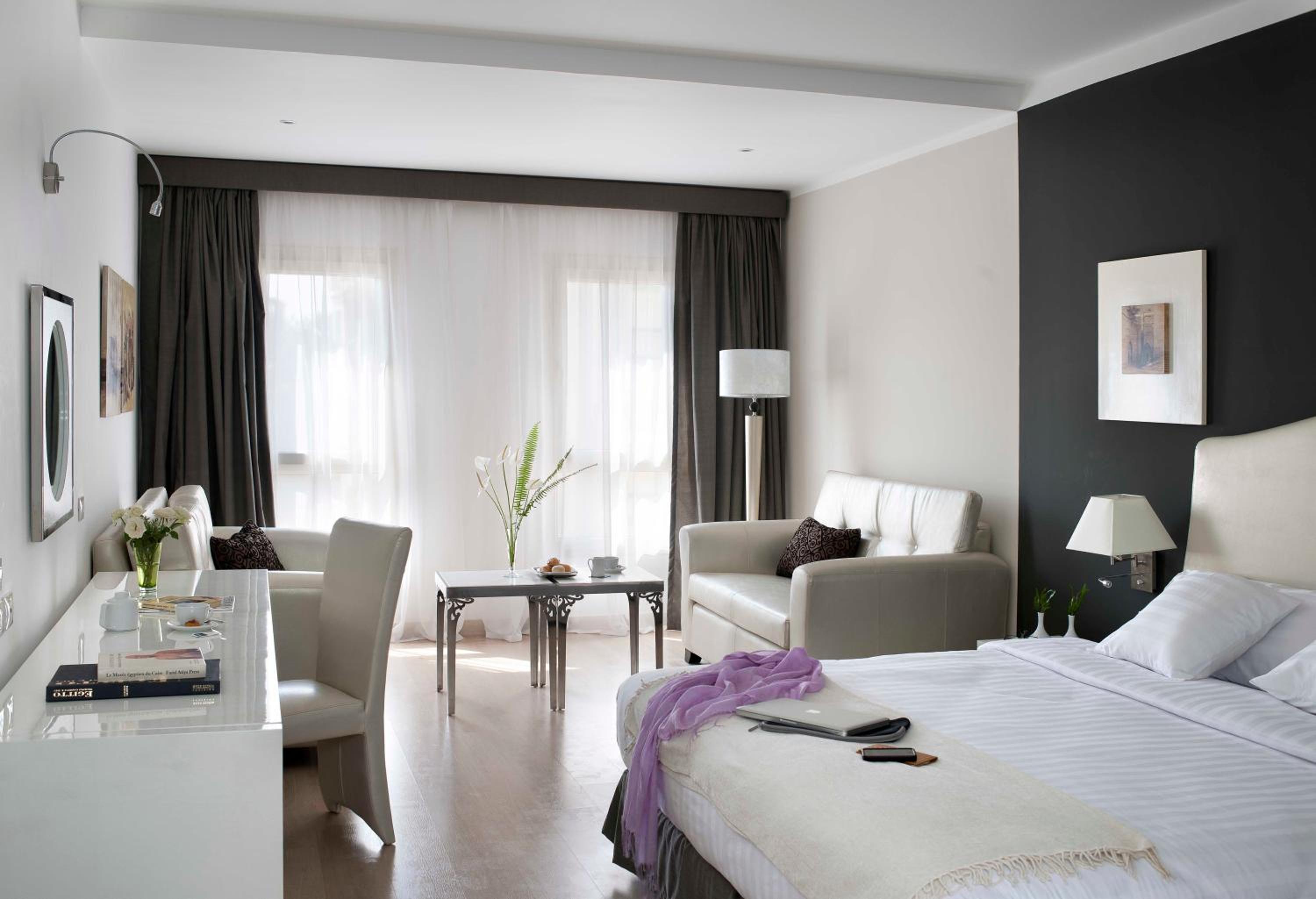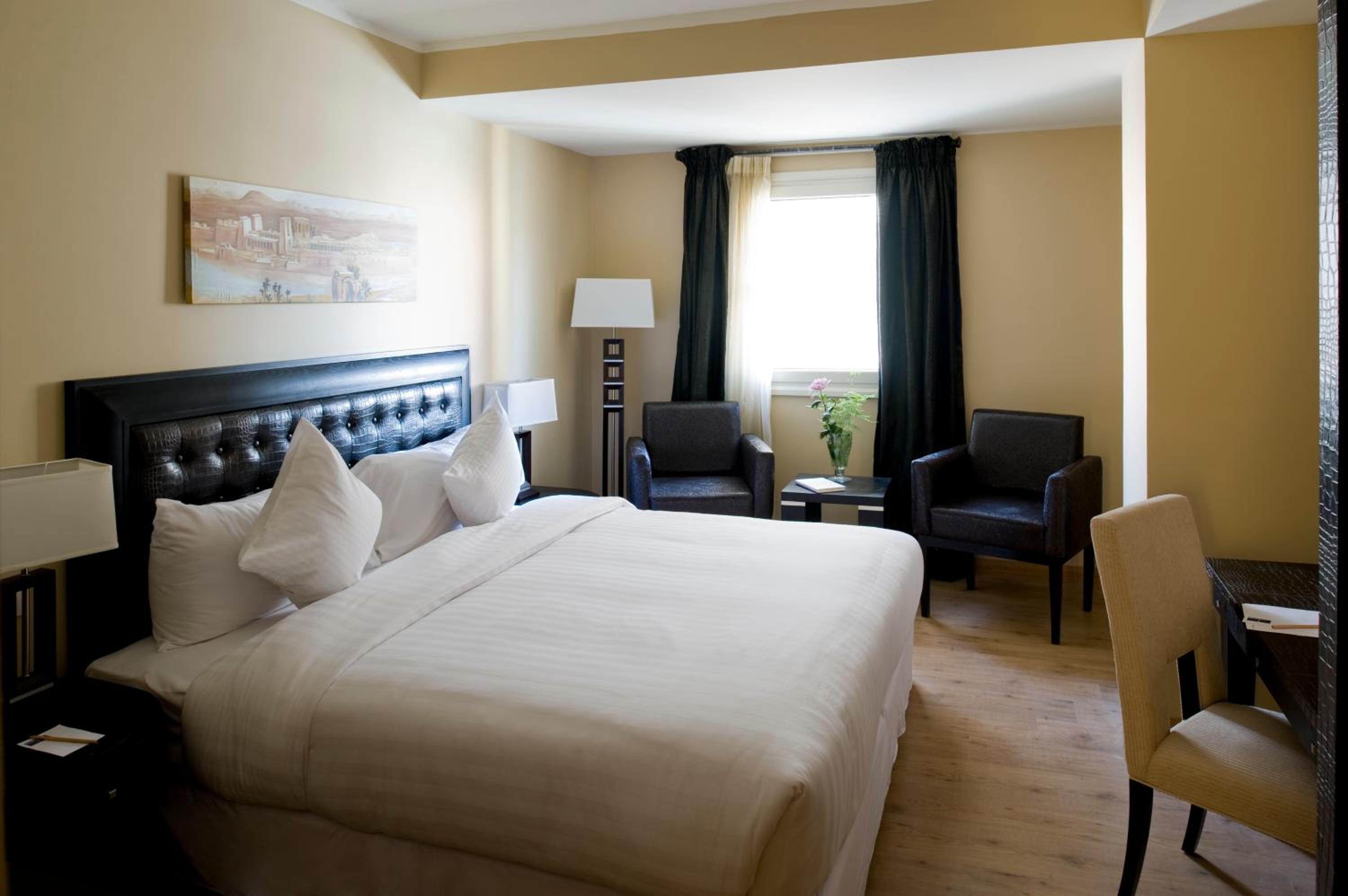 Indulge in spacious and contemporary rooms, fully air-conditioned with modern art prints and stylish bathrooms at Barcelo Cairo Pyramids Hotel.