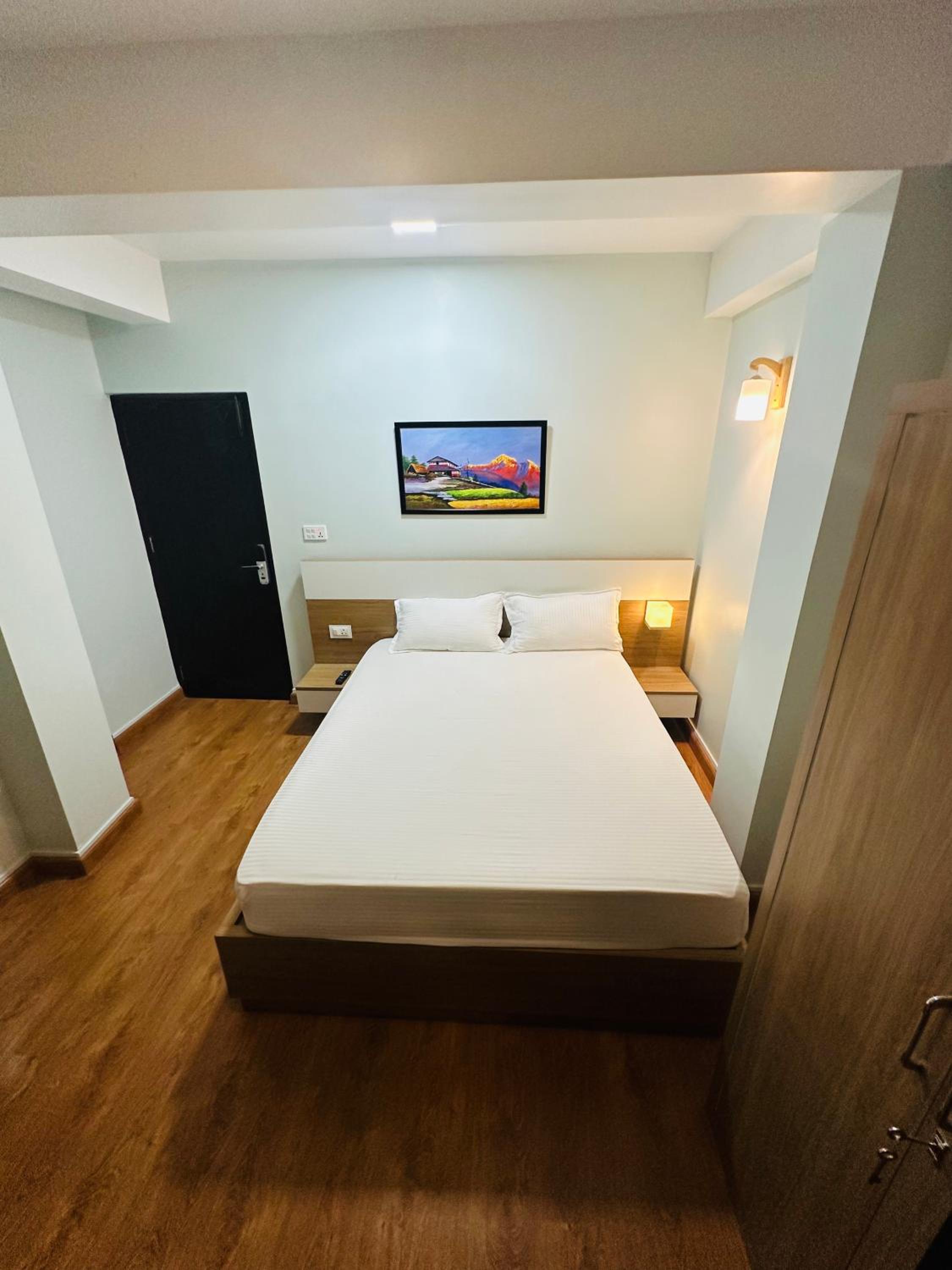 The room is exactly as shown in the picture. The building has no staffs, a person will check you in and you are good to go. No staff doesn't mean it is not safe, the locality may look shady but it is safe. The door has digital door lock and the room has key card lock. Cafe's and restaurants are just nearby (Try Bitebox for best burger and tacos in the town). The staff contacts us through whatsapp and in the app just chat or call where you feel comfortable.