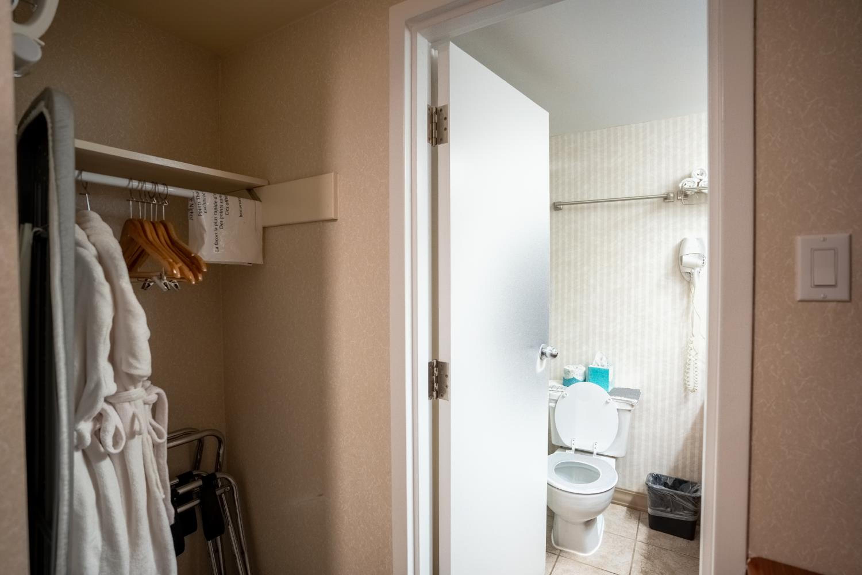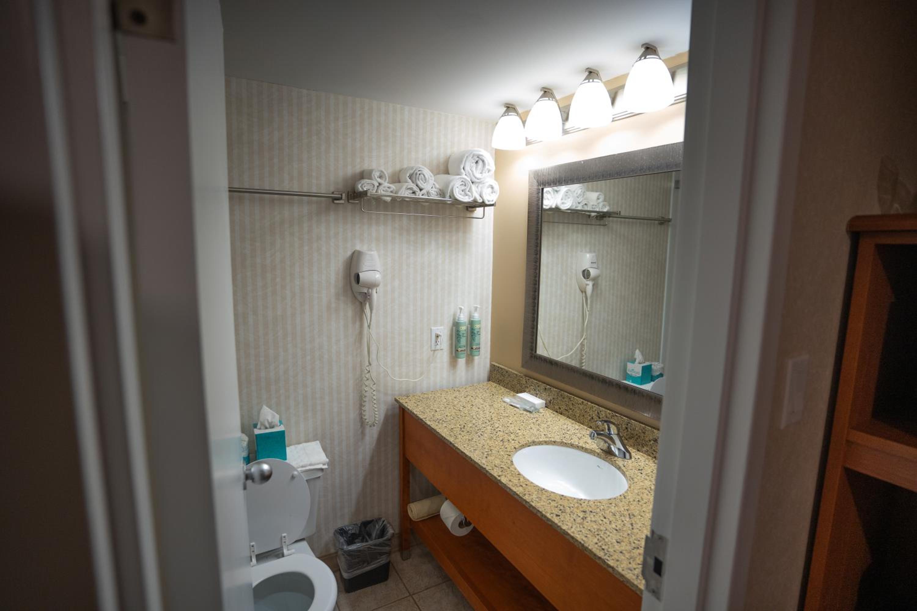 When I booked online it showed a room available and allowed me to make a reservation without issue just after 12 am I was driving long distance in poor weather to get there and was not sure where my stopping point was going to be because of roads so I waited to book until l knew if I could get all the way to my destination. Upon arrival the front desk (about 1230am) I was informed that there was no reservation for my stay, even though I had confirmation number on the phone for him. He said because it was past midnight then I booked the system resets at 12-1am and it shows I missed my check in for the date I booked and therefore I was not able to check in. I then had to call bookings to get them to refund me so he could book me by just using their system in house. With it already being late this was very frustrating to have to be on hold and wait for a solution as the booking was noon refundable and the hotel wouldn't just honour it because I arrived after 12am (which I travel a lot and have done this without issue many times at all different hotels and location). It was 2am by the time I got into my room, which was not the type I booked because he said they were all booked. I stayed in a queen room vs a king bed and the bathroom door was so close to the toilet your knees hit it while you were sitting. There was also no hand soap in the bathroom as the bottle was empty. Overall a very frustrating experience, especially when you are getting up at 730am to sit in a conference all day after very little sleep.