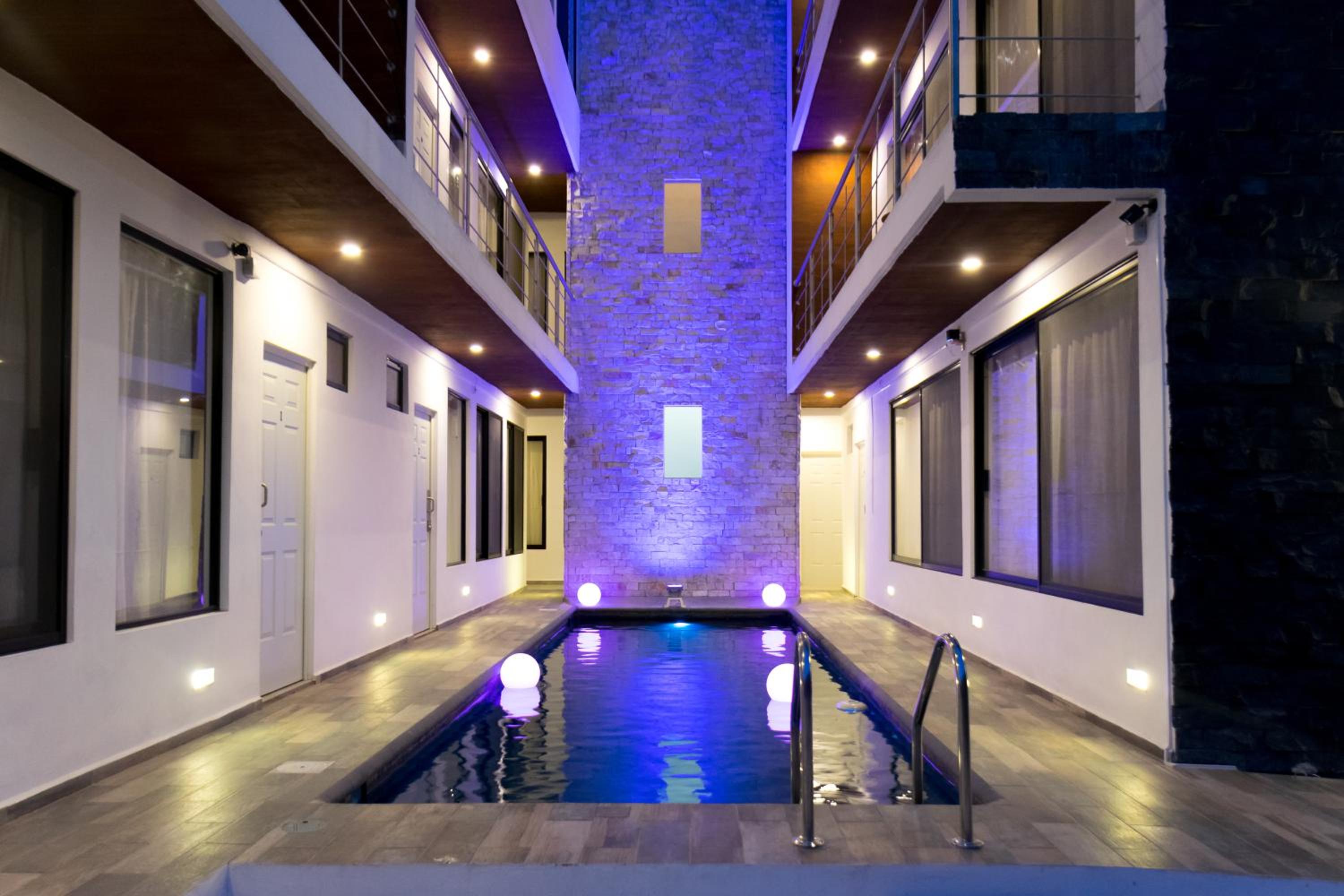 Relax and unwind by the outdoor swimming pool at Casa Maguey, perfect for enjoying the warm weather and taking a refreshing dip during your stay in Cancún.