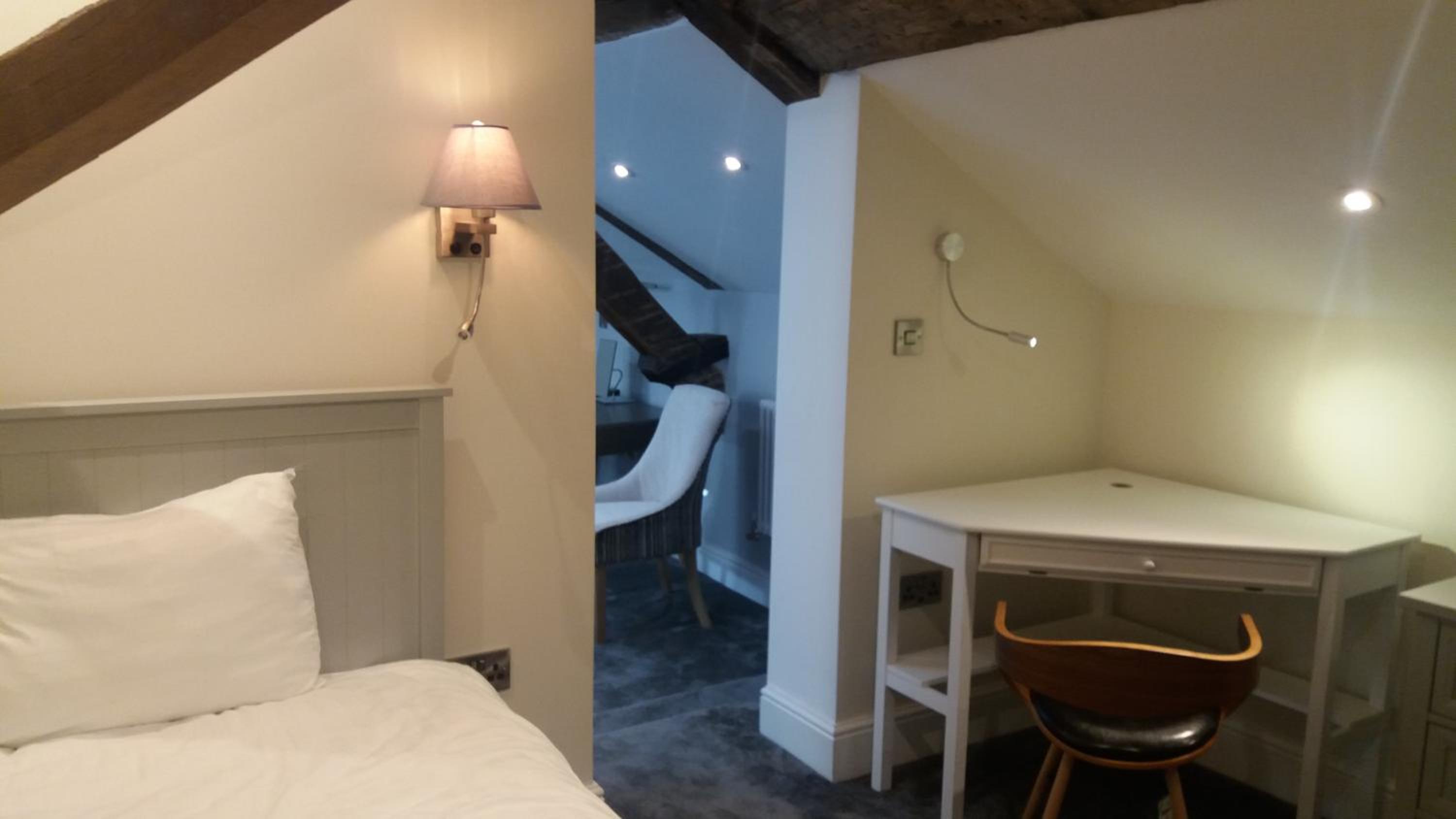 Room needed updating and TLC , Peeling paint on wall in room , small for size of bed , tiny TV high on wall that could not receive BBC channels ,worn out TV remote , no plugs to charge phone , room in remote location in building .