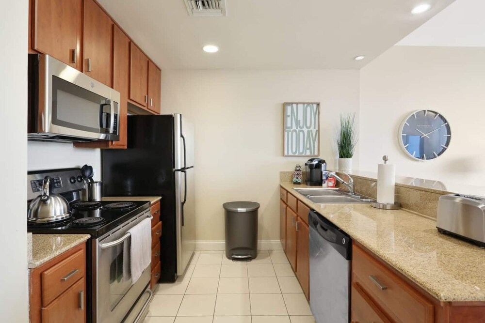 Indulge in our outdoor pool, 24-hour fitness center, and individually decorated guestrooms with fully-equipped kitchens and 50-inch Smart TVs.