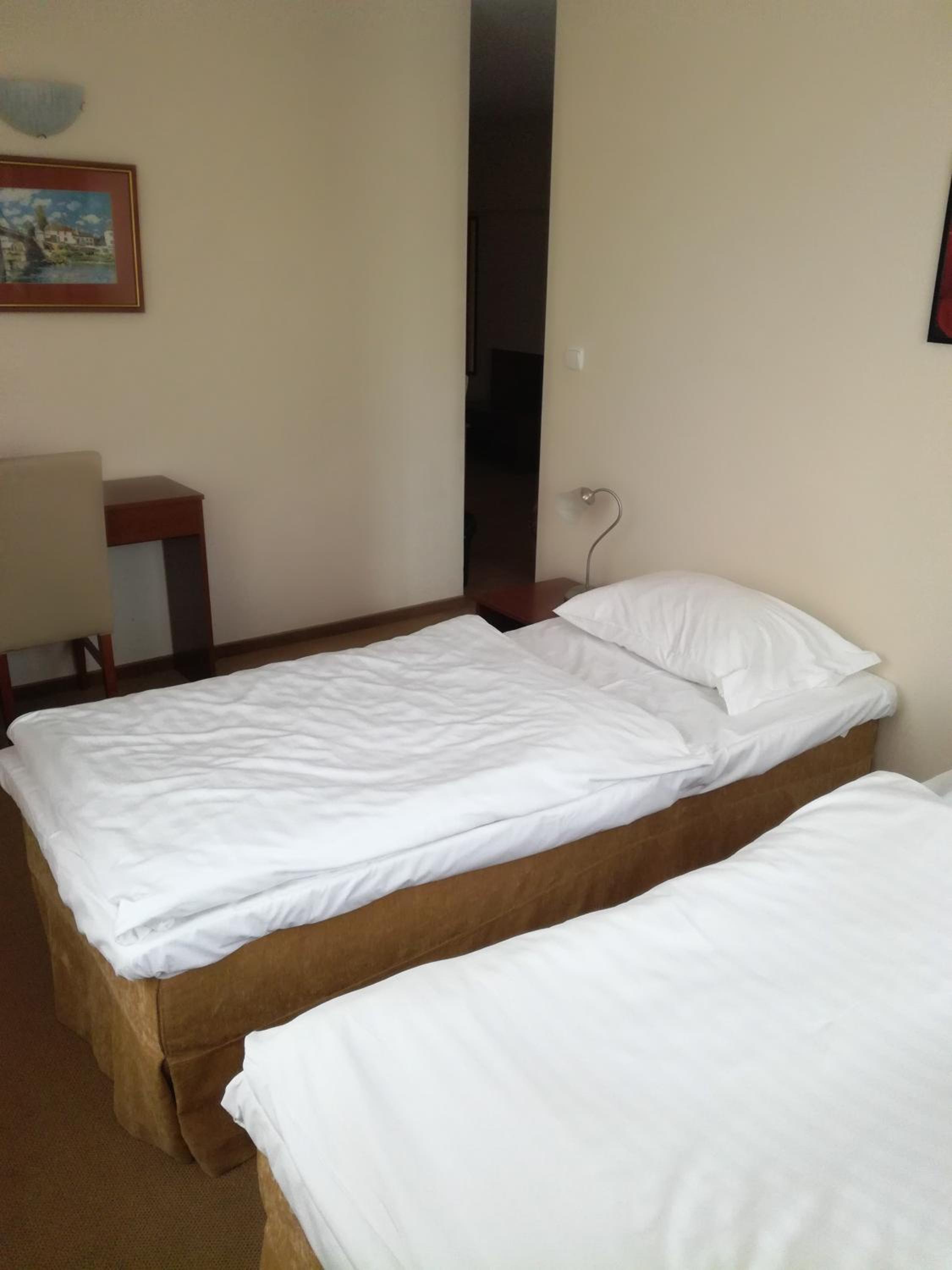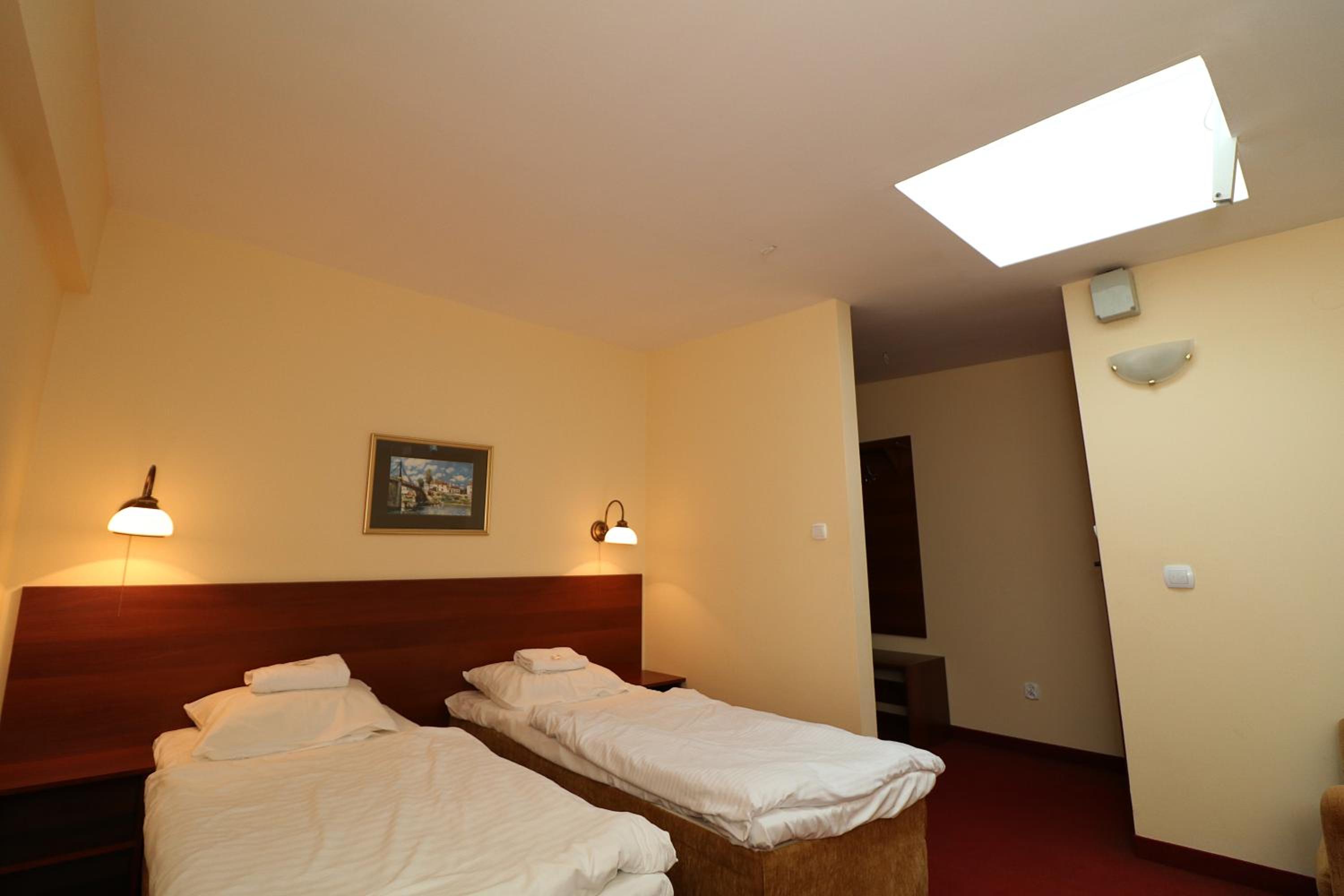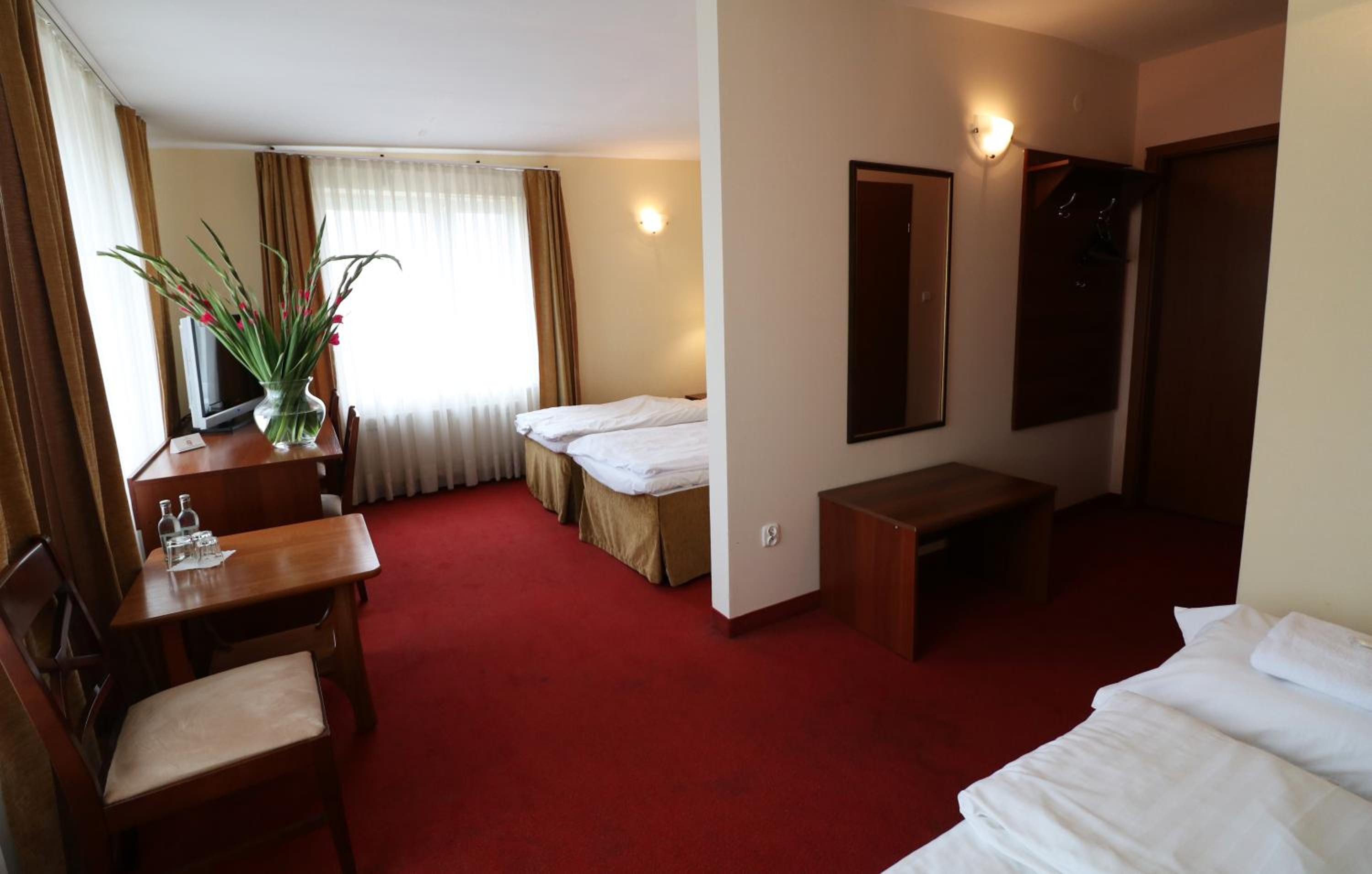 Сняли 3х местный номер. В подтверждении было написано площадь номера 27 метров квадратных. Заселили в 19 номер, а он тесный. Даже к окну трудно подойти, а за номер за 2 ночи заплатили 684 злотых. На первом этаже при входе воняет.