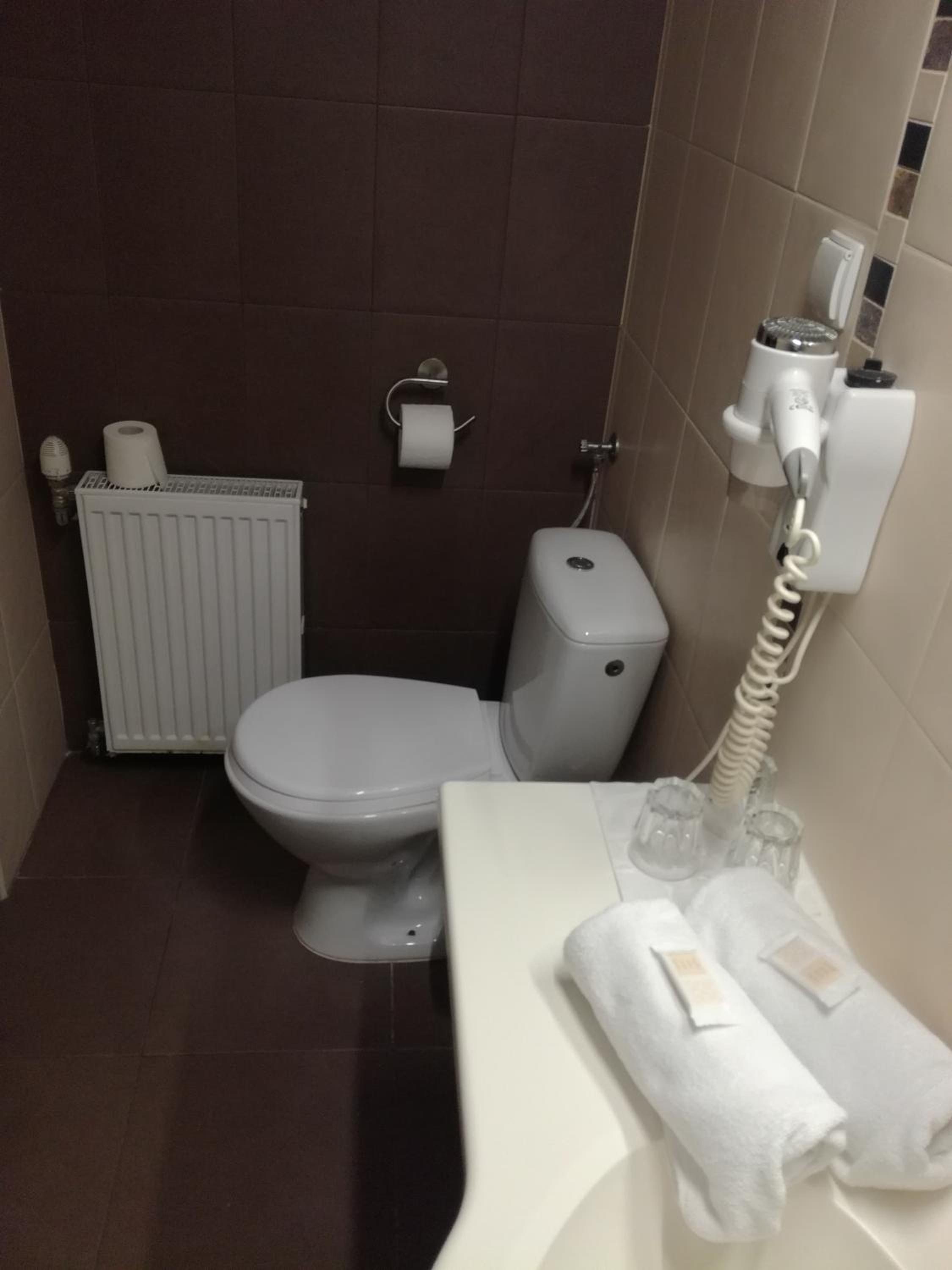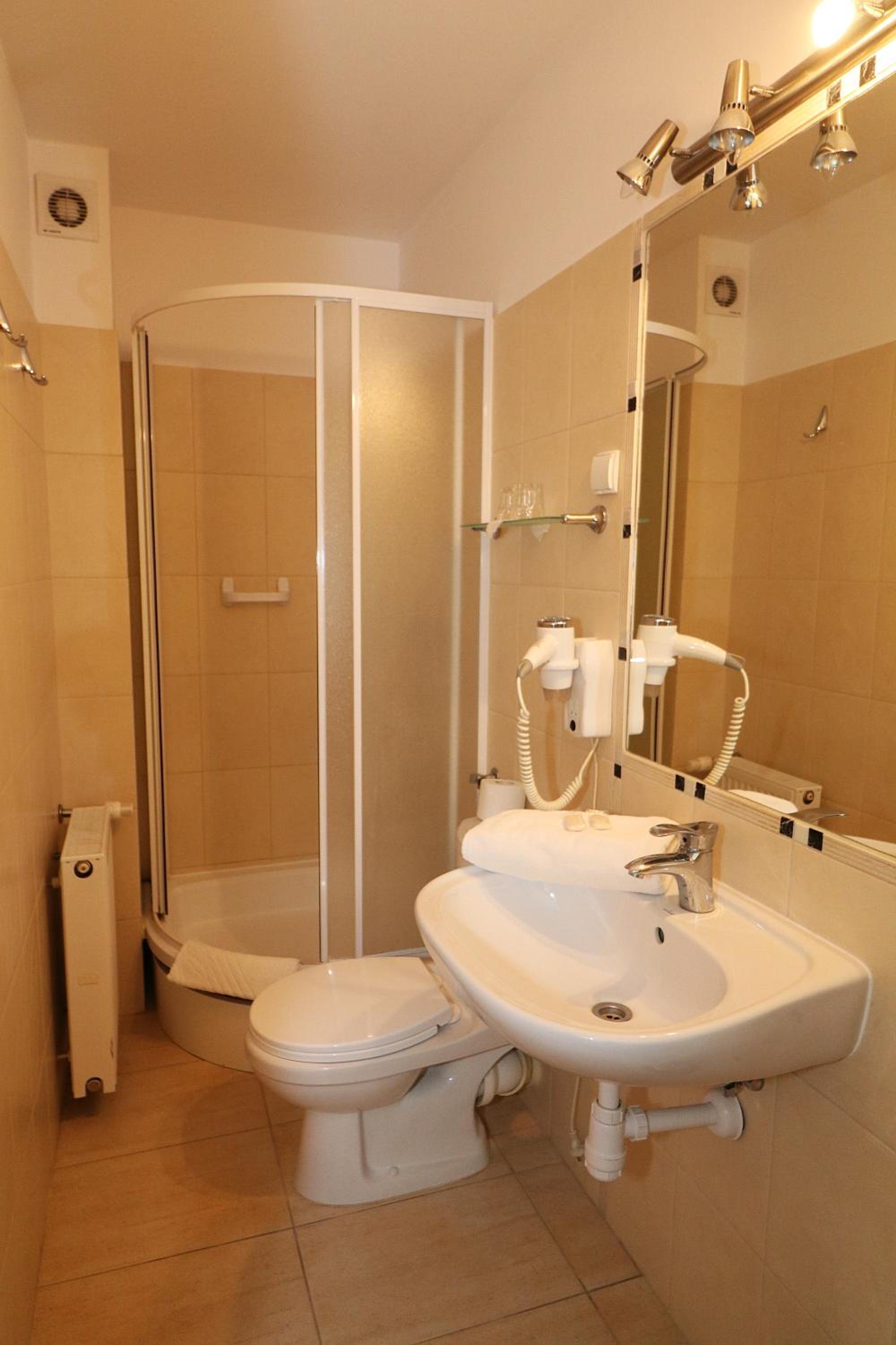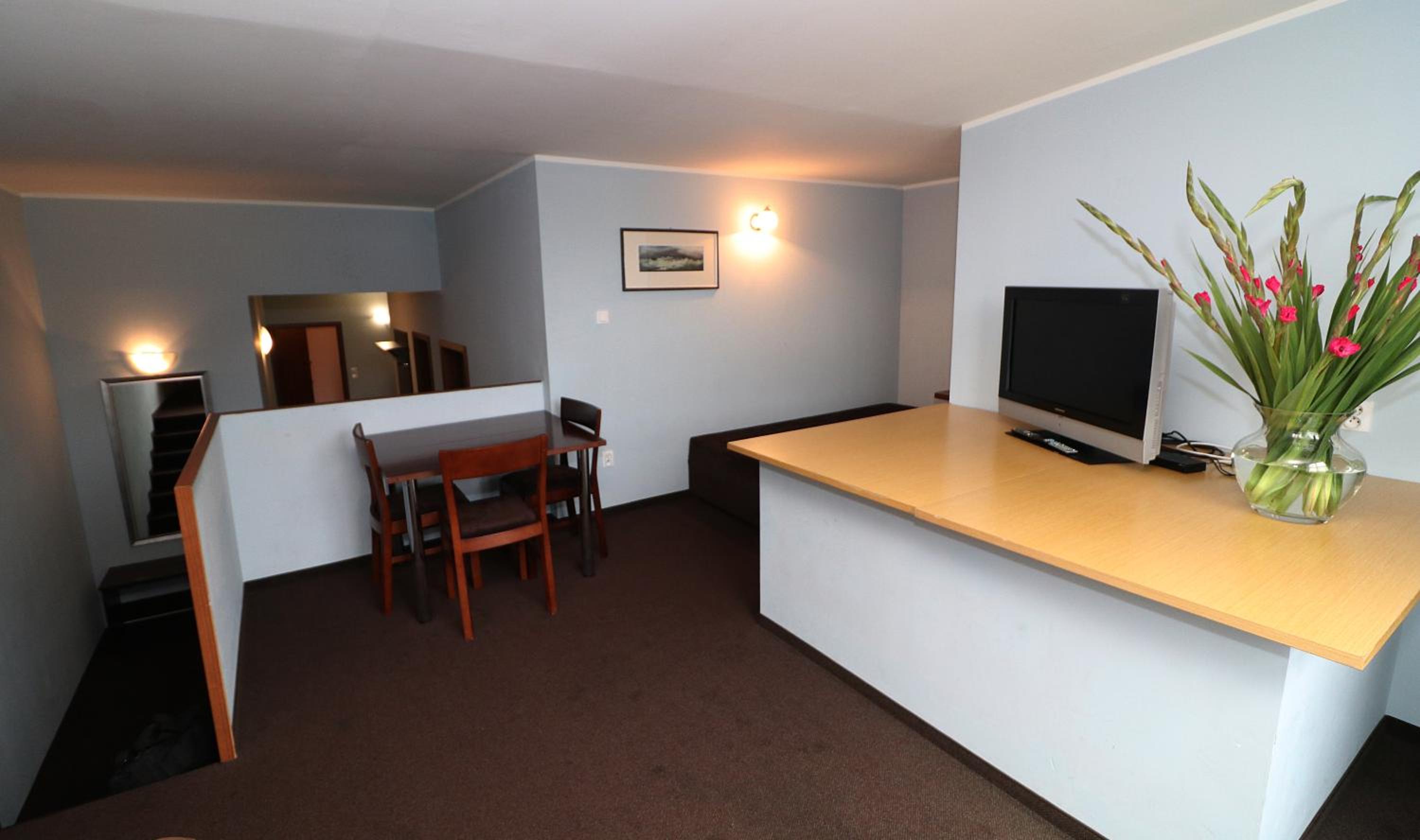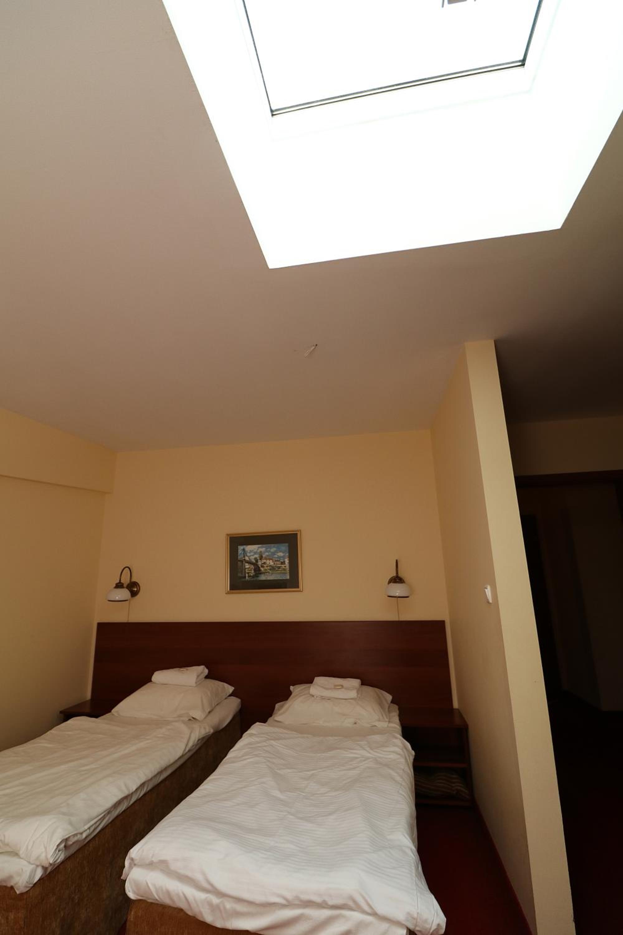 Сняли 3х местный номер. В подтверждении было написано площадь номера 27 метров квадратных. Заселили в 19 номер, а он тесный. Даже к окну трудно подойти, а за номер за 2 ночи заплатили 684 злотых. На первом этаже при входе воняет.
