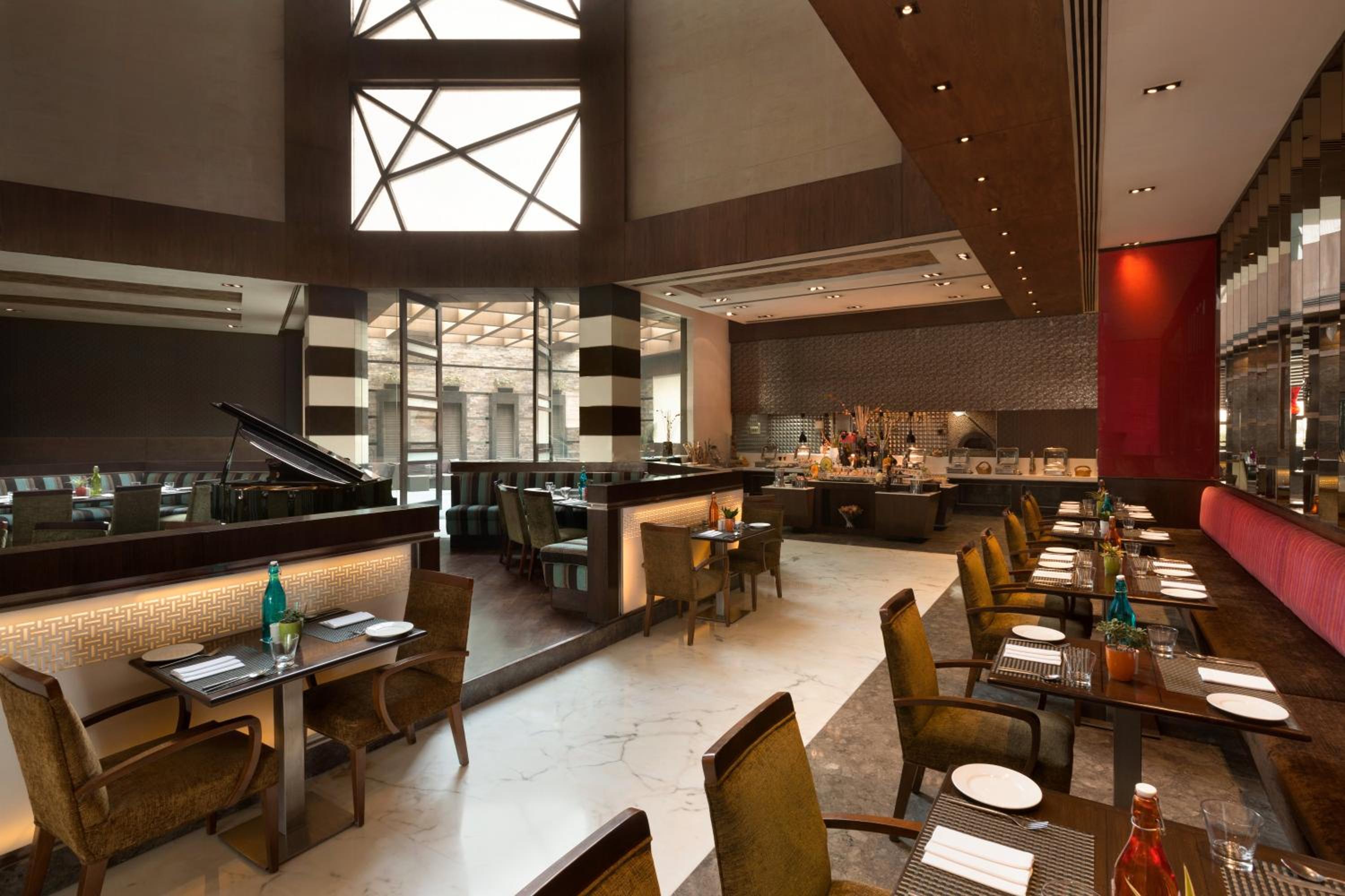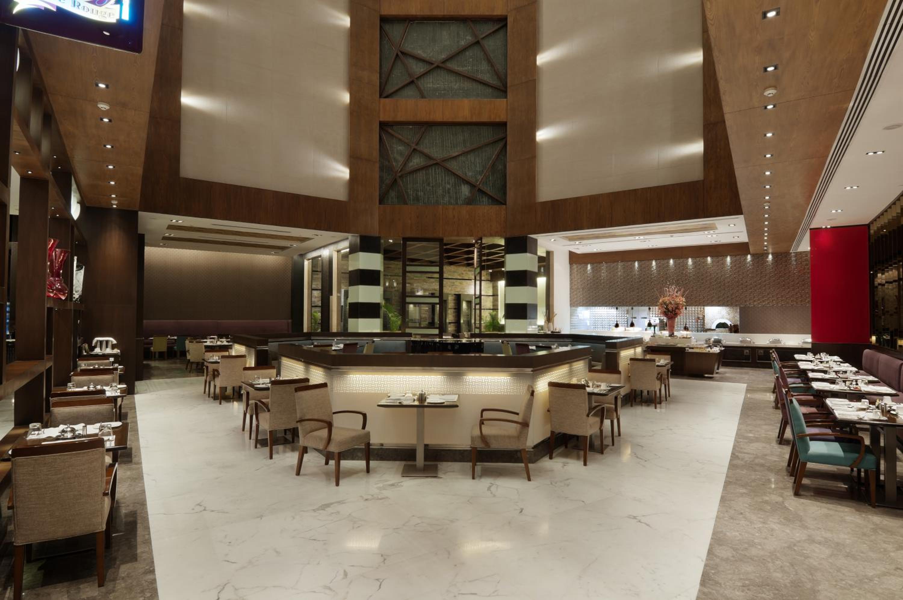 Indulge in a variety of cuisines at Ramada Gurgaon's dining options. Café Rouge offers Indian, Continental, and multi-cuisine dishes 24/7, while the Bar Lounge serves drinks and light snacks for a relaxing evening.