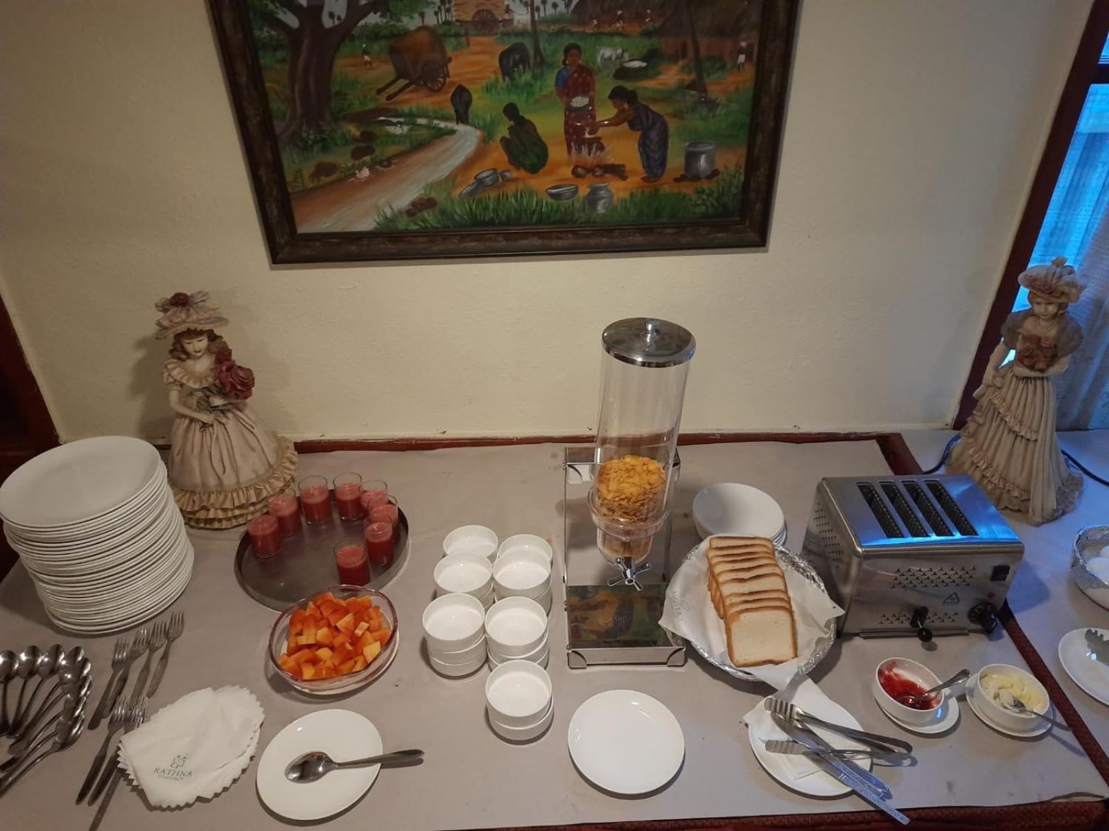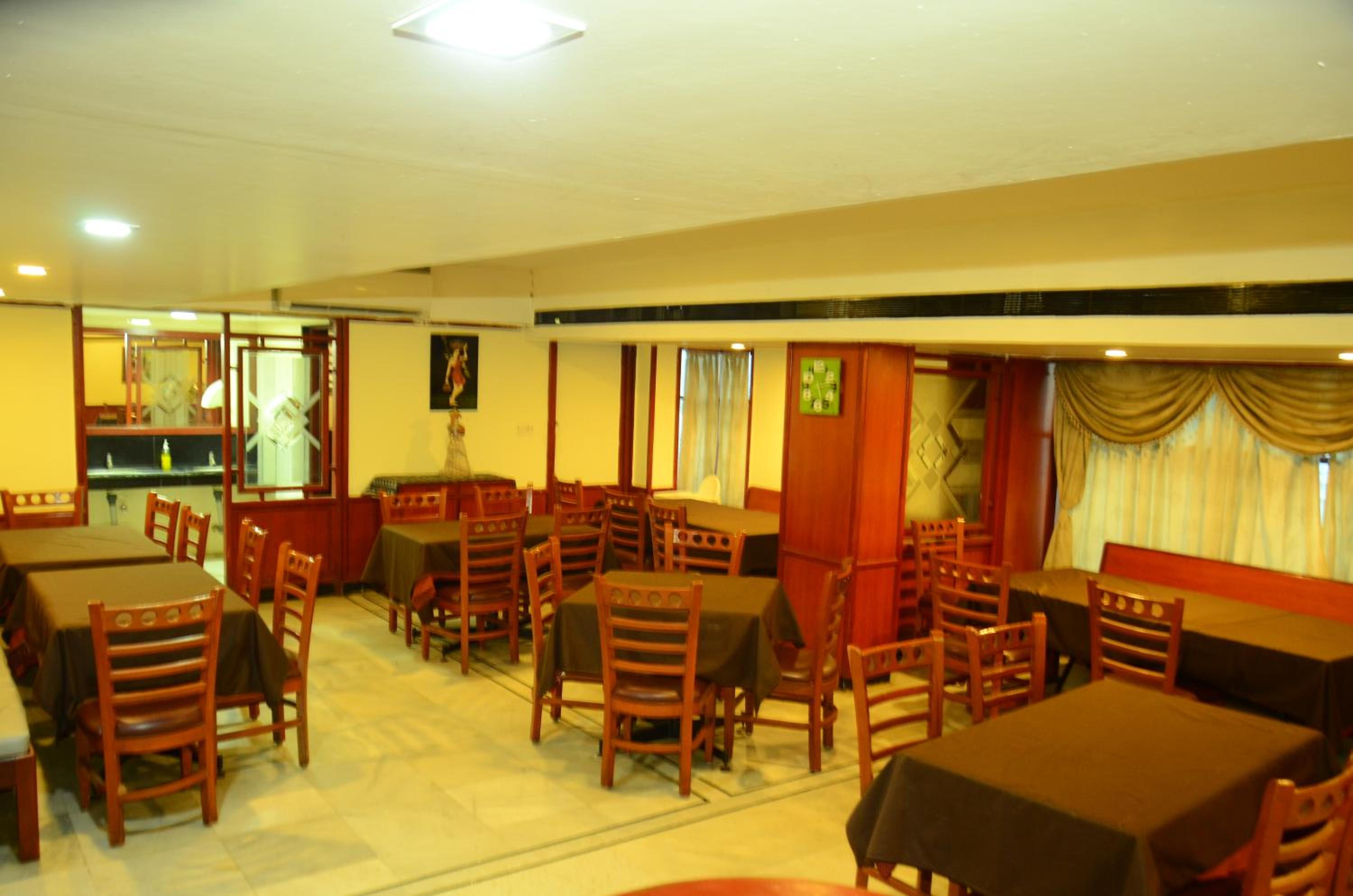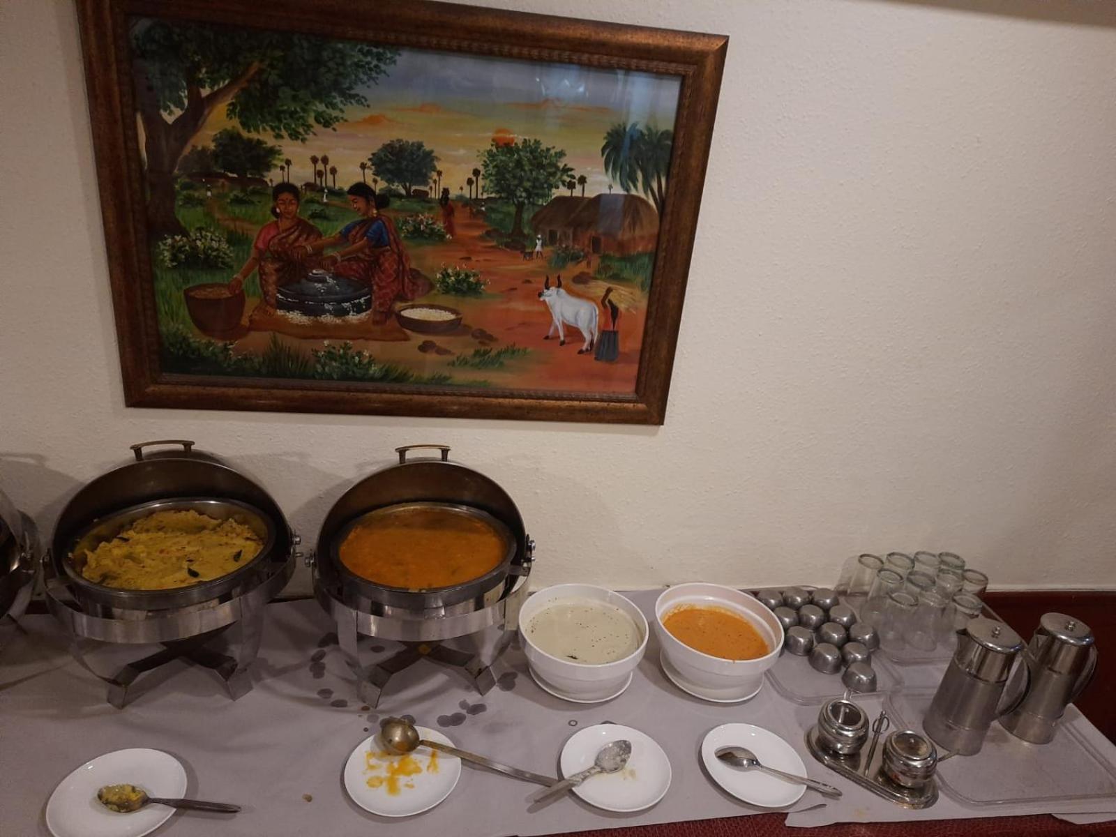 Breakfast was okay mainly south indian items. However the staff manning the restaurant / breakfast was not at all friendly. He acted and behaved as though he was doing us a favour . He was very rude , unresponsive, loud mouthed and unhospitable. He treated some guests well and was partial towards some. The restaurant needs an upgrade on cleanliness.We found items spillover and the staff did not maintain it clean. The items were not hot except for pooris and dosa which was provided fresh . Rooms needs upgrade for the tariff charged. Parking is a problem. Two wheelers are parked haphazardly.