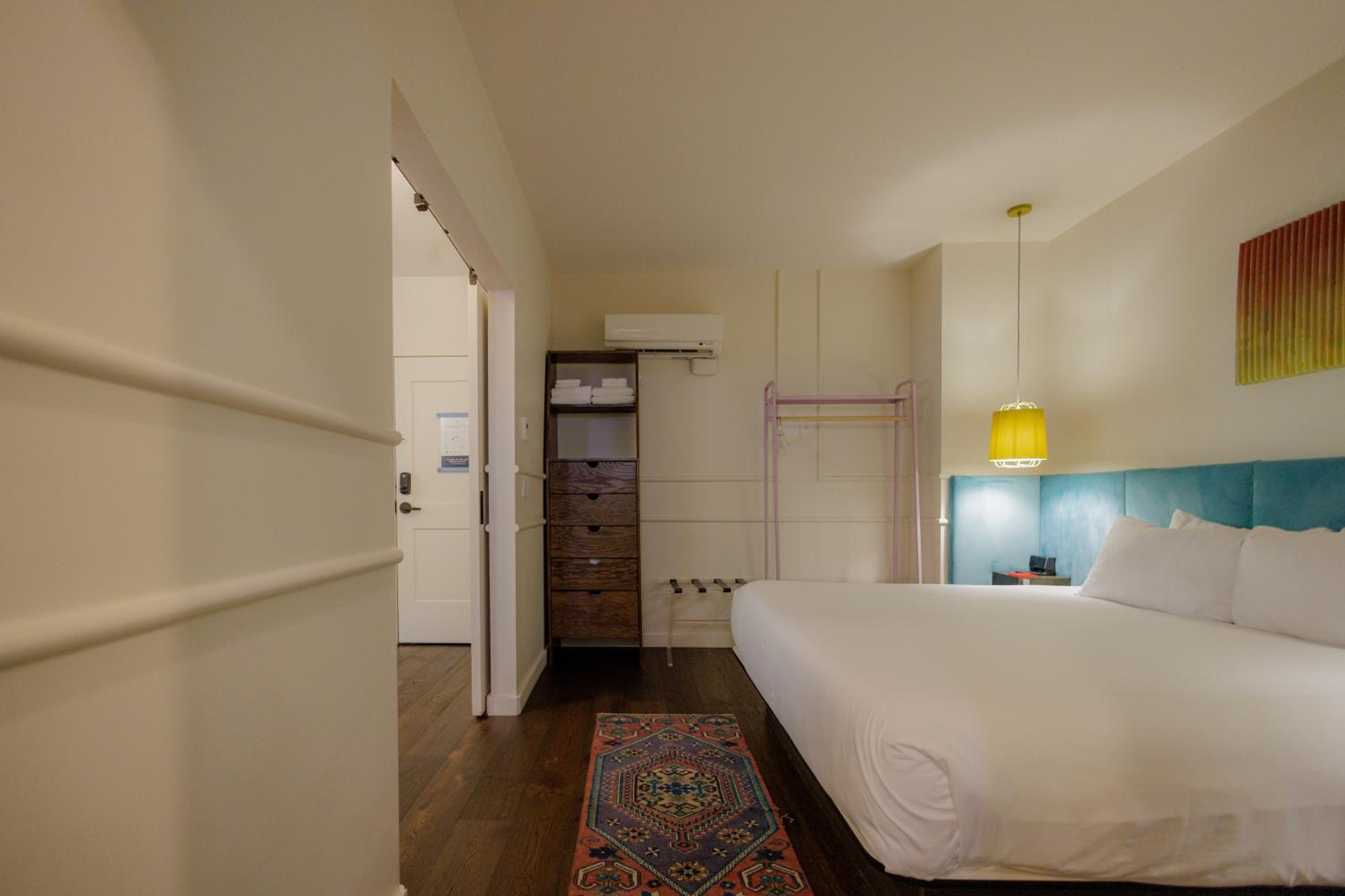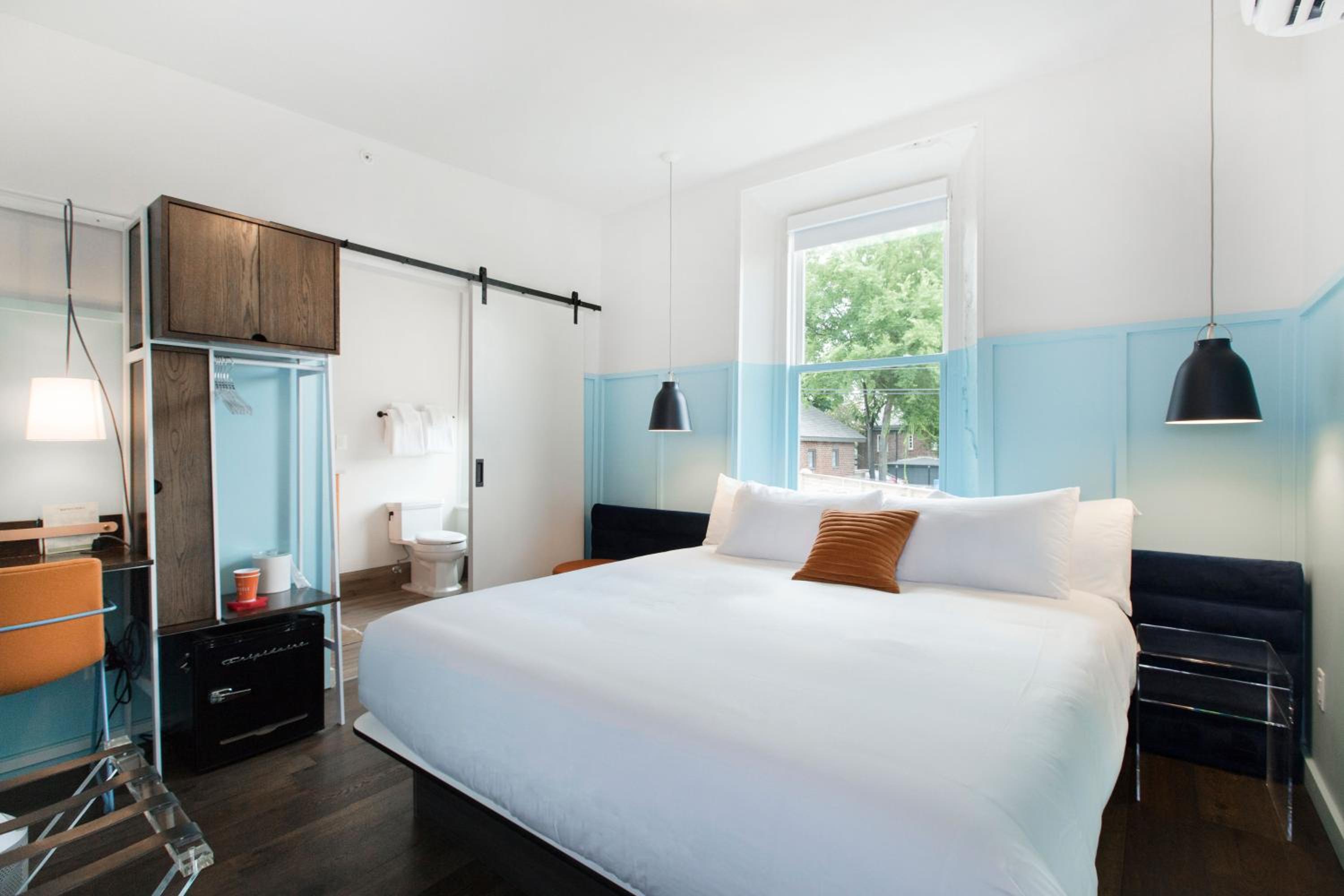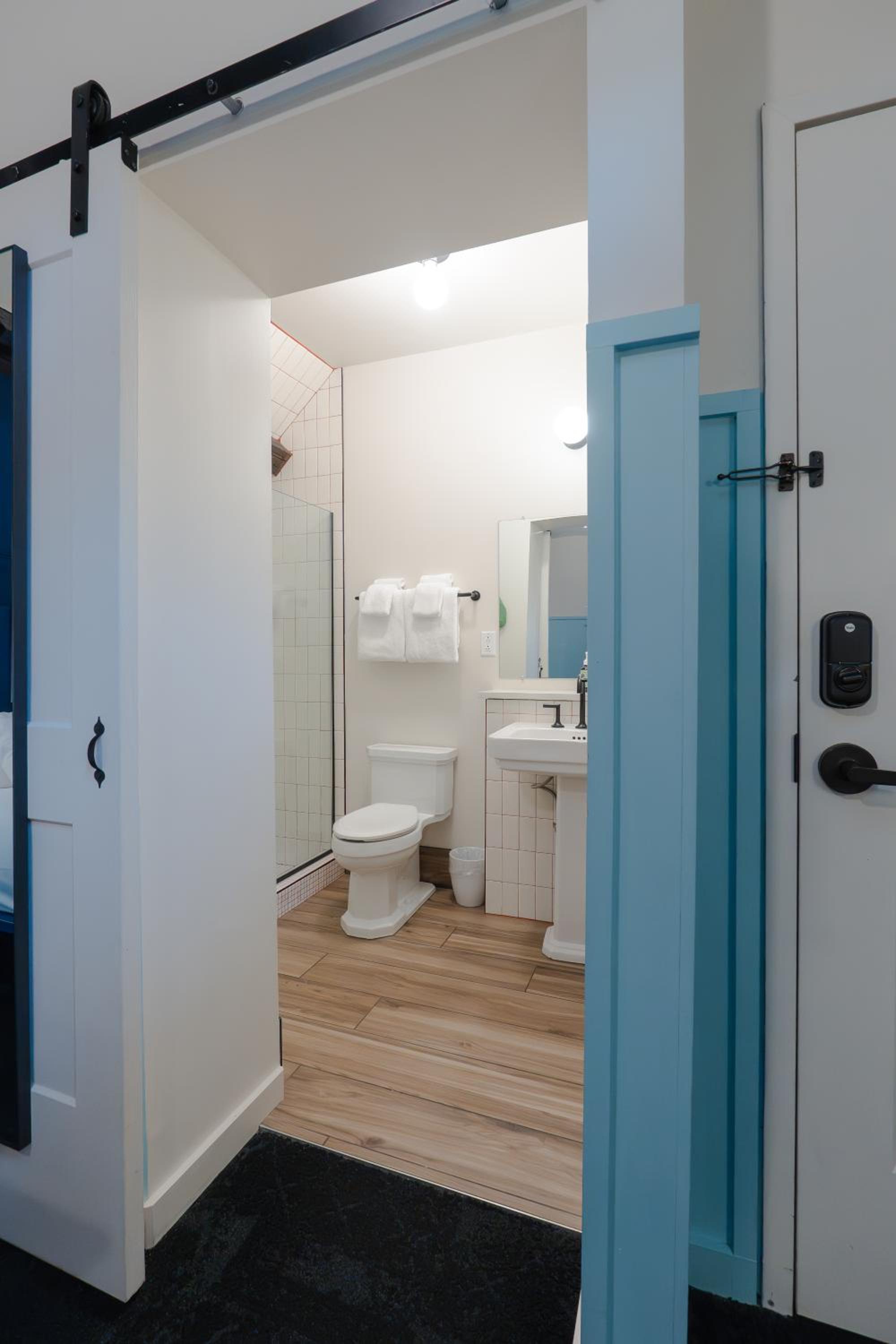 King deluxe room had a real door on the bathroom, not a sliding barn door. Room was cute and cozy, and came with a Dyson fan, coffee maker, snacks/water, and a white noise machine. Lighting was nice and adjustable. Bed and pillows were comfy. Walls were thick.