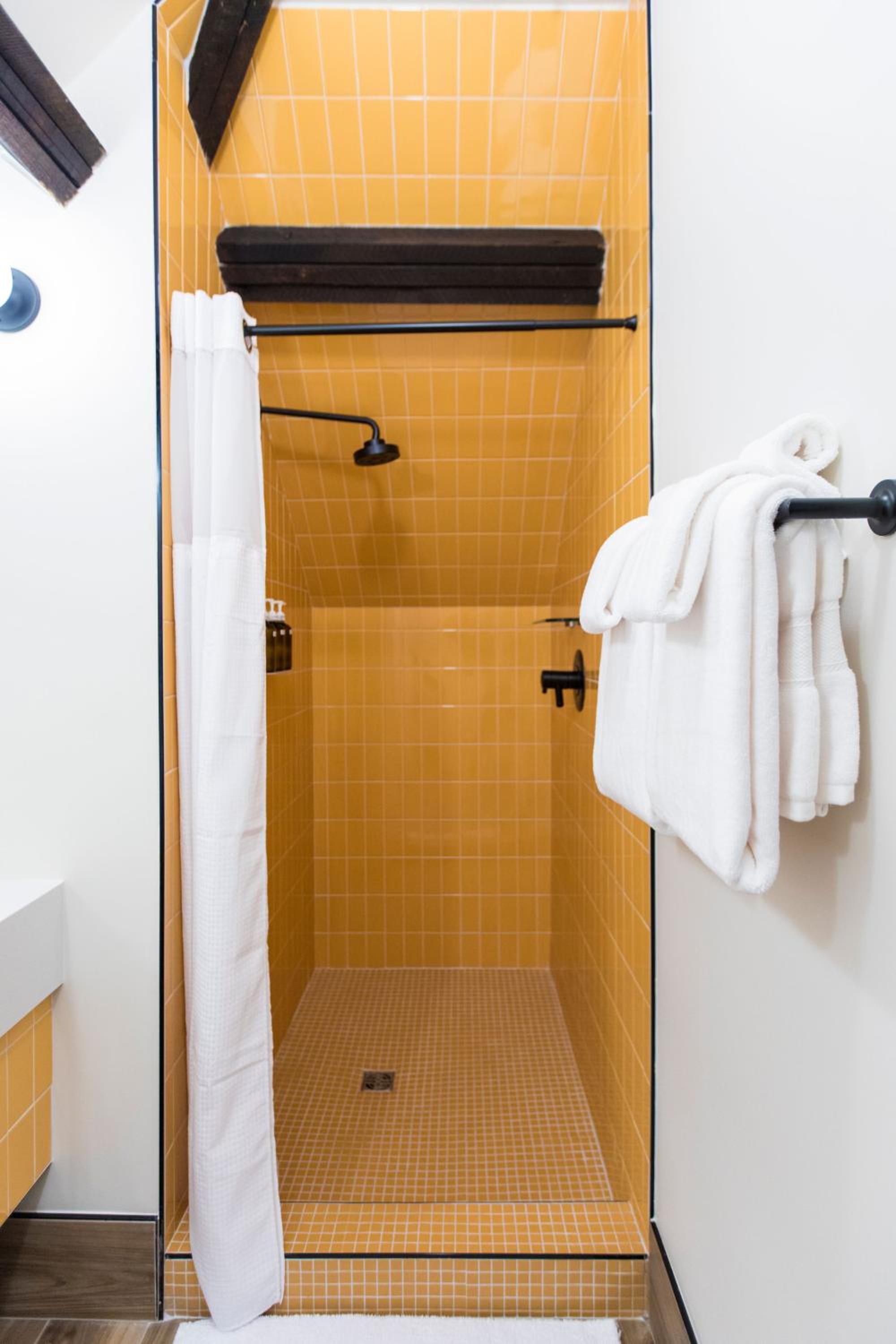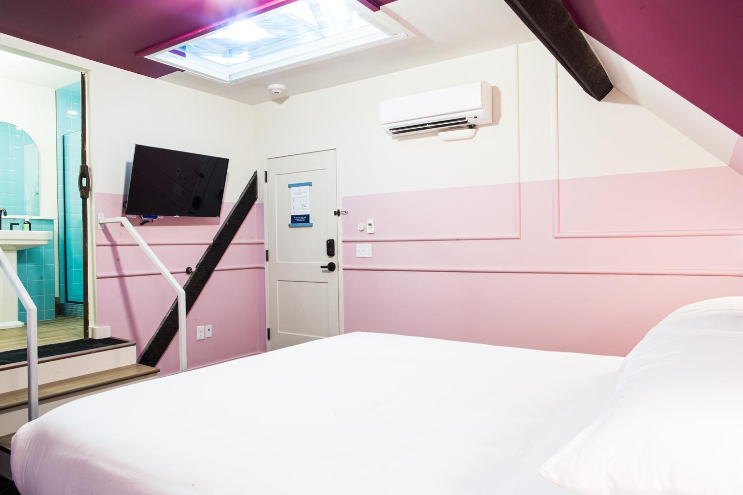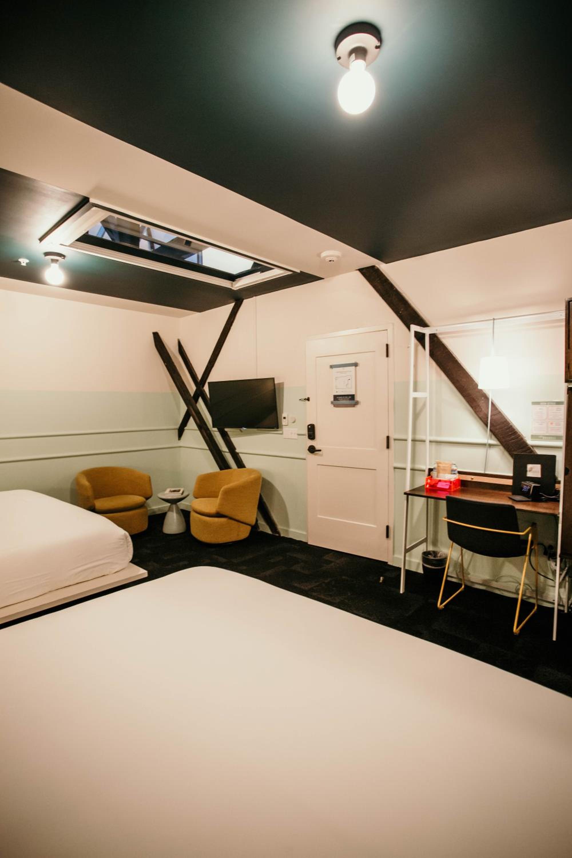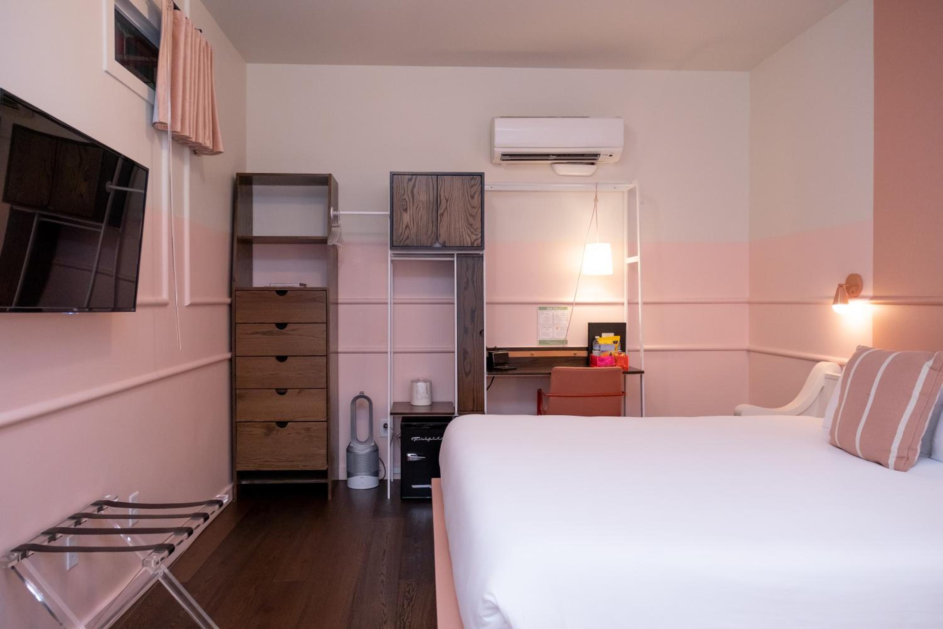 King deluxe room had a real door on the bathroom, not a sliding barn door. Room was cute and cozy, and came with a Dyson fan, coffee maker, snacks/water, and a white noise machine. Lighting was nice and adjustable. Bed and pillows were comfy. Walls were thick.