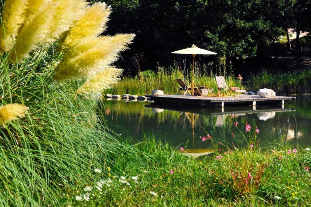 Relax by the natural swimming pool surrounded by fresh lawns and equipped with wooden decks, comfortable armchairs, and sunbeds, offering the perfect setting to unwind.