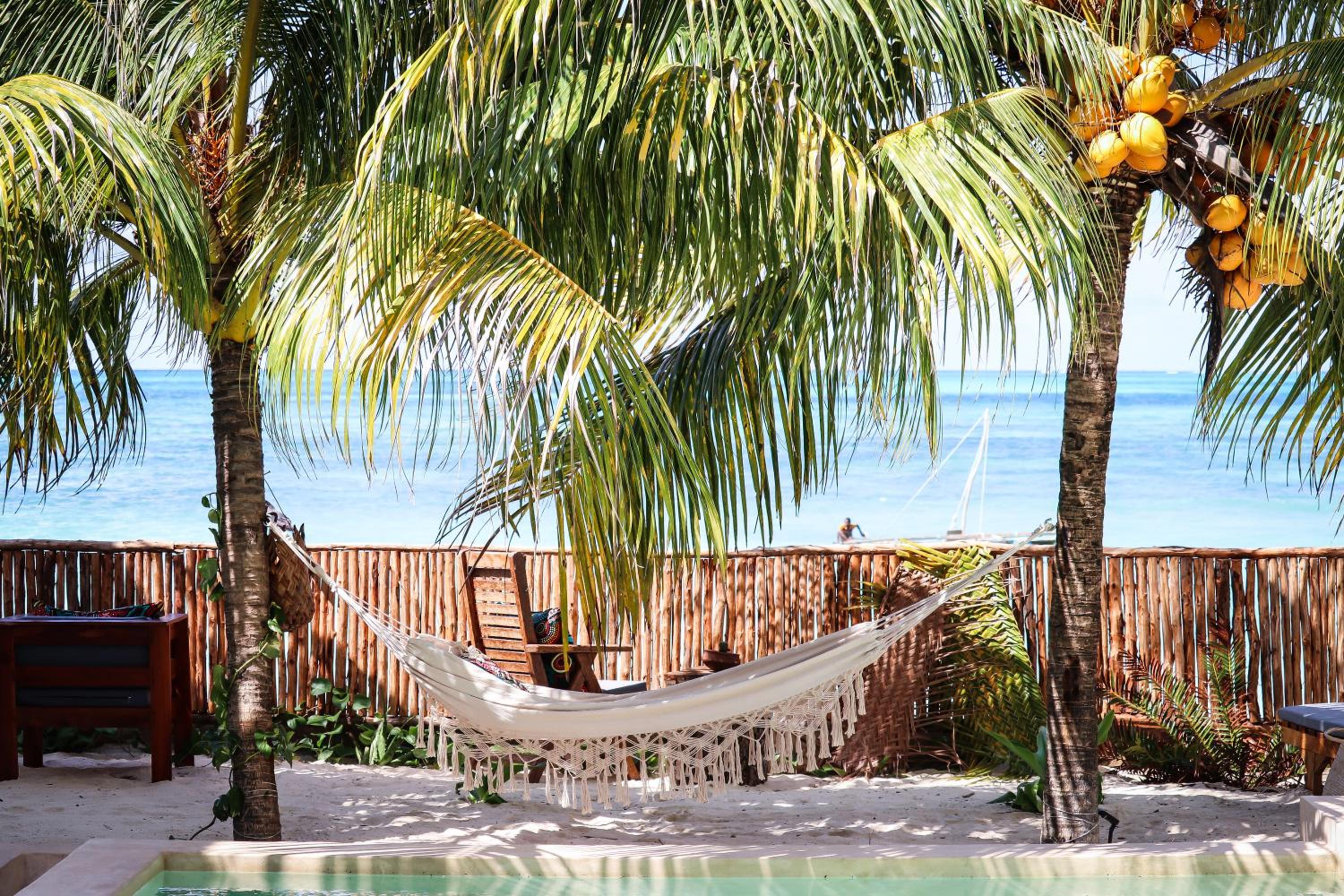 The location is beautiful, right on the beach, where traditional fishing boats bob. The pool area is so inviting, with soft sand, coconut palms, lounge chairs, and hammocks. Perfect for relaxing and reading.